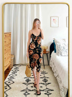 Prix unitaire parRobe midi à fleurs, fente à volant, décolleté en V, bretelles non ajustables, tissu stretch non transparent, portée ici sur une T36 pour 1m64