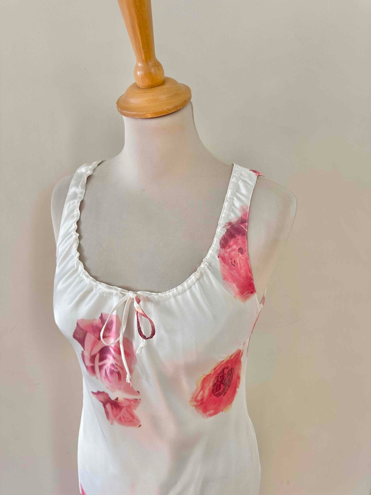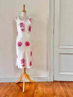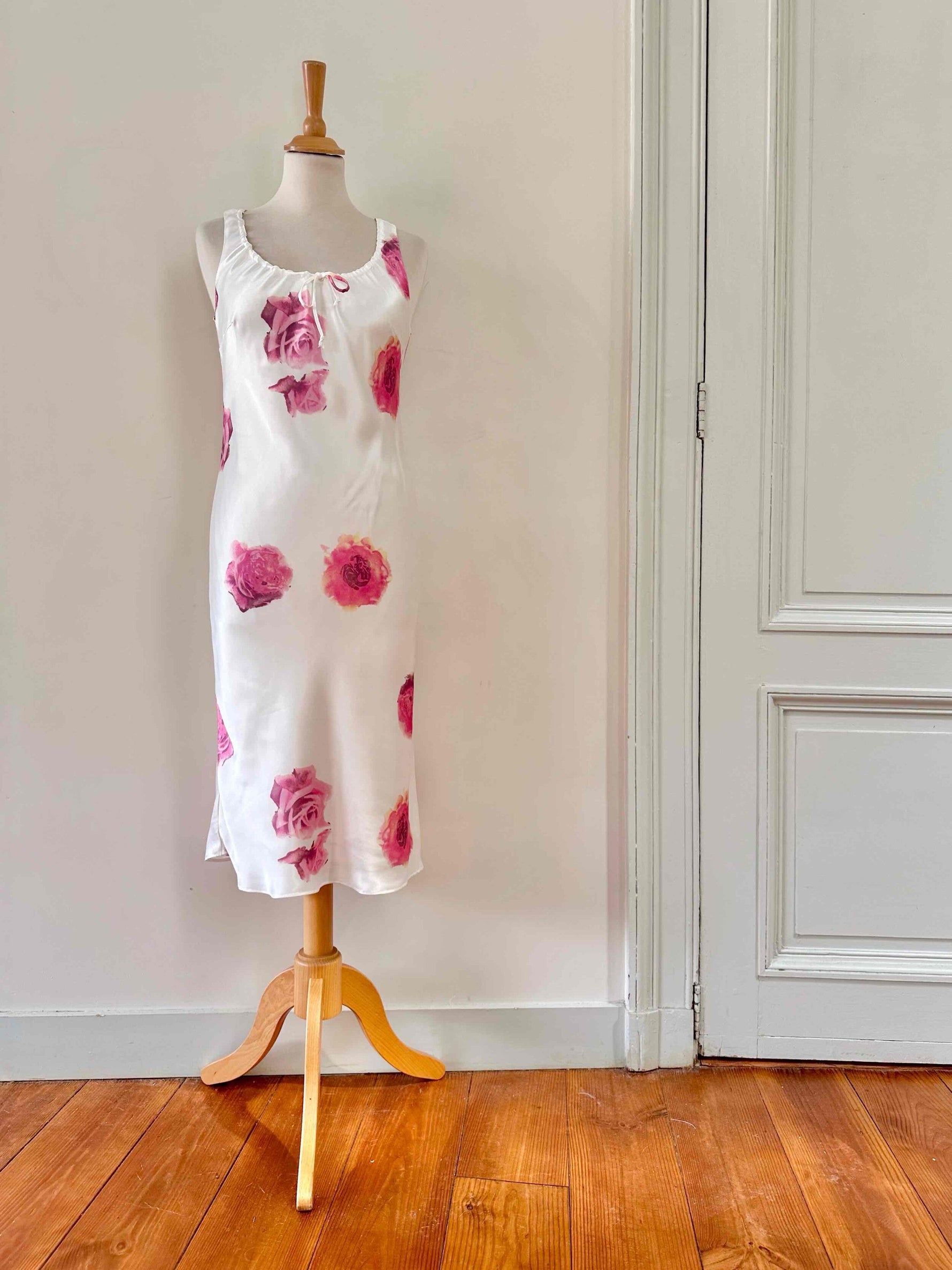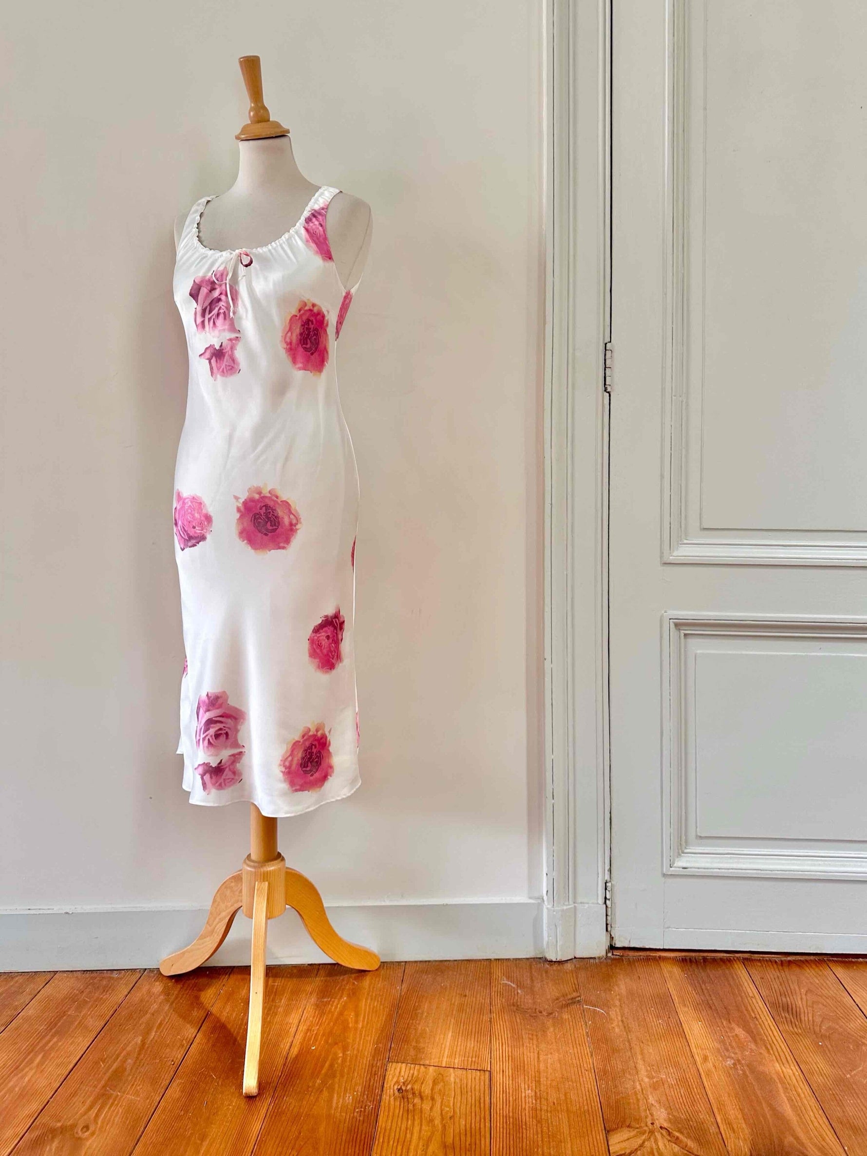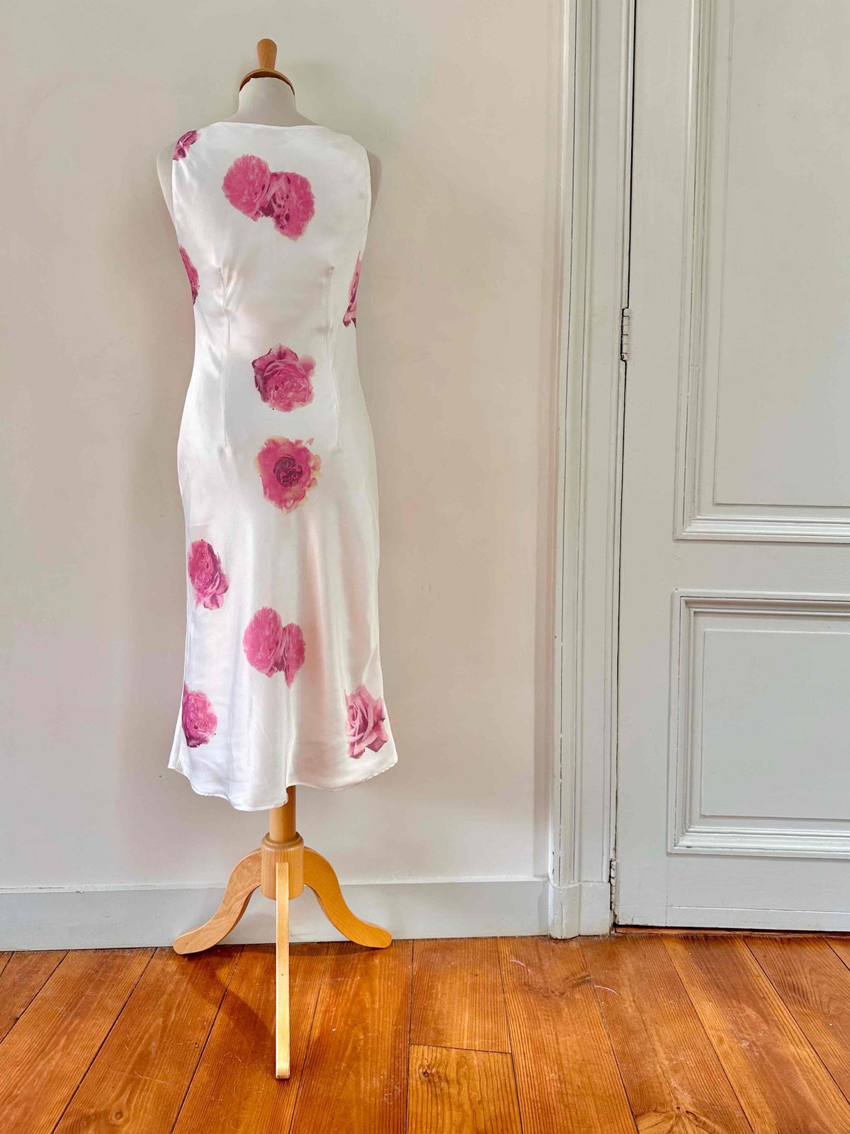 Robe satinée à fleurs, en satin viscose blanc imprimée grandes roses fuchsias et pastels, encolure froncée à nouer, corsage, forme fit and flare en biais, fabriquée en Italie, taille 36, portée ici sur un mannequin T36, aisselles 43 cm.