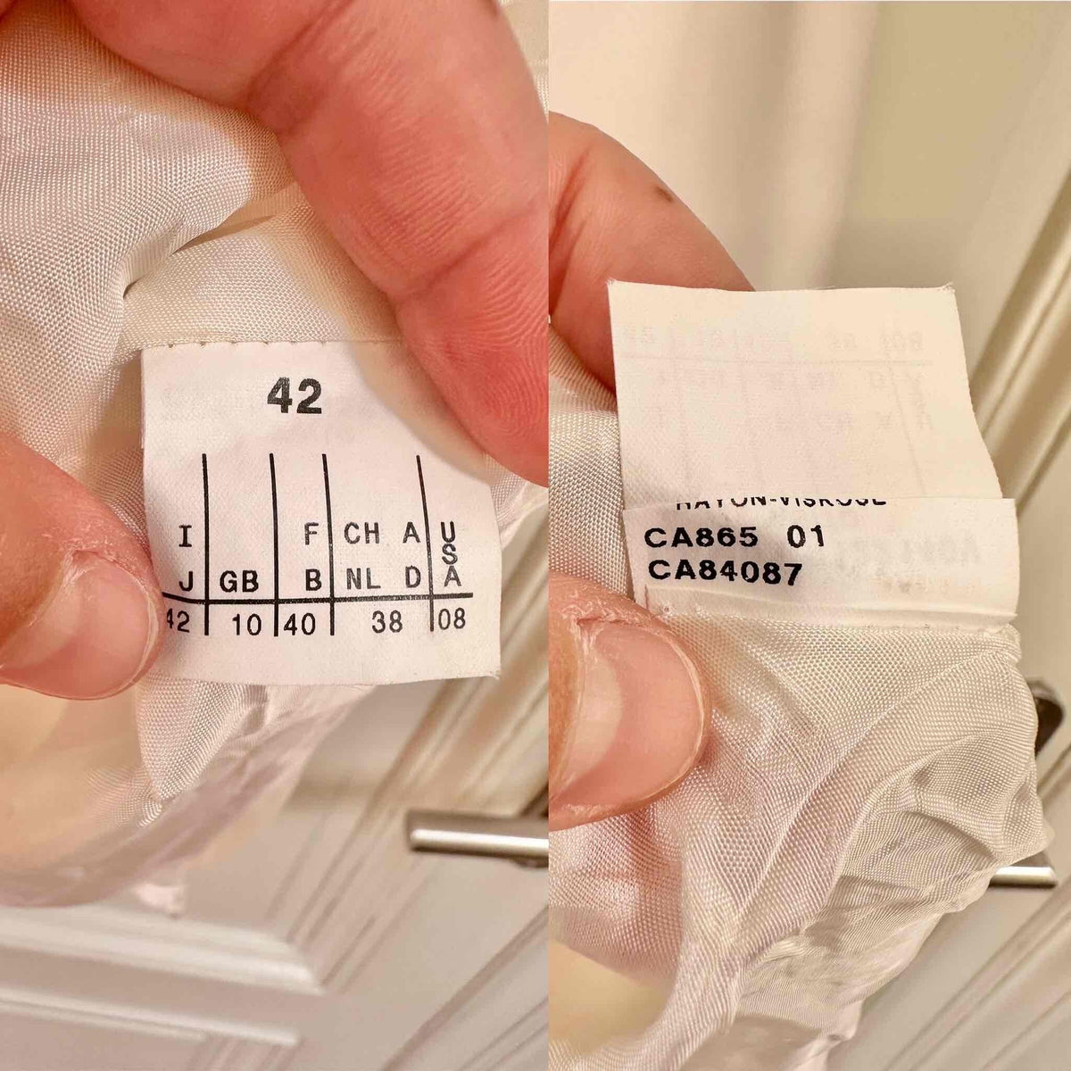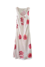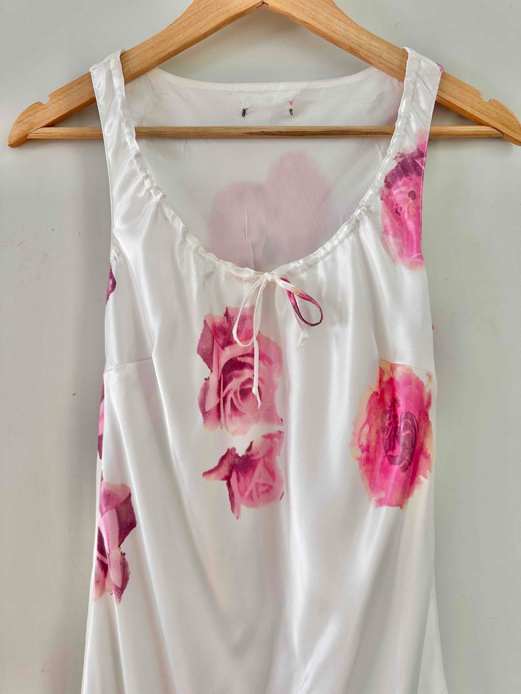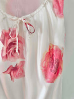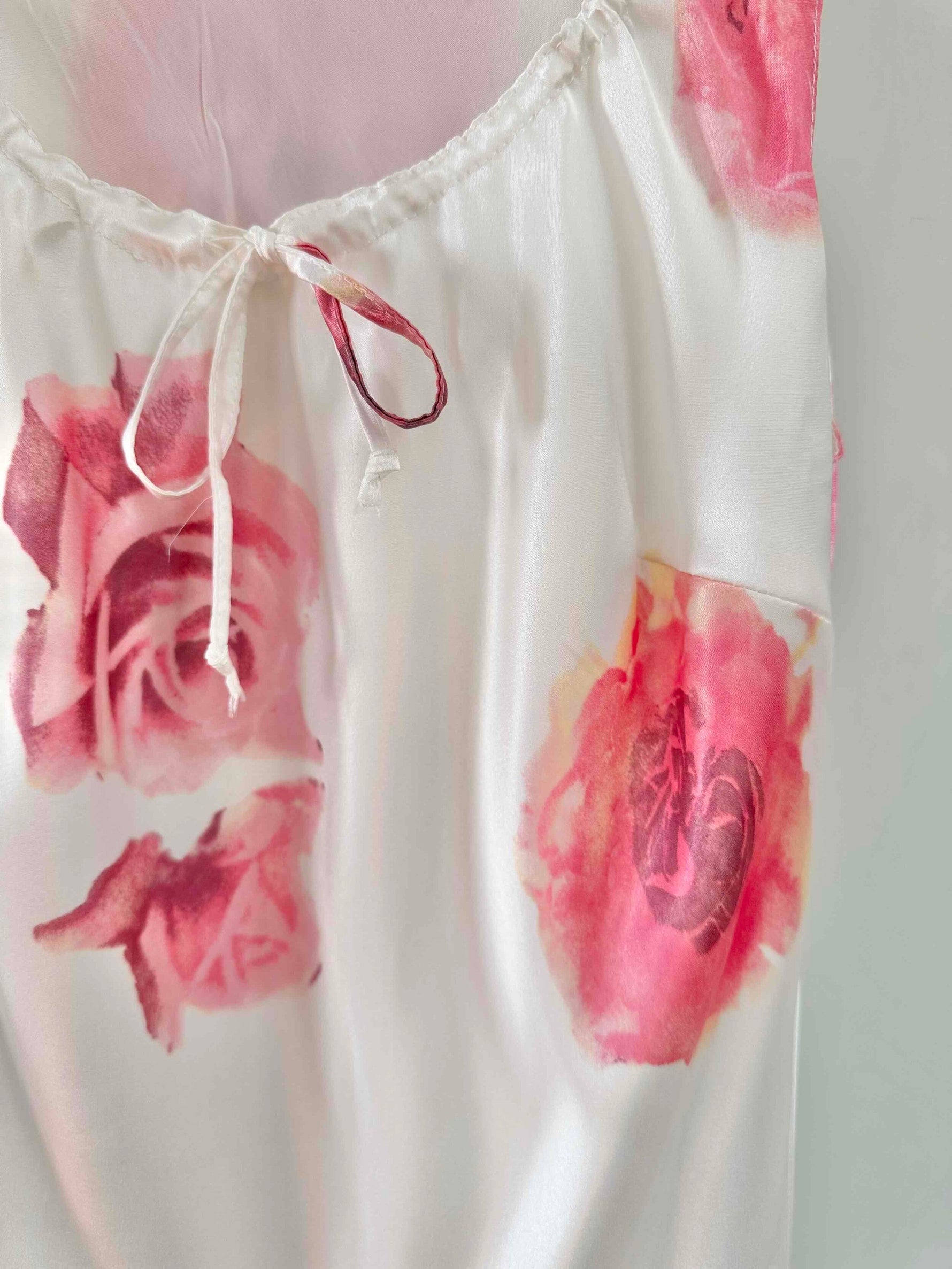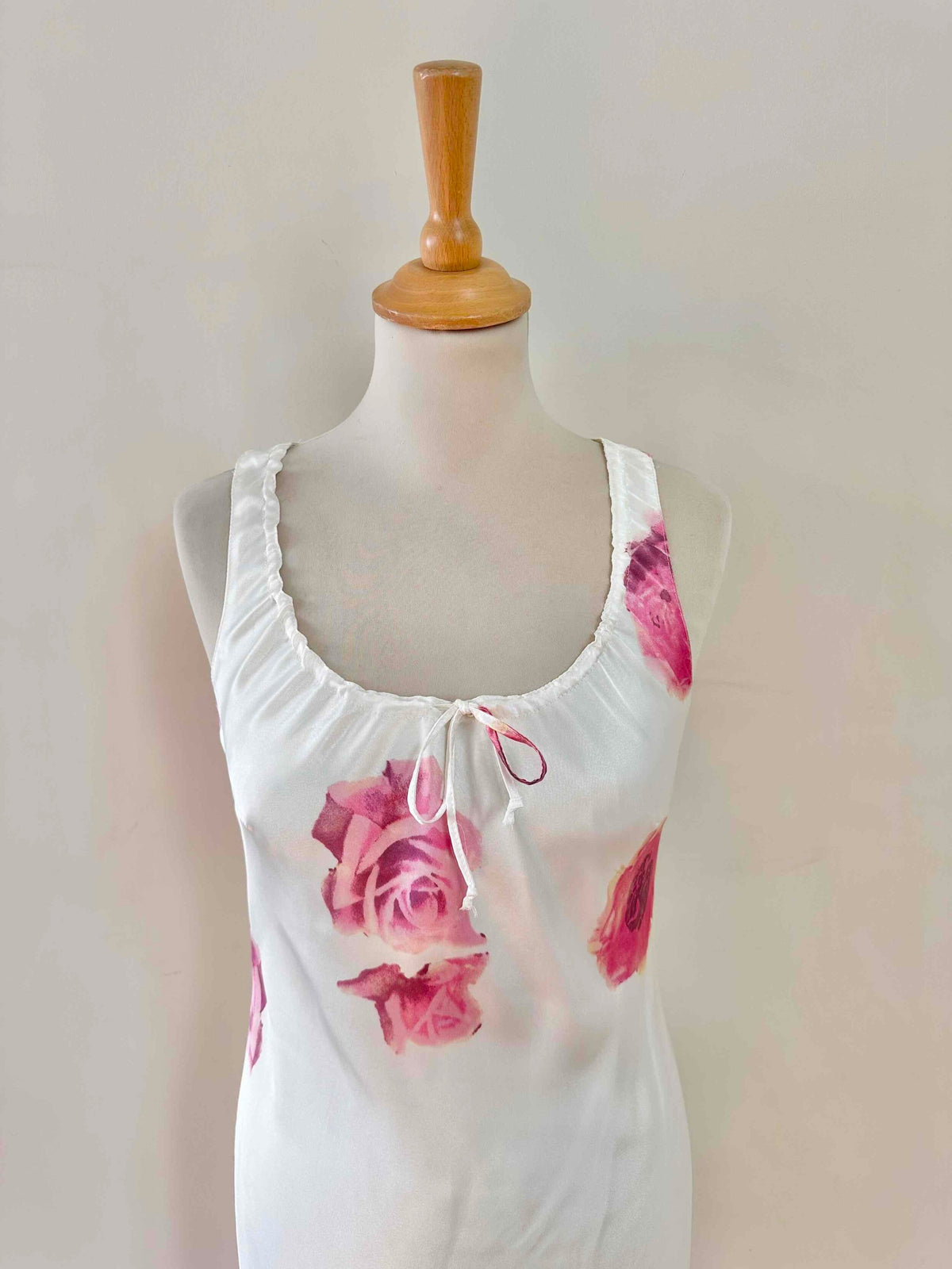 Robe satinée à fleurs, en satin viscose blanc imprimée grandes roses fuchsias et pastels, encolure froncée à nouer, corsage, forme fit and flare en biais, fabriquée en Italie, taille 36, portée ici sur un mannequin T36, aisselles 43 cm.