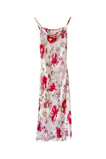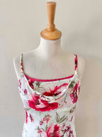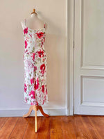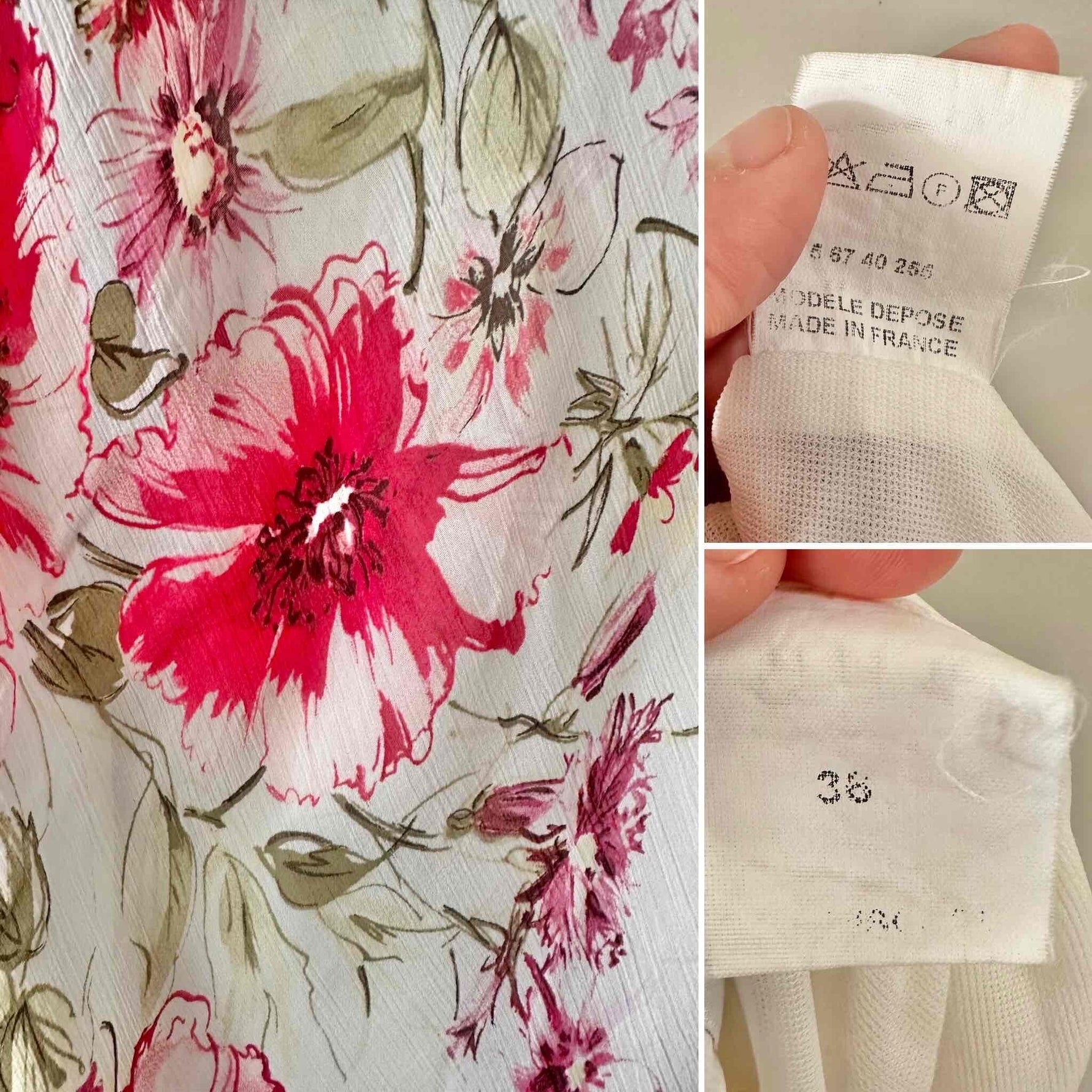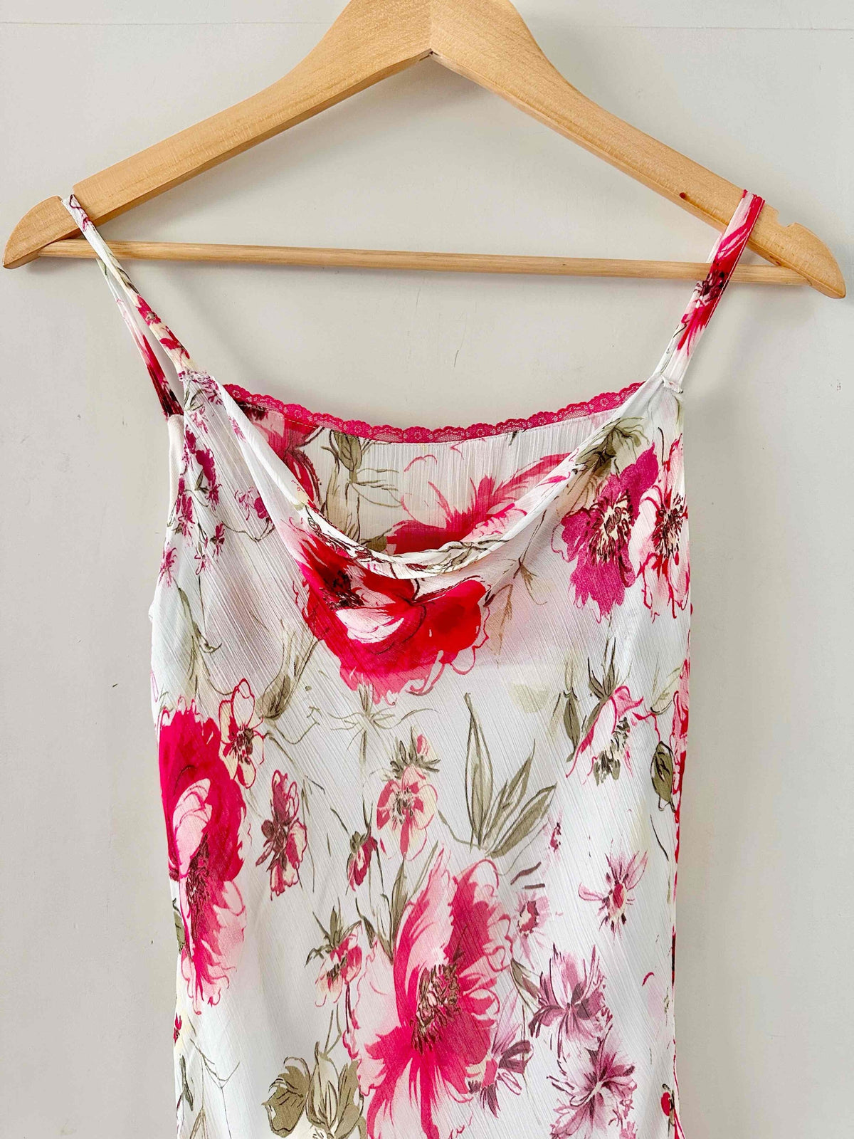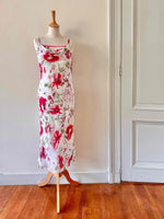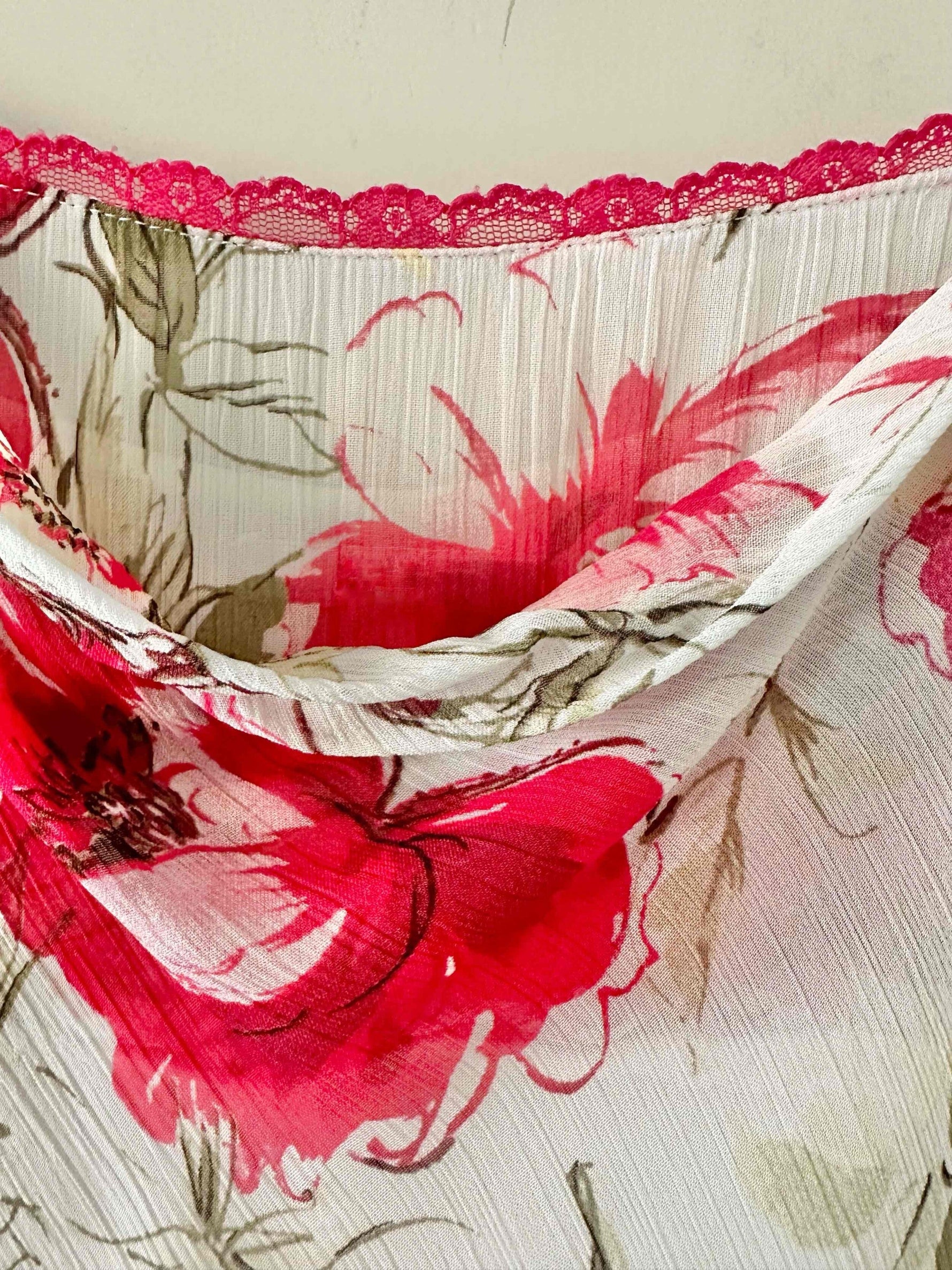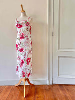 Robe nuisette à fleurs en voile crépon viscose blanc imprimé fleurs roses, fuchsias et vertes, encolure bordée de dentelle et drapé bénitier, bretelles spaghettis, forme fit and flare en biais, fabriquée en France, taille 36, portée ici sur un mannequin T36, aisselles 43 cm.