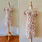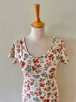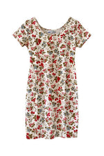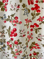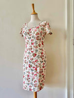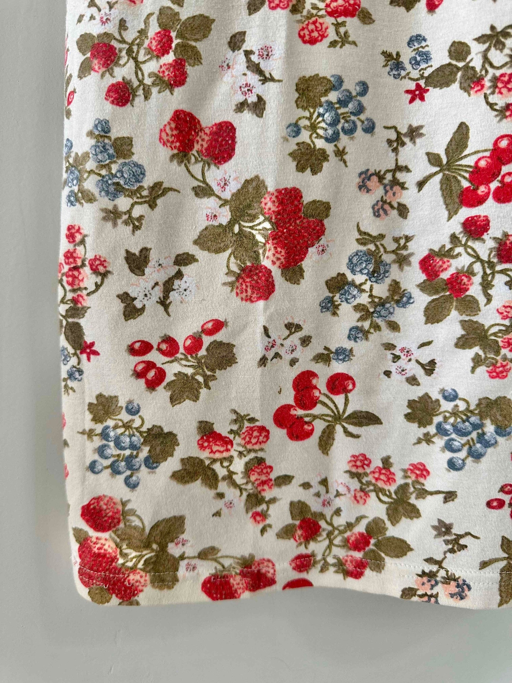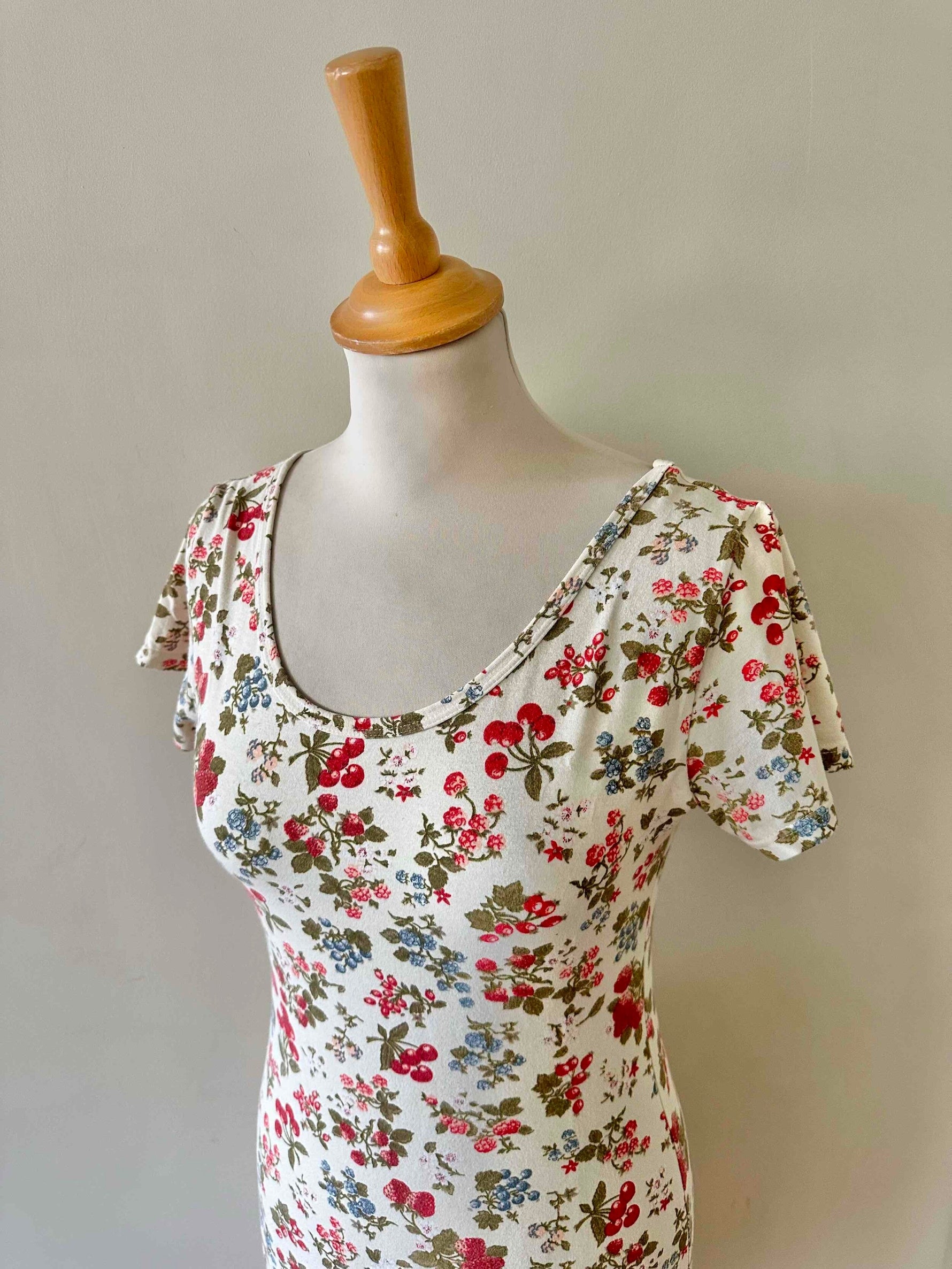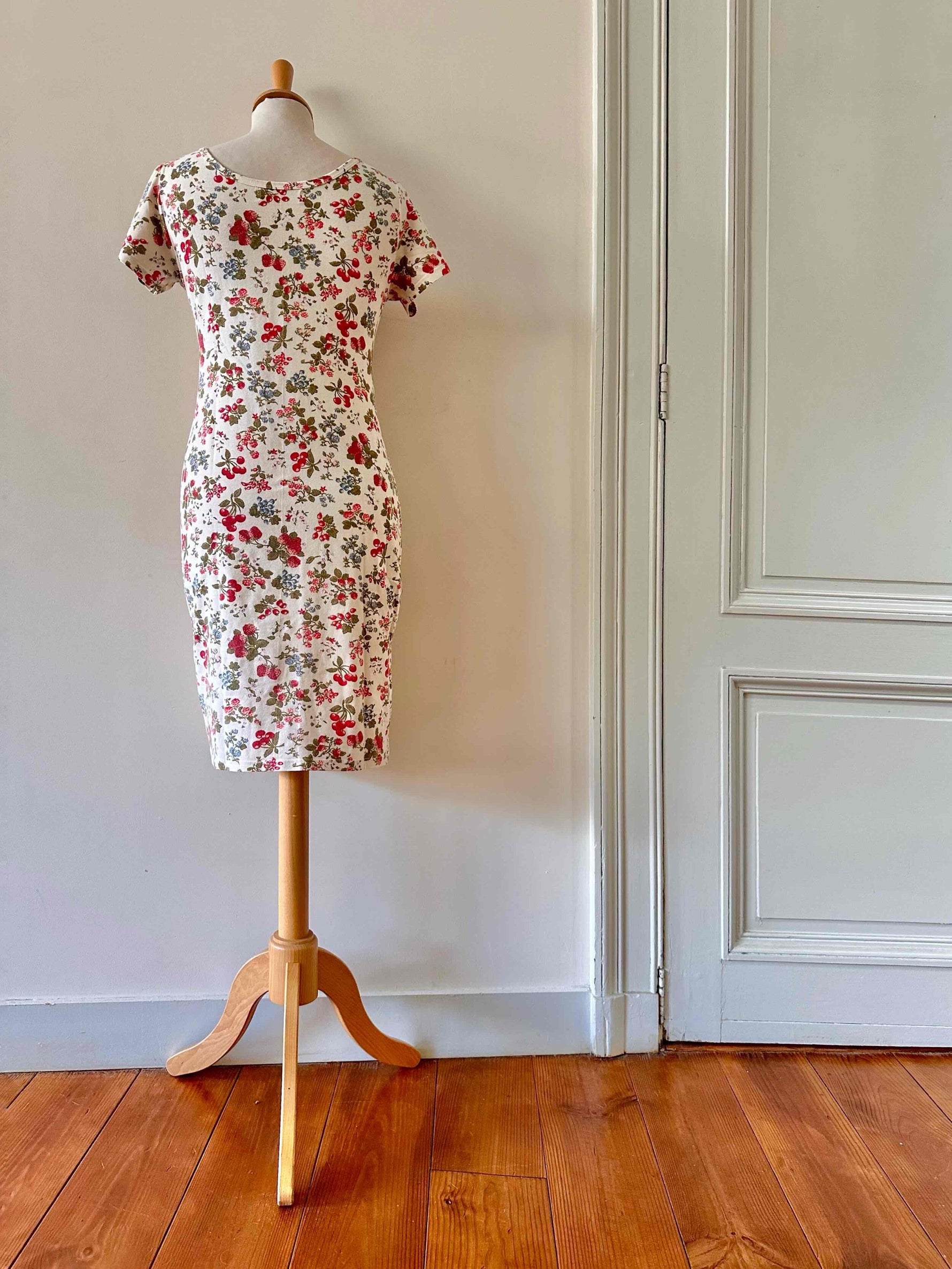 Prix unitaire parRobe tutti-frutti en maille, jersey de coton lycra écru imprimée fruits rouges, fraises, myrtilles, groseilles et framboises, encolure ronde, manches courtes, fabriquée en France, taille 36 et 38, extensible, portée ici sur un mannequin T36.