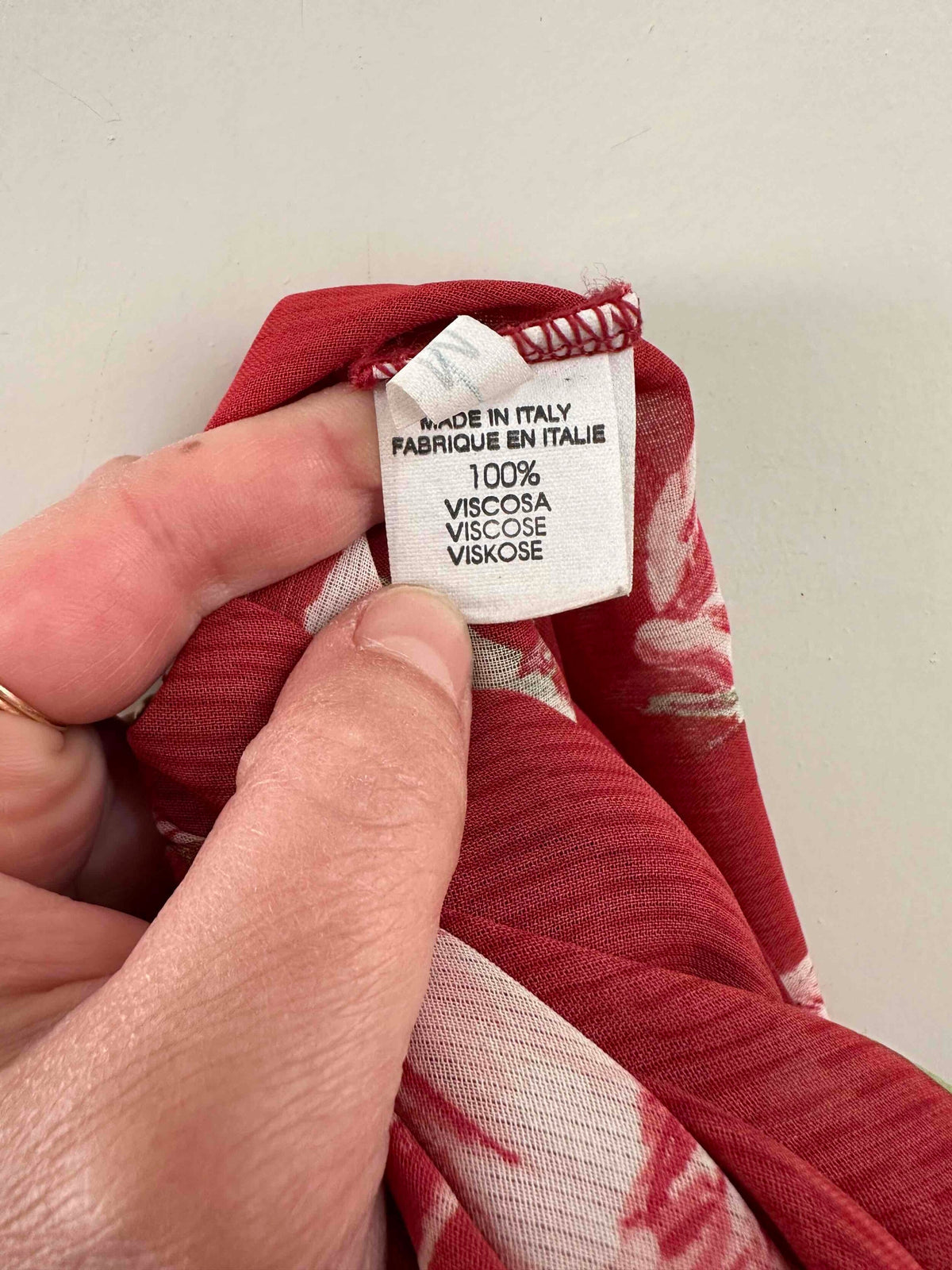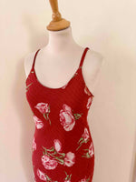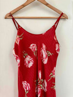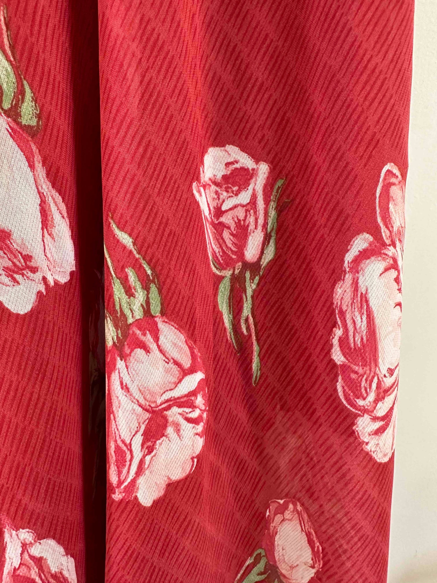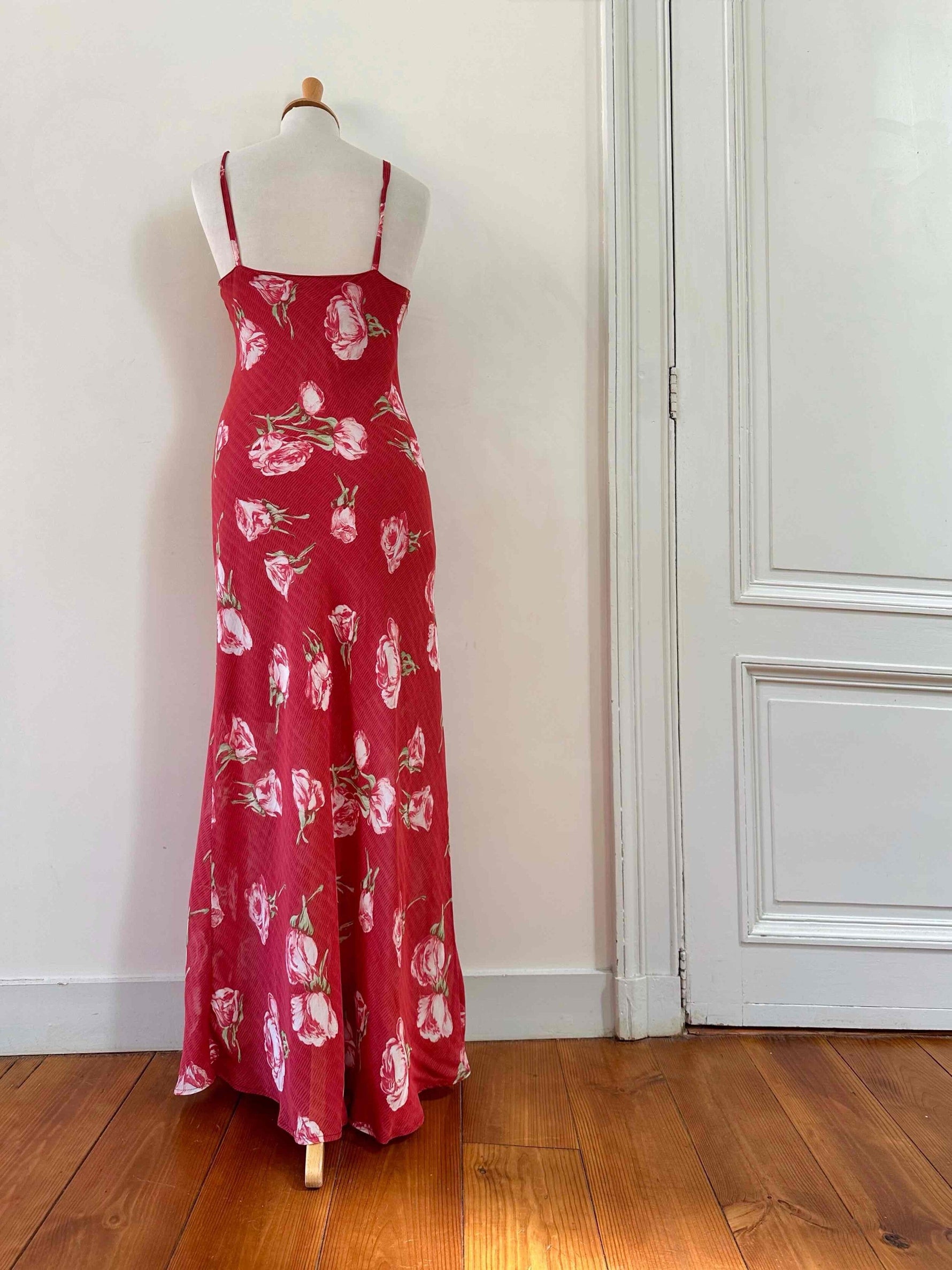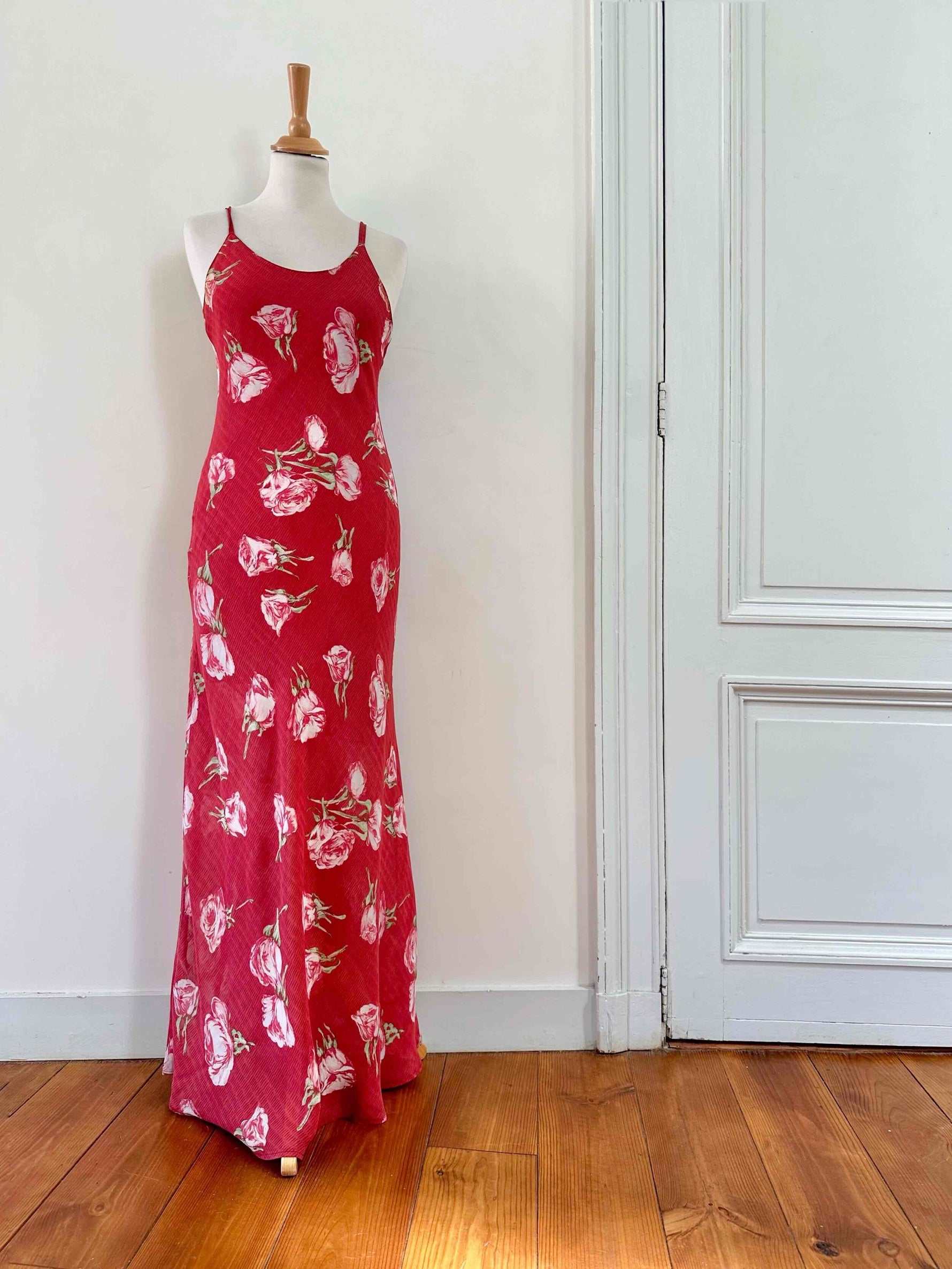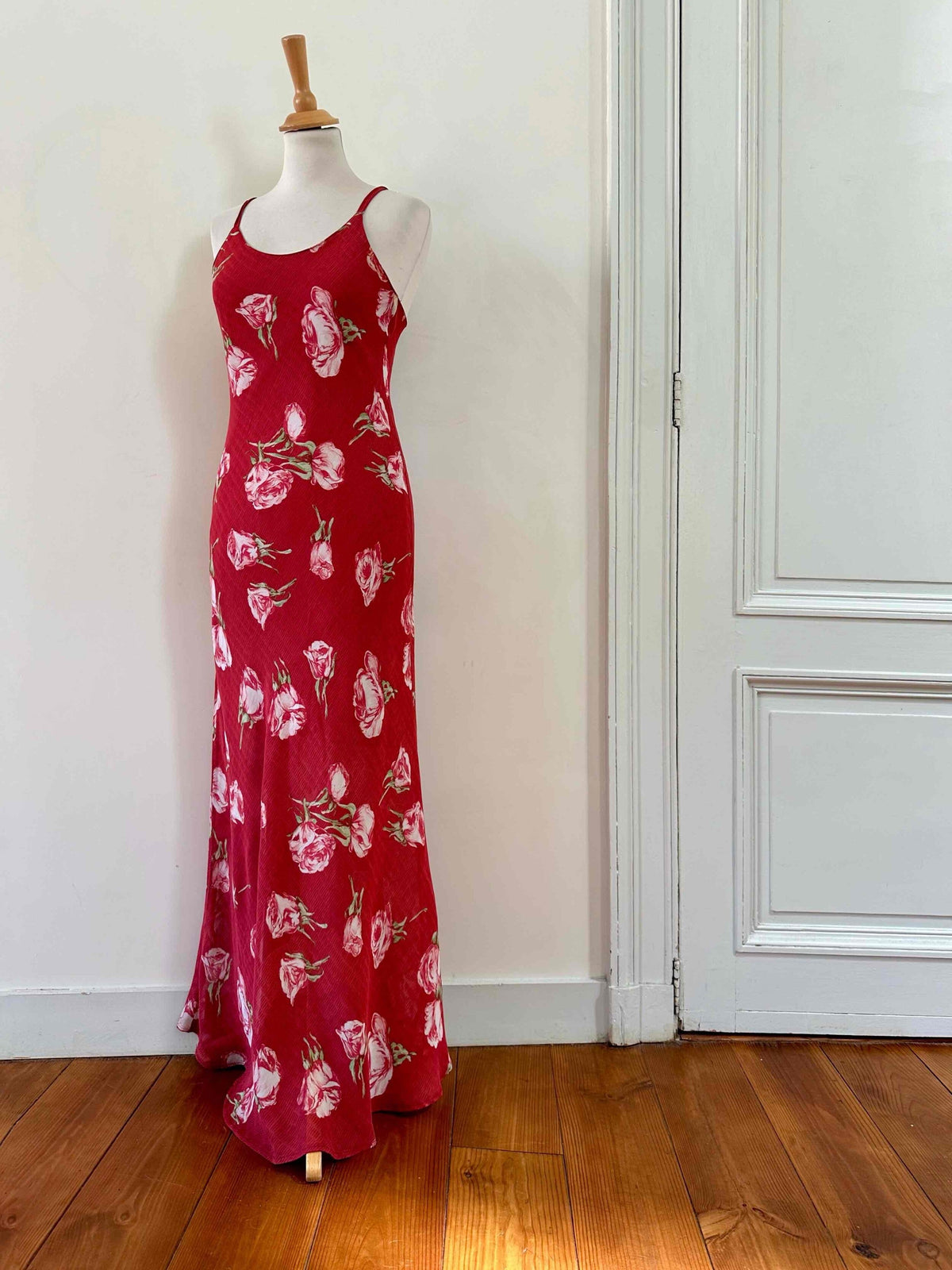 Robe nuisette à fleurs, en mousseline de viscose doublée rouge imprimée fleurs roses, bretelles spaghettis, longueur maxi, fabriquée en Italie, taille 36, portée ici sur un mannequin T36, aisselles 43 cm.
