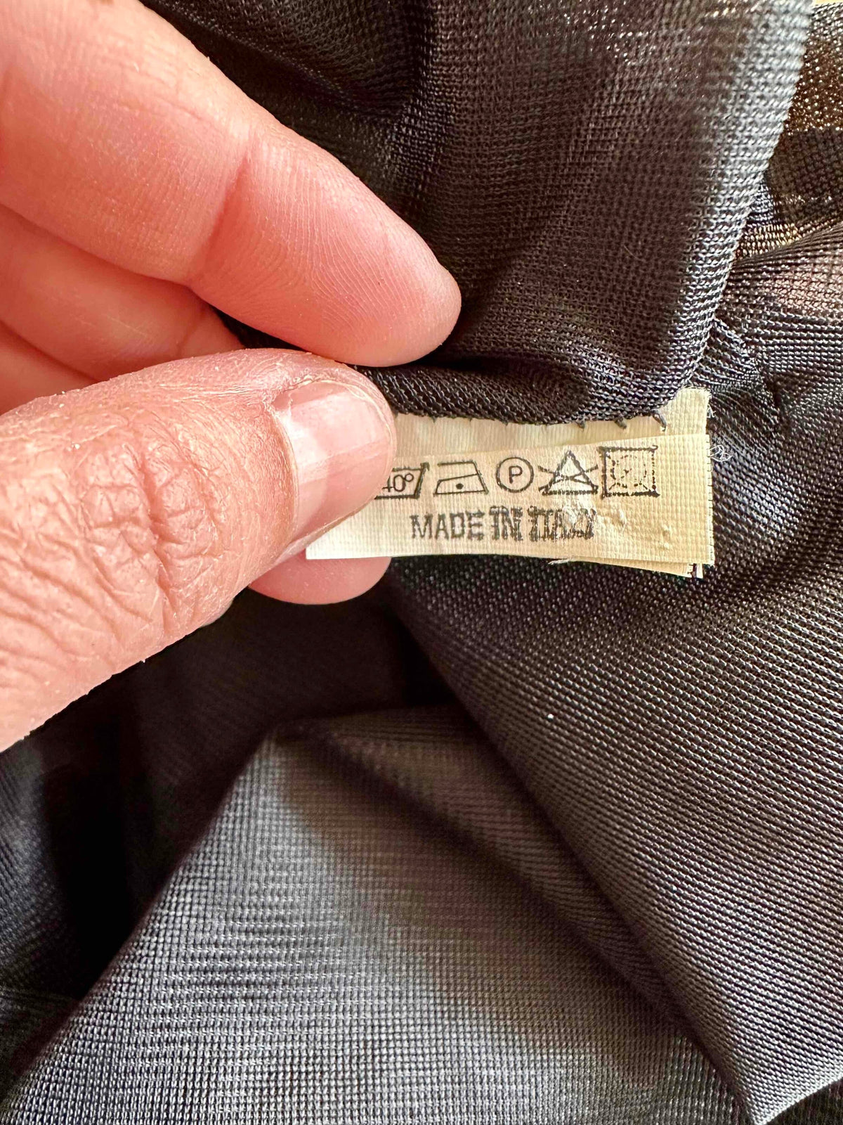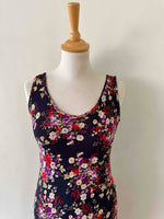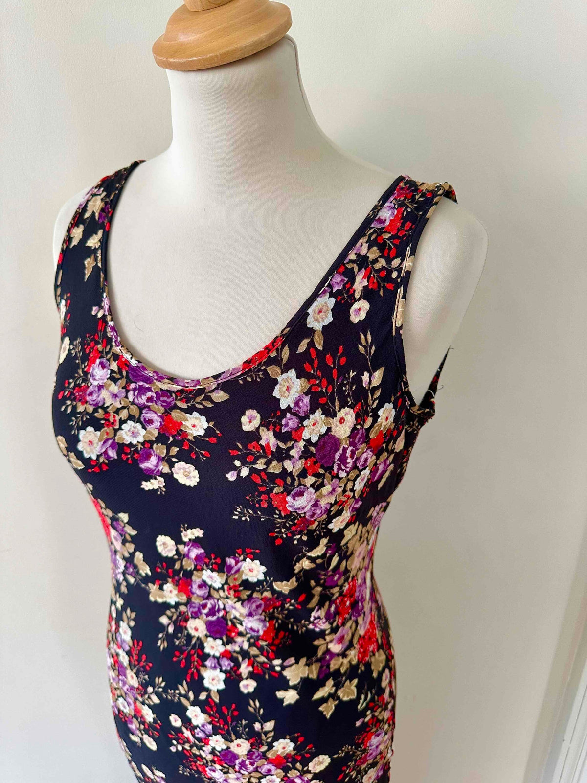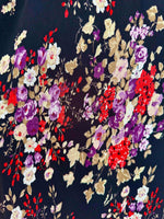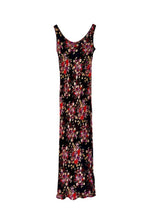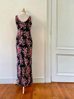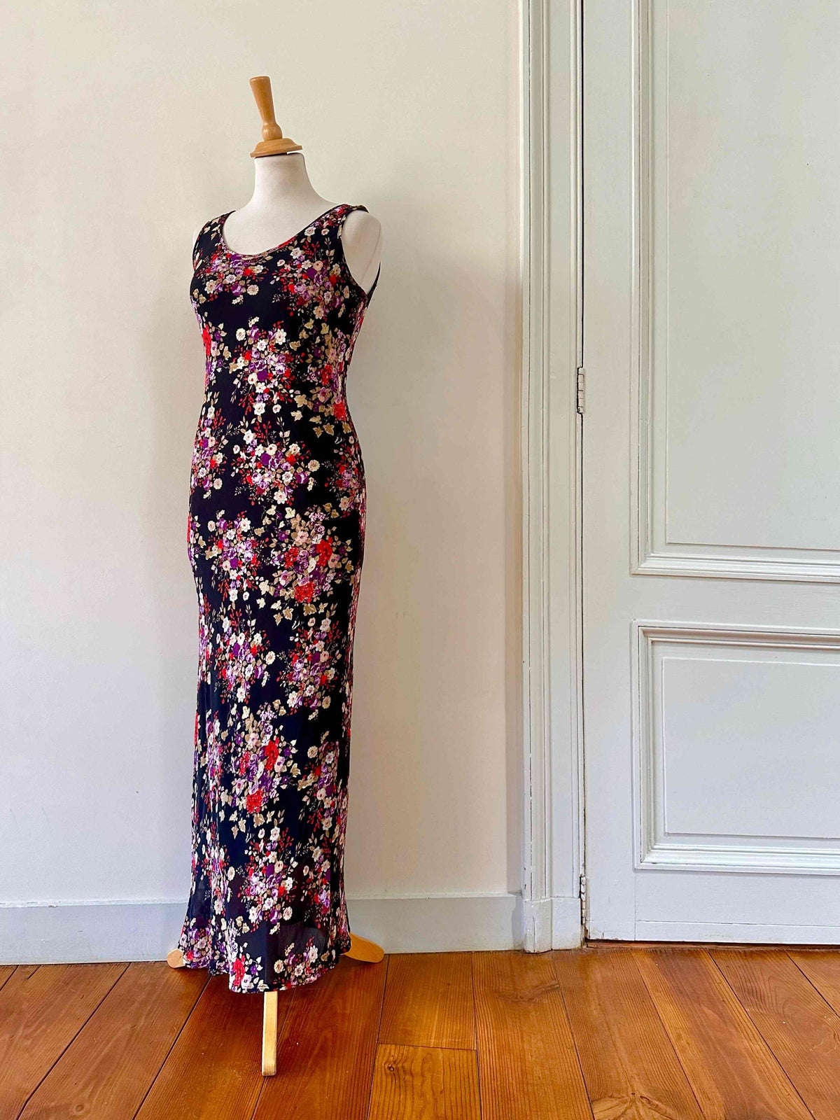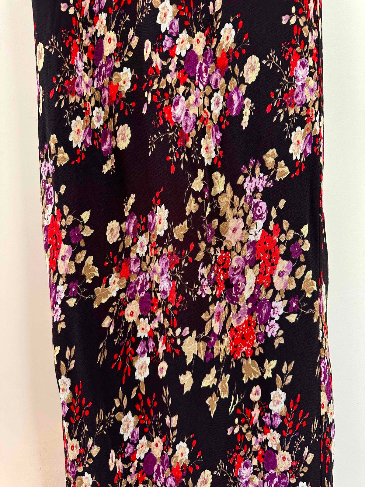 Prix unitaire parRobe longue à fleurs, en voile viscose doublé noire imprimée bouquets de fleurs liberty dans les tons rouges, violets, lilas et blanches, longueur maxi, forme fit and flare en biais, fabriquée en Italie, taille 36, portée ici sur un mannequin T36, aisselles 43 cm.