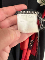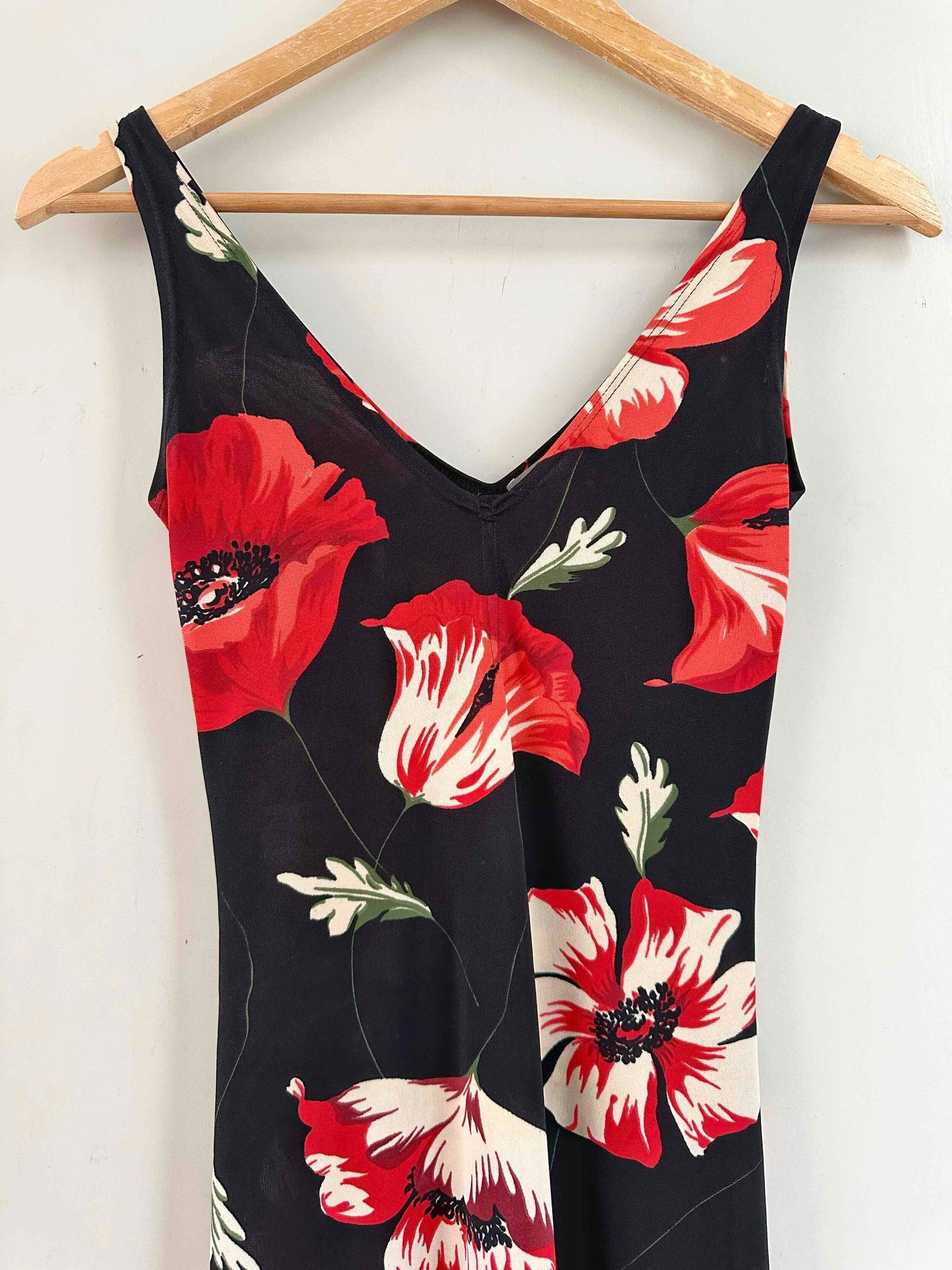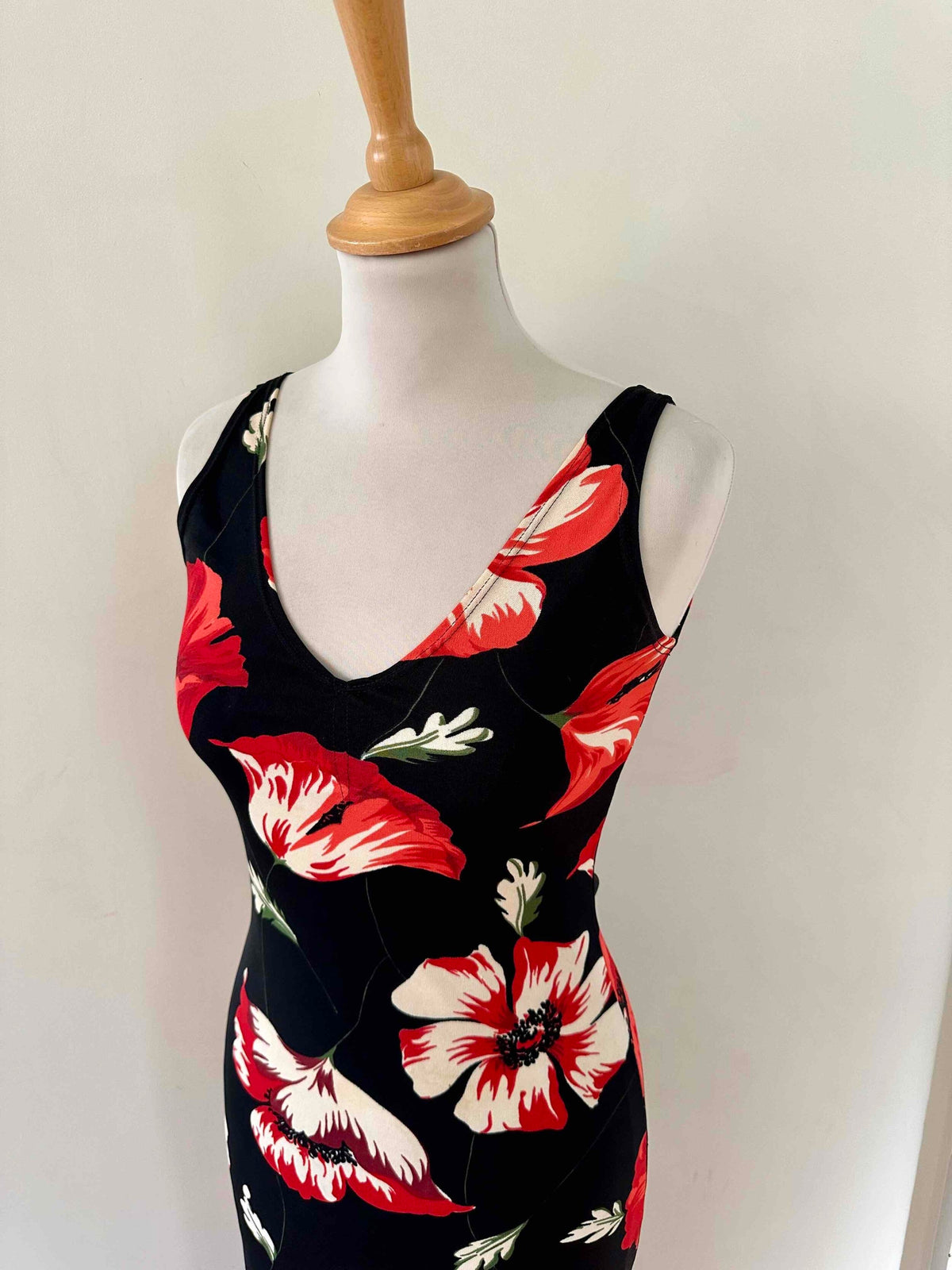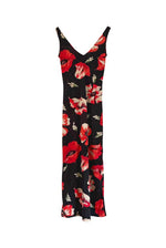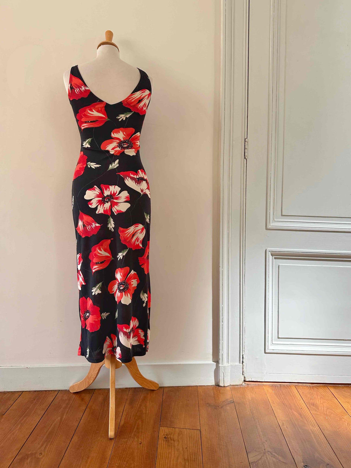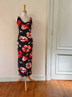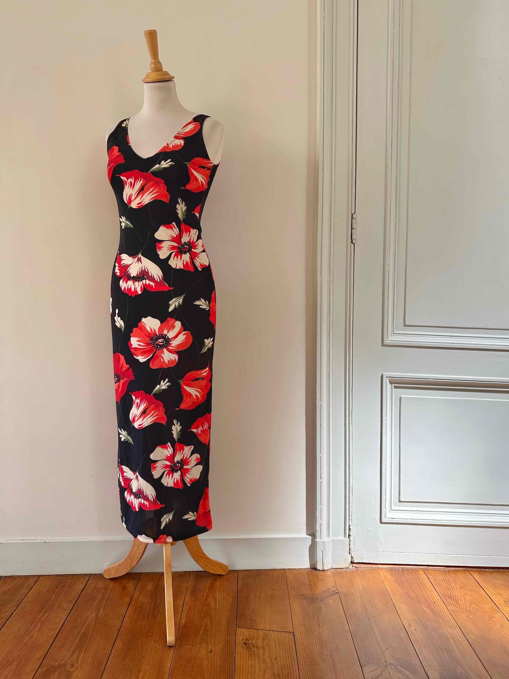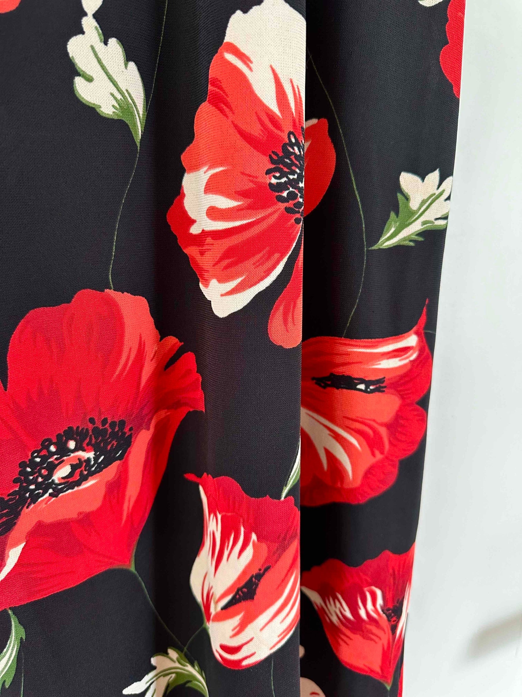 Prix unitaire parRobe longue à fleurs, en maille fluide polyamide noire imprimée grandes fleurs de coquelicots rouges, blanches et vertes, col V, longue, fabriquée en France, taille 36 portée ici sur un mannequin T36.