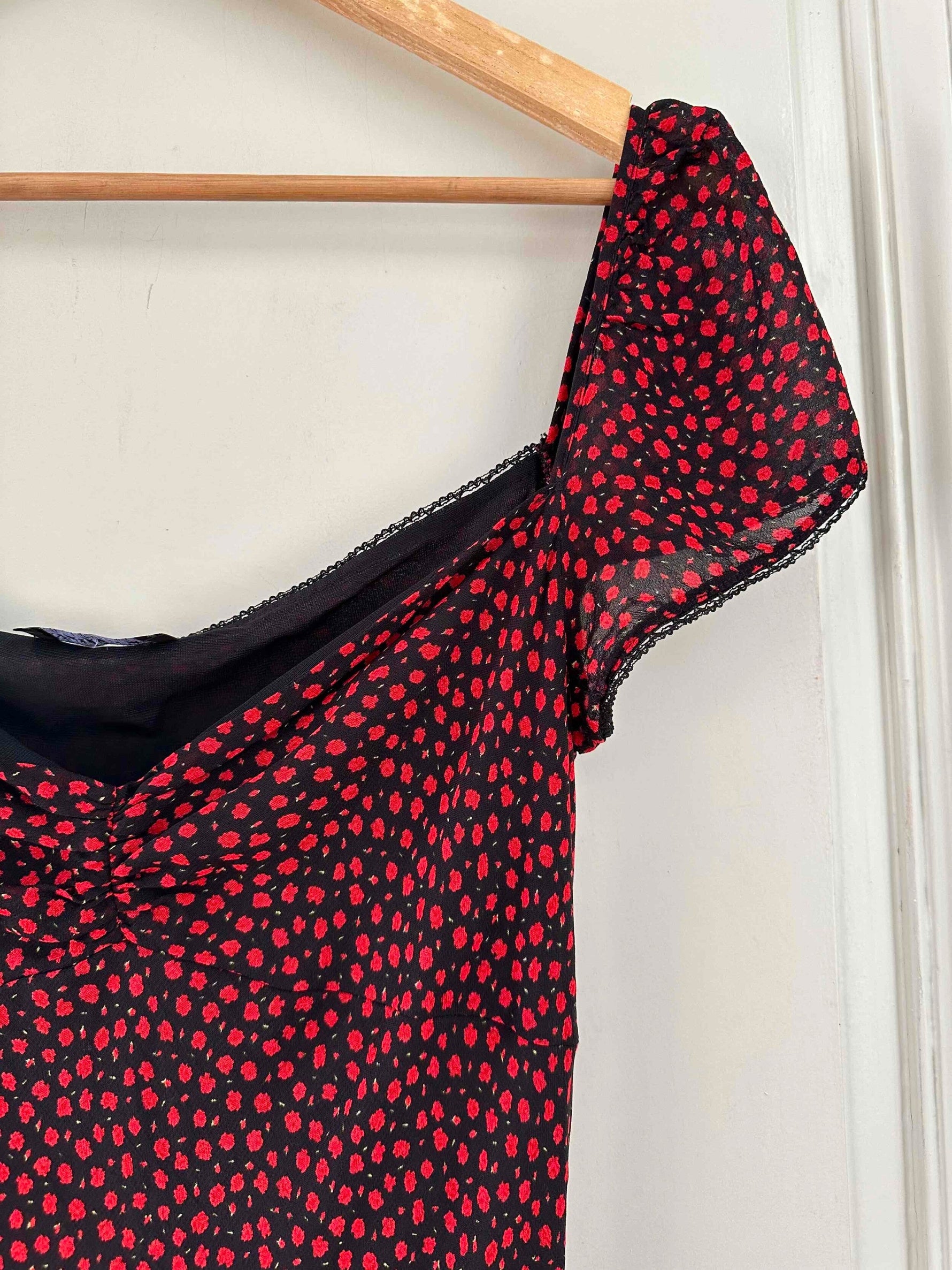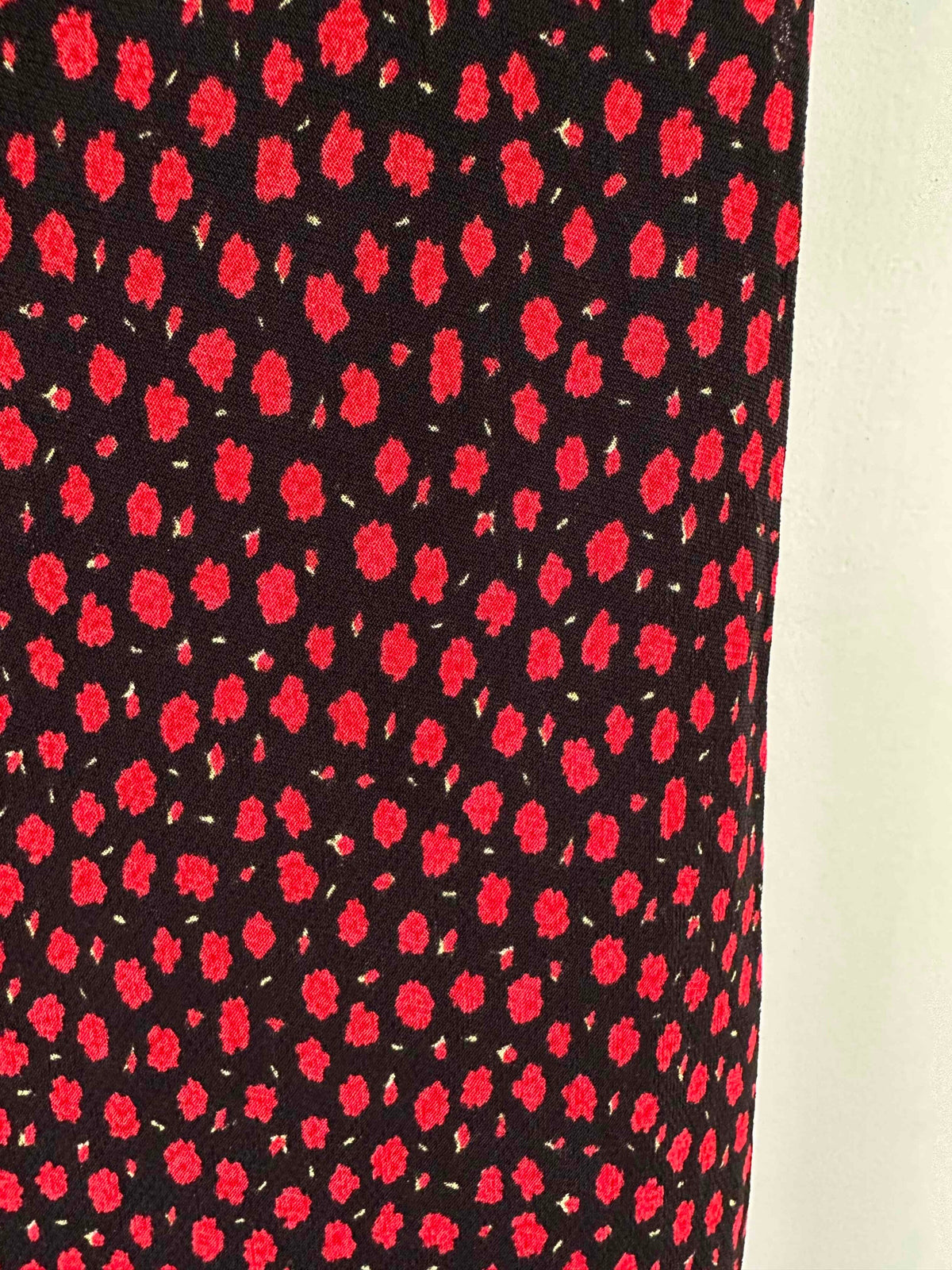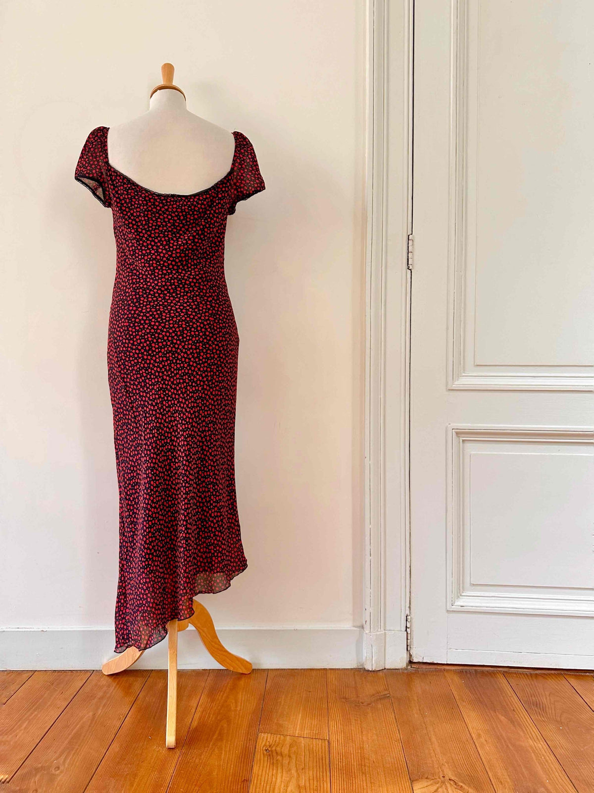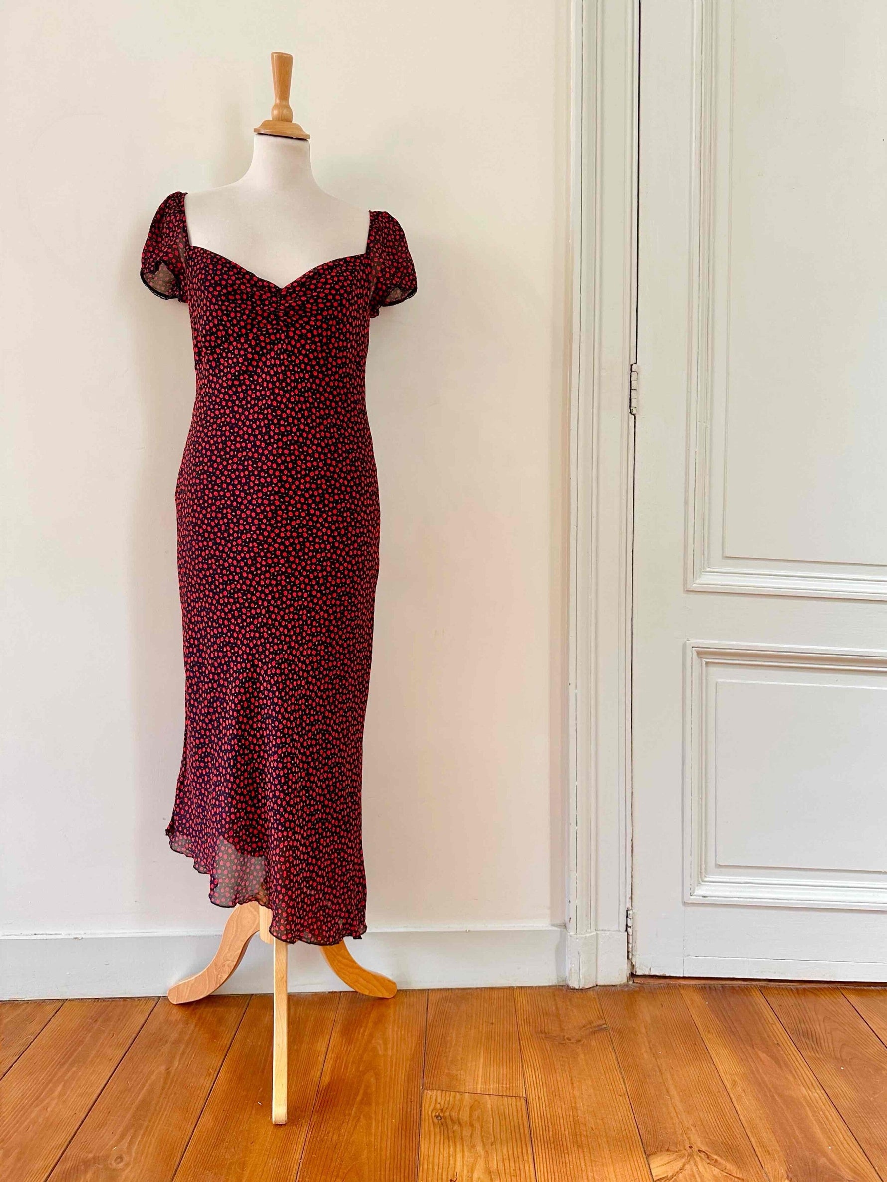 Prix unitaire parRobe à fleurs, en voile viscose doublé noir imprimé minis fleurs rouges et vertes, encolure corsage froncée, manches ballons gigots, longueur asymétrique, forme en biais, fabriquée en France, taille 36 portée ici sur un mannequin T36, aisselles 43 cm.