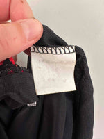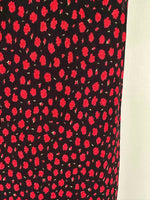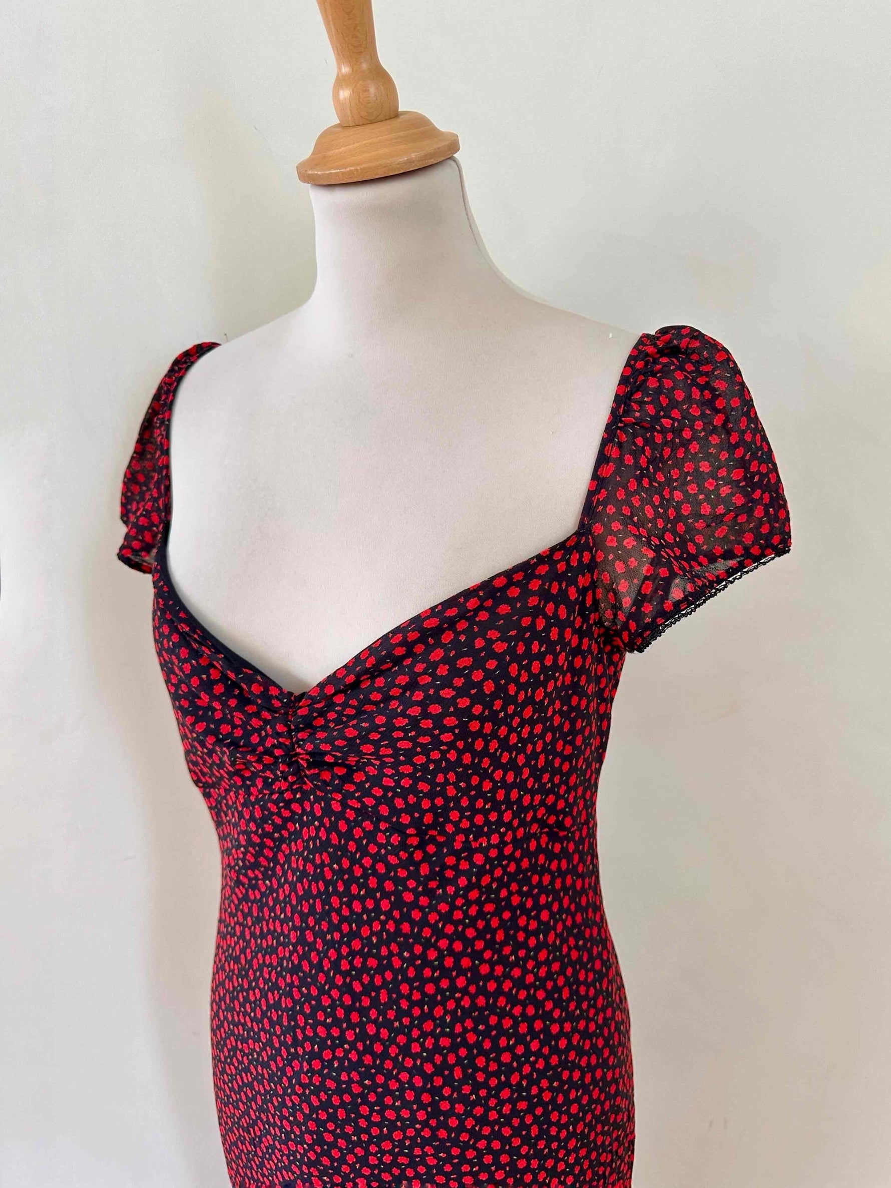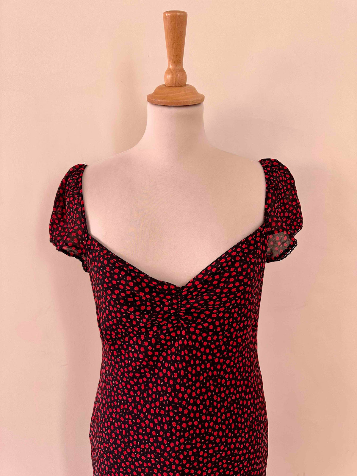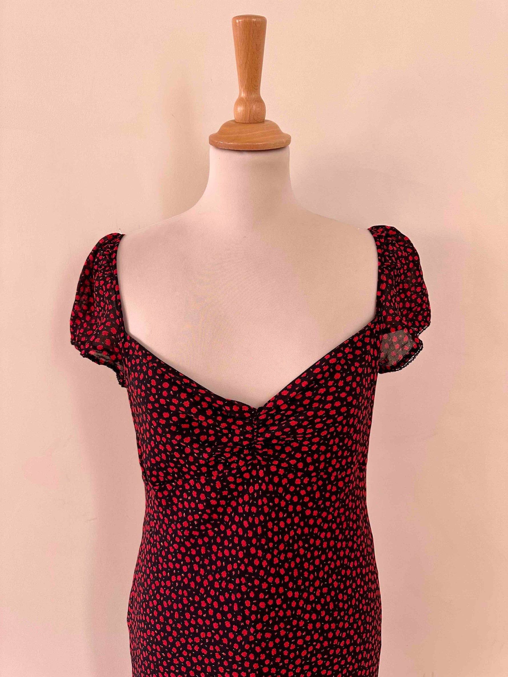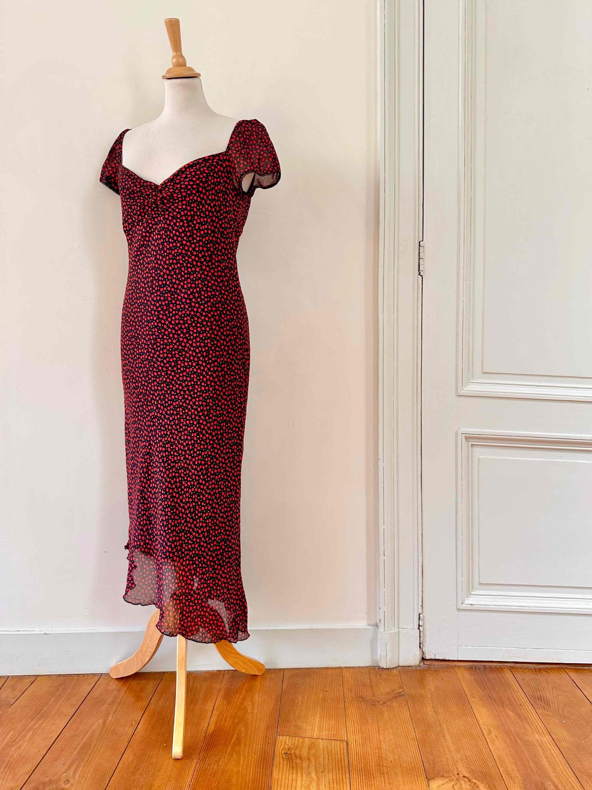 Prix unitaire parRobe à fleurs, en voile viscose doublé noir imprimé minis fleurs rouges et vertes, encolure corsage froncée, manches ballons gigots, longueur asymétrique, forme en biais, fabriquée en France, taille 36 portée ici sur un mannequin T36, aisselles 43 cm.