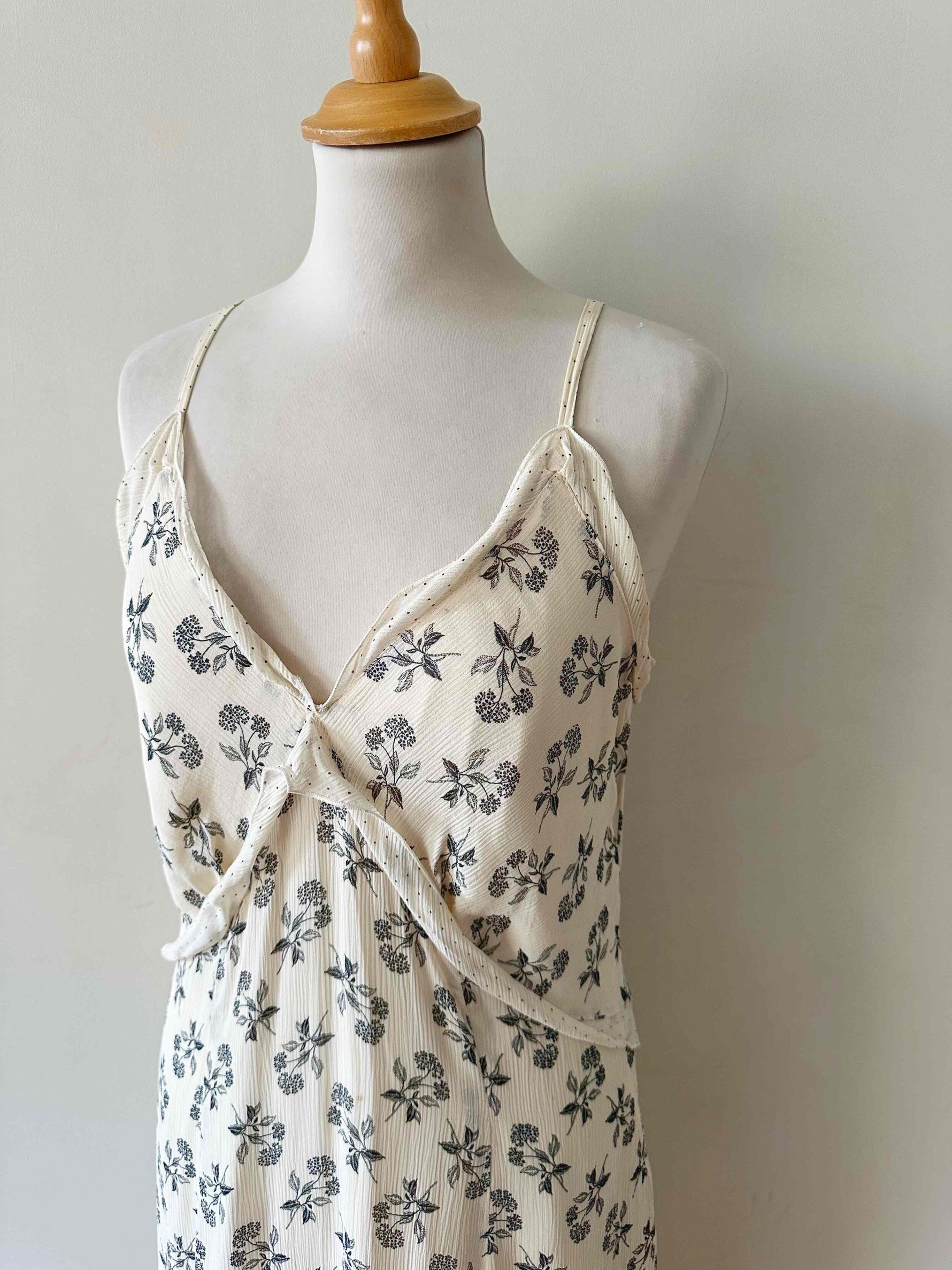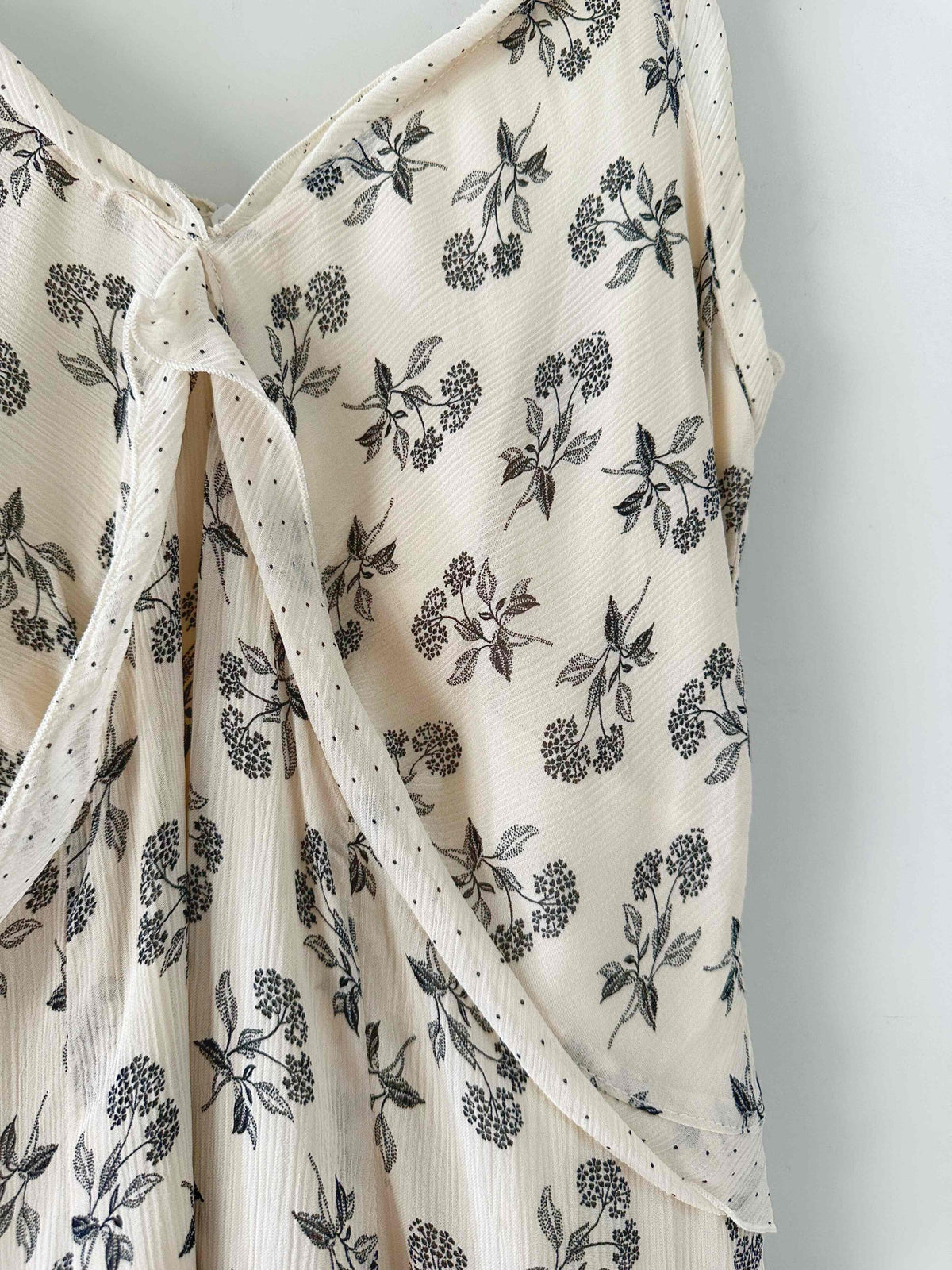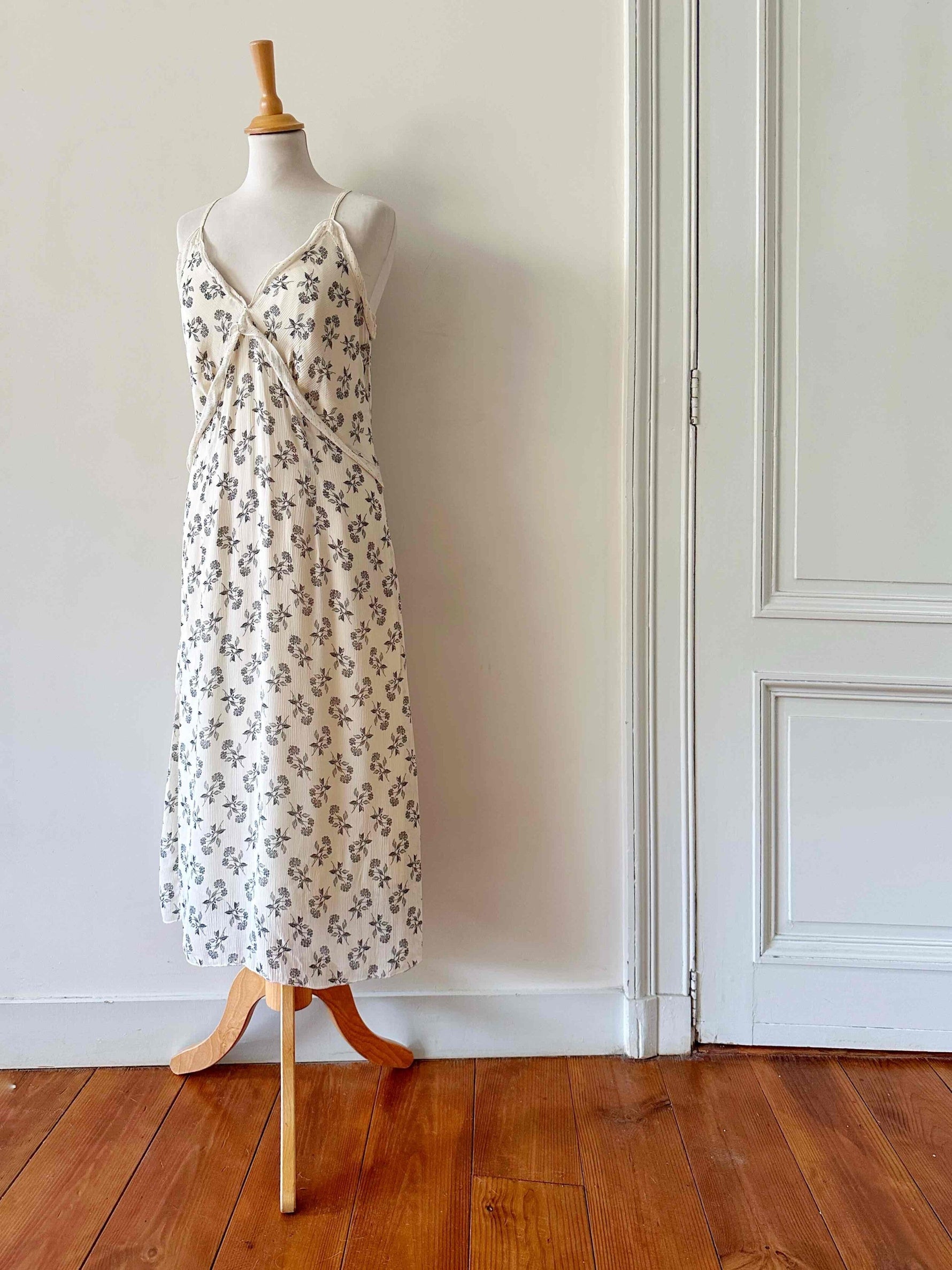 Prix unitaire parRobe nuisette fleurs et pois, en voile viscose crépon écrue, imprimée fleurs et pois noirs, découpes sous poitrine volantées, bretelles fines, fabriquée en France, taille 36, actuelle portée ici sur un mannequin T36, aisselles 44 cm.