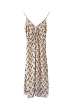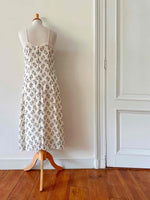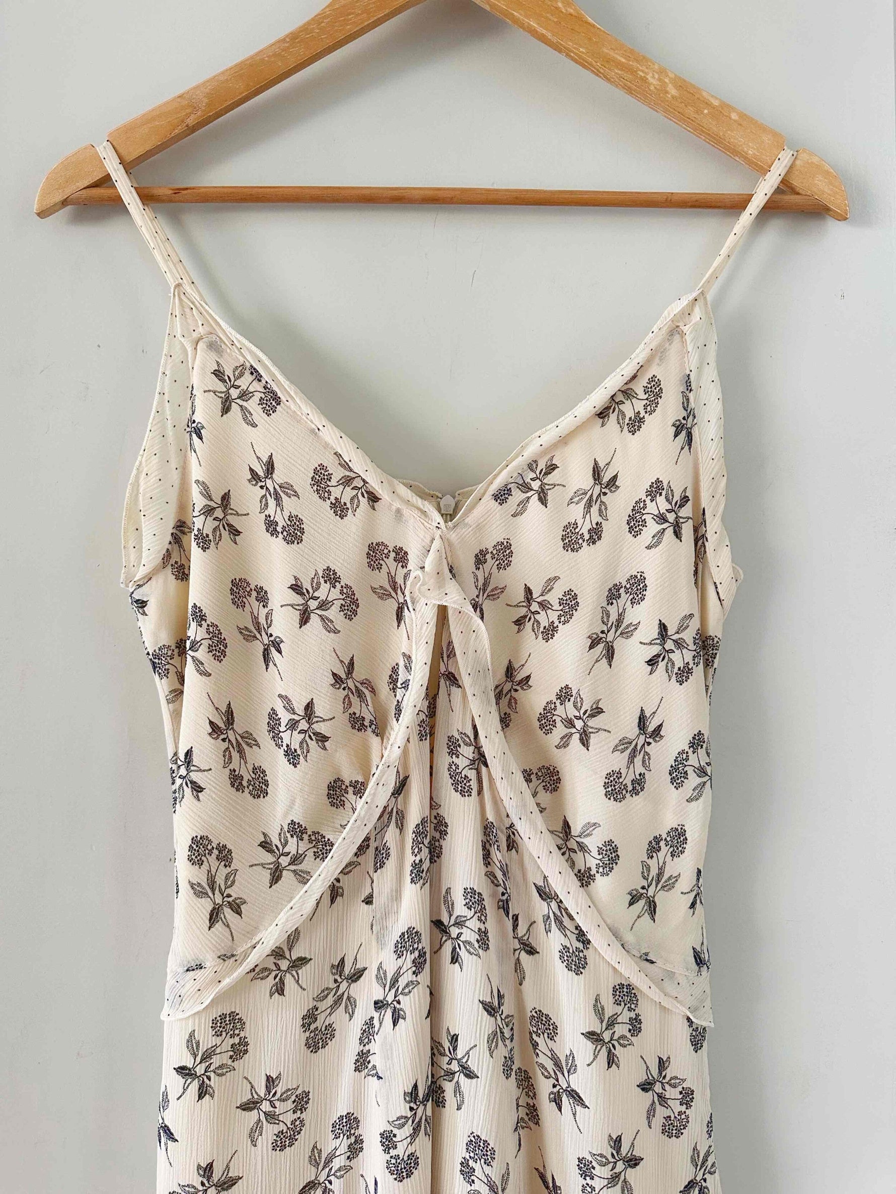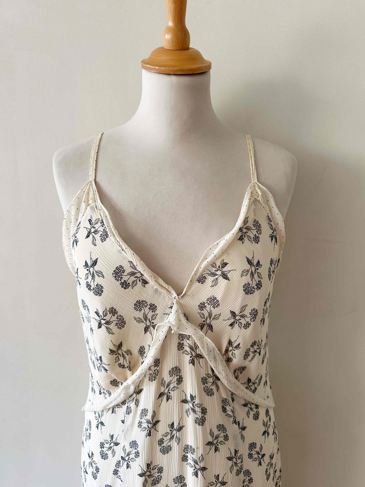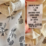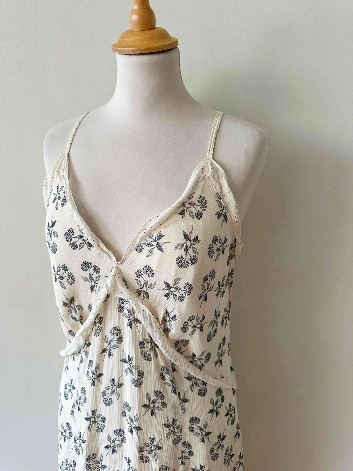 Prix unitaire parRobe nuisette fleurs et pois, en voile viscose crépon écrue, imprimée fleurs et pois noirs, découpes sous poitrine volantées, bretelles fines, fabriquée en France, taille 36, actuelle portée ici sur un mannequin T36, aisselles 44 cm.