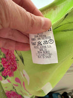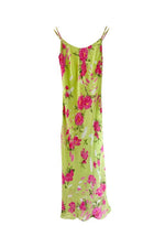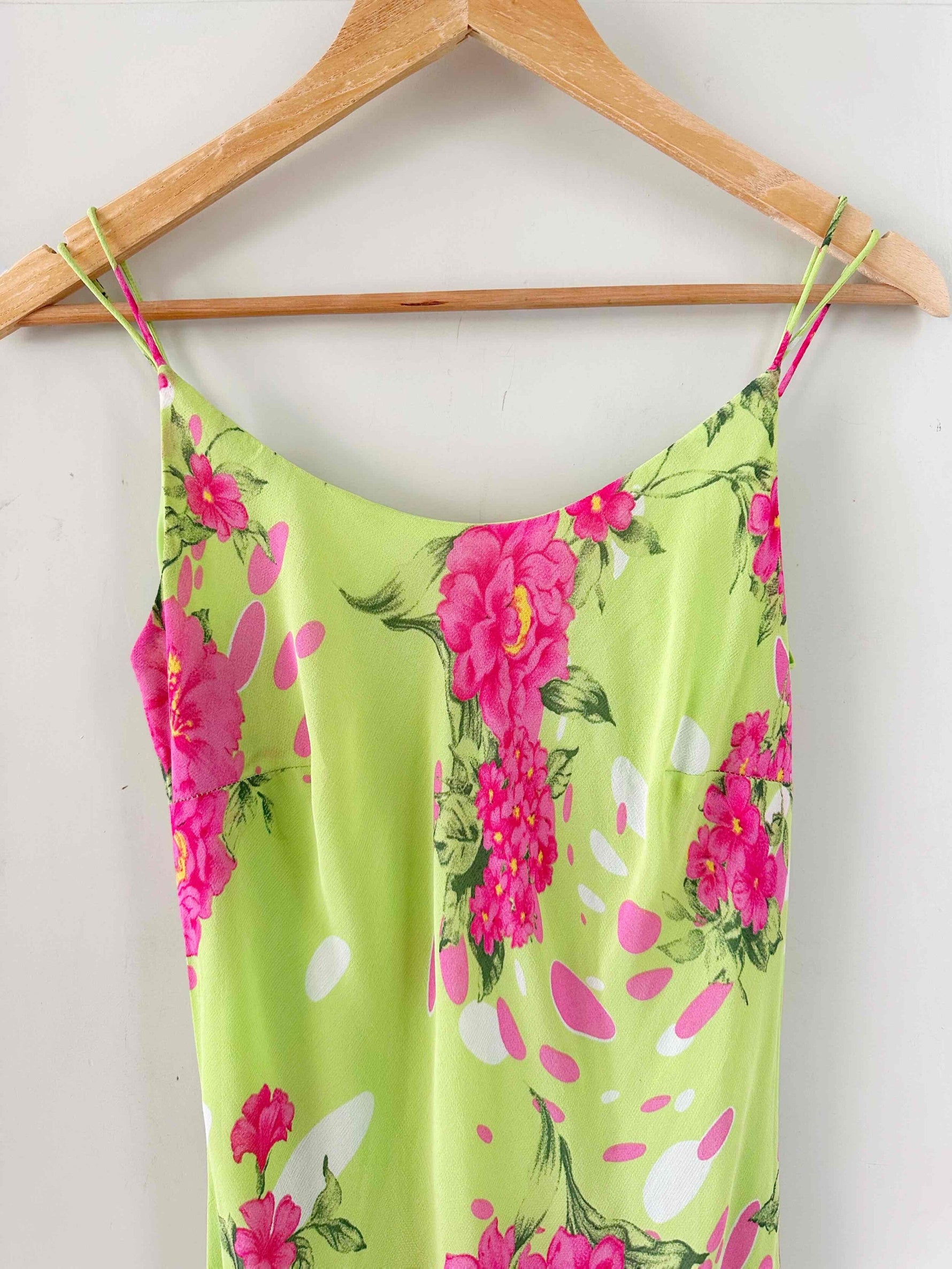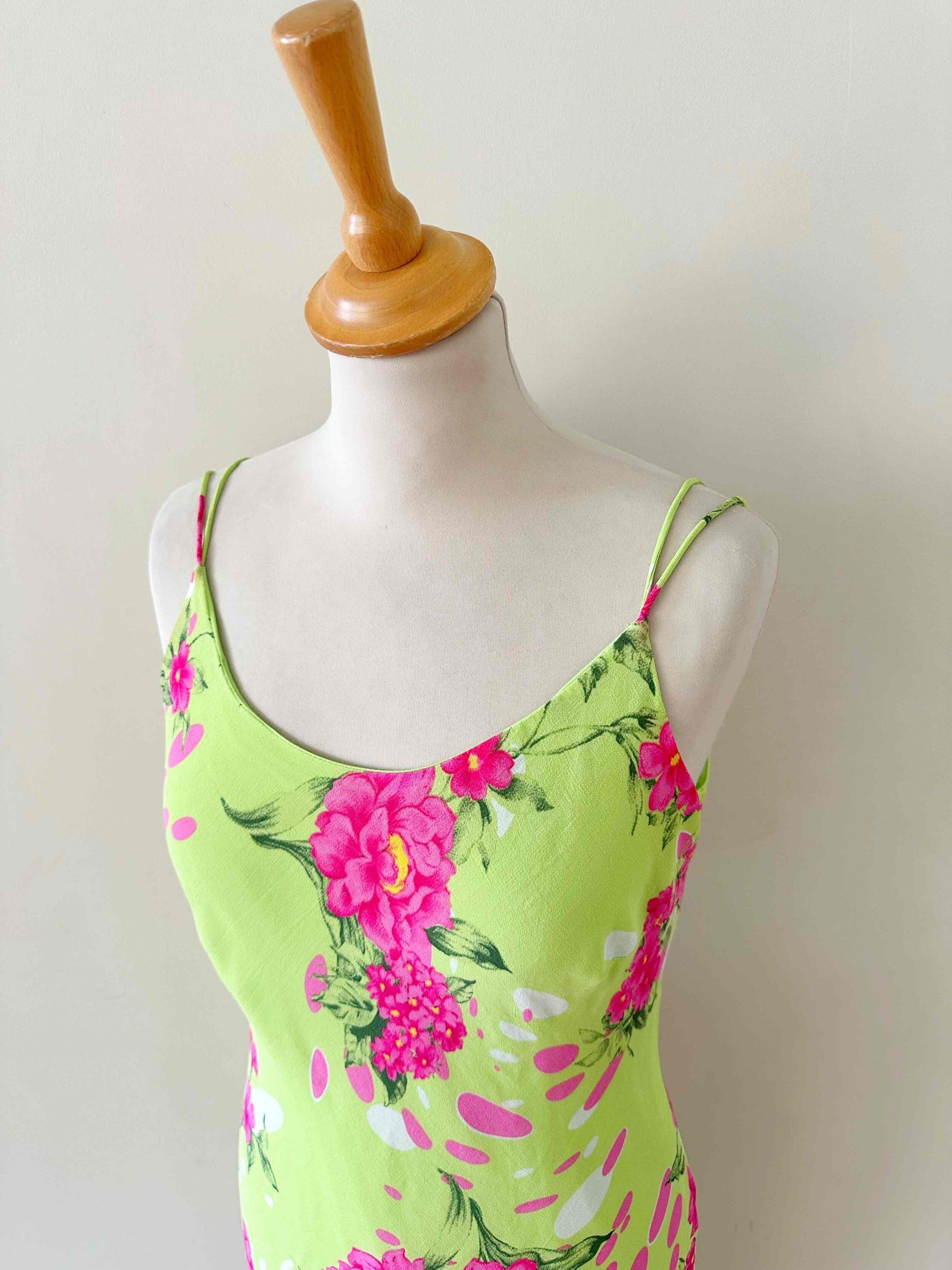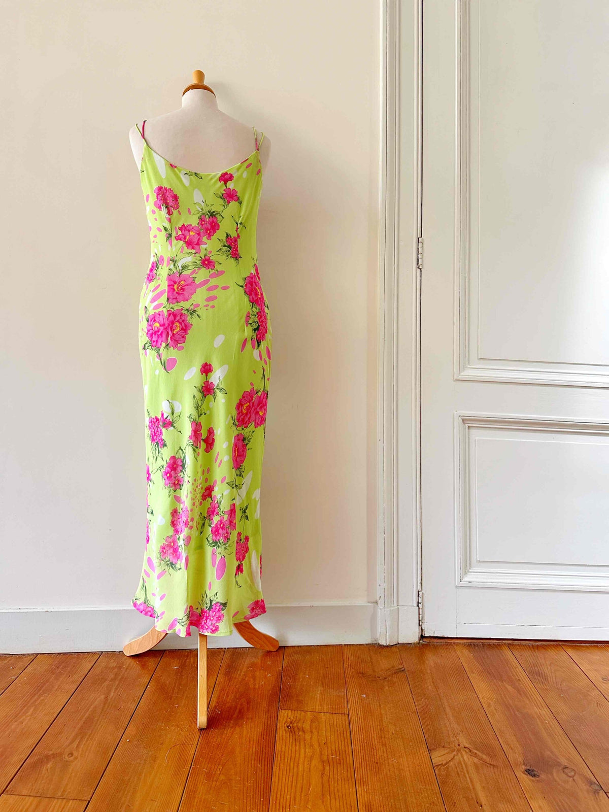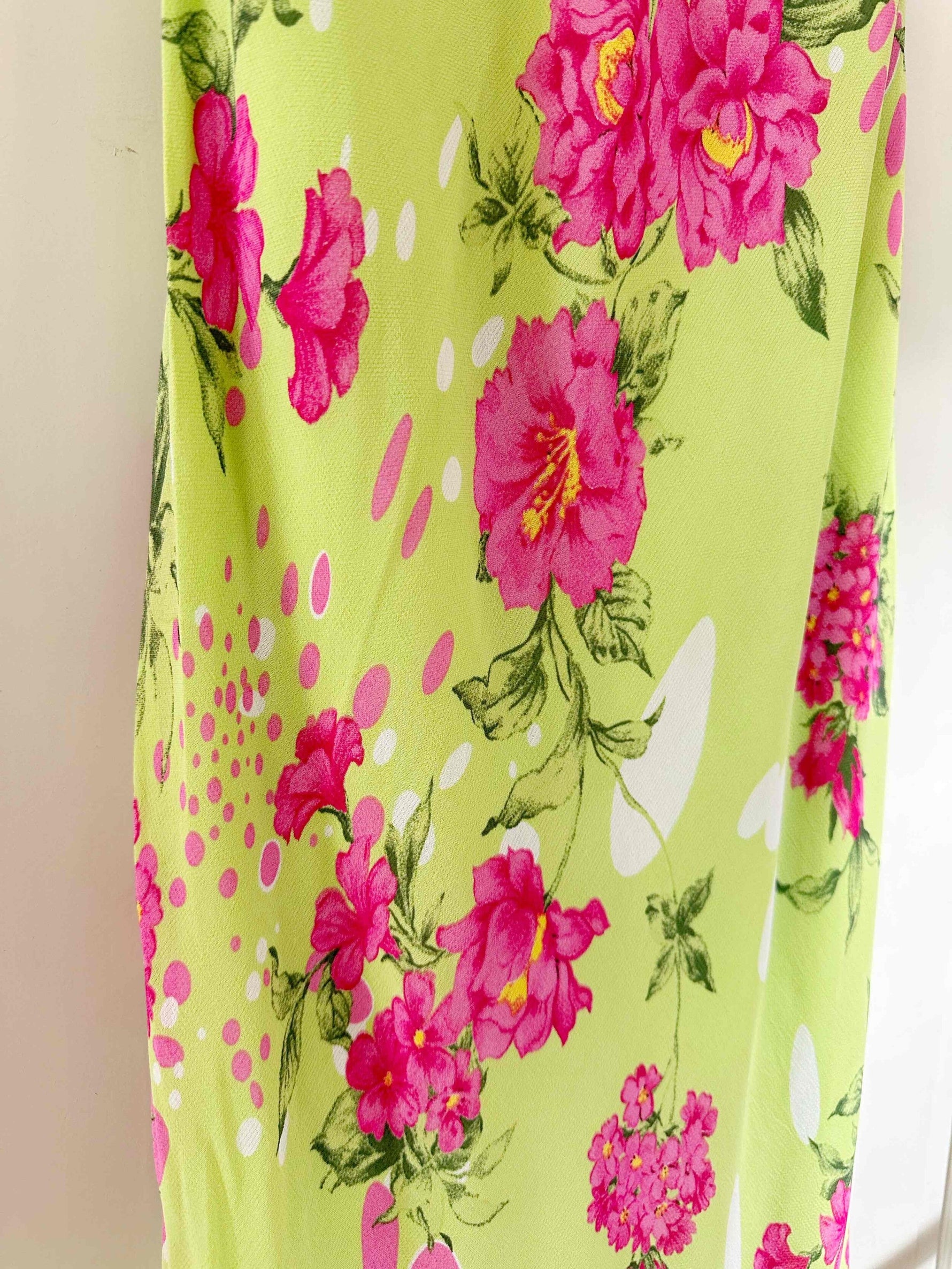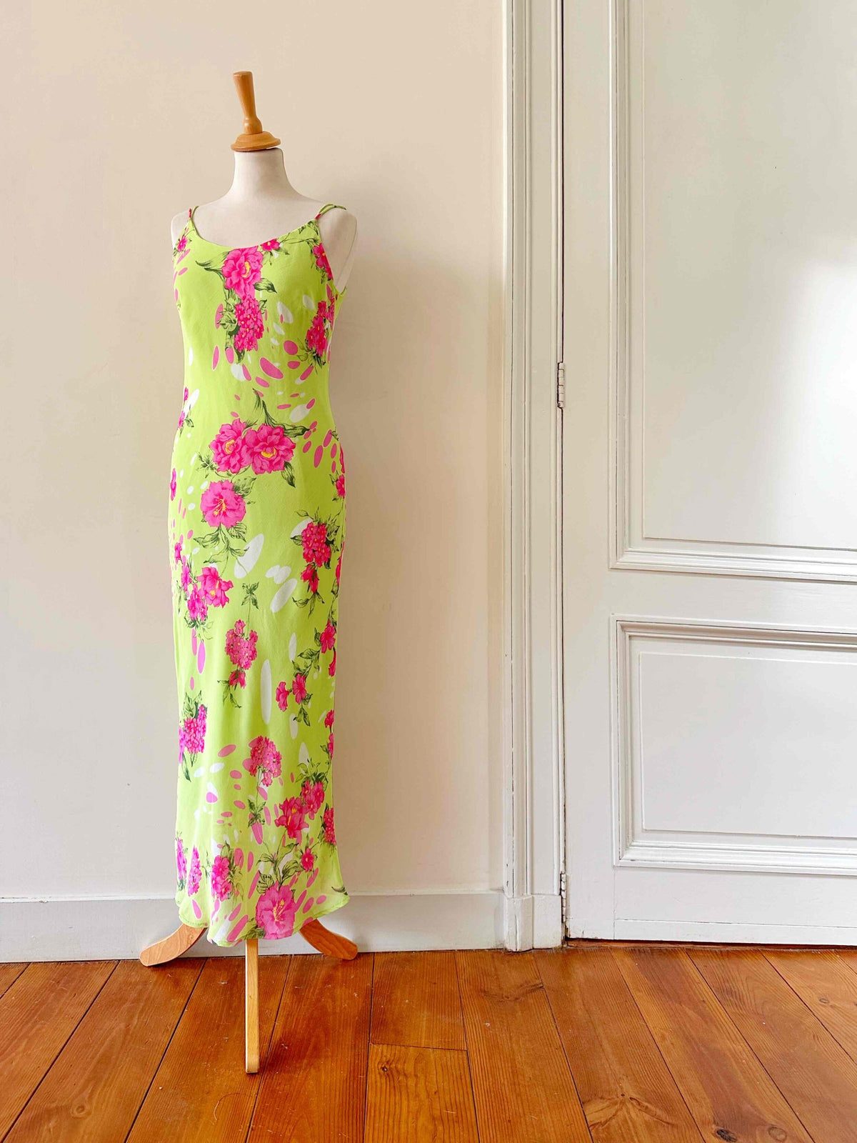 Prix unitaire parRobe nuisette à fleurs, en voile viscose doublé citron vert, imprimées fleurs rose fuchsia et pois blancs, double bretelles spaghettis, forme longue et en biais, fabriquée en Espagne, taille 36, portée ici sur un mannequin T36. Aisselles 43 cm.