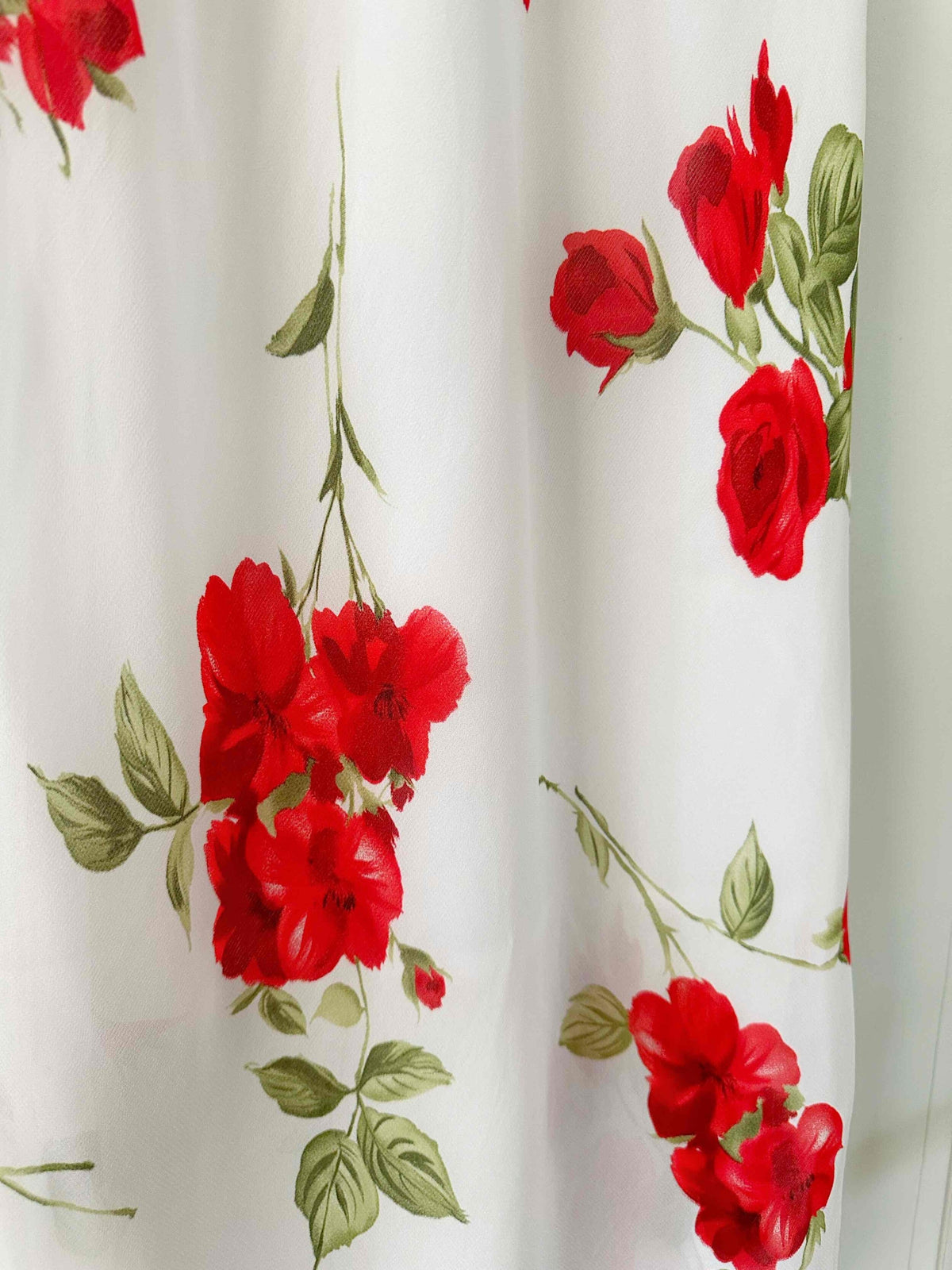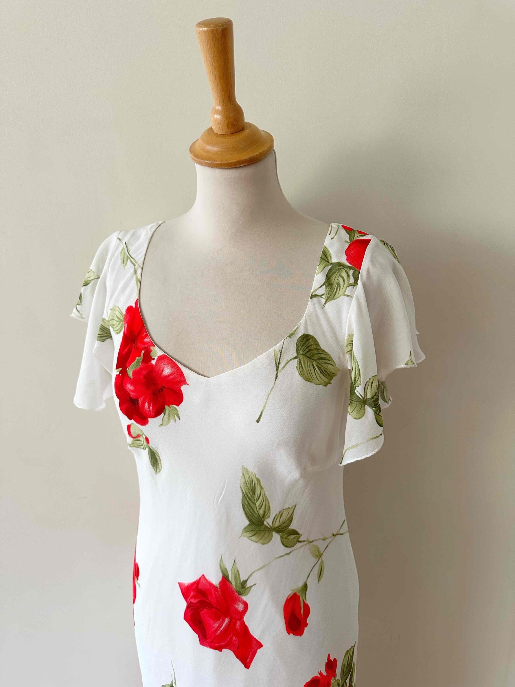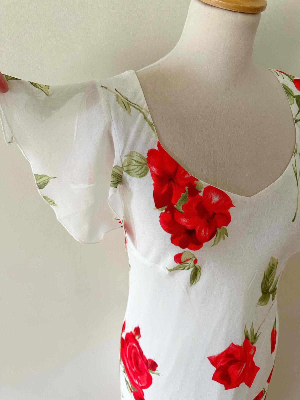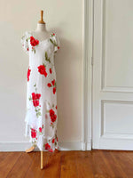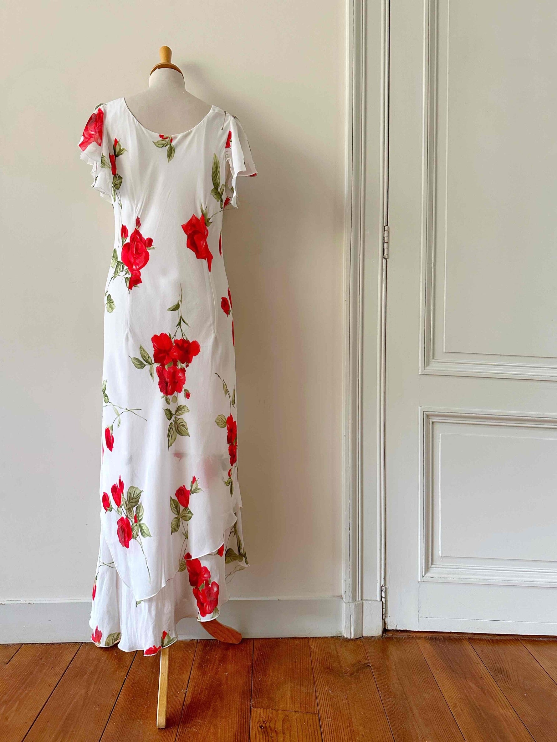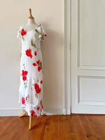 Prix unitaire parRobe longue à fleurs, en voile viscose blanc imprimée roses rouges et vertes, encolure V, manches papillons volantées, bas asymétrique et forme en biais, fabriquée en Espagne, s’adapte aux tailles 36 et 38, portée ici sur un mannequin T36, aisselles 44 cm.