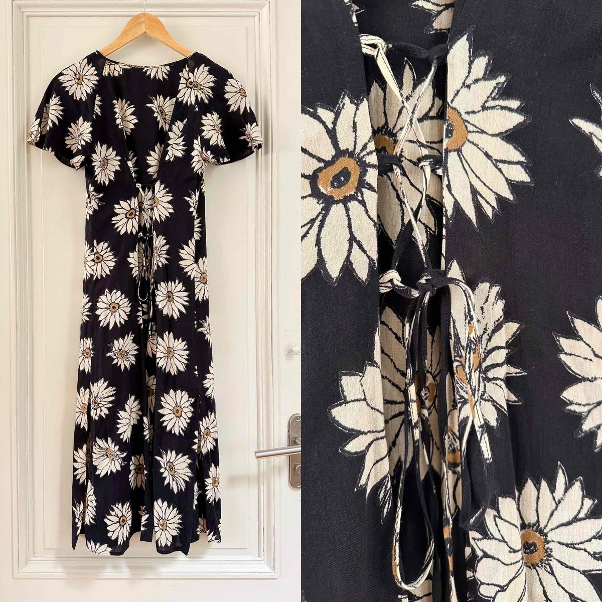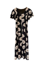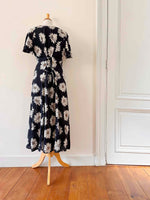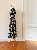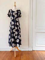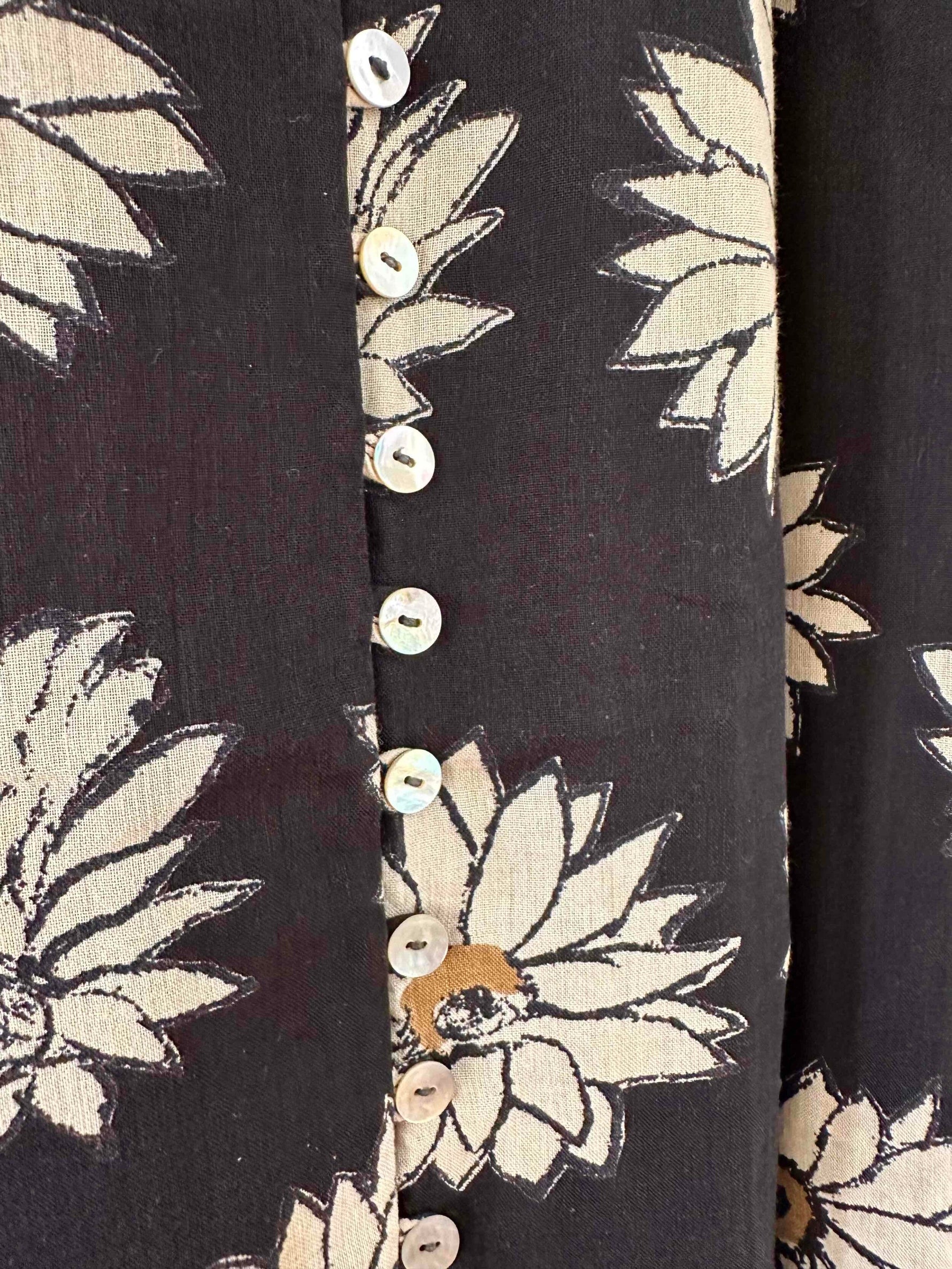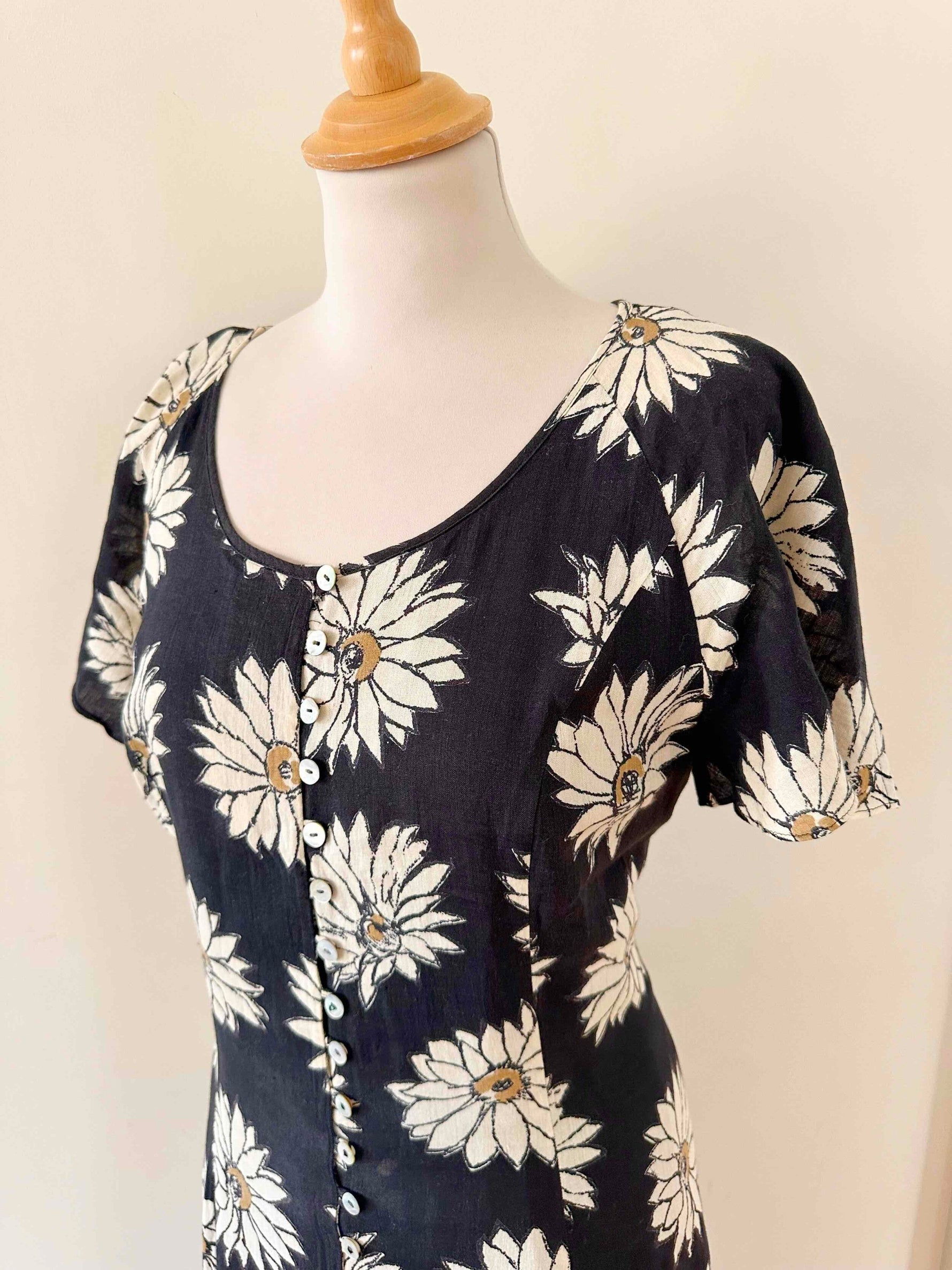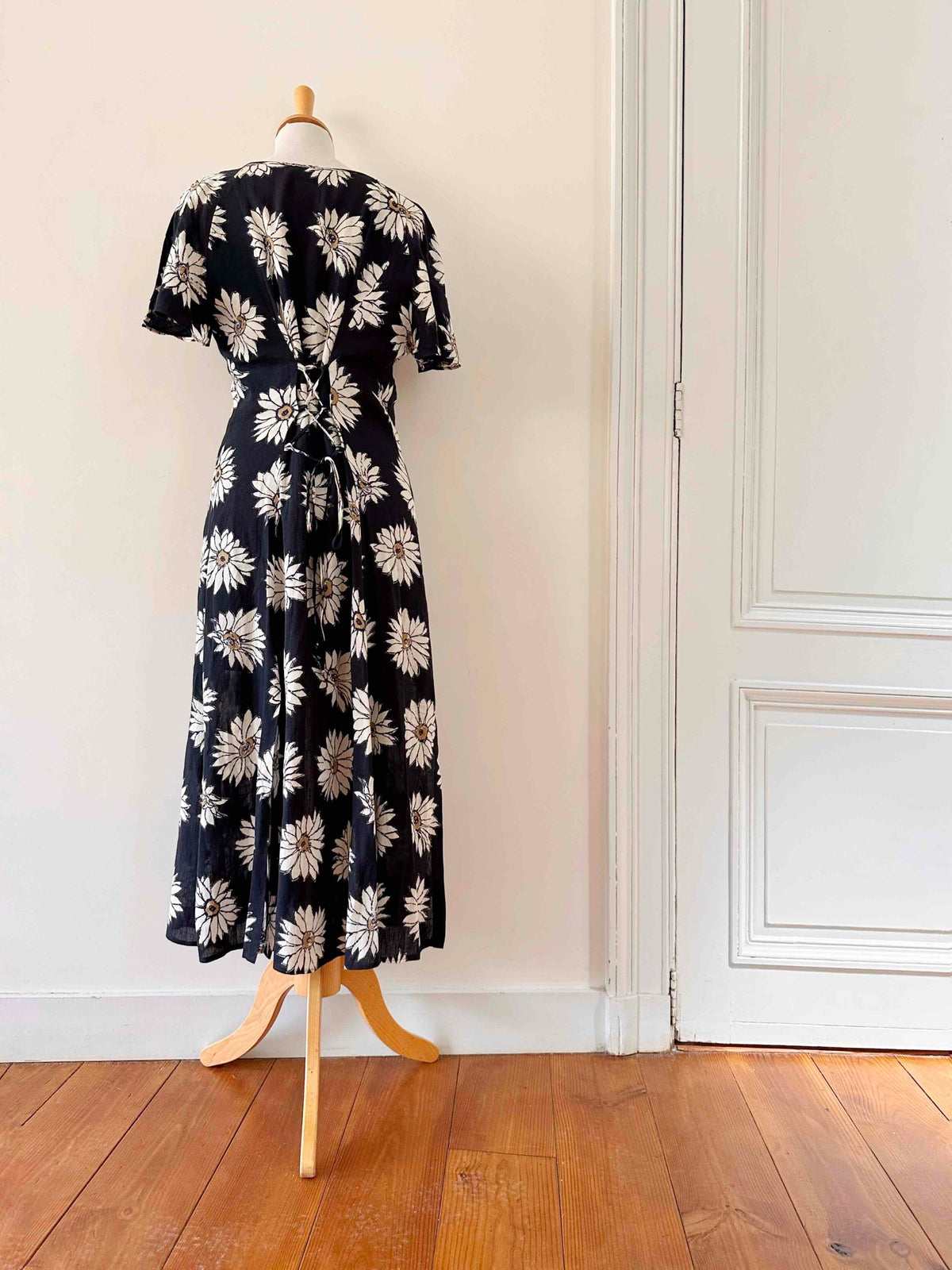 Prix unitaire parRobe fleurie en coton lin, gaze de coton et lin noire imprimée marguerites blanches et ocres, boutons nacres, taille dos à lacets, manches papillons, taille 36, portée ici sur un mannequin T36, aisselles 44 cm.