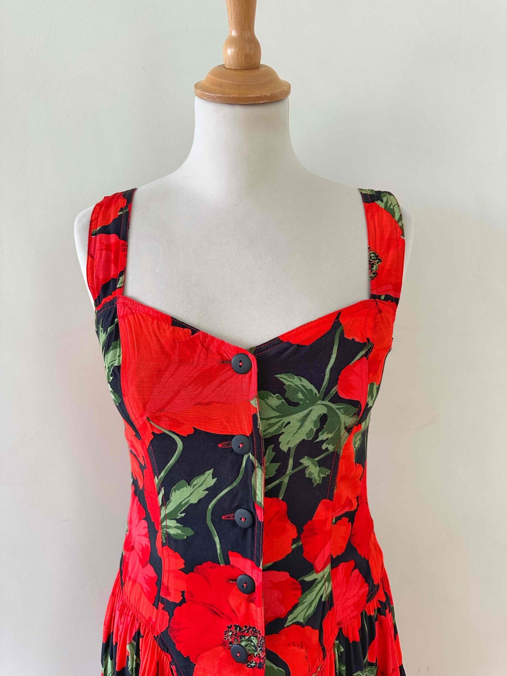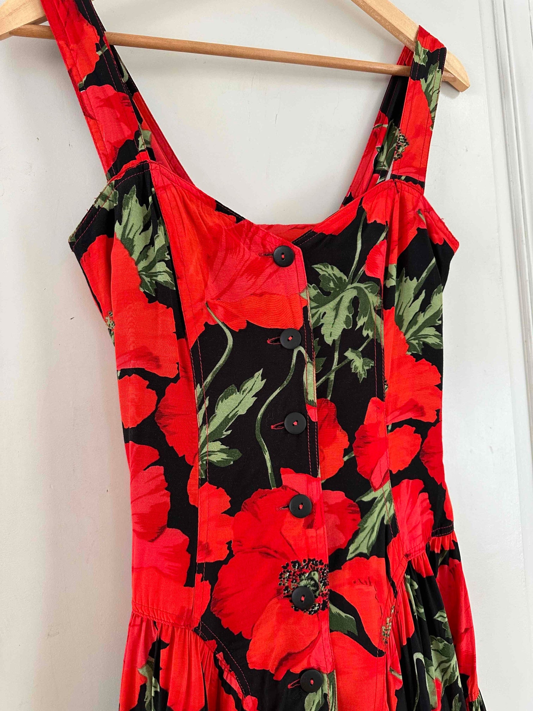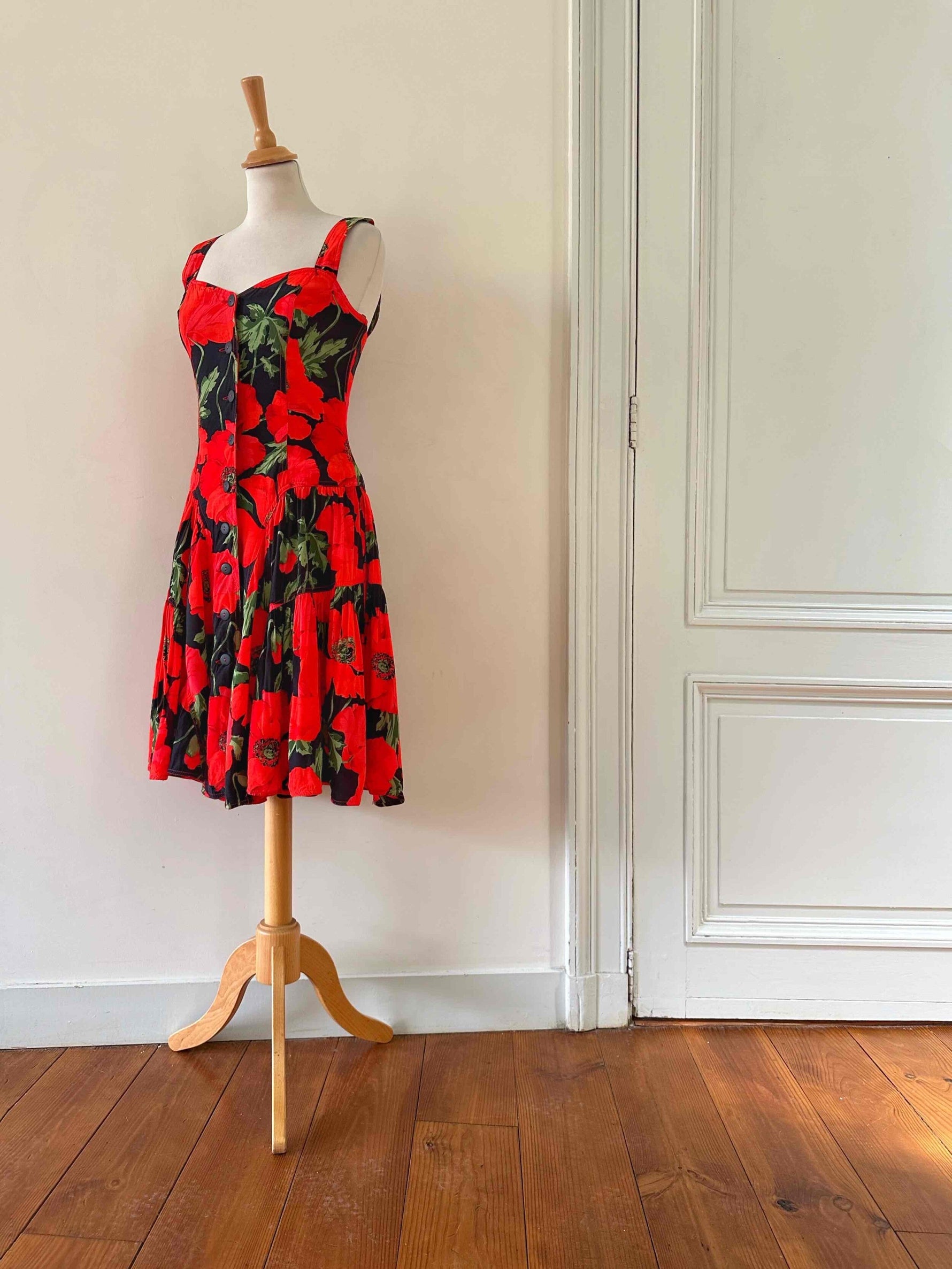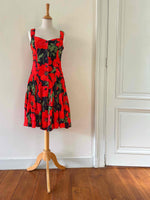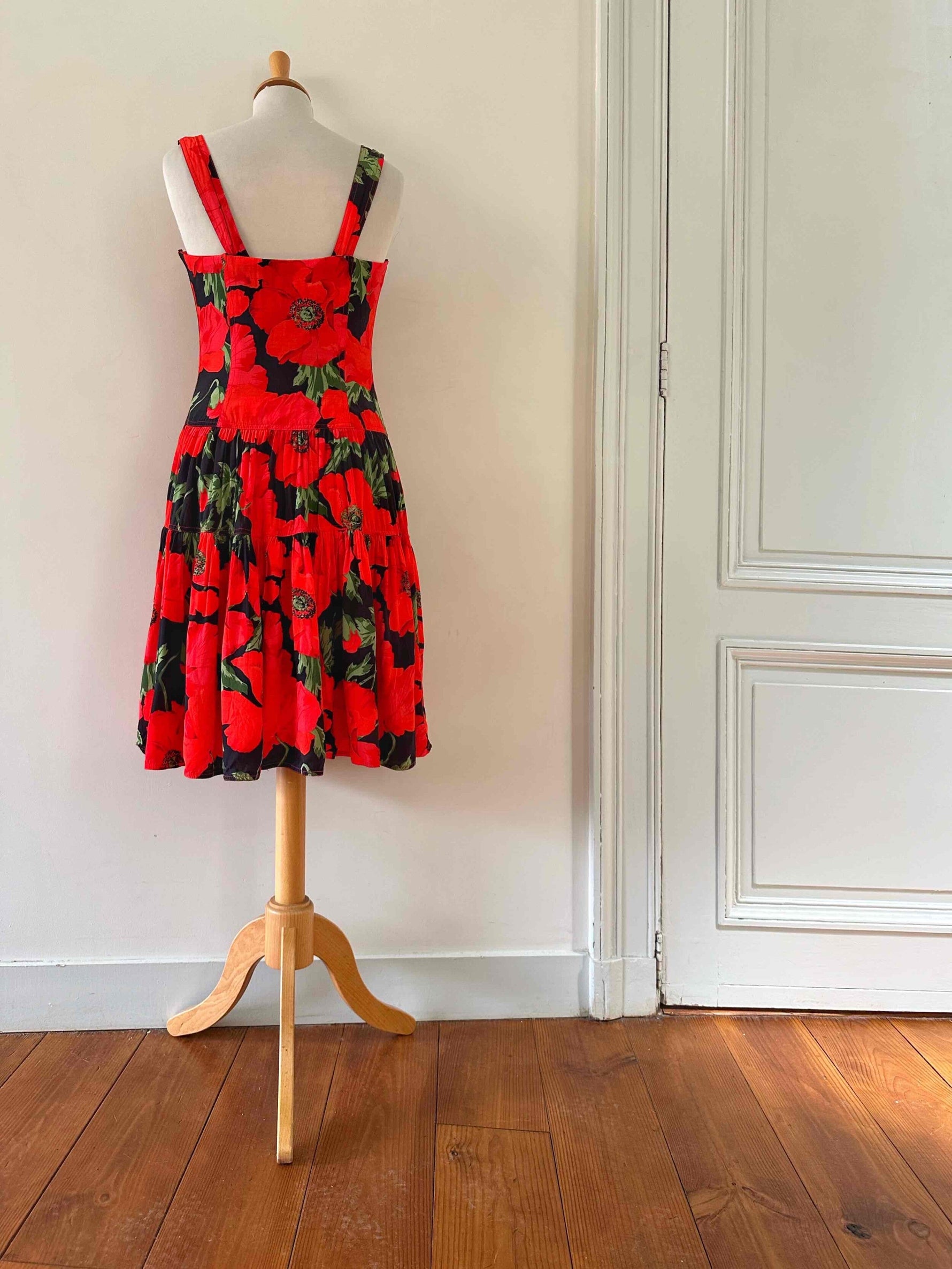 Prix unitaire parMini robe à fleurs, en viscose noire imprimée grands coquelicots rouge vif et vert, boutonnée, bas froncé et volanté, haut esprit bustier avec baleine souple, bretelles réglables à boutonner et pouvant se croiser dos nu, fabriquée en France, taille 36 portée ici sur un mannequin T36, aisselles 43 cm.