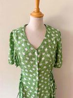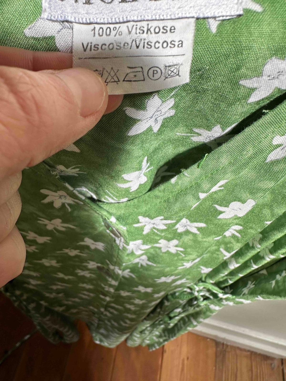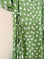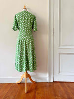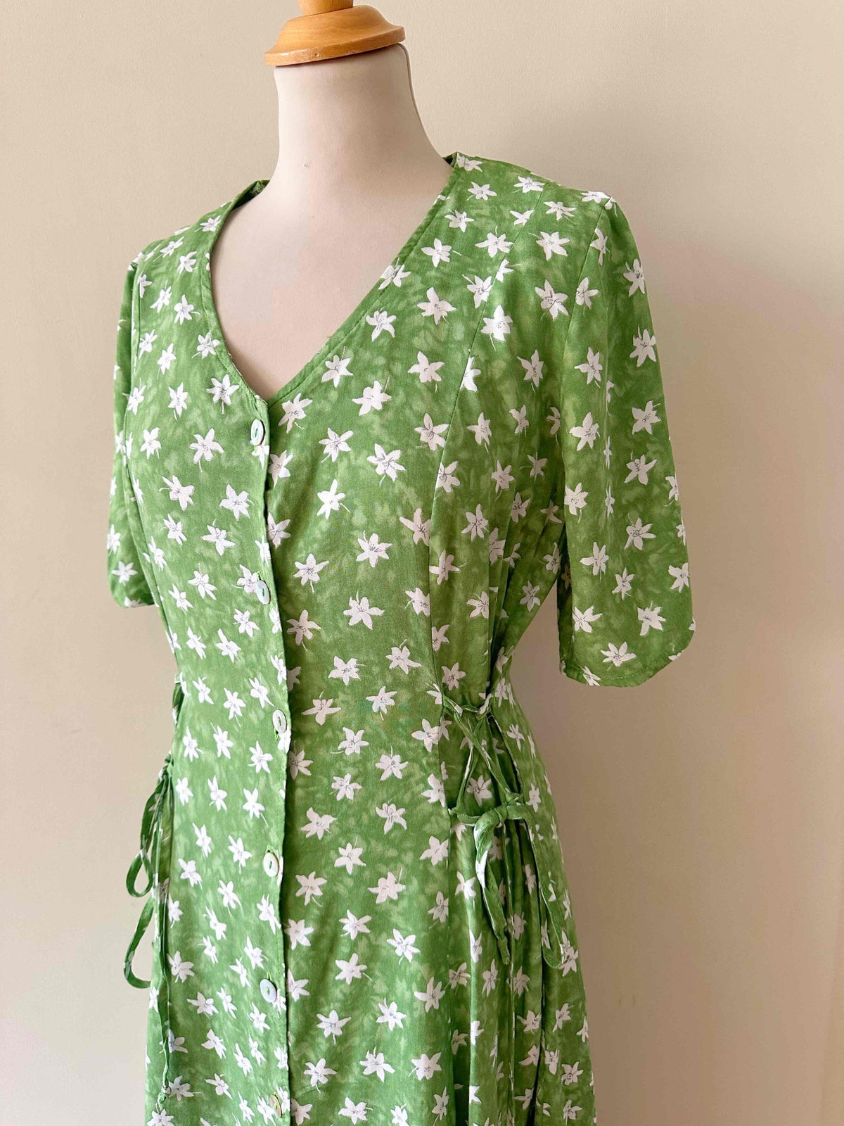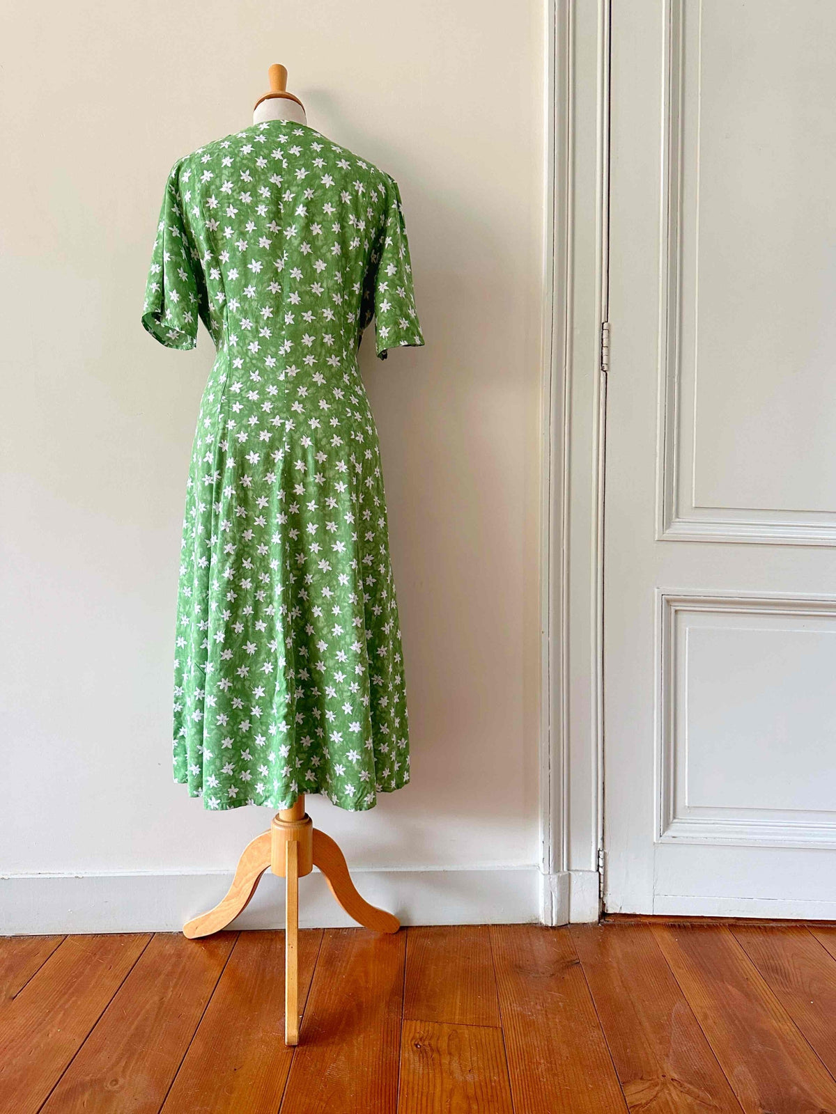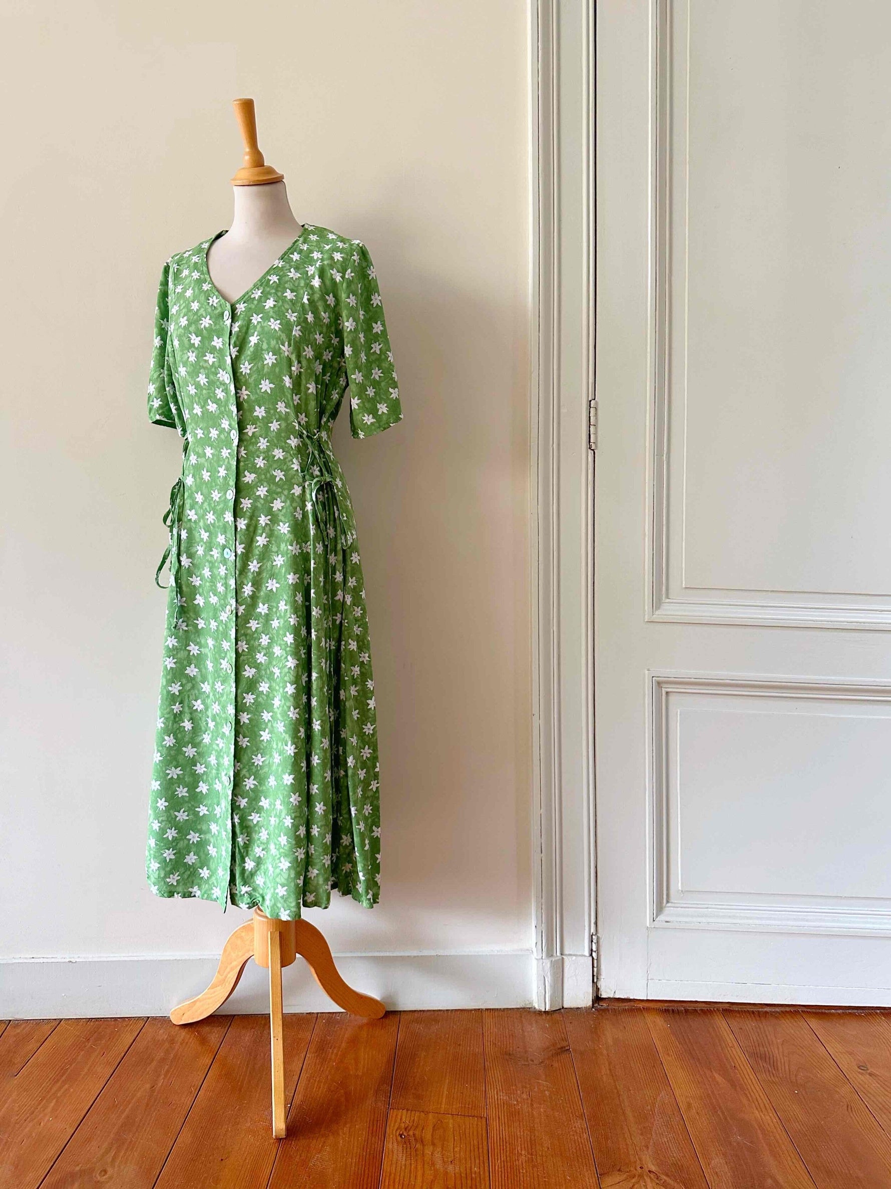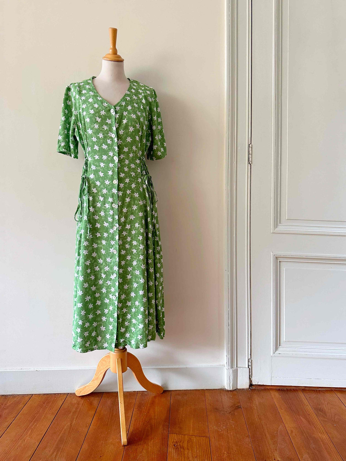 Prix unitaire parRobe longue à fleurs, en viscose vert gazon imprimée petites fleurs blanches, boutonnée en nacre, côté taille à lacets et nouer, années 90s, taille 36 et 38, portée ici sur un mannequin T36, aisselles 45 cm.