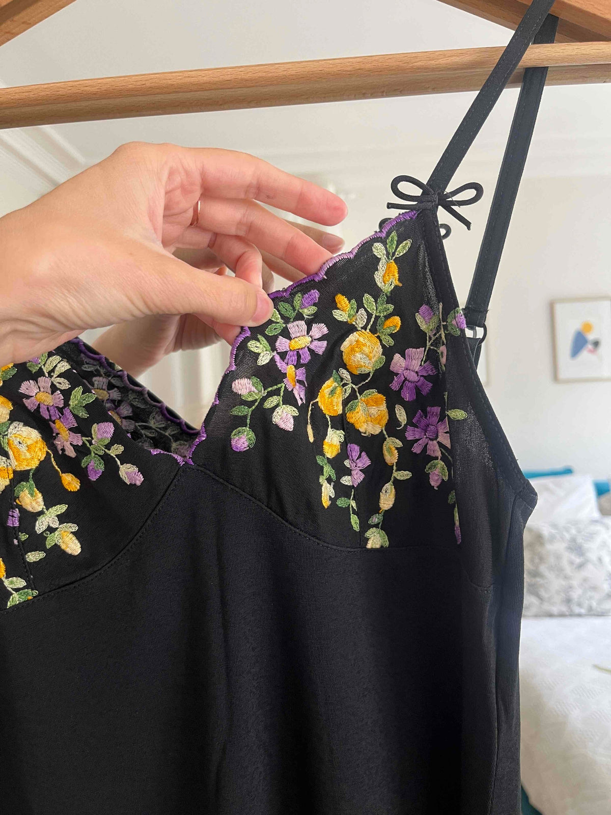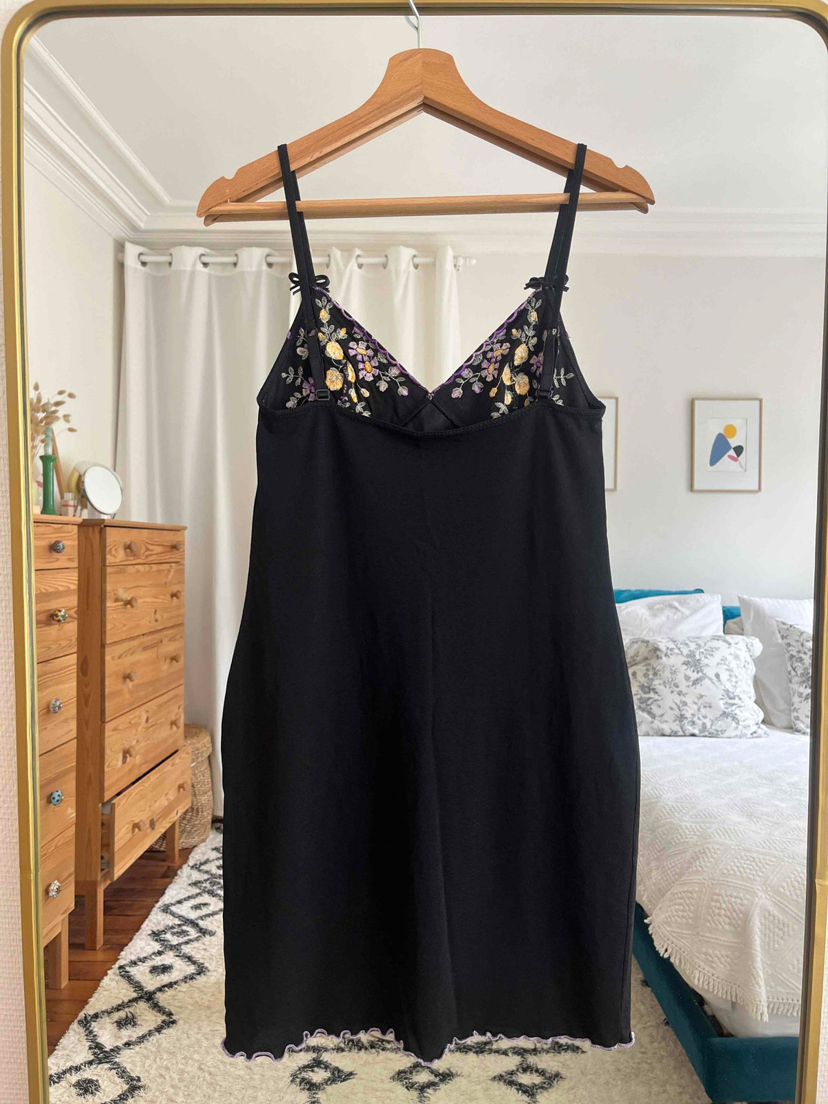 Prix unitaire parRobe noire, décolleté en V brodé de fleurs, tissu stretch, bretelles ornées de petits nœuds, ajustables. Fabriquée en France. Portée ici sur une T36 pour 1,64 m.