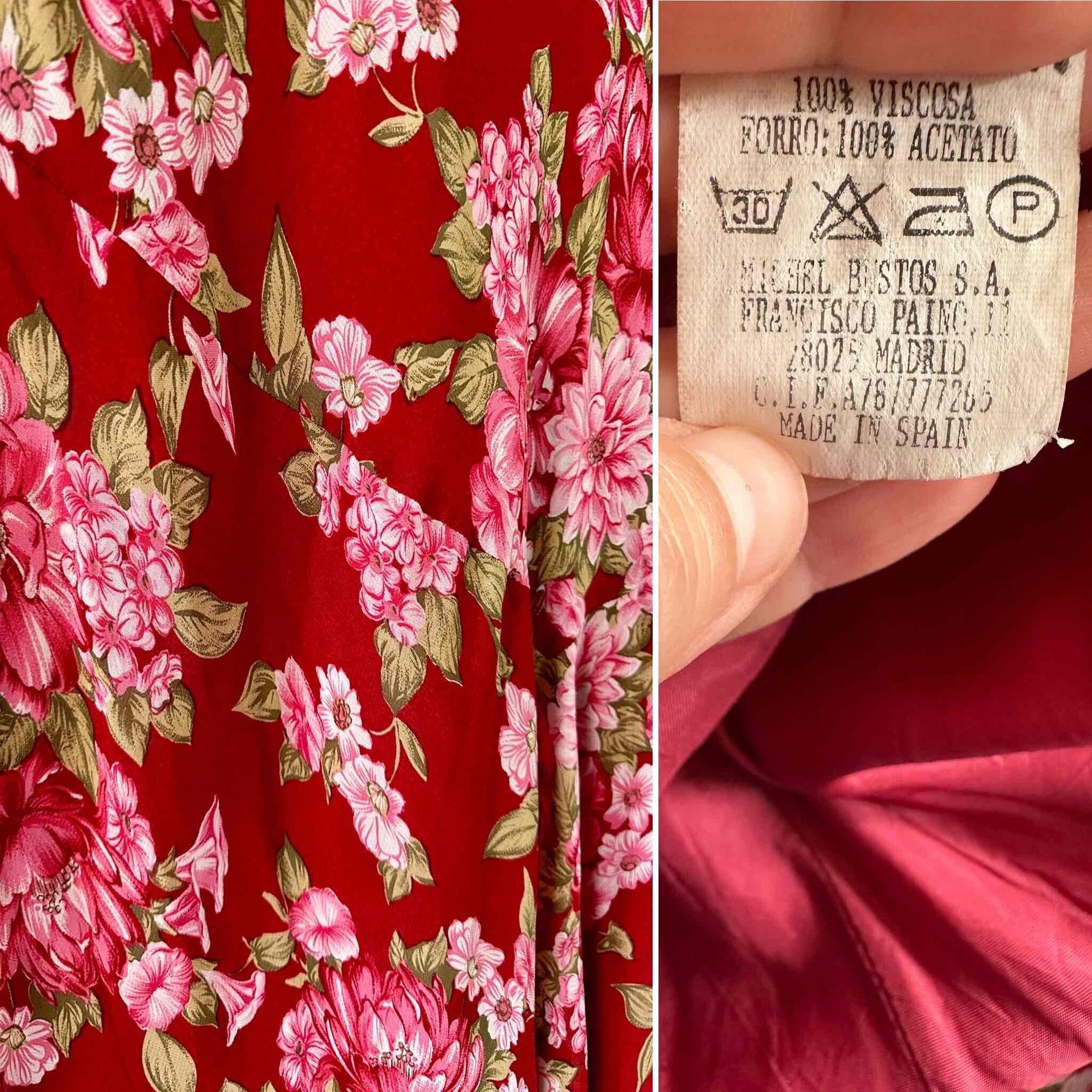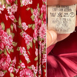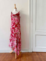 Prix unitaire parRobe nuisette à fleurs, en voile viscose rouge imprimée fleurs rose fuchsia et vertes, encolure drapée, bénitier, bretelles spaghettis élastiques réglables, fabriquée en Espagne, taille 38, portée ici sur un mannequin T36, aisselles 47 cm.