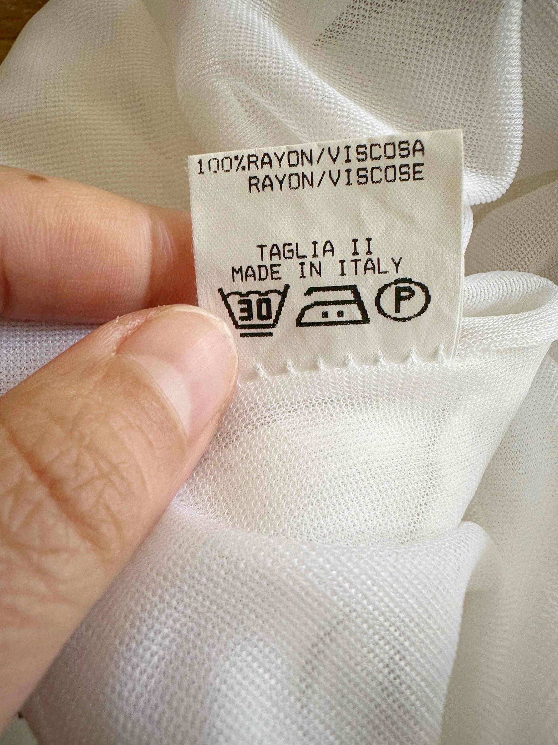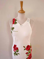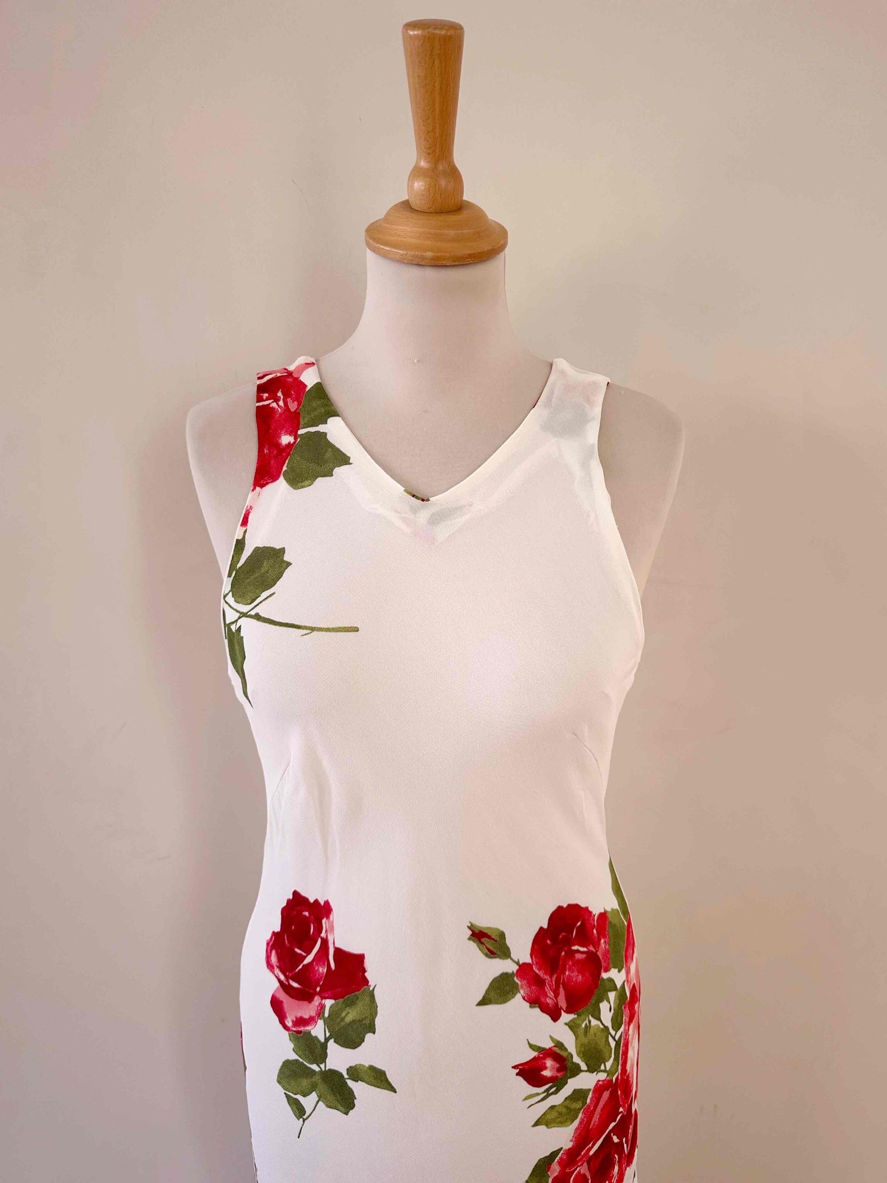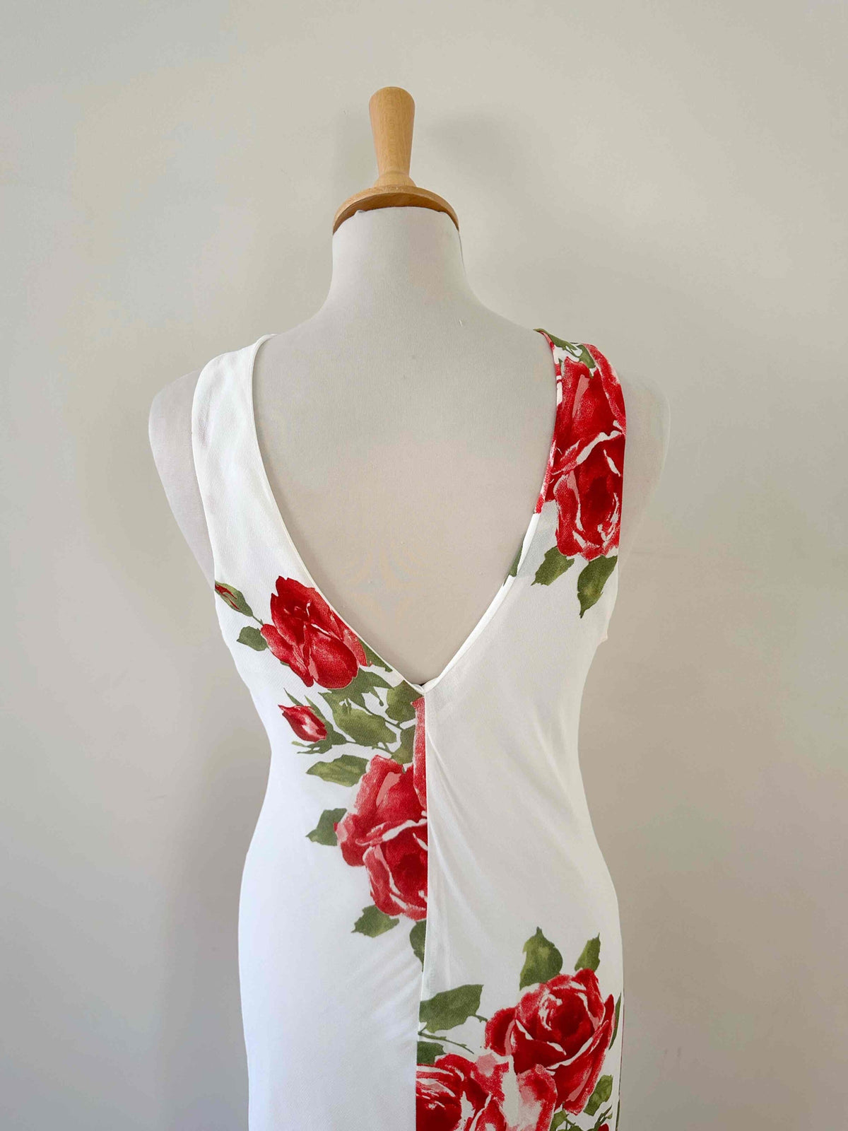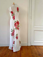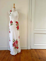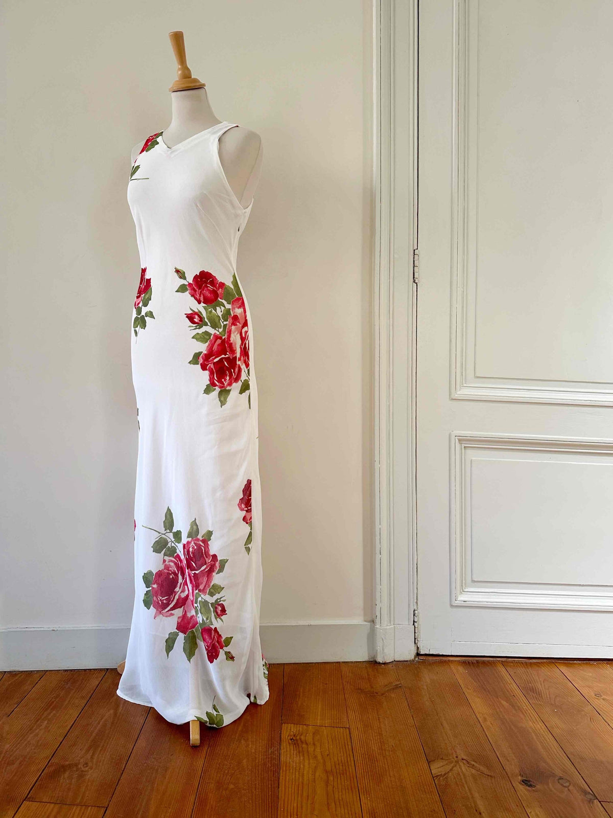 Prix unitaire parRobe longue à fleurs, en voile viscose doublée blanche imprimée roses rouges et vertes, taillée en biais, longueur maxi, dos V échancré, fabriquée en Italie, taille 36, portée ici sur un mannequin T36, aisselles 43 cm.