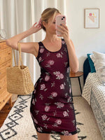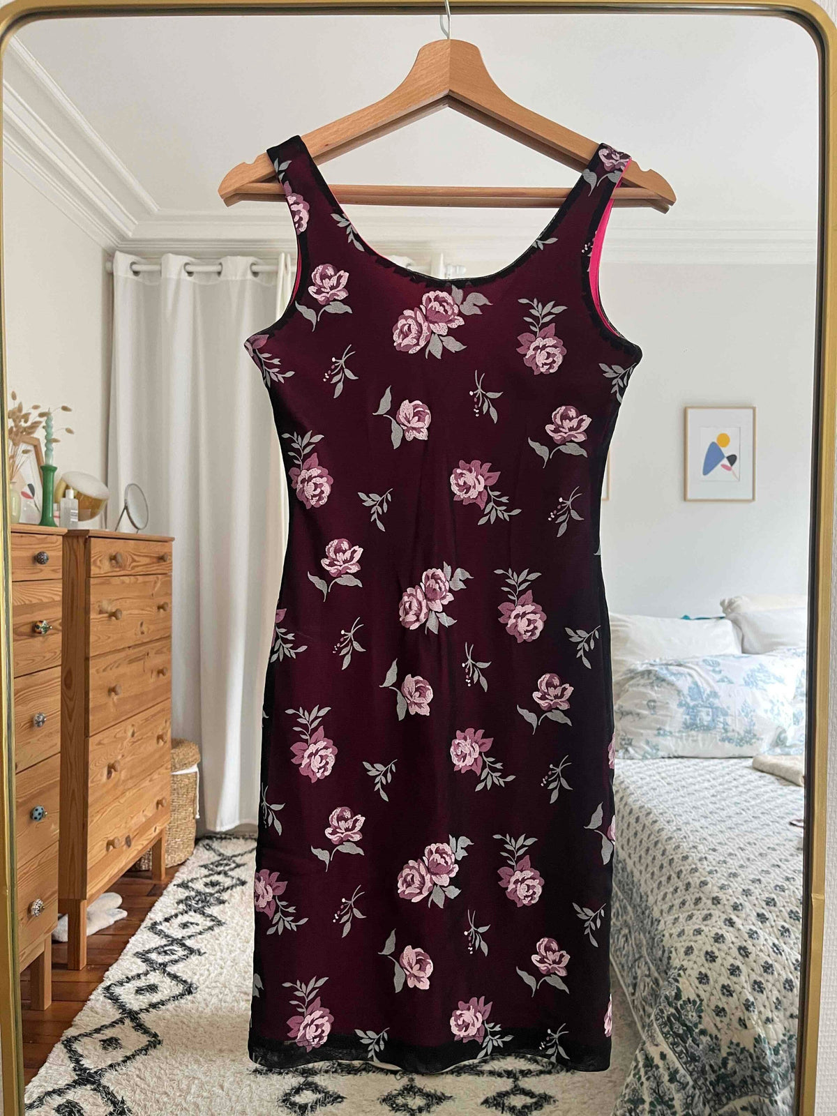 Prix unitaire parRobe à fleurs, tissu transparent imprimé de roses, doublé d’un tissu rose non transparent, stretch. Portée ici sur une T36 pour 1,64 m