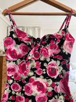 Prix unitaire parRobe à fleurs en coton, nœud papillon au niveau du décolleté, bretelles non ajustables, cintrée à la taille. Fabriquée en France. Portée ici sur une T36 pour 1,64 m