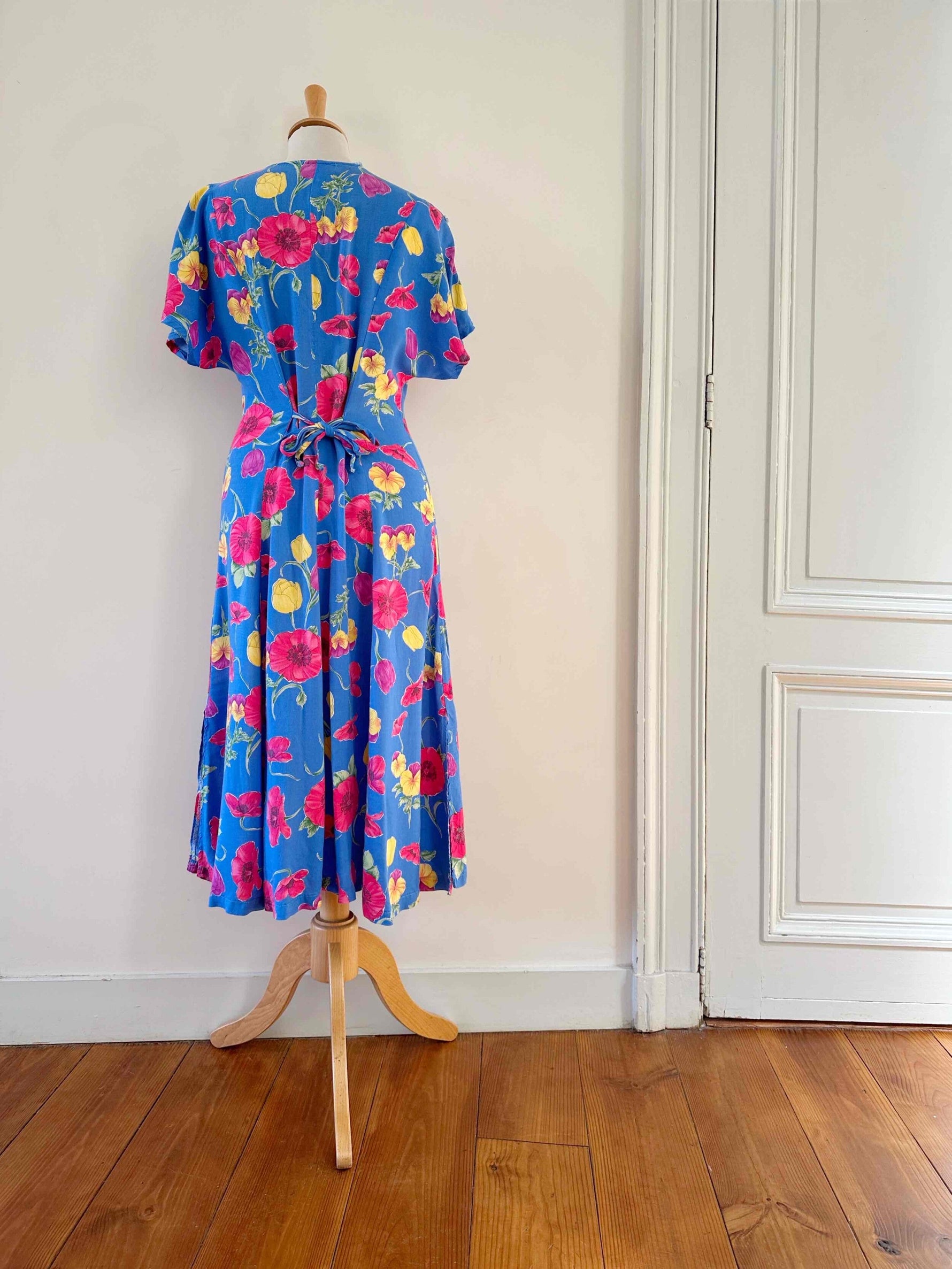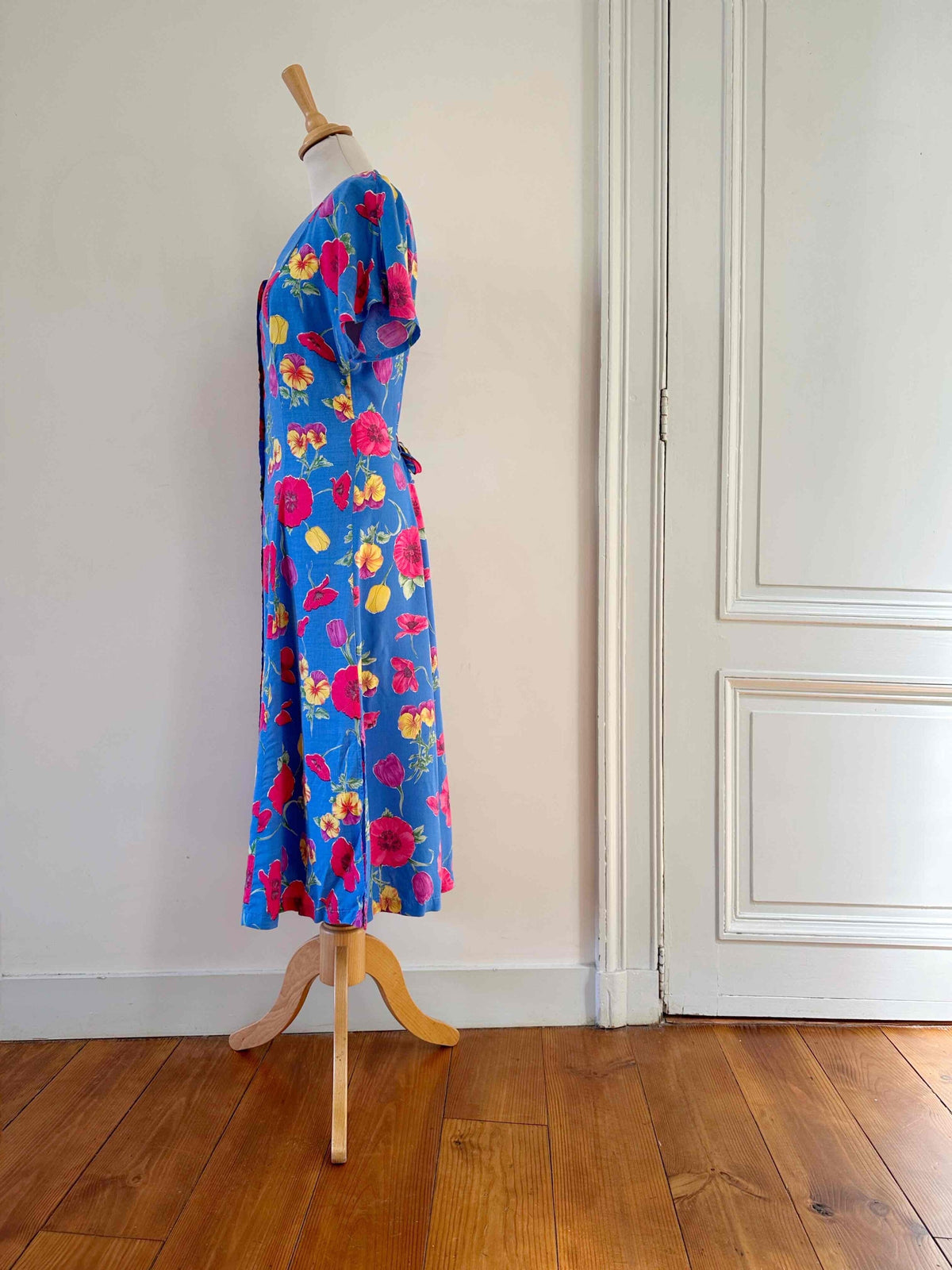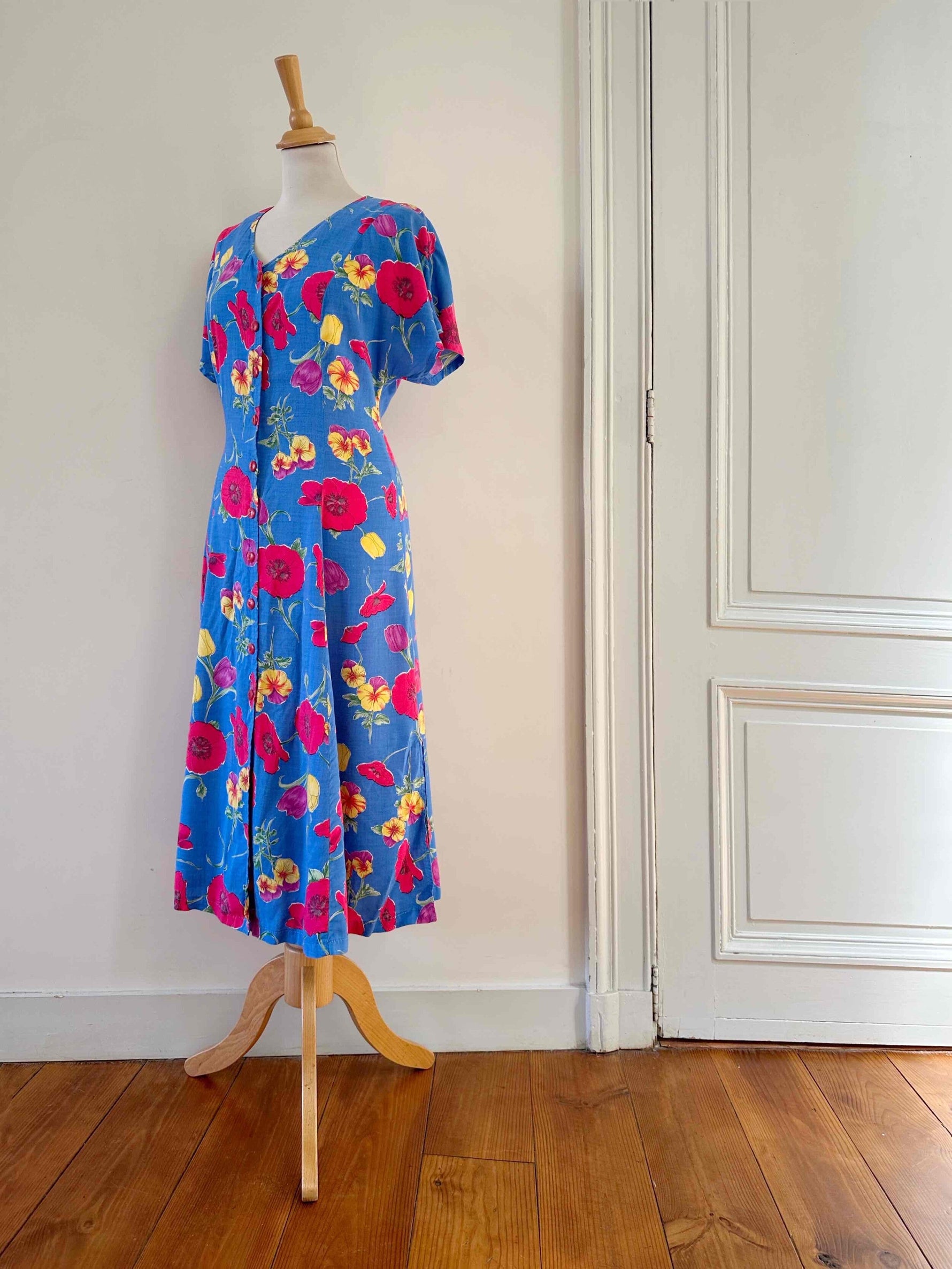 Prix unitaire parRobe longue à fleurs, en viscose bleu roi moyen imprimée fleurs de tulipes, coquelicots et pensées dans les couleur roses fuchsias, rouge, jaunes et violettes, boutonnée tout le long, taille dos à nouer par deux doubles liens, taille 36 et 38, portée ici sur un mannequin T36. Aisselles 44 cm.