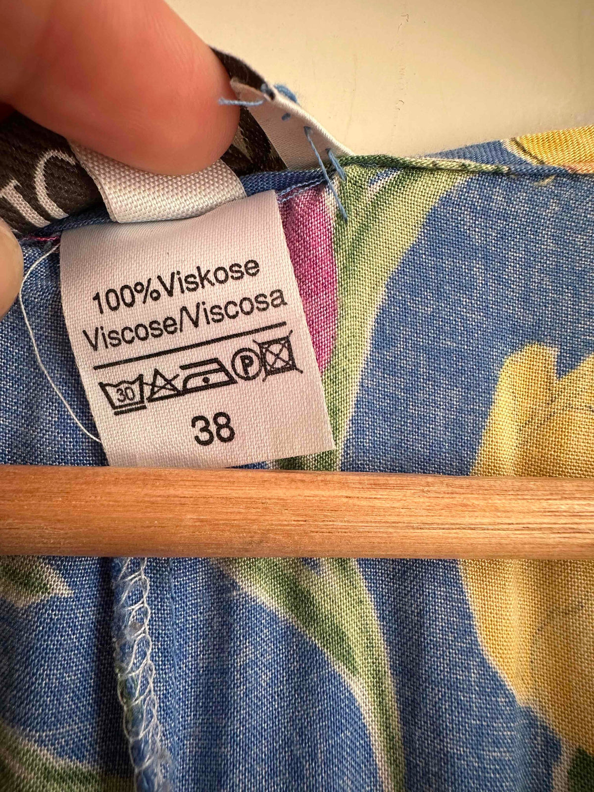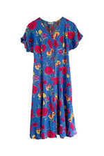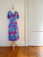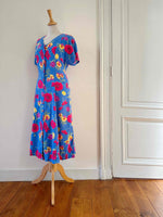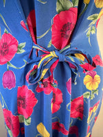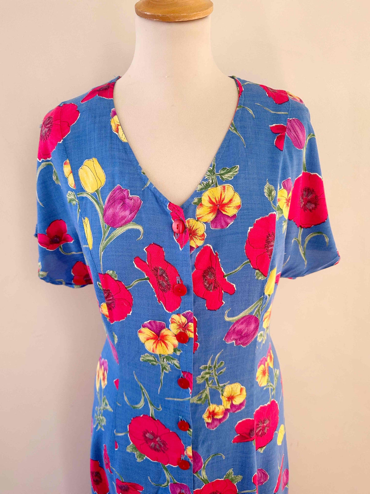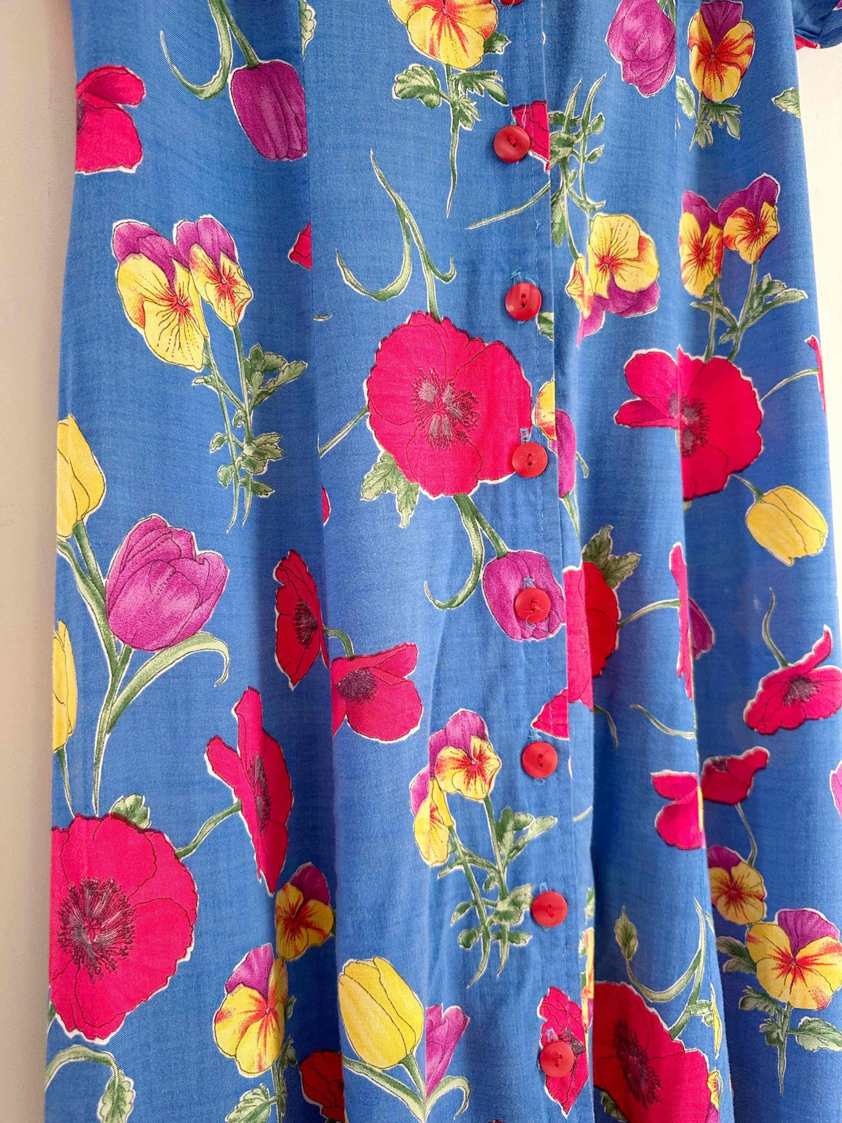 Prix unitaire parRobe longue à fleurs, en viscose bleu roi moyen imprimée fleurs de tulipes, coquelicots et pensées dans les couleur roses fuchsias, rouge, jaunes et violettes, boutonnée tout le long, taille dos à nouer par deux doubles liens, taille 36 et 38, portée ici sur un mannequin T36. Aisselles 44 cm.