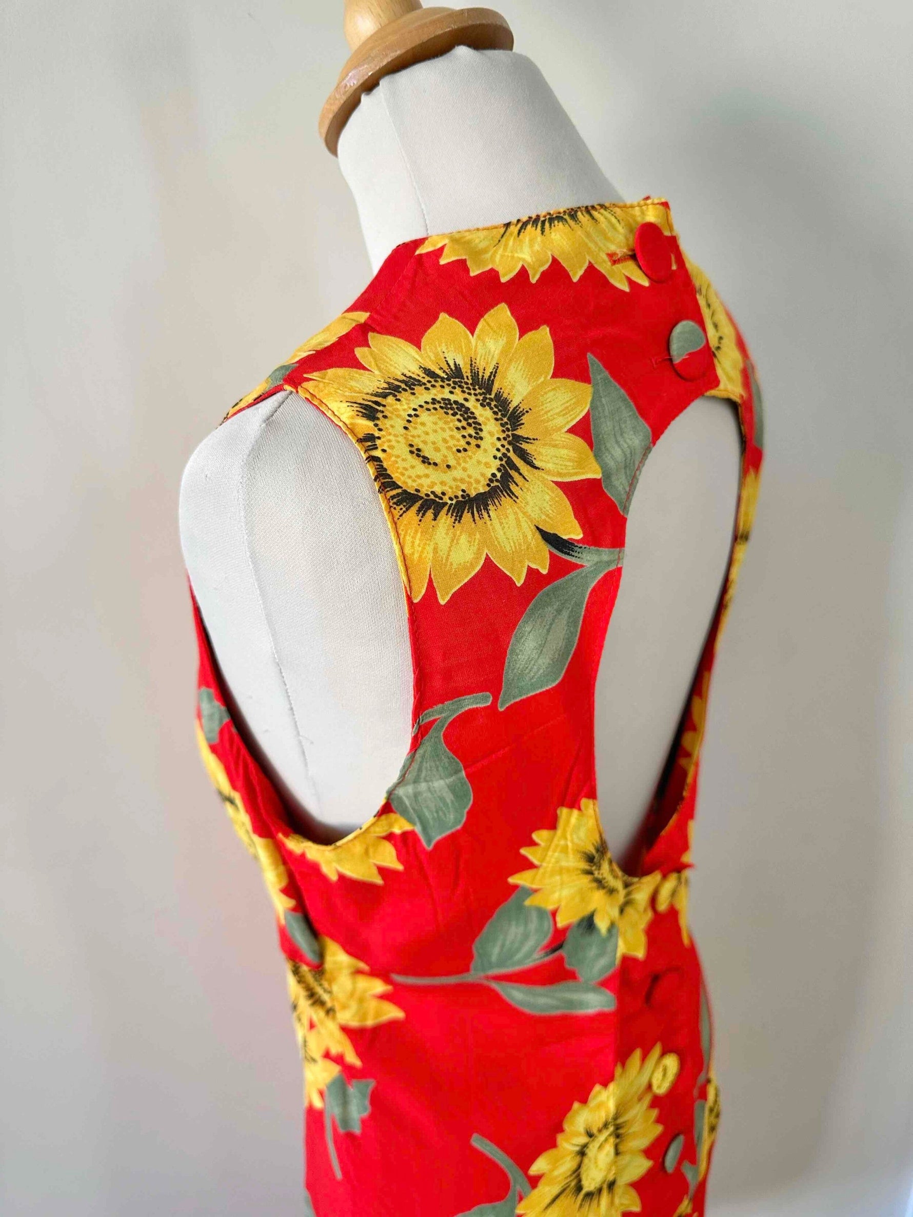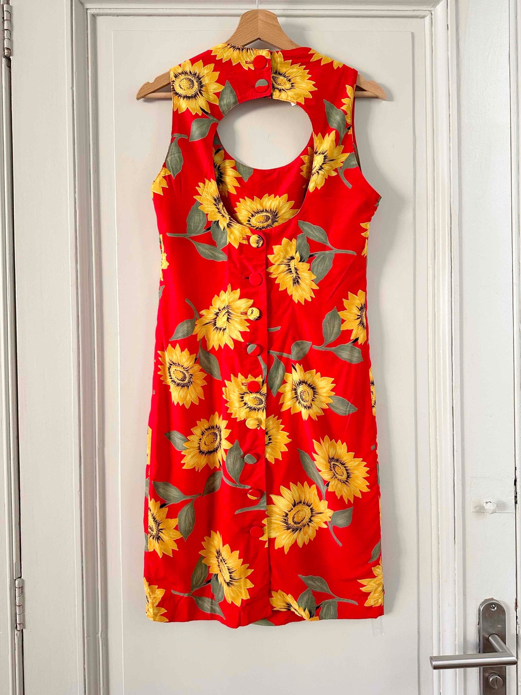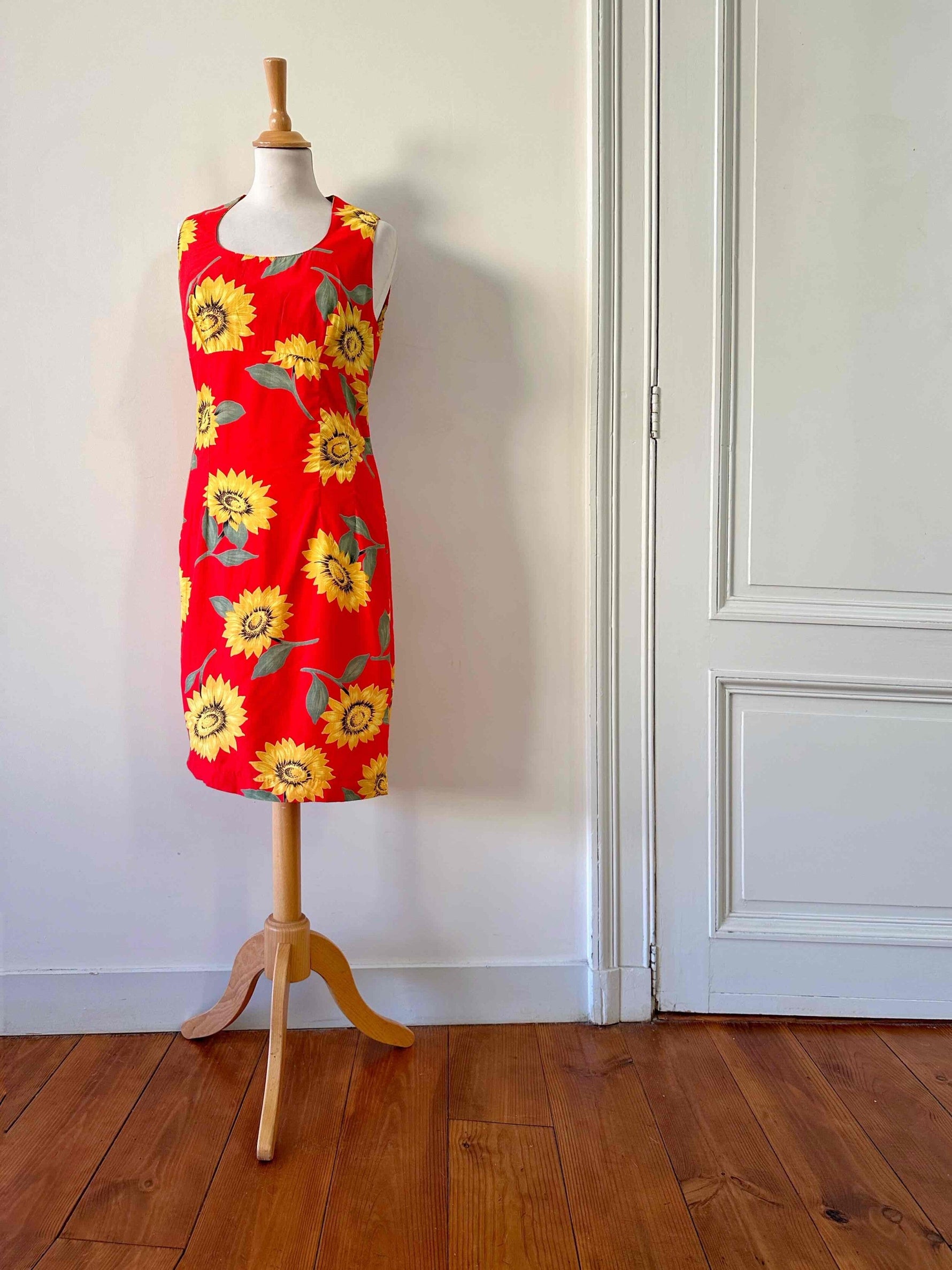 Prix unitaire parRobe dos nu tournesols, en viscose rouge vif imprimée grandes fleurs de tournesols jaunes et vertes, boutonnée au dos, dos nu ajouré, fabriquée en France, deadstock années 80s avec étiquettes d’origine, taille 36, portée ici sur un mannequin T36, aisselles 44 cm.