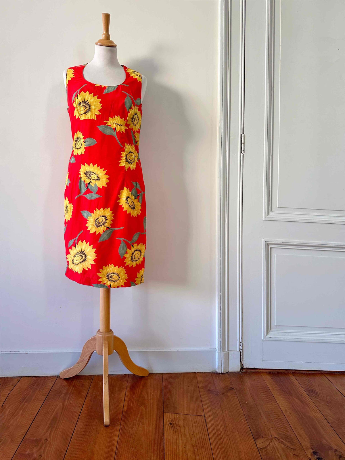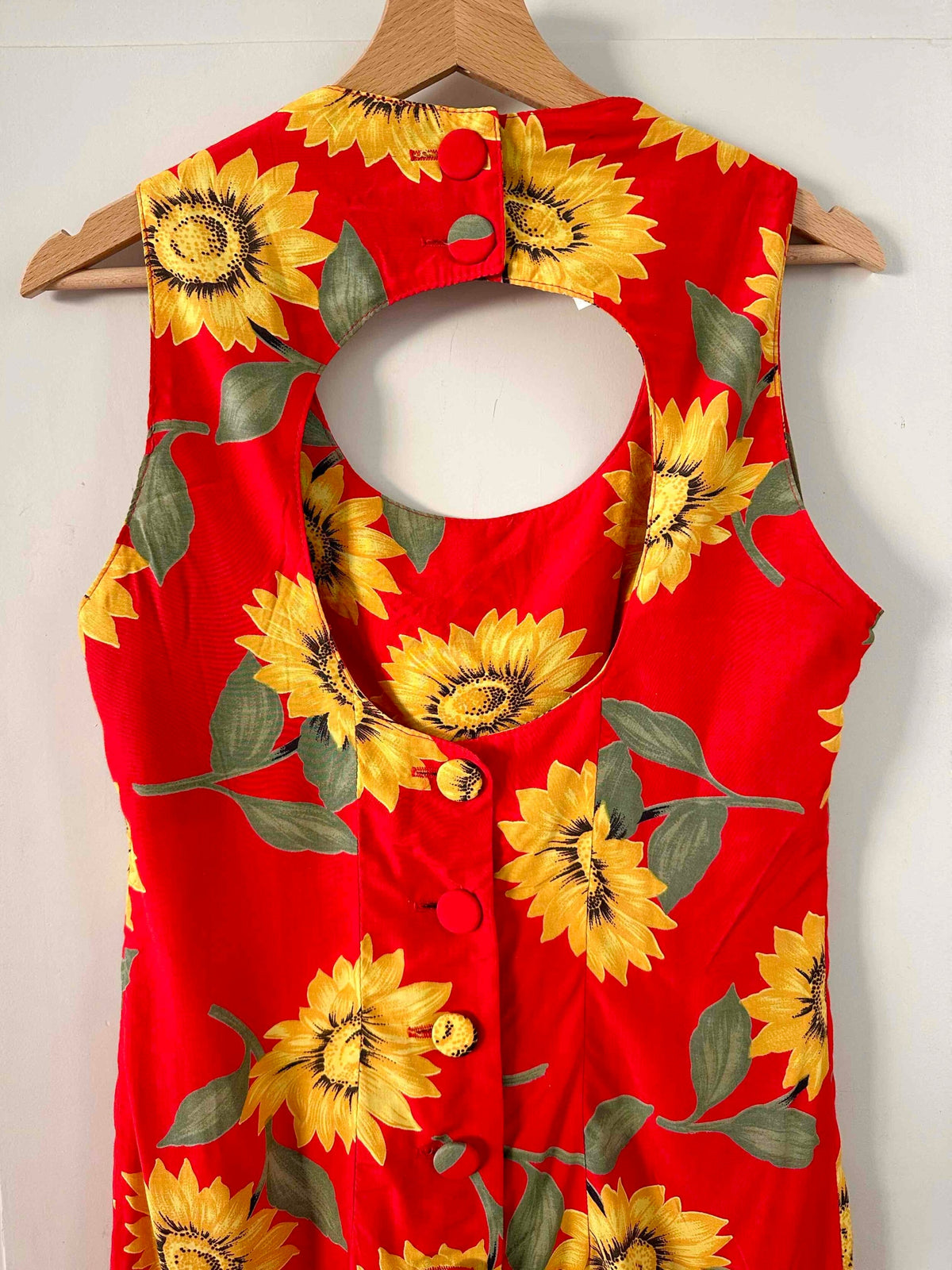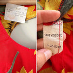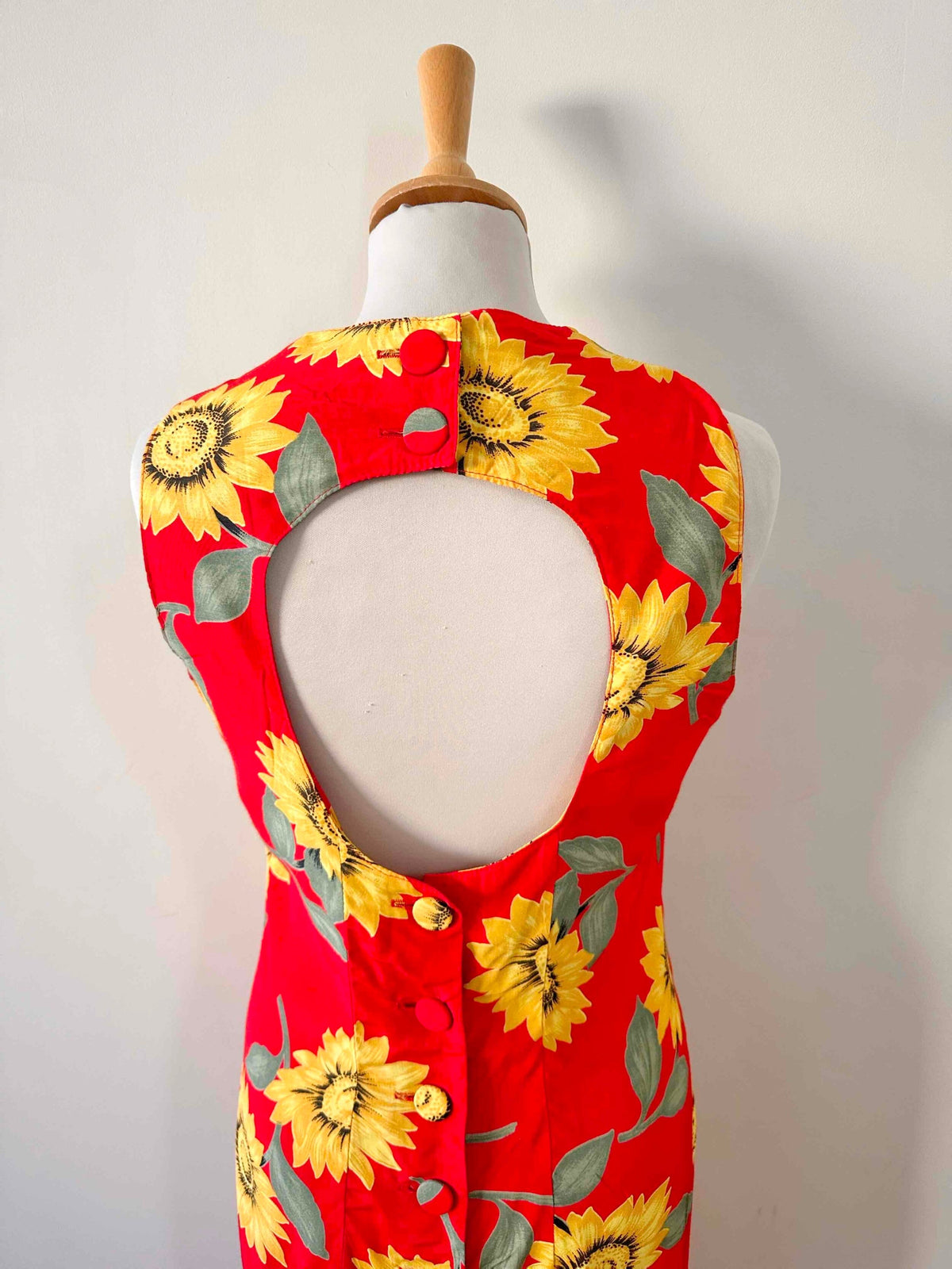 Prix unitaire parRobe dos nu tournesols, en viscose rouge vif imprimée grandes fleurs de tournesols jaunes et vertes, boutonnée au dos, dos nu ajouré, fabriquée en France, deadstock années 80s avec étiquettes d’origine, taille 36, portée ici sur un mannequin T36, aisselles 44 cm.