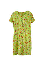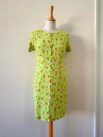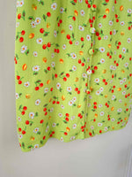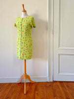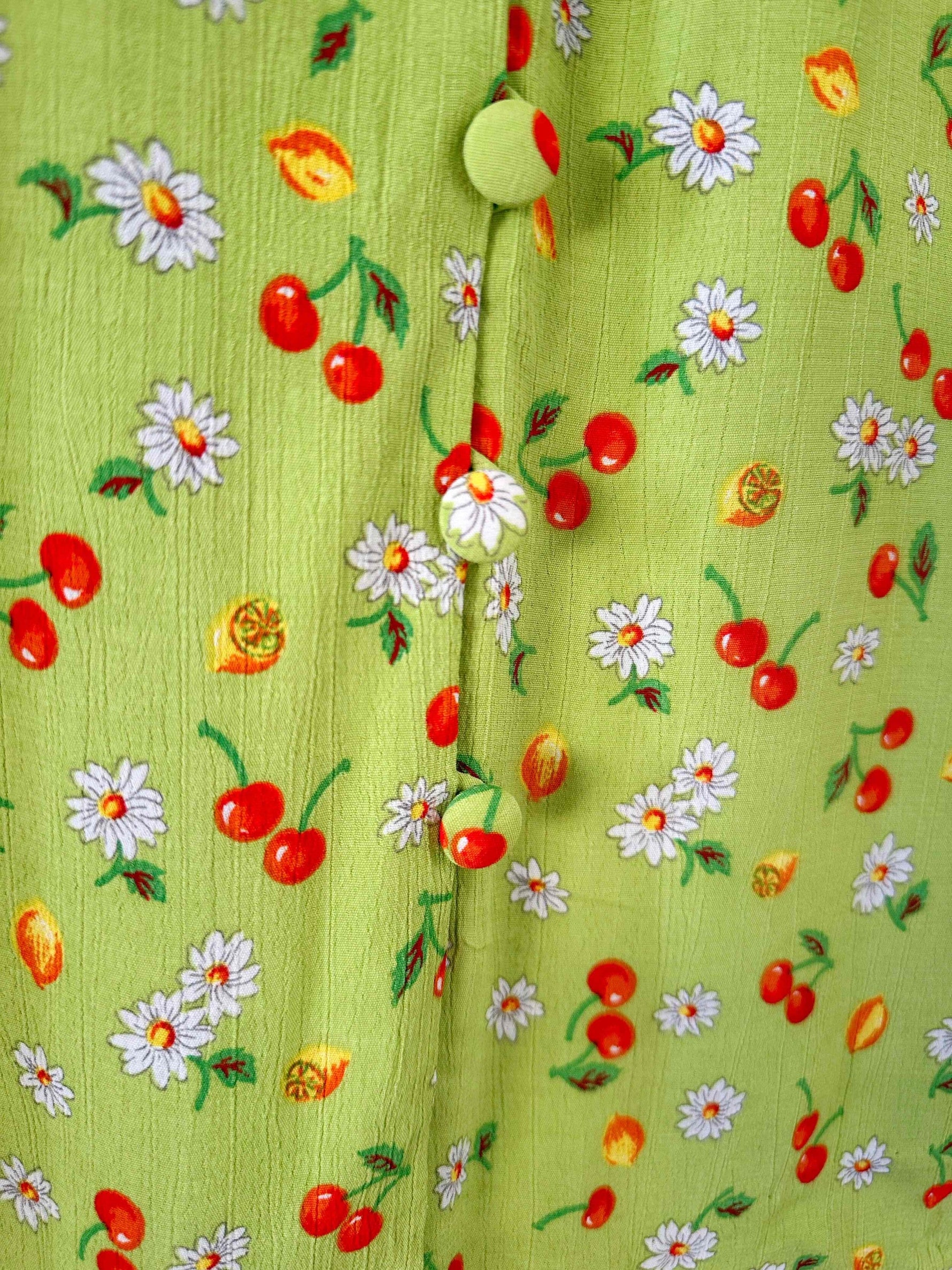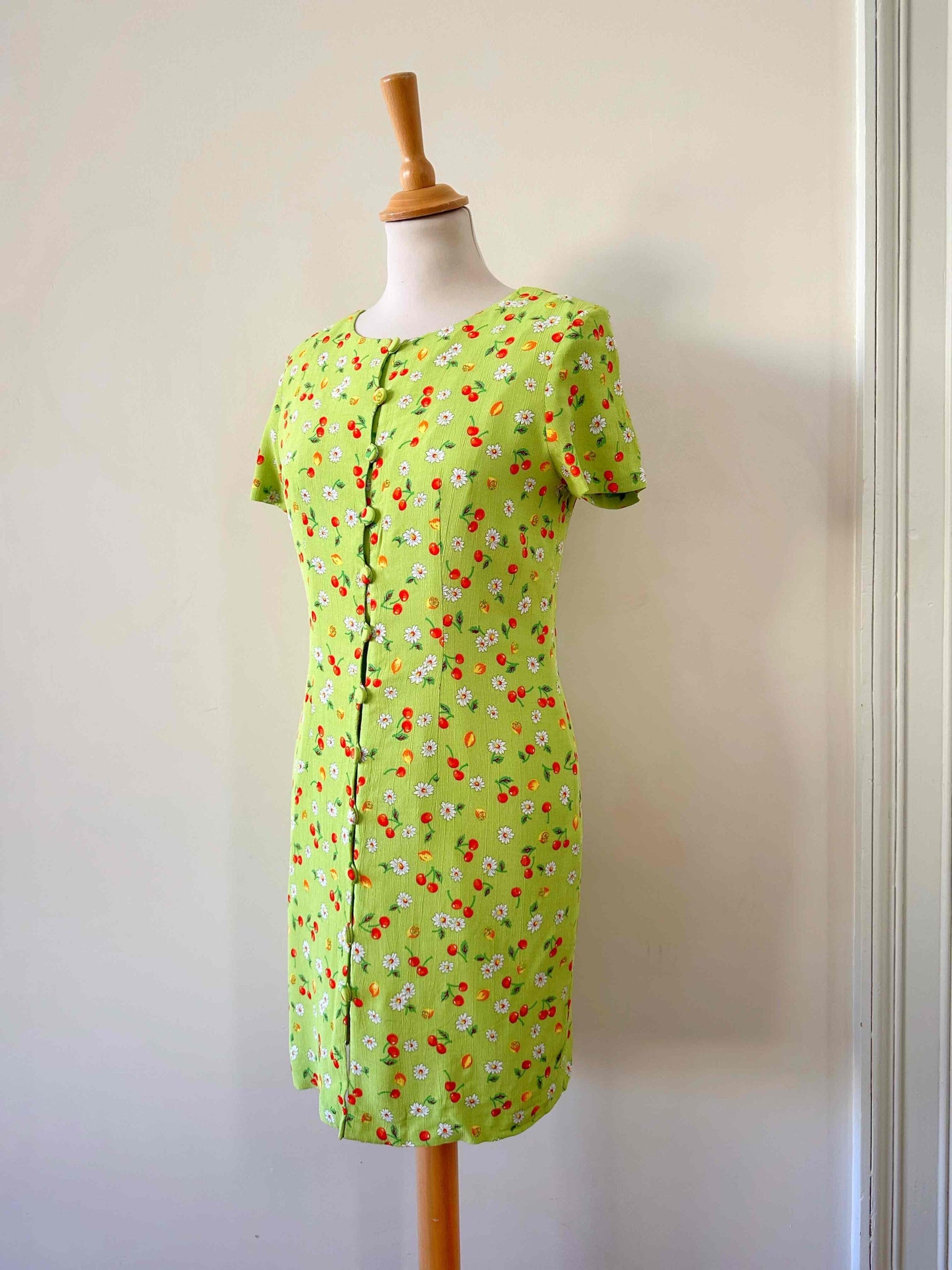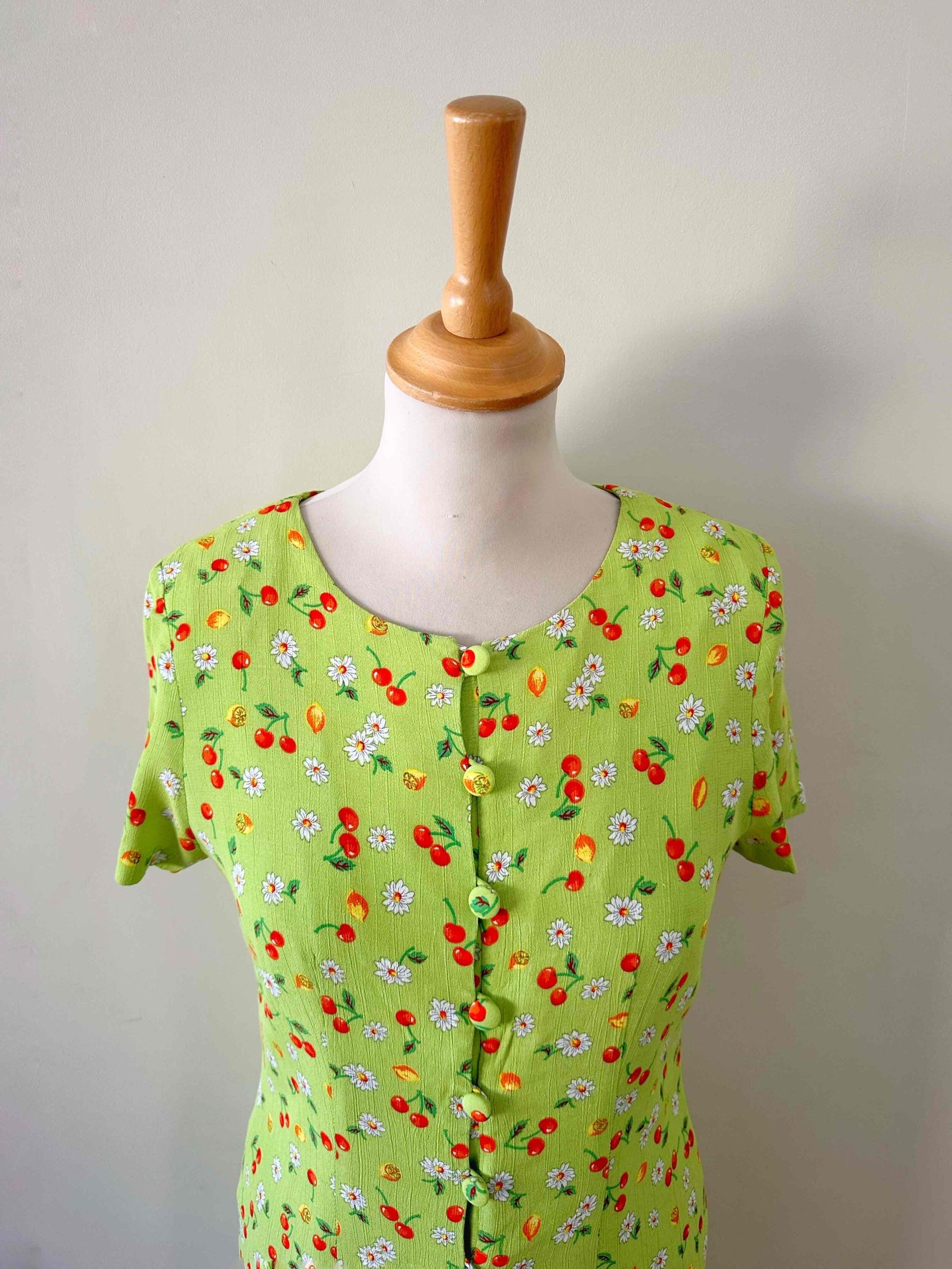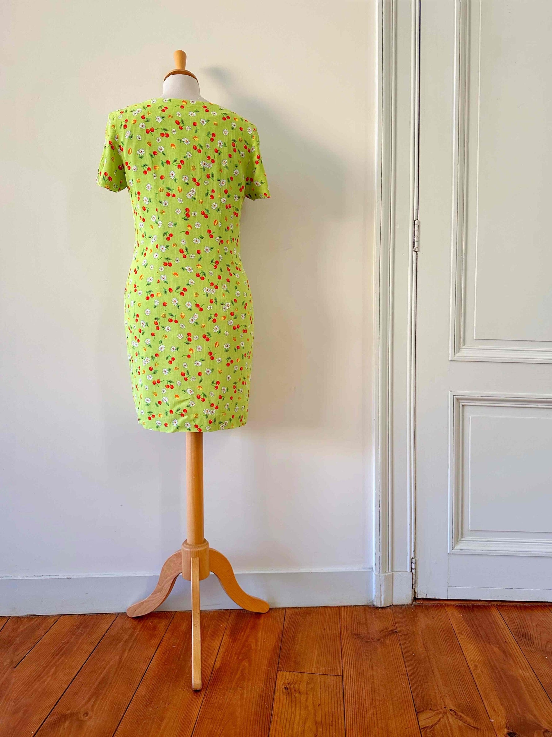 Prix unitaire parMini robe fruits et fleurs, en crepe viscose vert pomme imprimée cerises, citrons et pâquerettes, boutonnée devant par boutons recouverts, manches courtes, années 90s, taille 36 portée ici sur un mannequin T36, aisselles 44 cm.