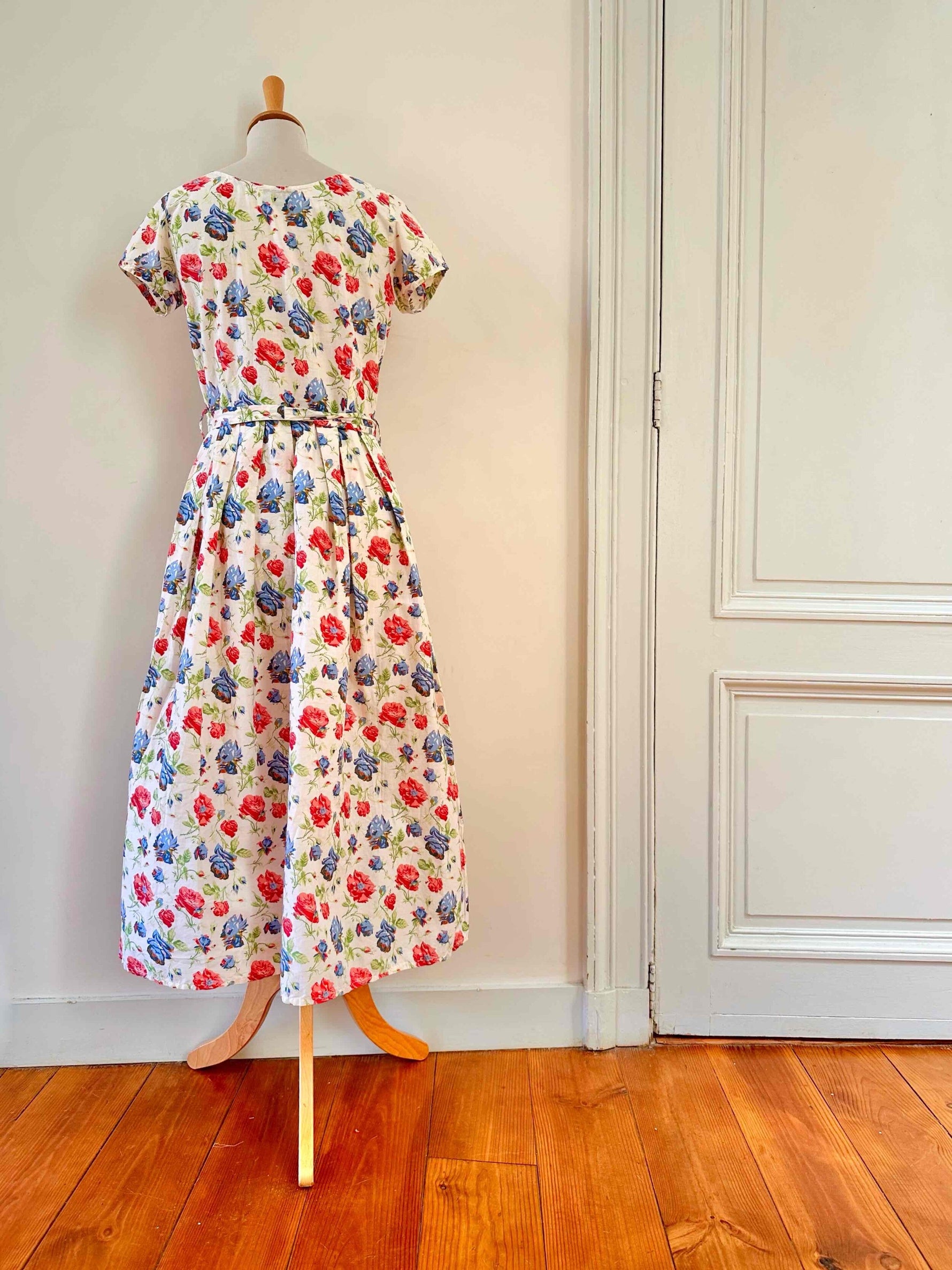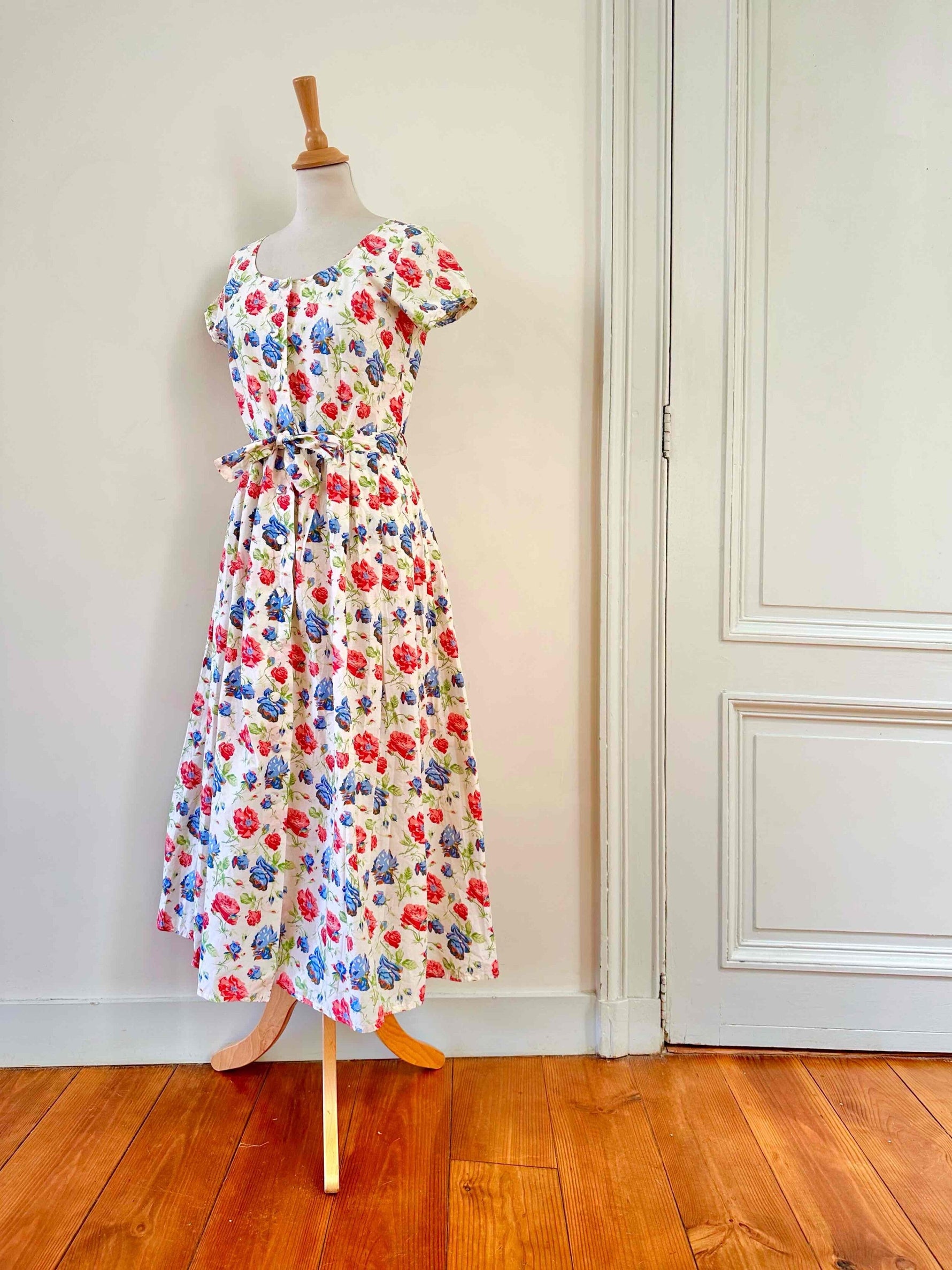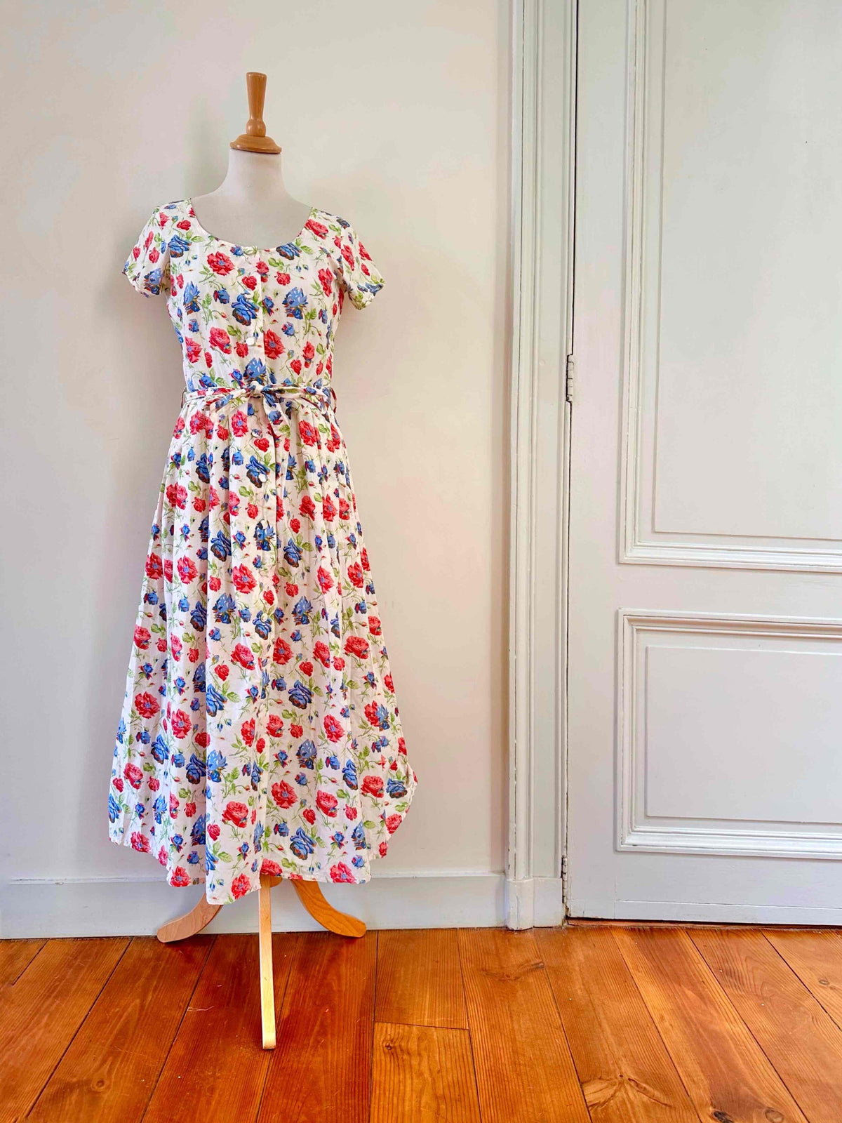 Prix unitaire parRobe longue à fleurs, en 100% coton popeline léger, écrue, imprimé fleurs rouges, bleues et vertes, boutonnée par boutons recouverts, ceinture, taille à nouer, fabriquée en France, taille 34 et 36, portée ici sur un mannequin T36, aisselles 43 cm.