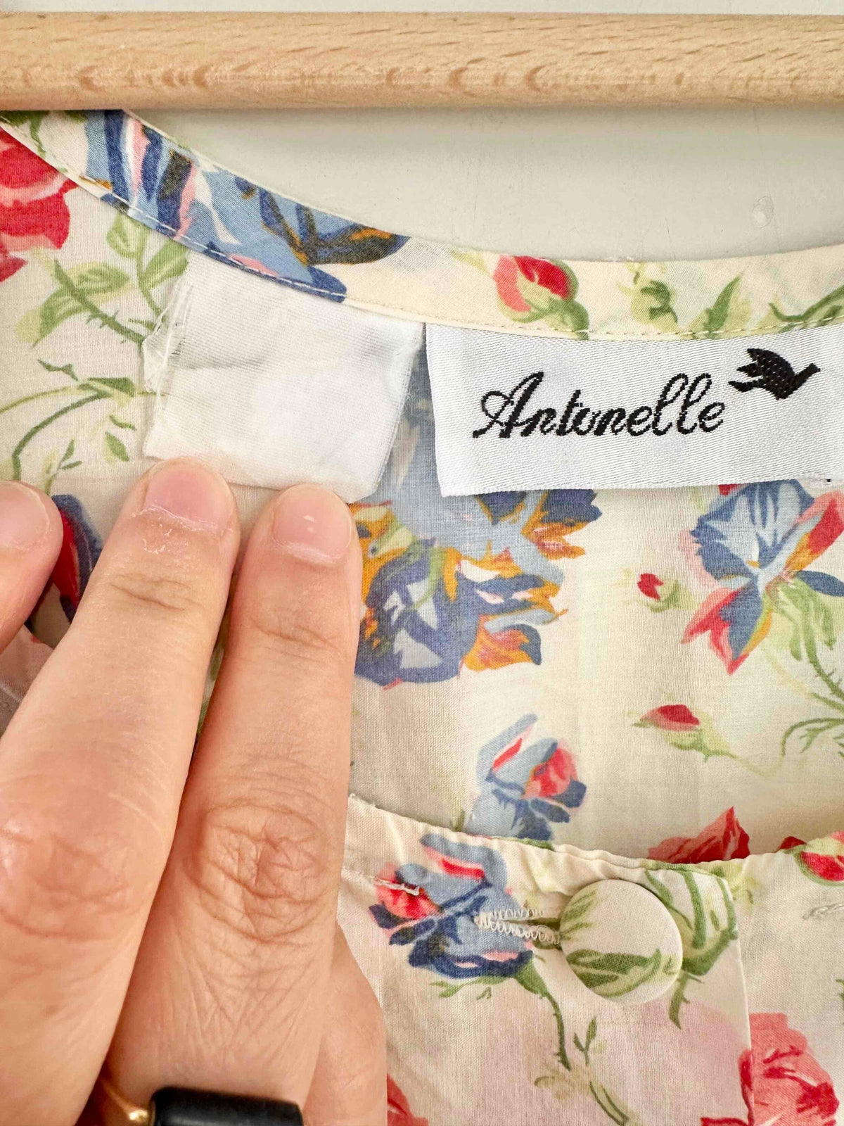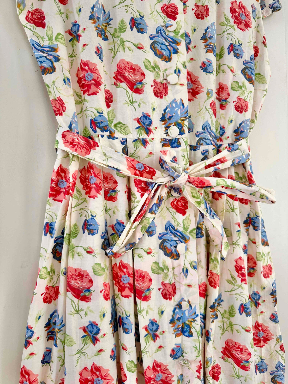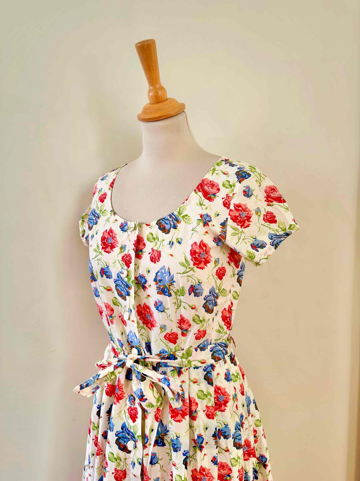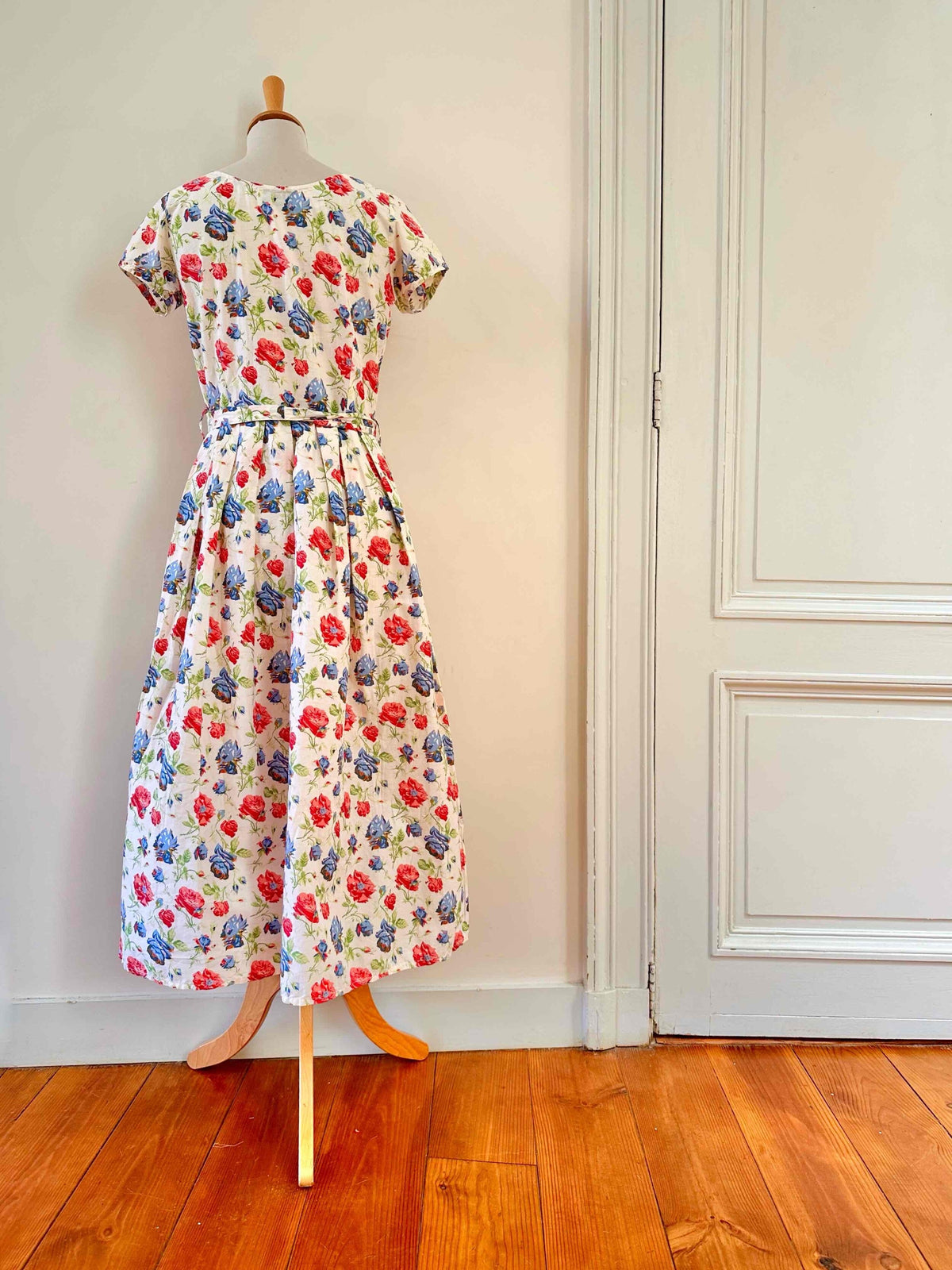 Prix unitaire parRobe longue à fleurs, en 100% coton popeline léger, écrue, imprimé fleurs rouges, bleues et vertes, boutonnée par boutons recouverts, ceinture, taille à nouer, fabriquée en France, taille 34 et 36, portée ici sur un mannequin T36, aisselles 43 cm.