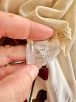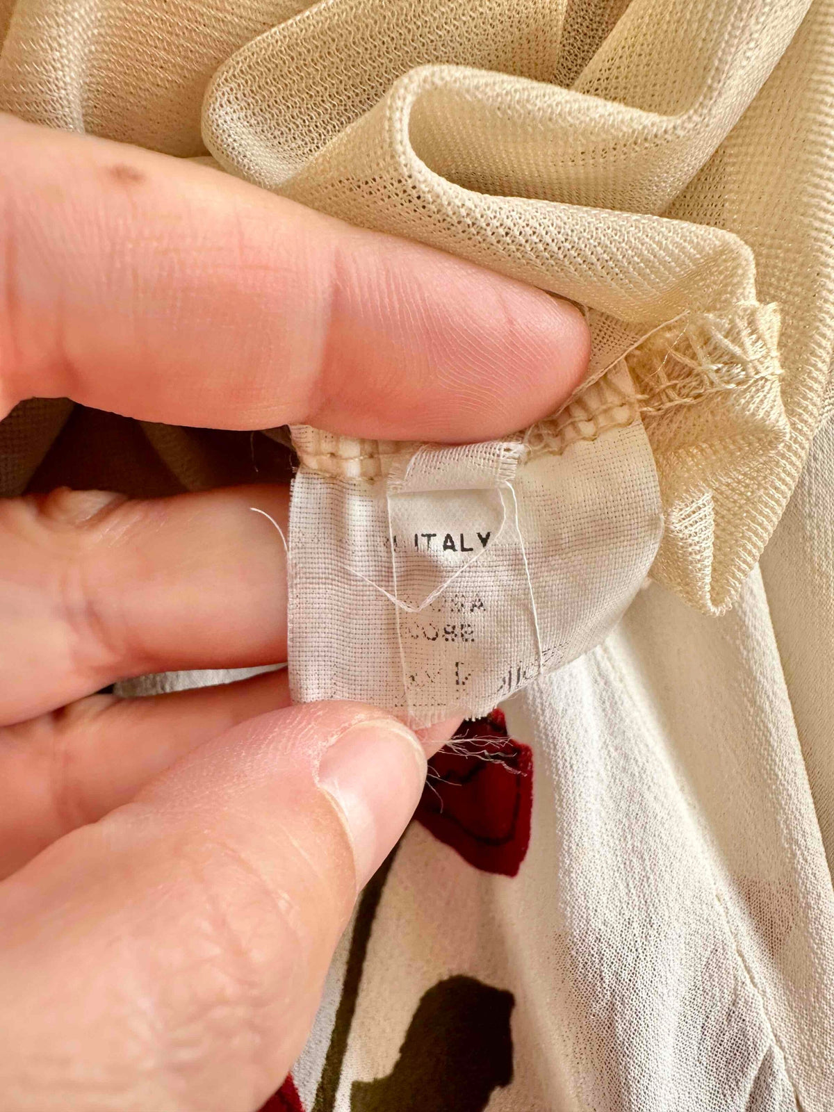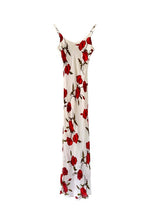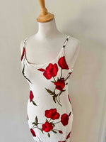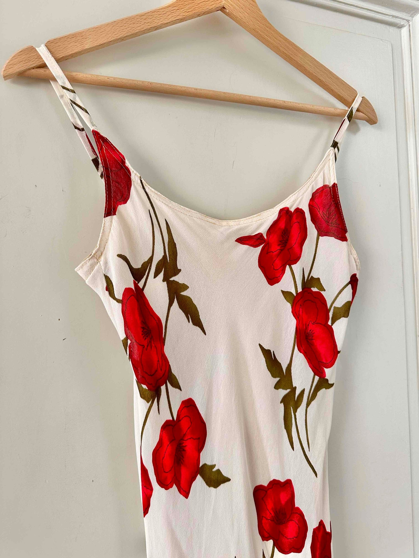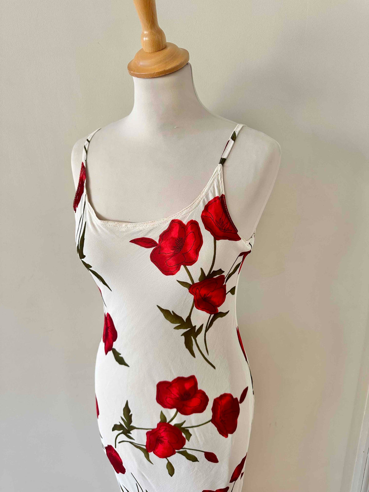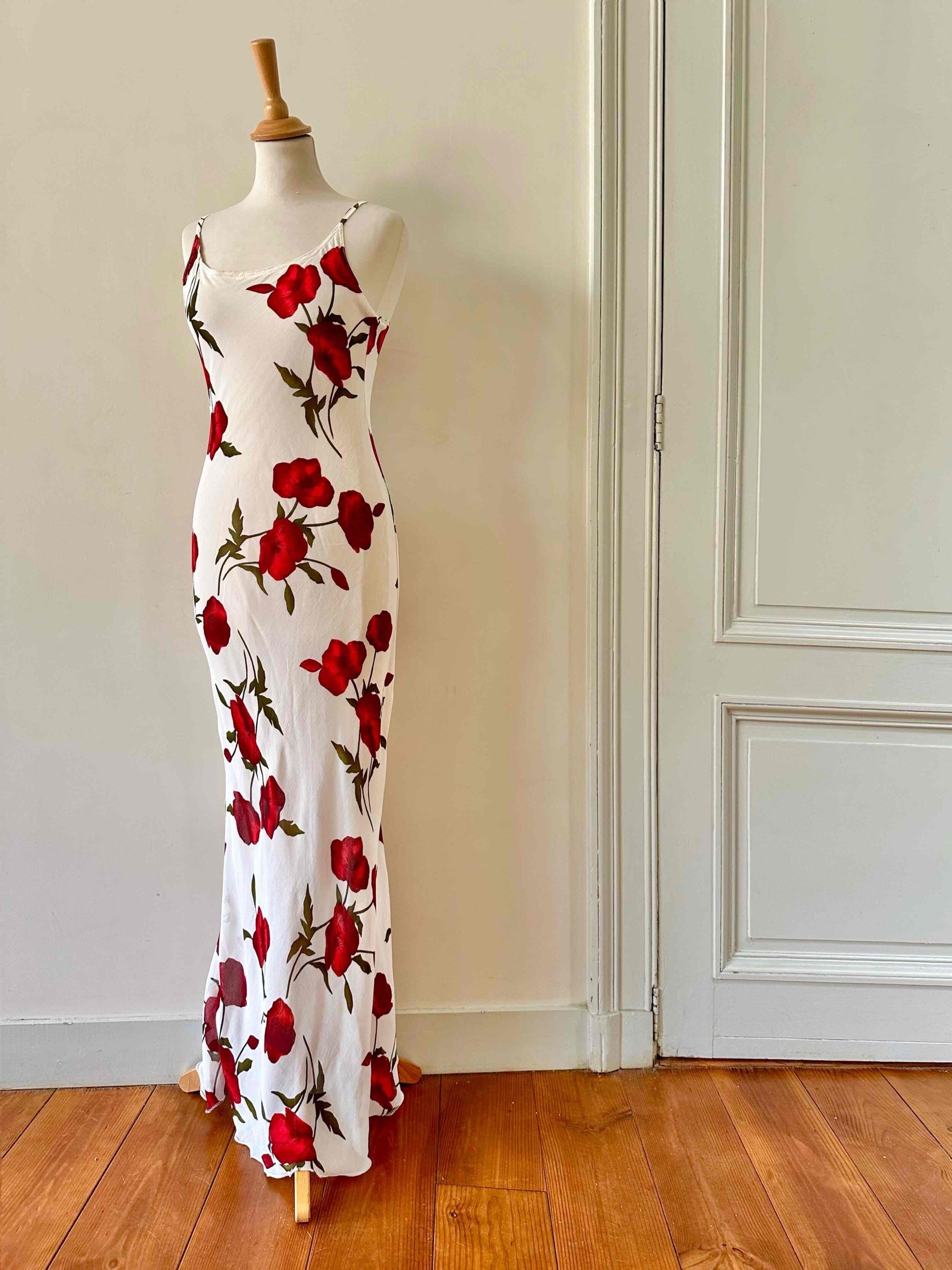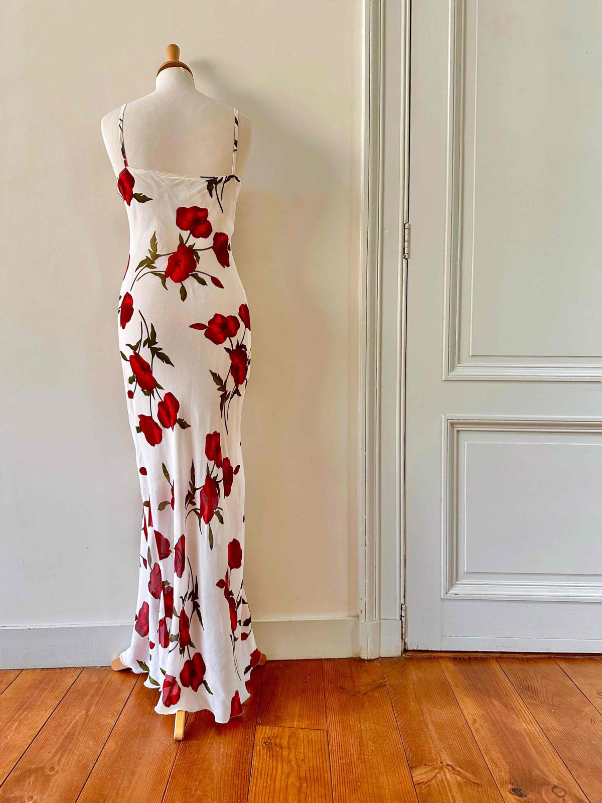 Prix unitaire parRobe nuisette à fleurs, en voile viscose blanc imprimée fleurs rouges et vertes, bretelles spaghettis, longueur maxi taillée en biais, fabriquée en Italie, taille 34 et 36, porté ici sur un mannequin T36, aisselles 43 cm.