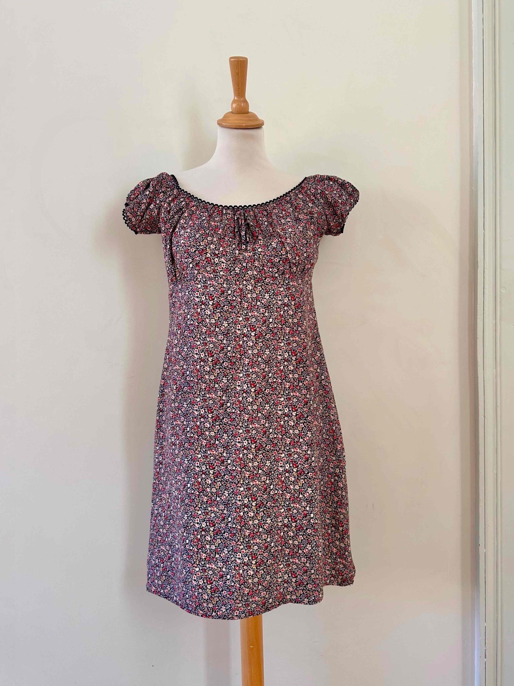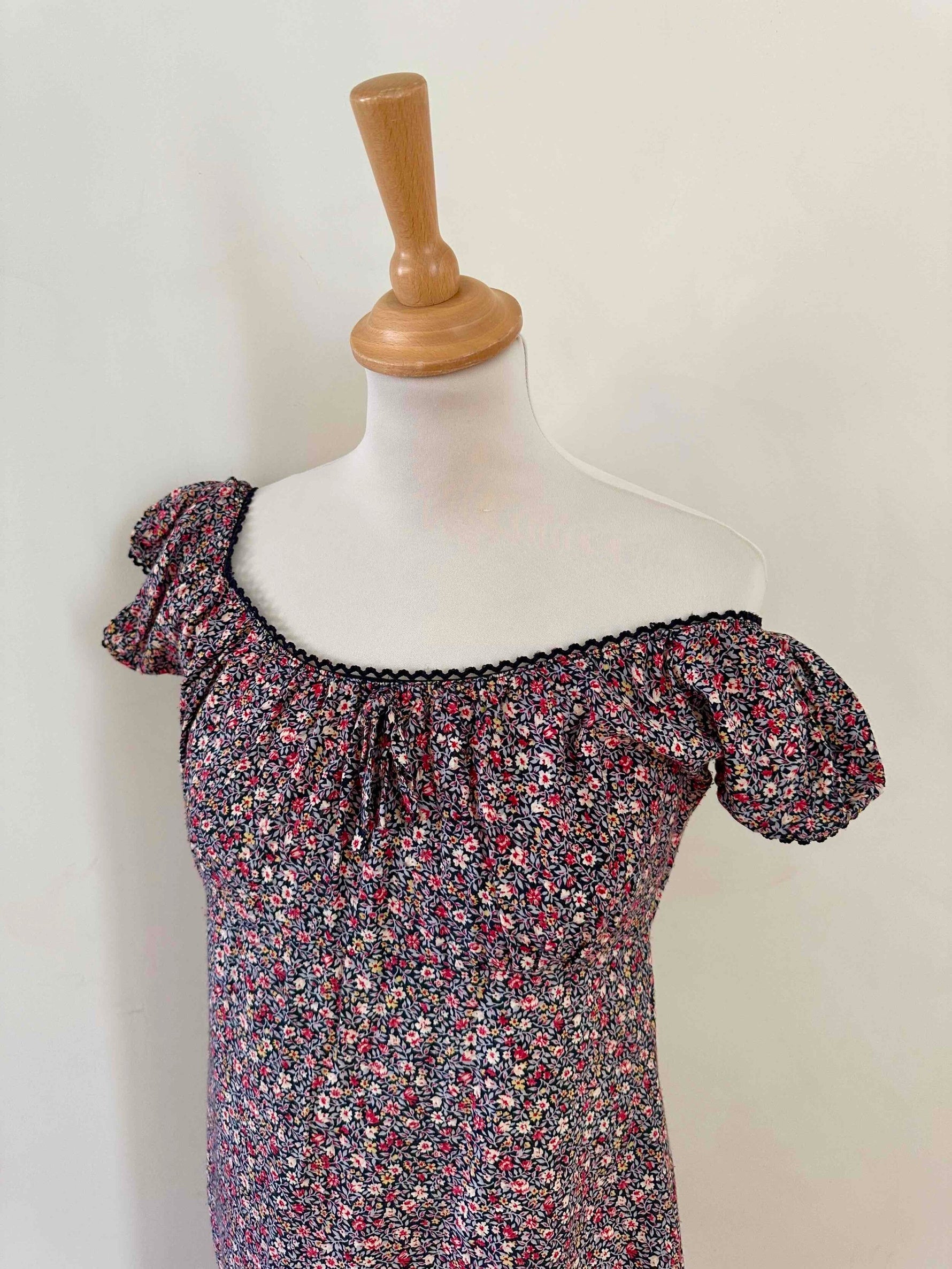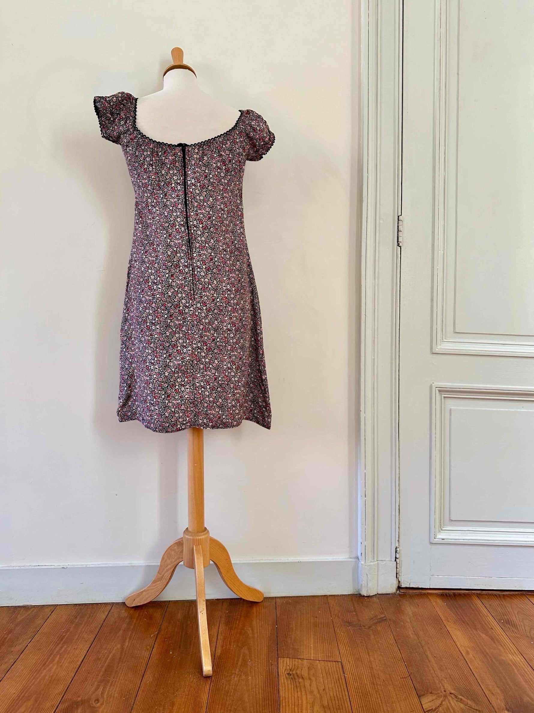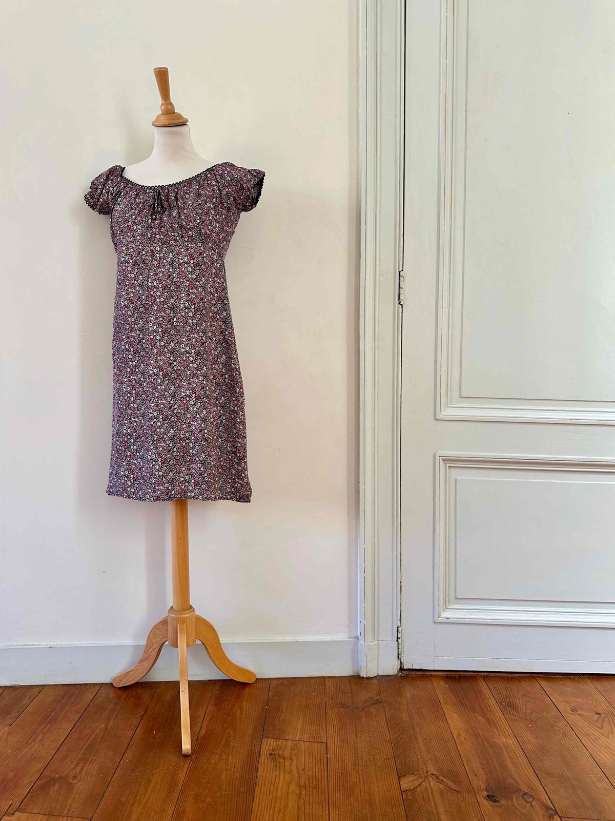 Prix unitaire parMini robe à fleurs en viscose noire imprimée petites fleurs rouges, roses et blanches, encolure et épaules élastiques à porter open shoulders, manches ballons, poitrine froncée à nouer, fabriquée en France, taille 36 portée ici sur un mannequin T36, aisselles 44 cm.
