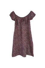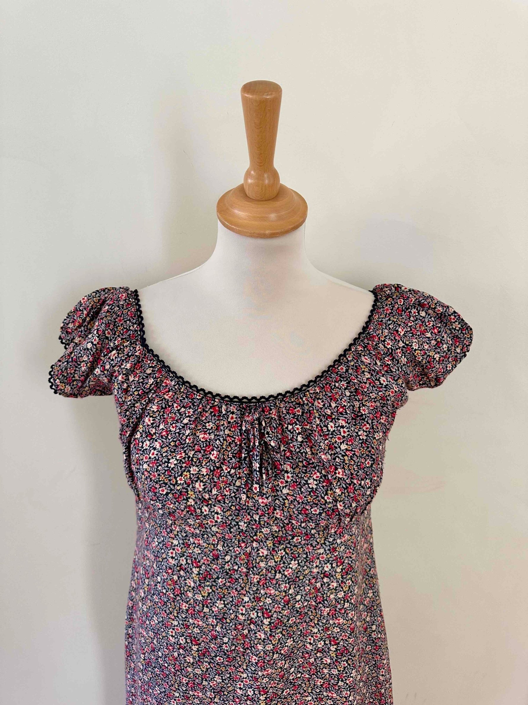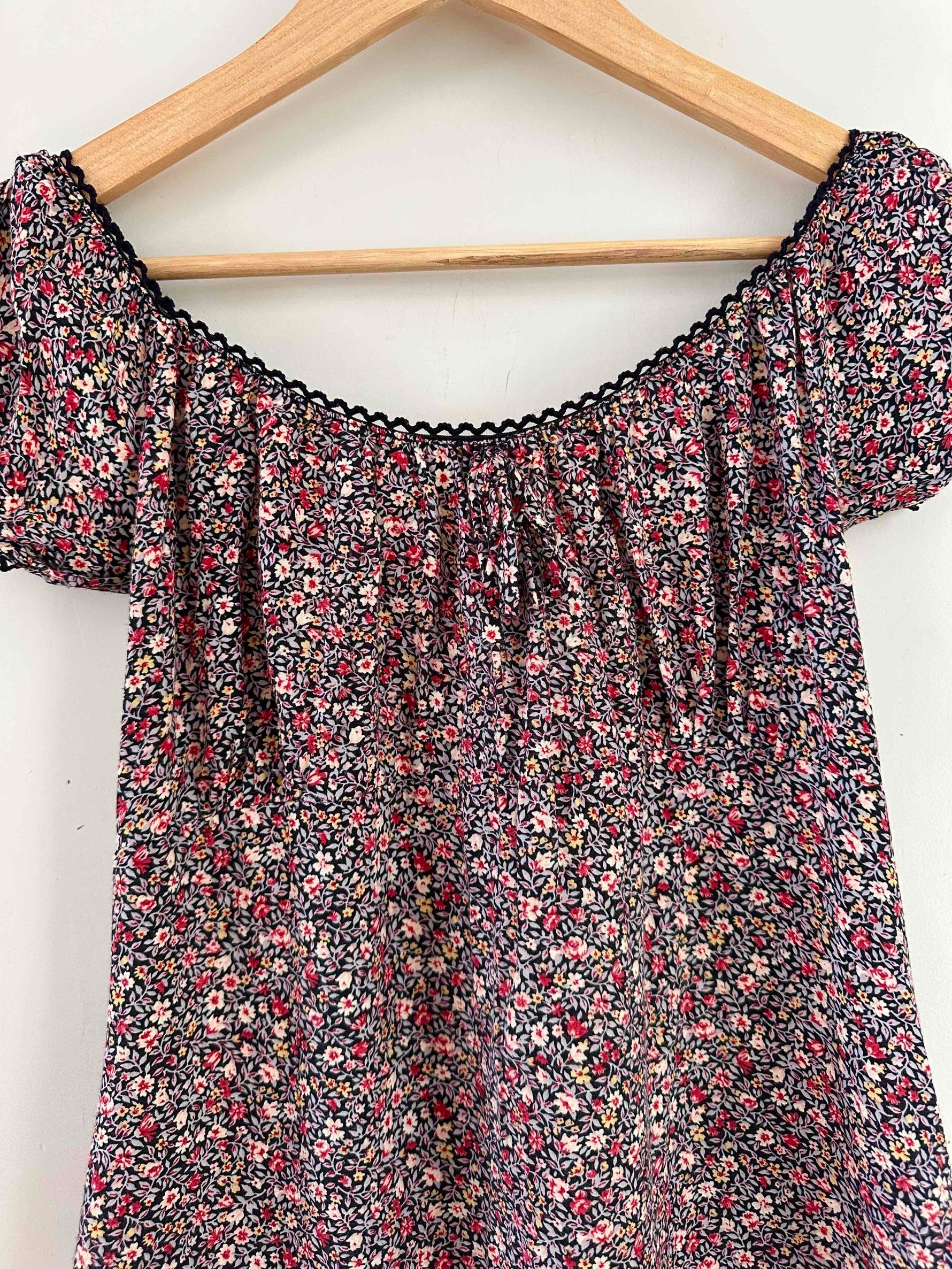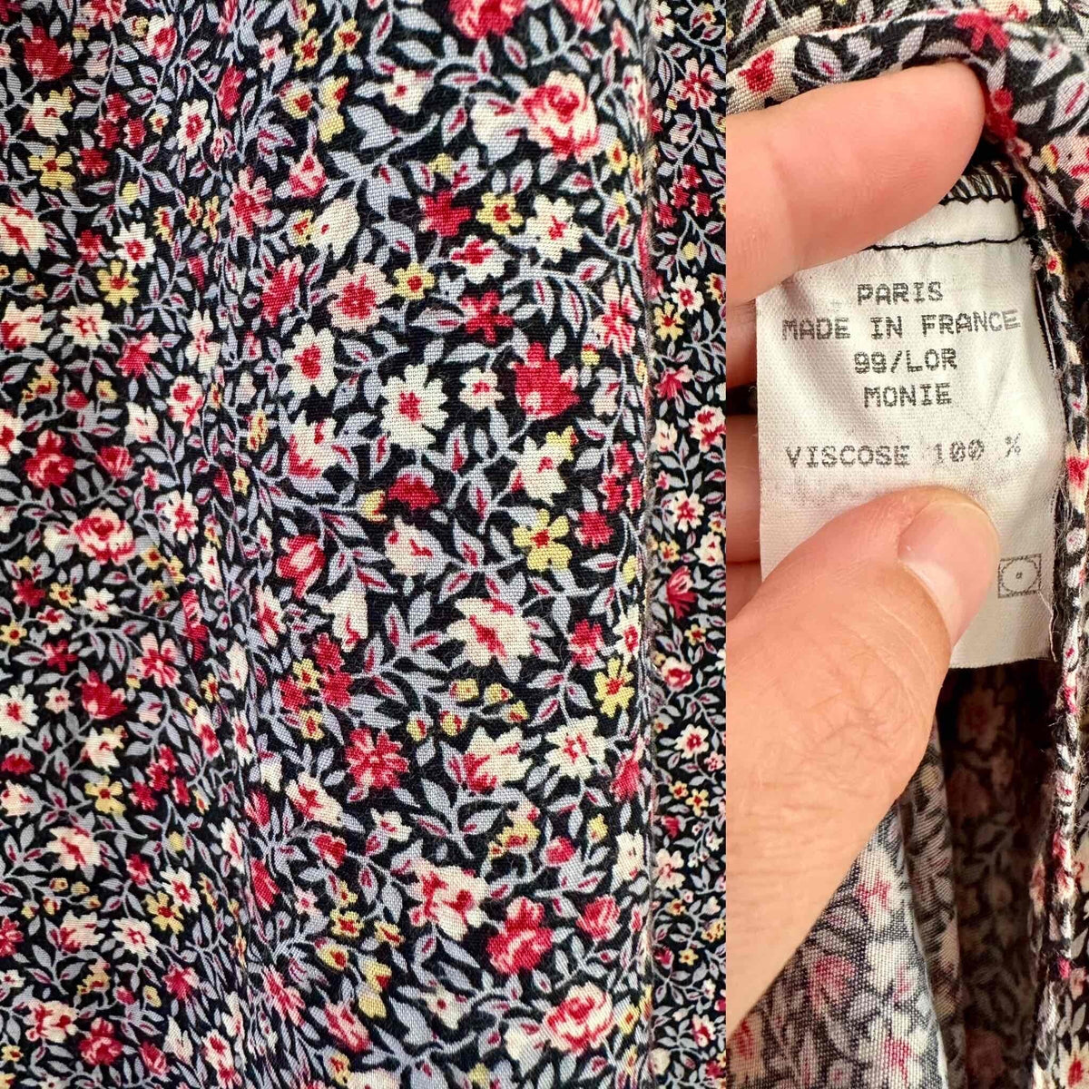 Prix unitaire parMini robe à fleurs en viscose noire imprimée petites fleurs rouges, roses et blanches, encolure et épaules élastiques à porter open shoulders, manches ballons, poitrine froncée à nouer, fabriquée en France, taille 36 portée ici sur un mannequin T36, aisselles 44 cm.