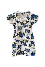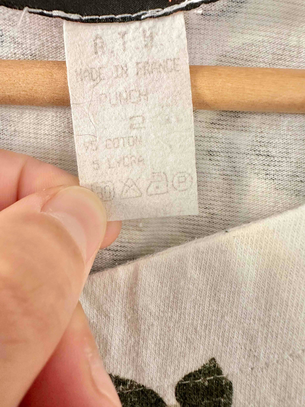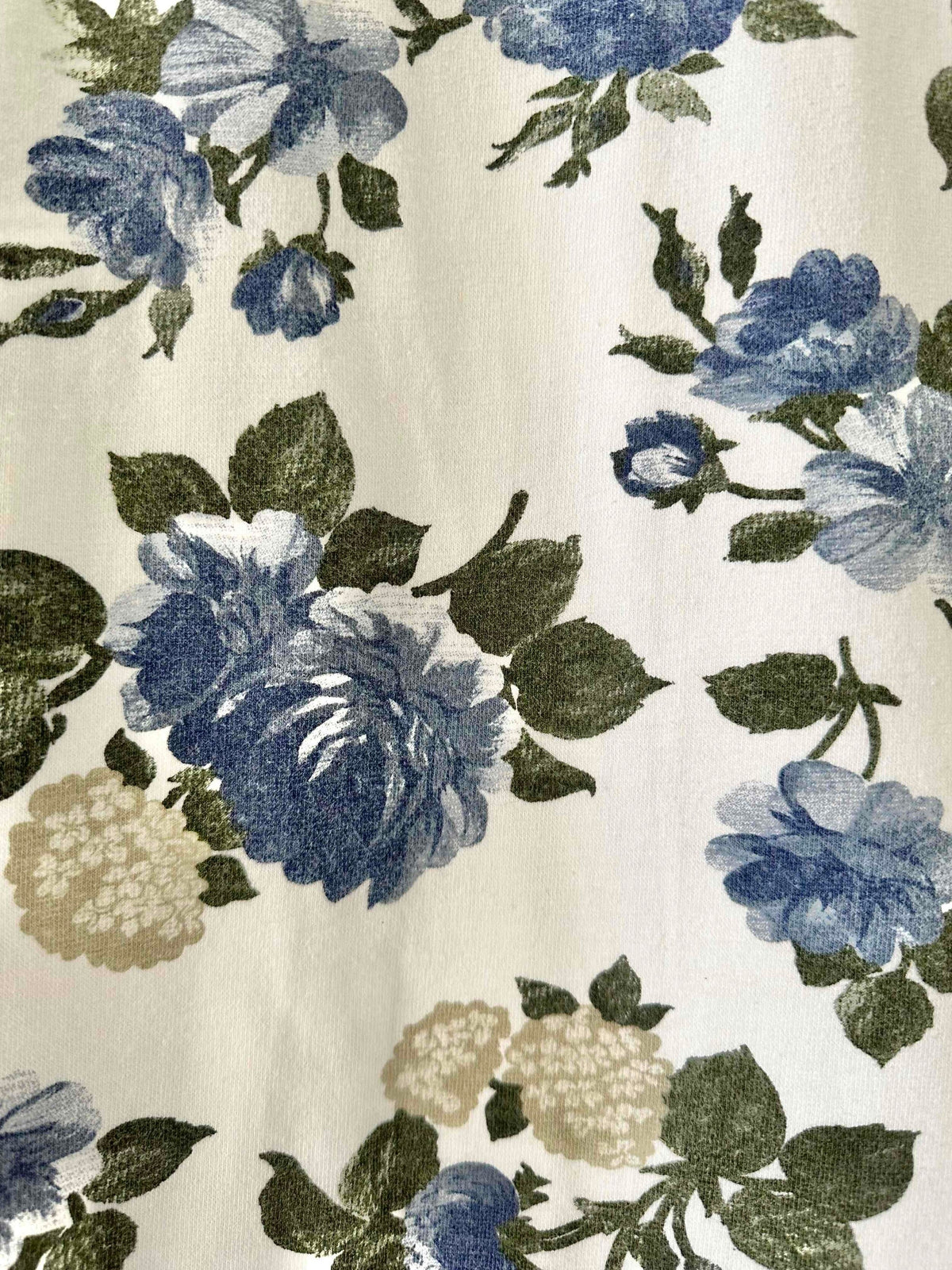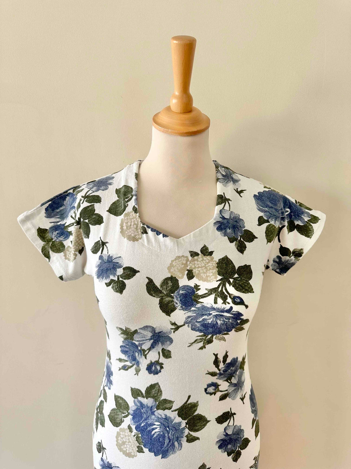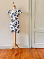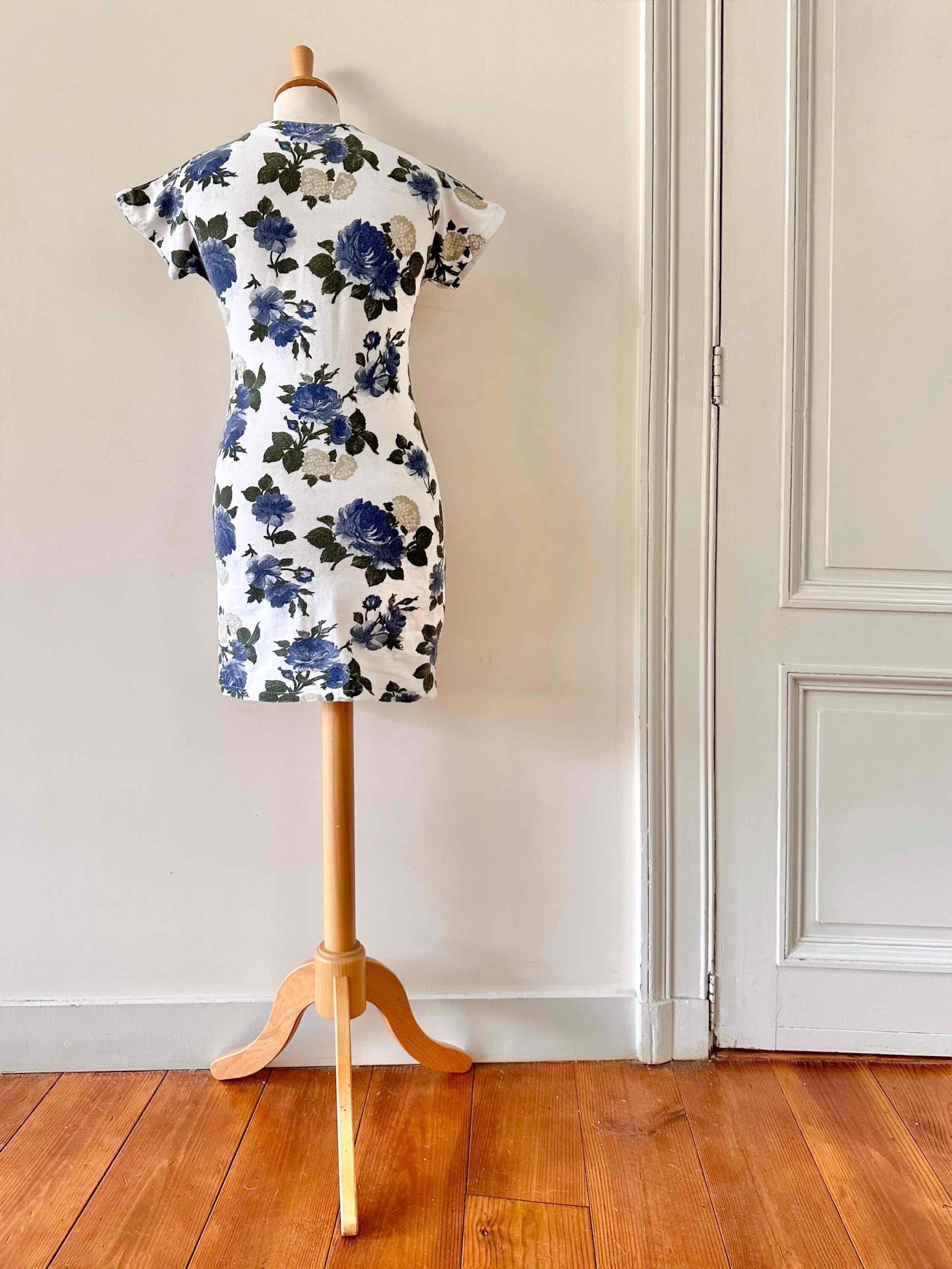 Prix unitaire parRobe-mini à fleurs, en jersey de coton élasthanne, blanc, imprimée fleurs bleues et vertes, et hortensia beige, forme robe t-shirt, fabriquée en France, convient aux tailles 34 et 36, portée ici sur un mannequin T36.