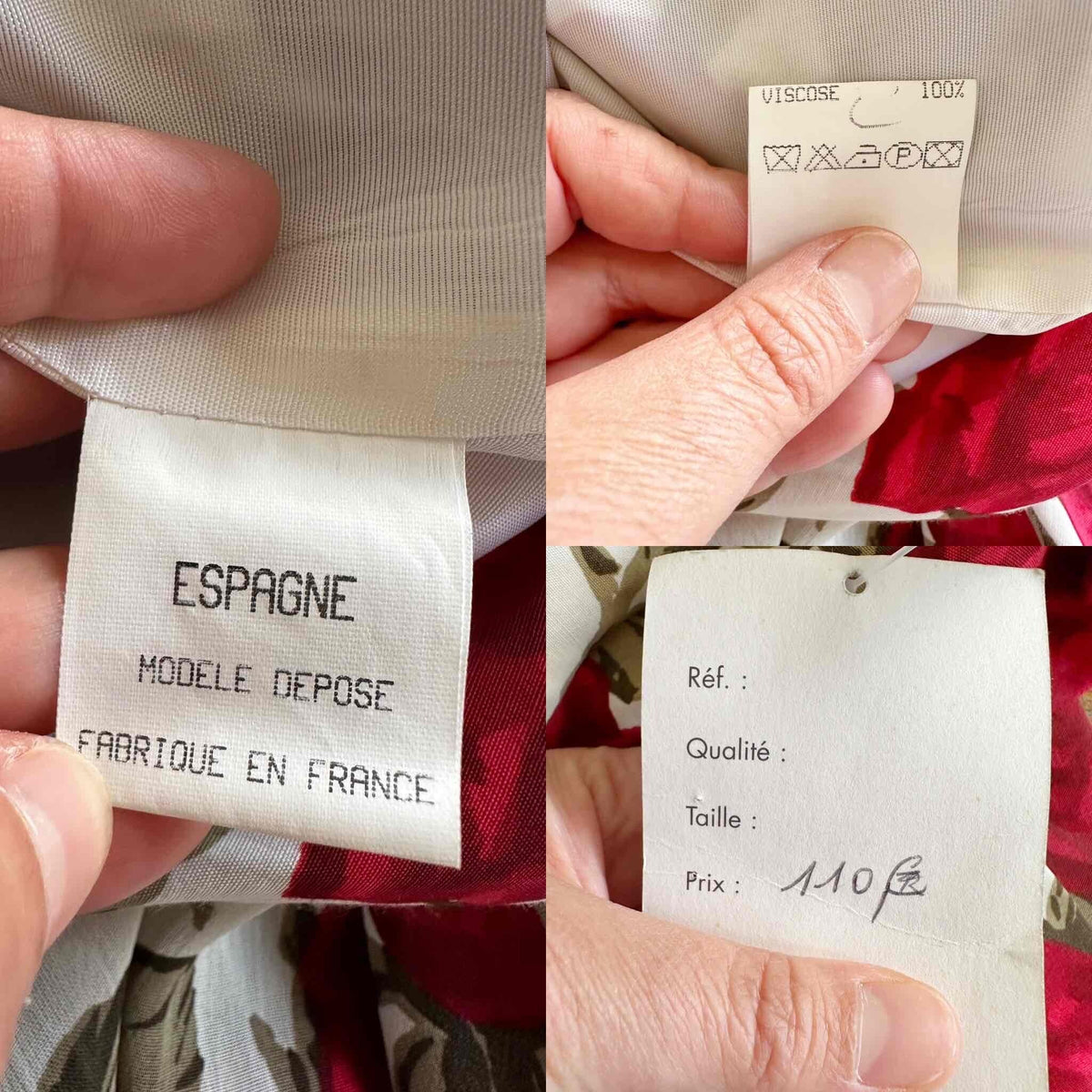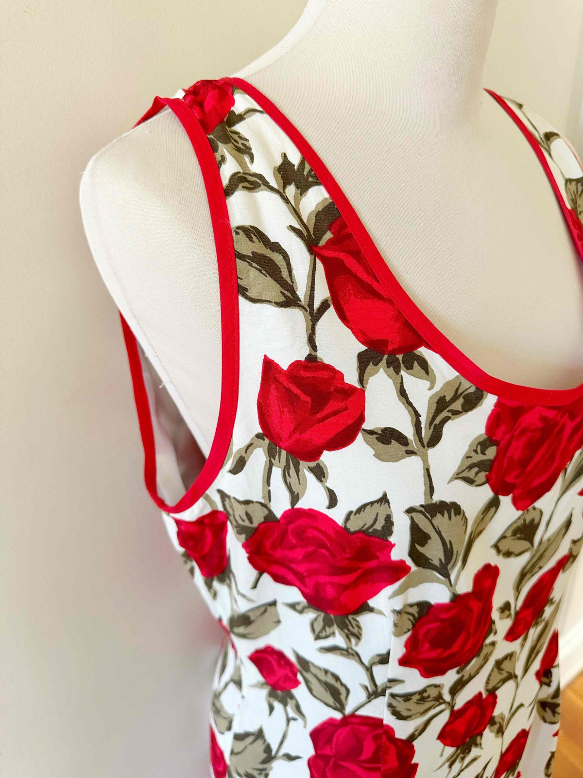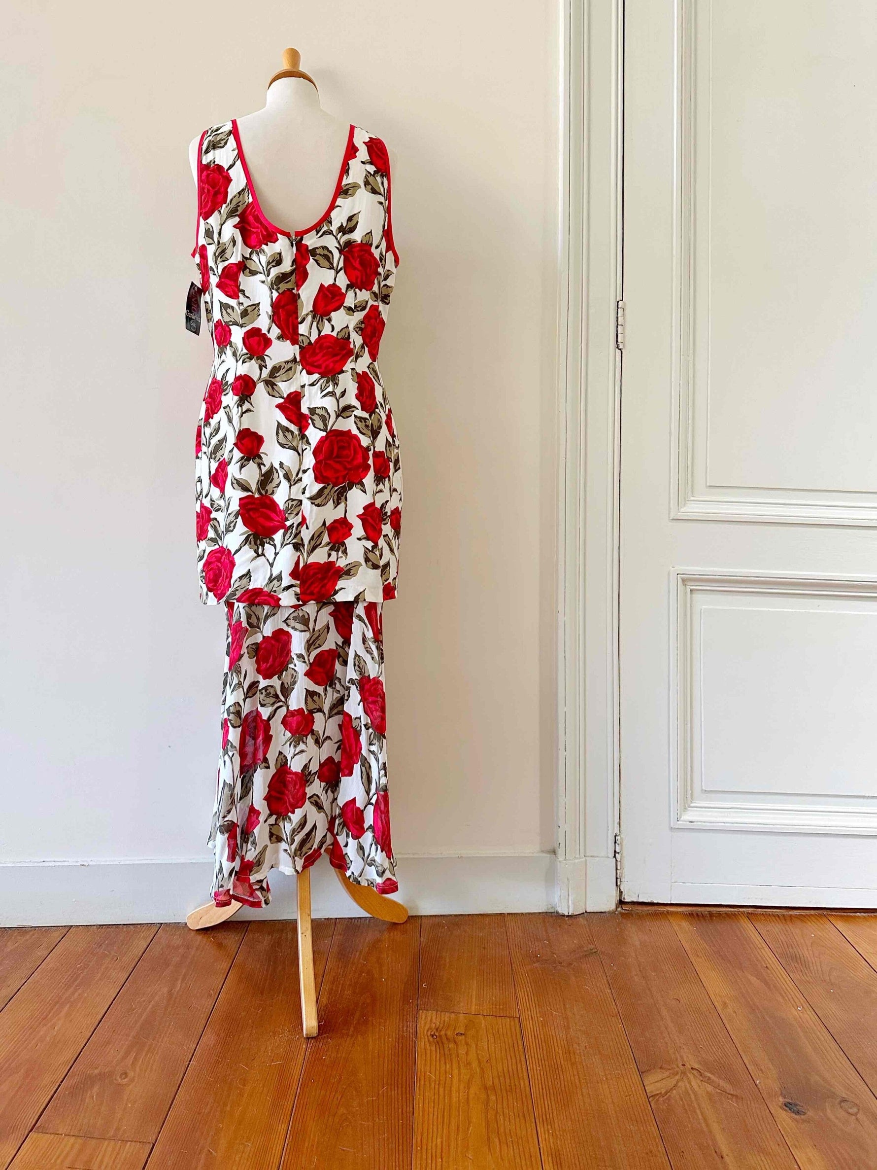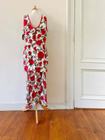 Prix unitaire parRobe longue à fleurs, en viscose blanche imprimée roses rouges et vertes, bas à étage en voile viscose, taillée en biais, fabriquée en France, taille 38, portée ici sur un mannequin T36, aisselles 45 cm.