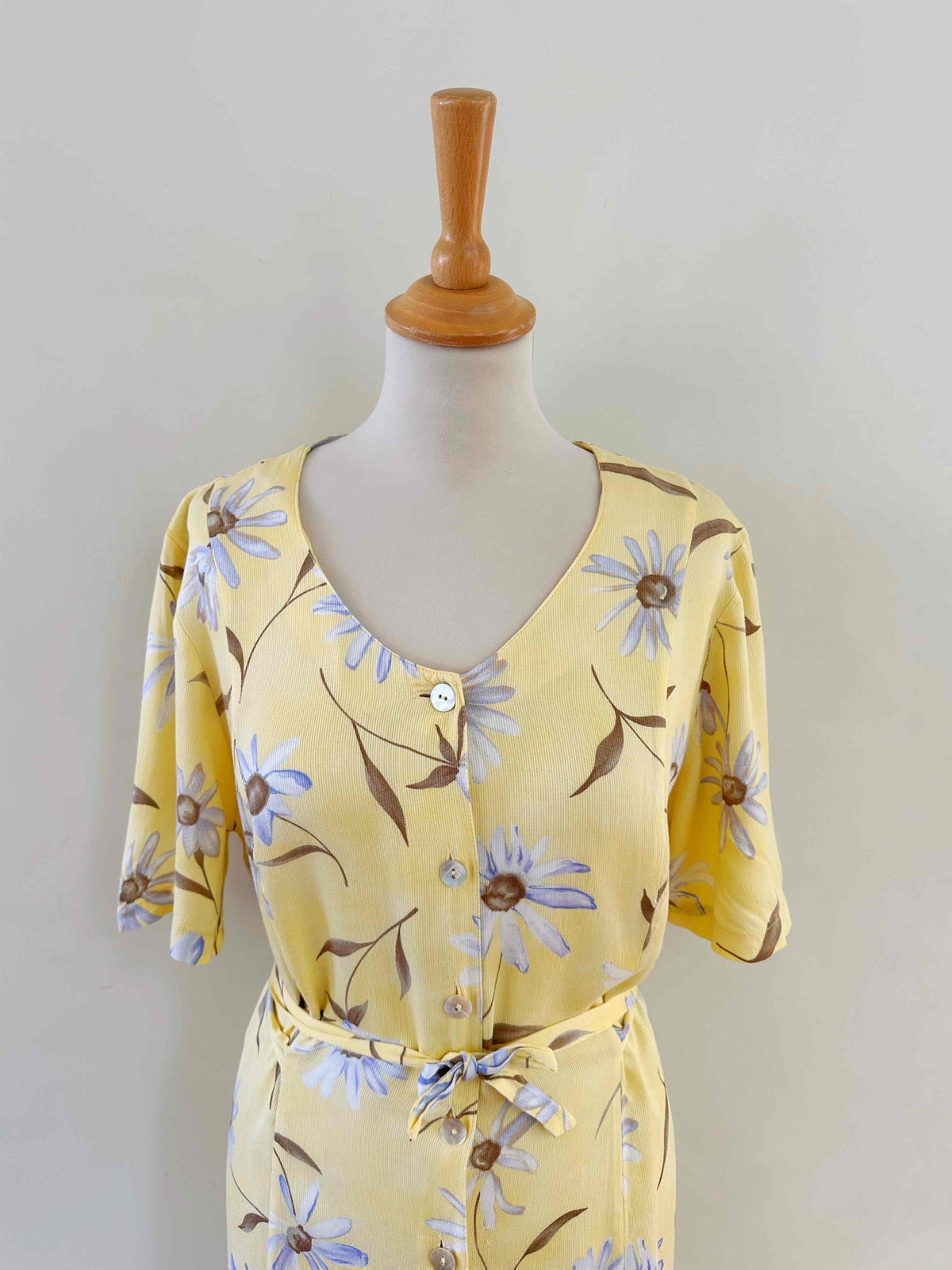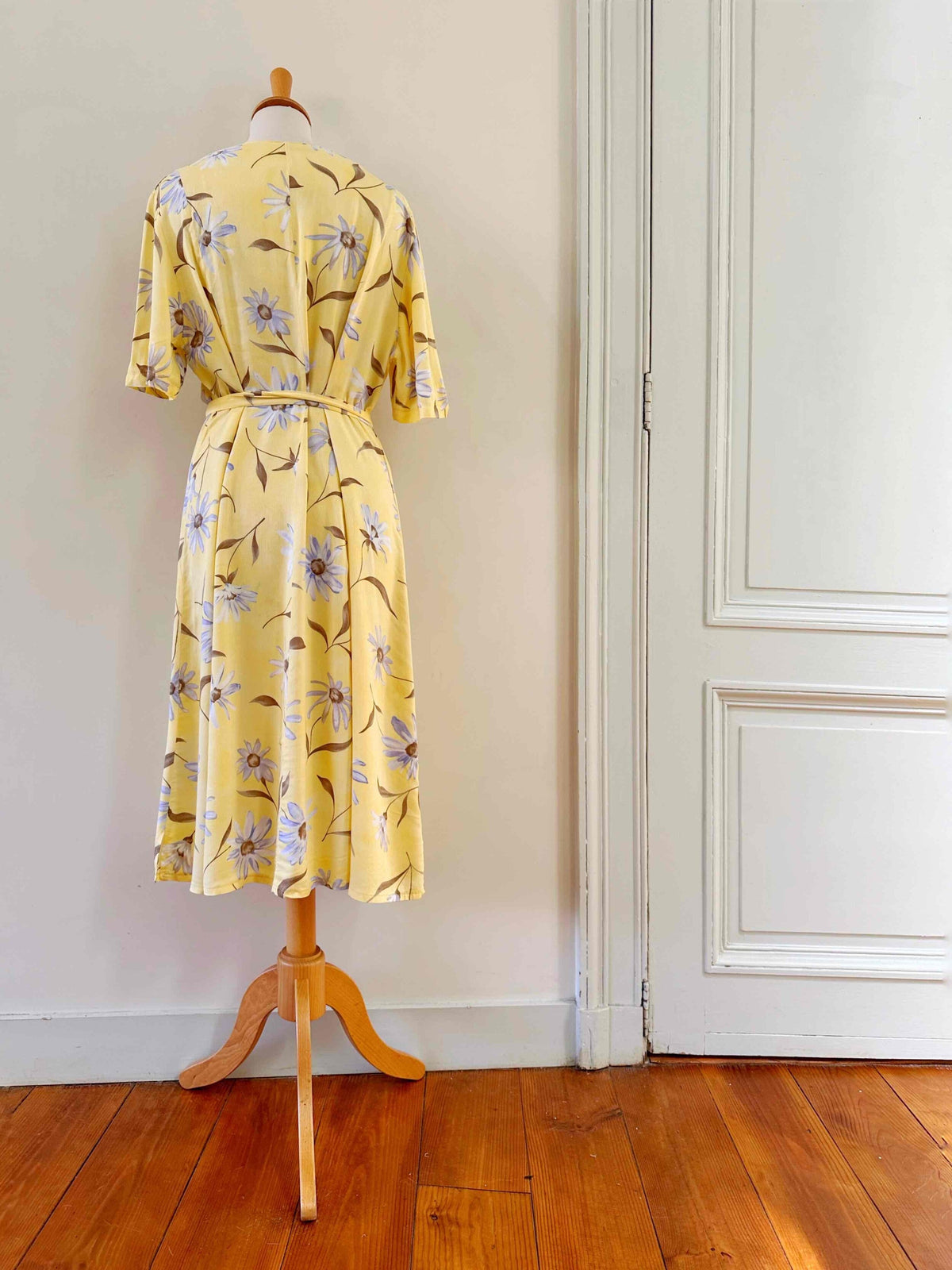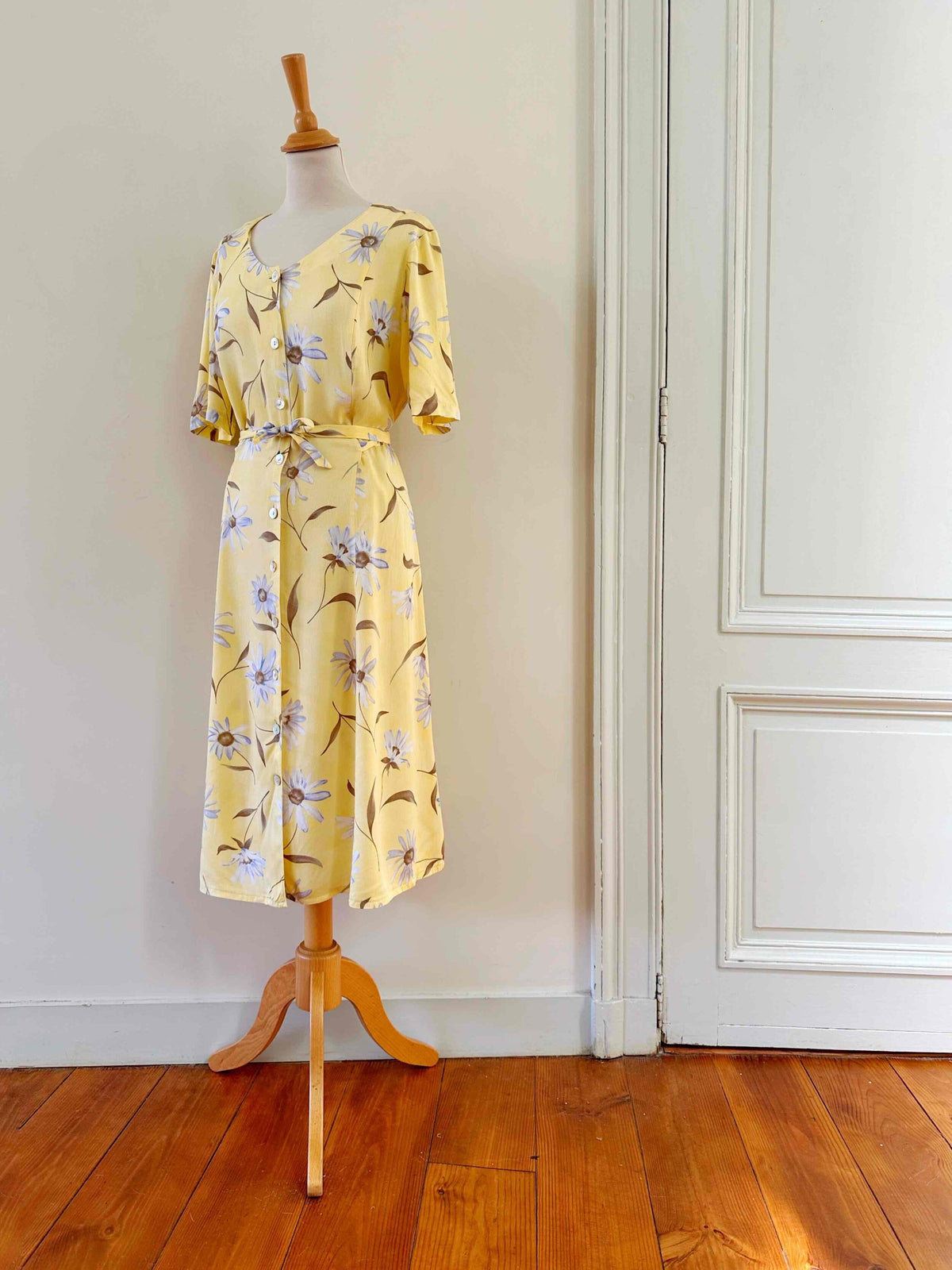 Prix unitaire parRobe longue à fleurs en viscose striée jaune poussin imprimée fleurs de marguerites lilas et blanches, boutonnée en nacre, manches courtes épaulettes fines, taille à nouer au dos ou double nouer devant sur une T36, convient aux 36 et 38 selon l'effet voulu, portée ici sur un mannequin T36, aisselles 45cm.
