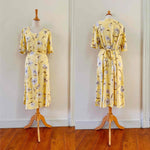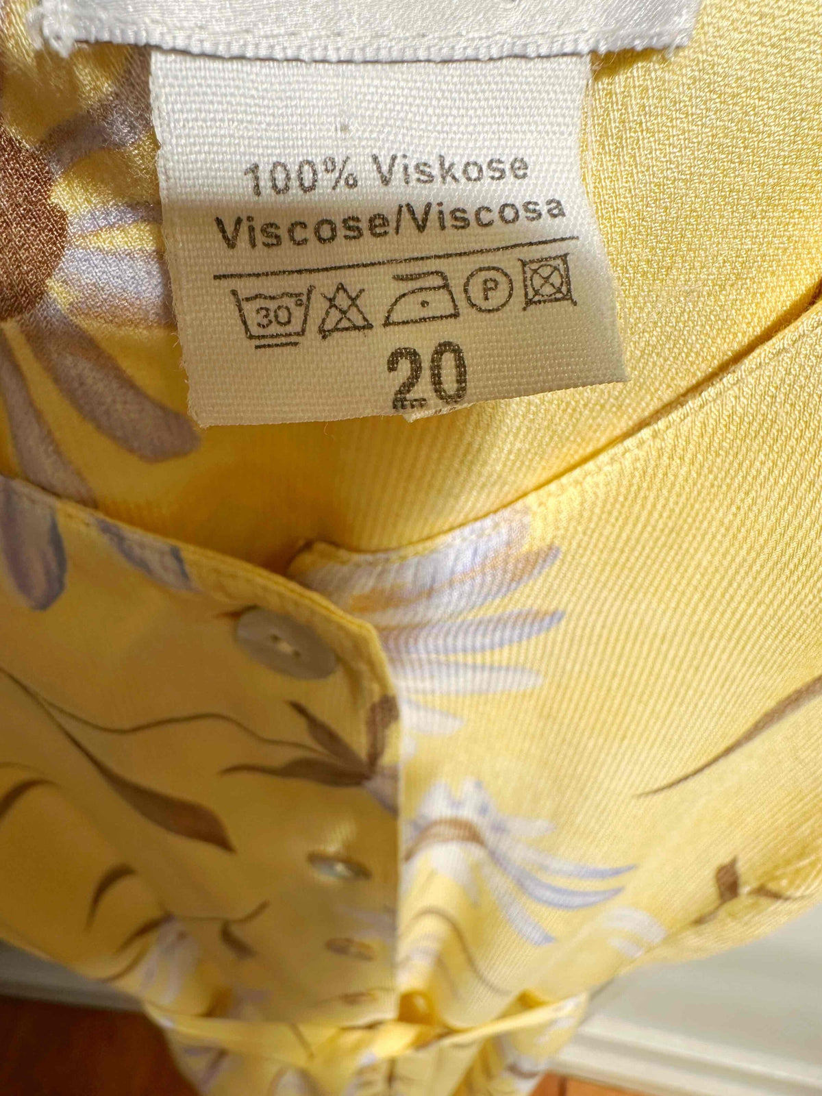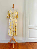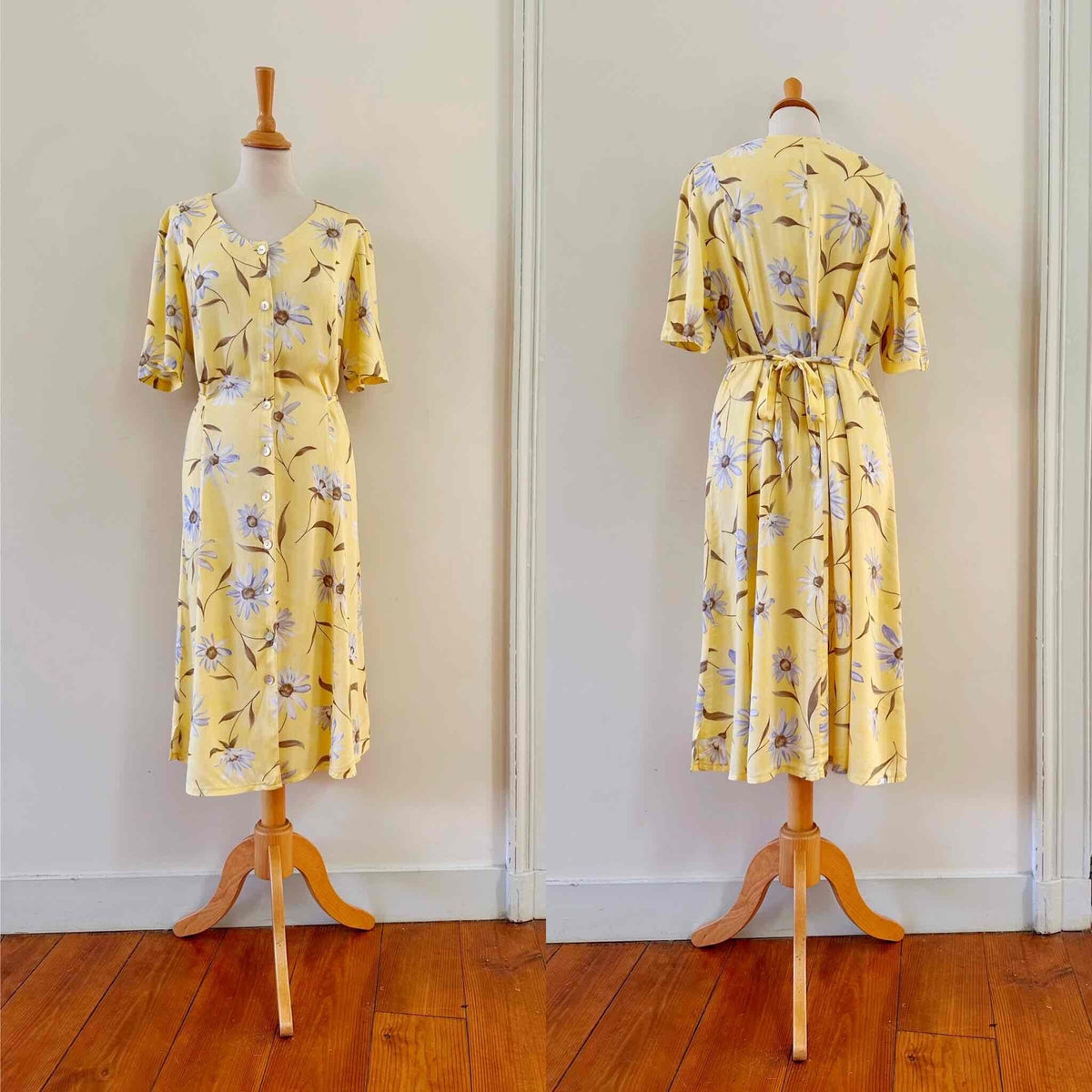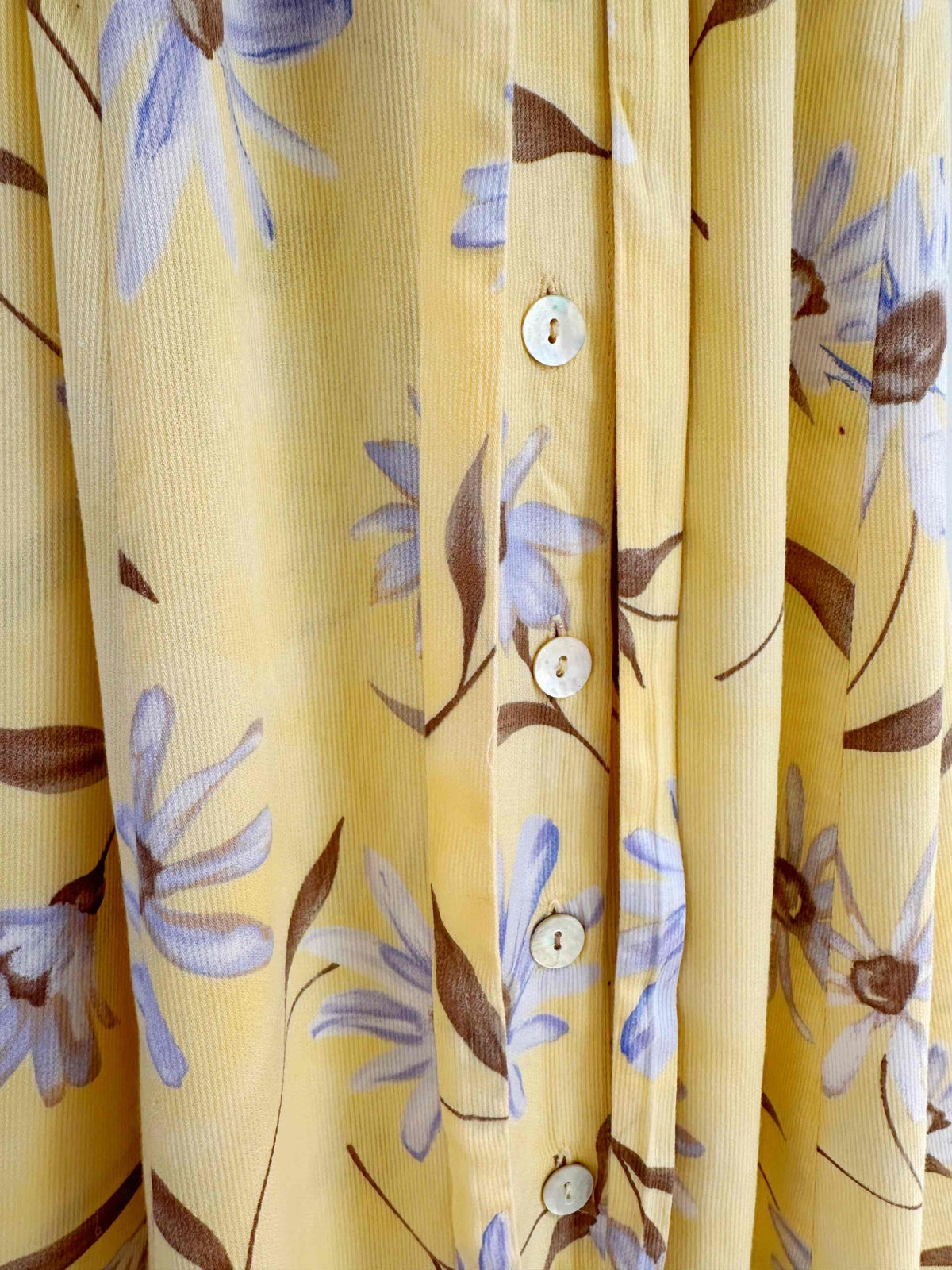 Prix unitaire parRobe longue à fleurs en viscose striée jaune poussin imprimée fleurs de marguerites lilas et blanches, boutonnée en nacre, manches courtes épaulettes fines, taille à nouer au dos ou double nouer devant sur une T36, convient aux 36 et 38 selon l'effet voulu, portée ici sur un mannequin T36, aisselles 45cm.