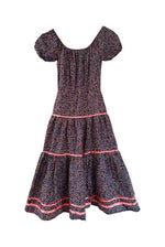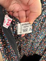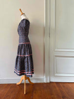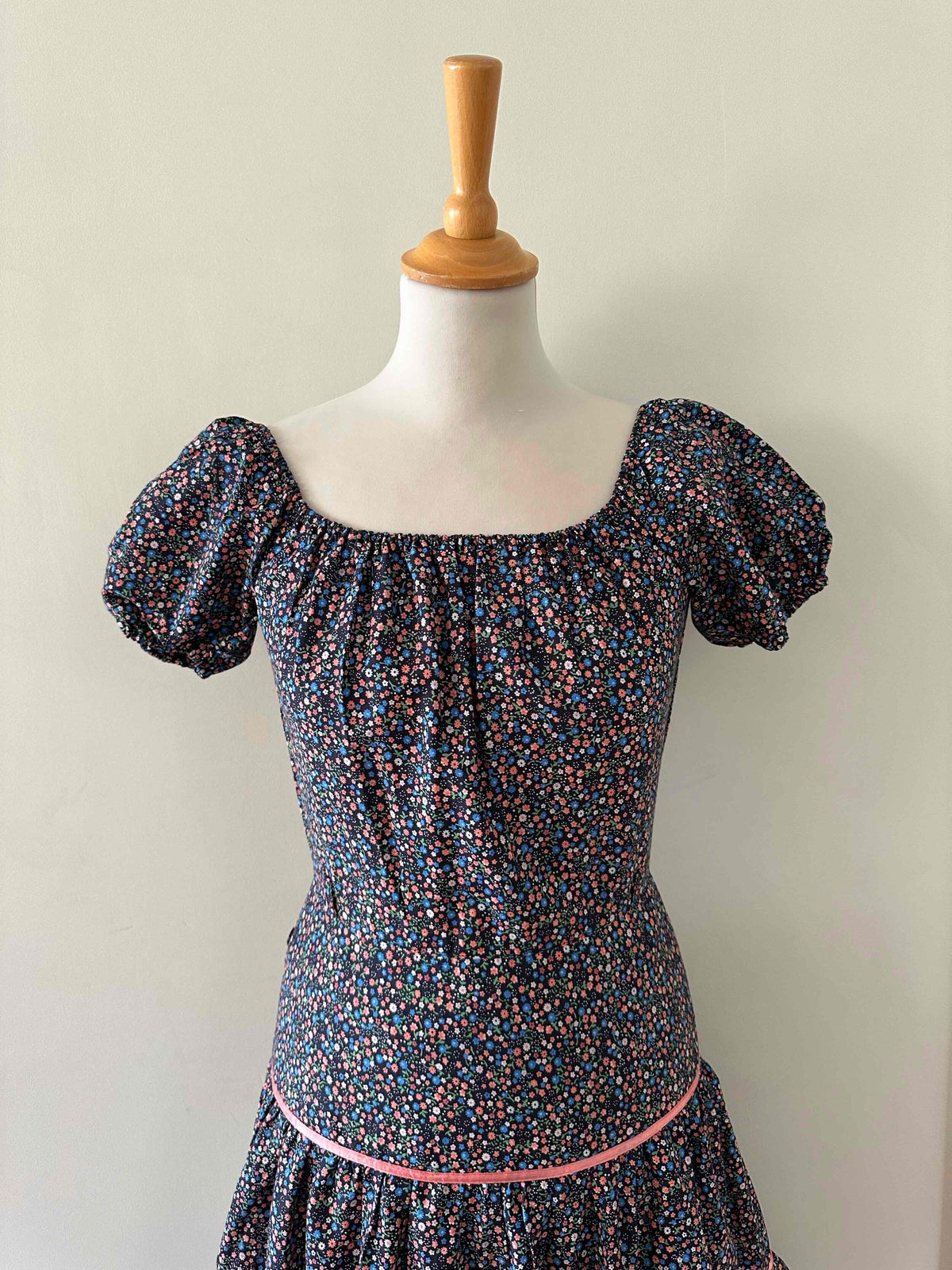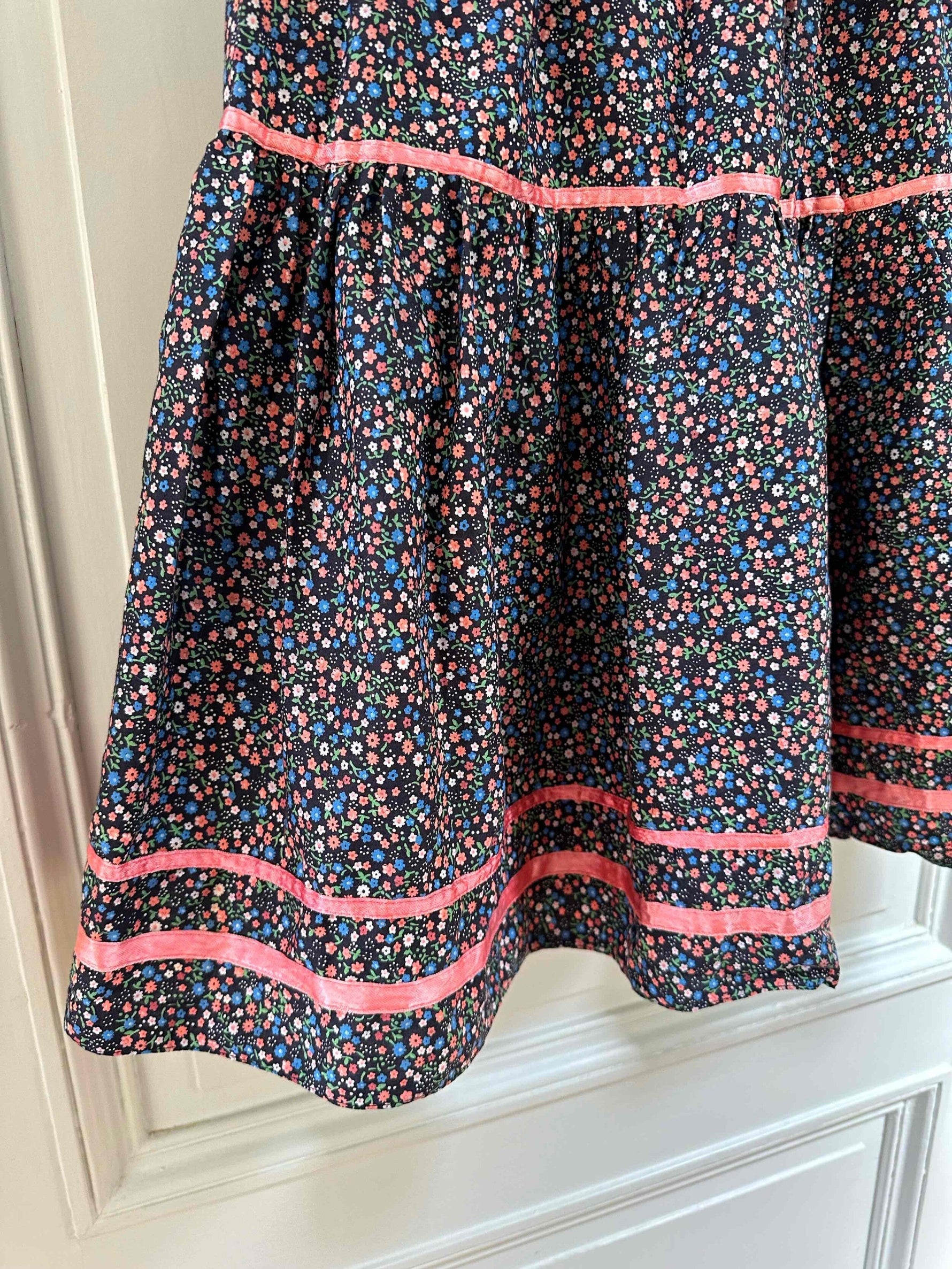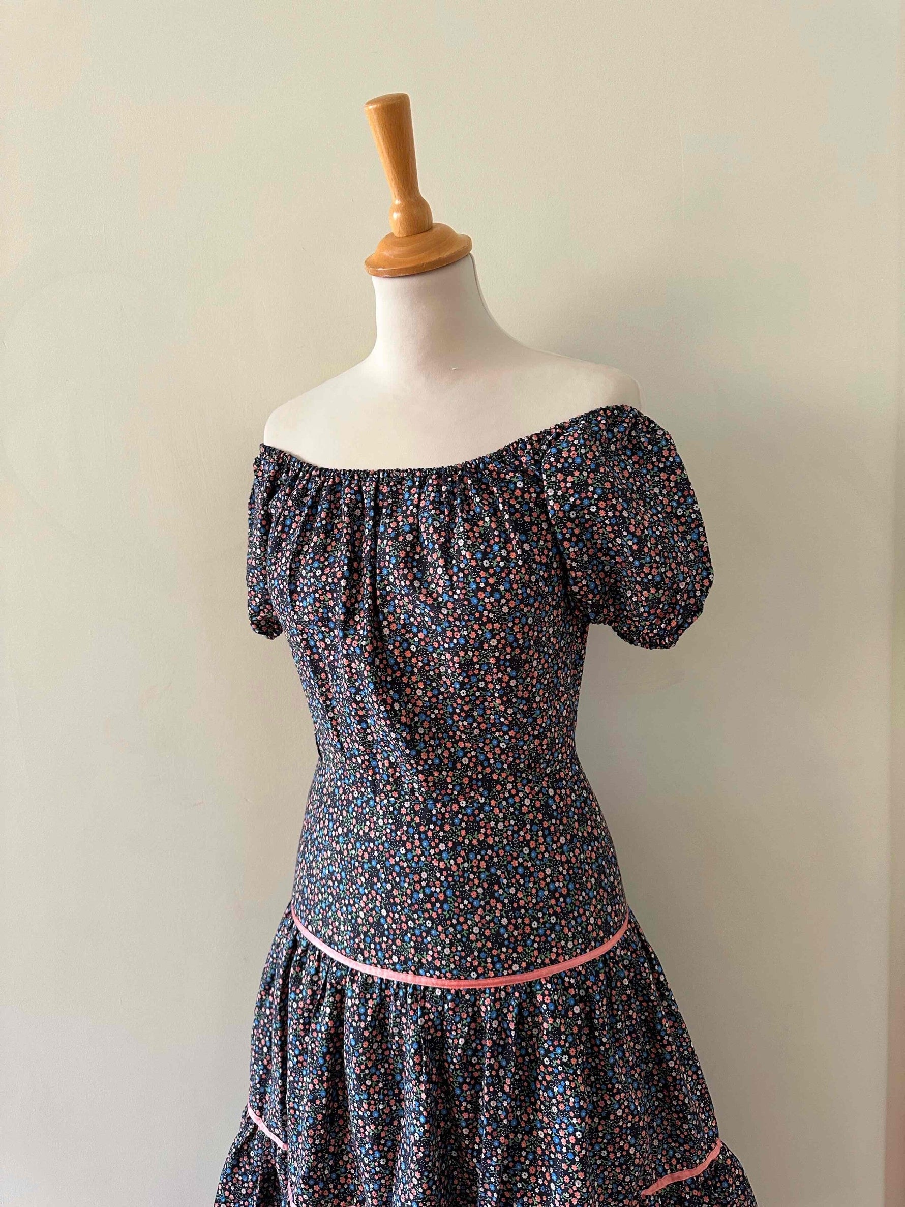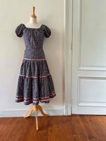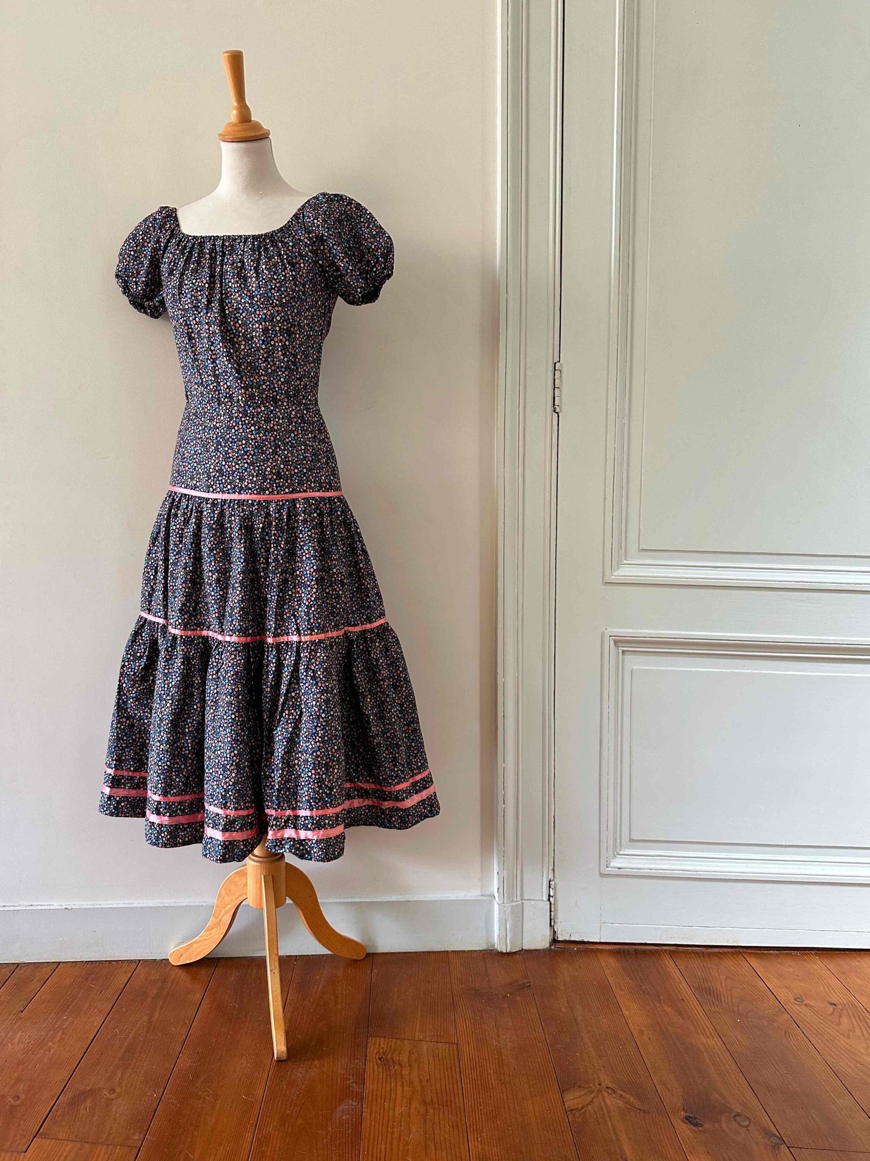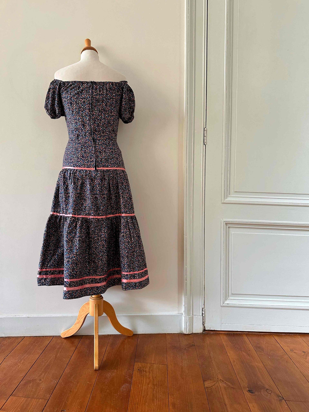 Prix unitaire parRobe à fleurs 70s, en 100% coton noir imprimée minis fleurs liberty multicolores pastel, manches ballons et encolure élastique à porter open-shoulders, bas jupon à etages brodés de rubans satin rose, années 70s espeit robe prairie, taille 36 portée ici sur un mannequin T36.