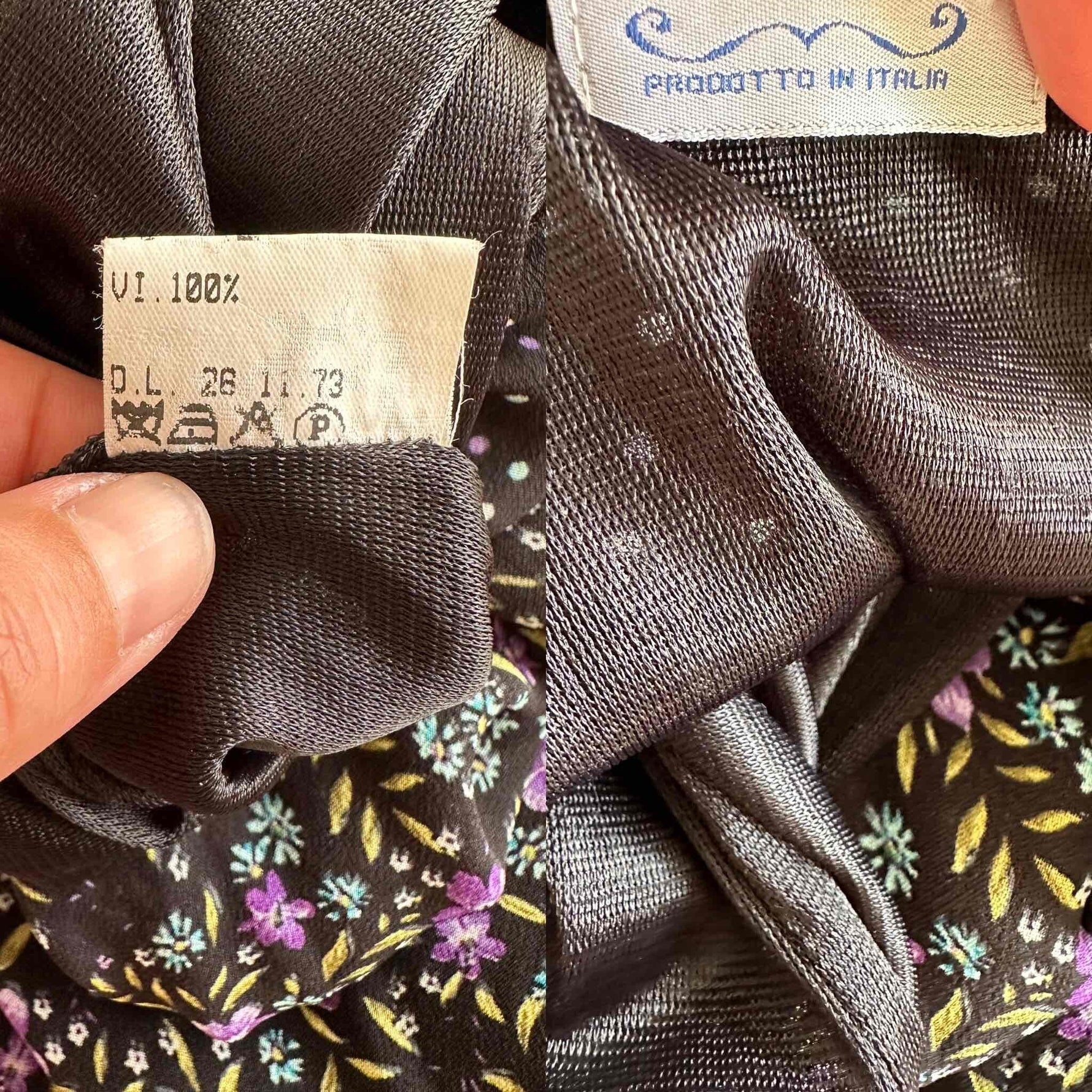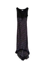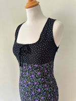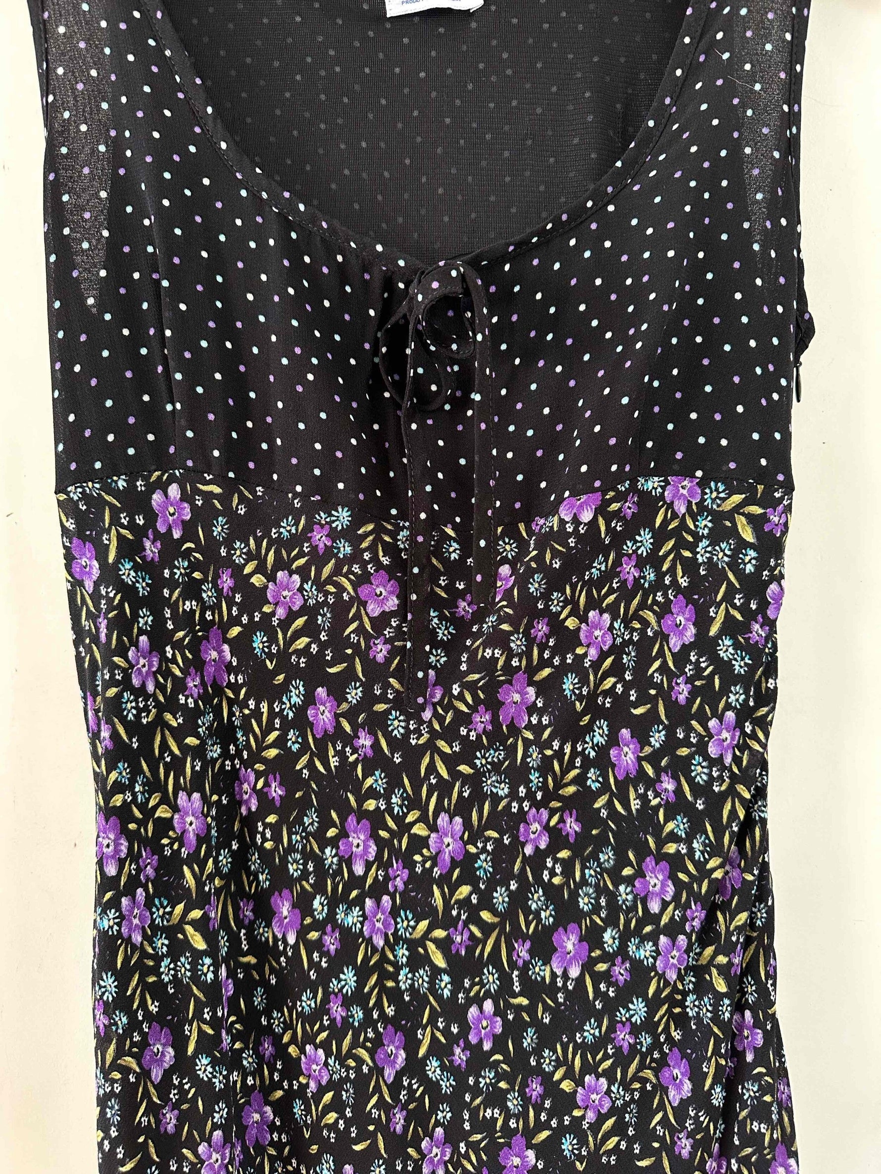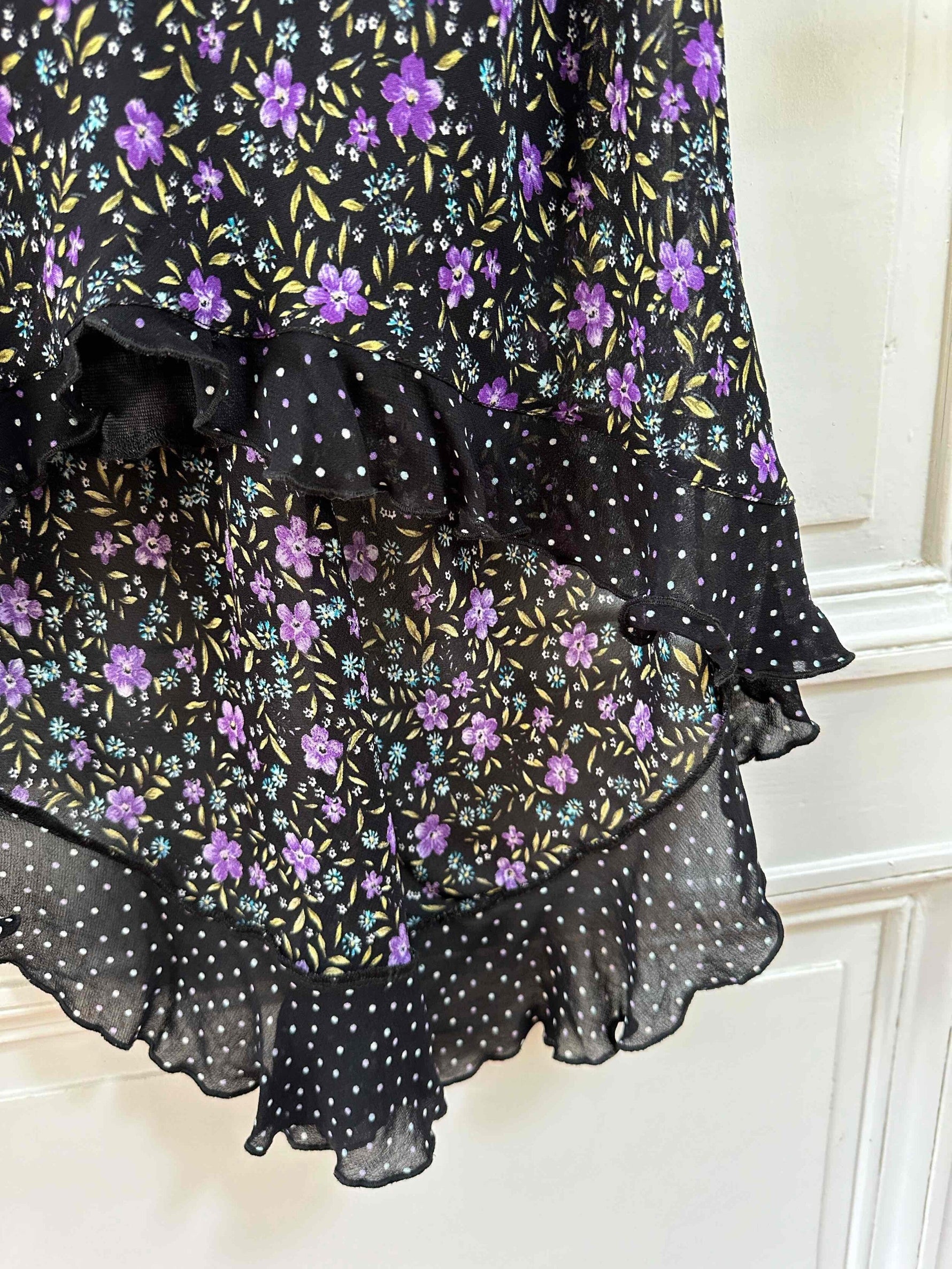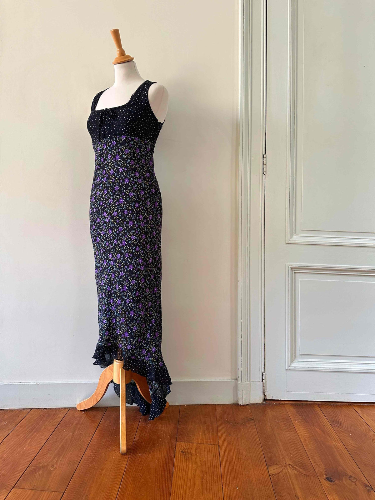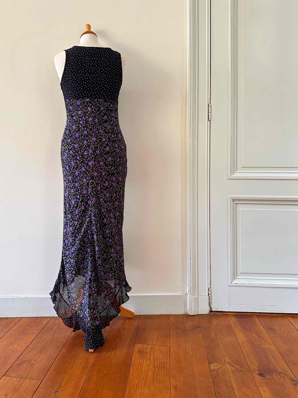 Robe longue à pois et fleurs, en voule viscose noire imprimée fleurs violettes, et pois violets et blancs, poitrine à nouer, dos longueur asymétrique, taillée en biais, fabriquée en Italie, taille 36 portée ici sur un mannequin T36, aisselles 43cm.