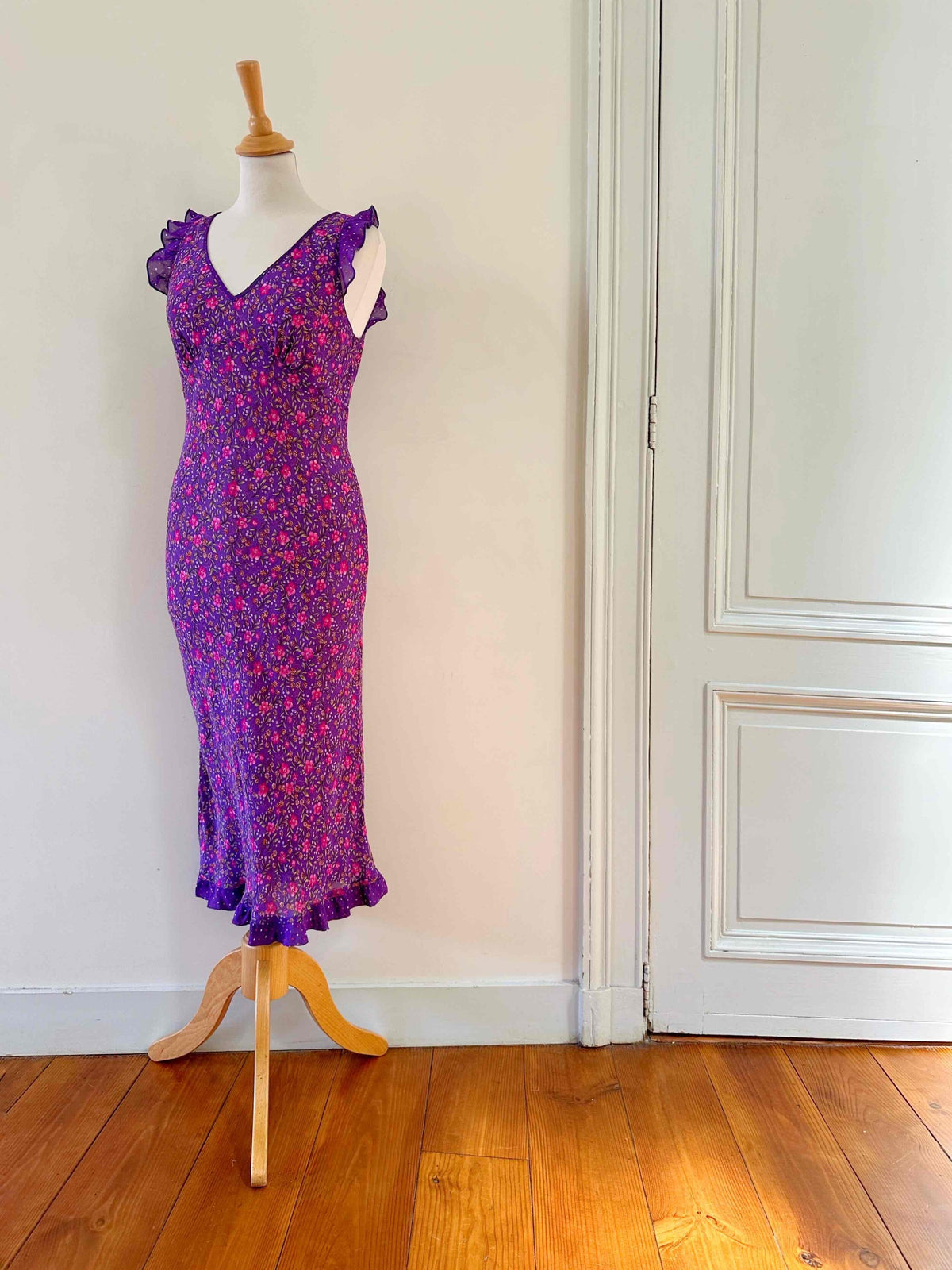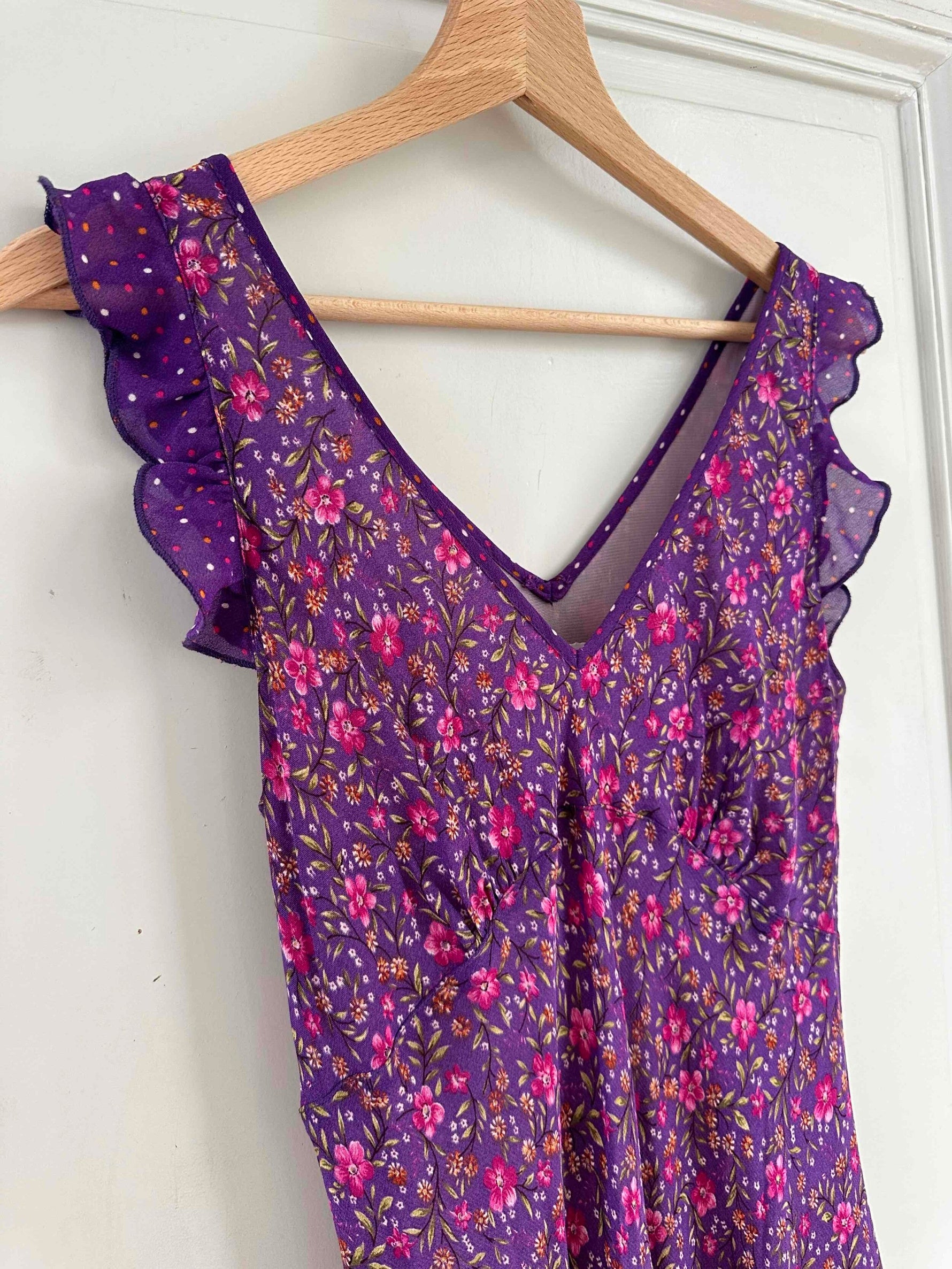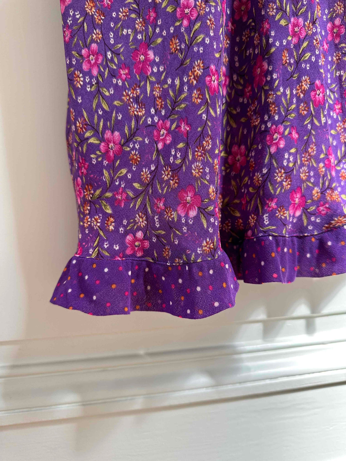 Robe longue à pois et fleurs, en voile viscose doublé violet, imprimée fleurs roses fuschias, volants aux manches et bas imprimés pois roses, oranges et blancs, découpes sous poitrine froncées, taillée en biais, fabriquée en Italie, taille 36 portée ici sur un mannequin T36, aisselles 43cm.