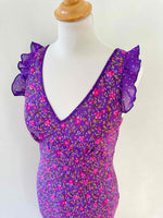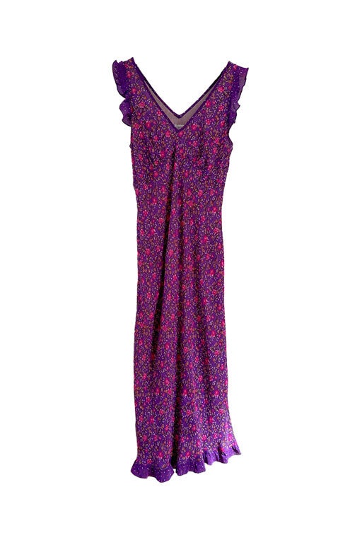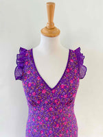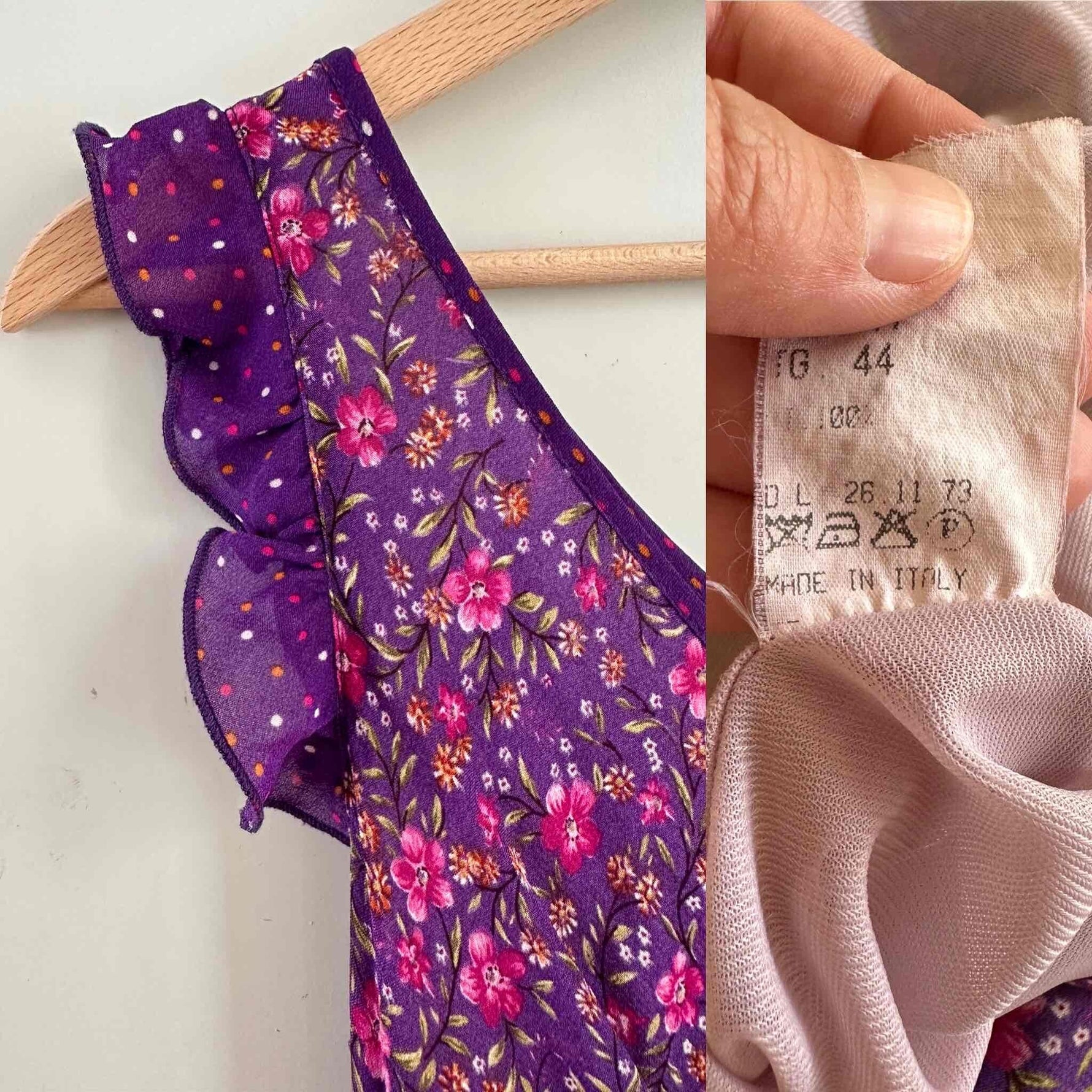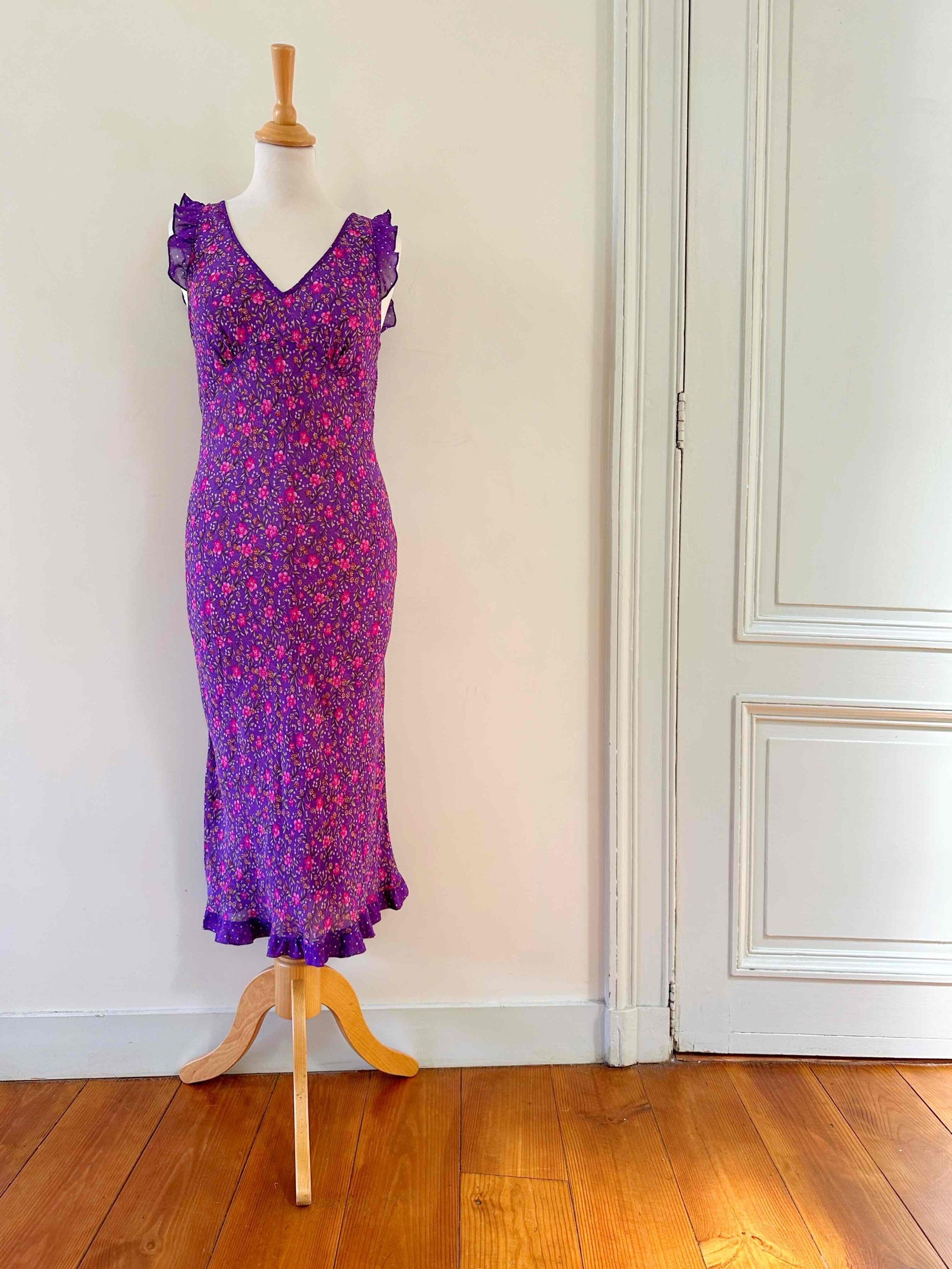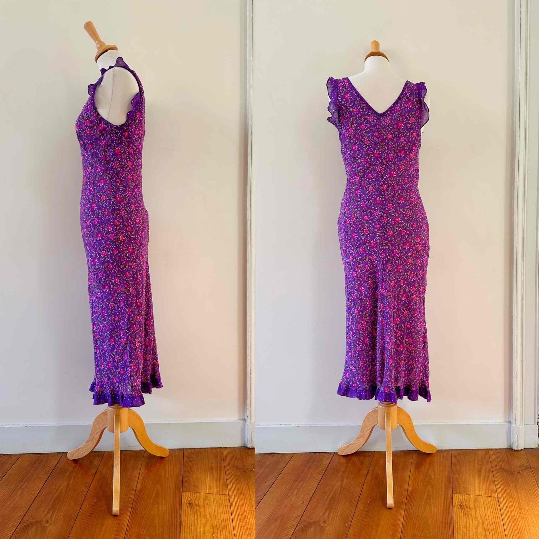 Robe longue à pois et fleurs, en voile viscose doublé violet, imprimée fleurs roses fuschias, volants aux manches et bas imprimés pois roses, oranges et blancs, découpes sous poitrine froncées, taillée en biais, fabriquée en Italie, taille 36 portée ici sur un mannequin T36, aisselles 43cm.