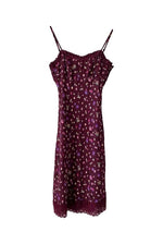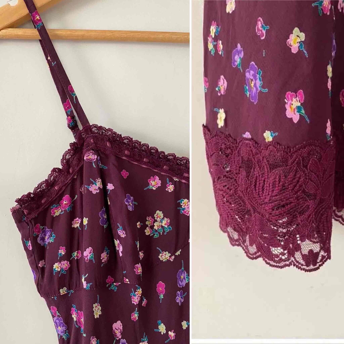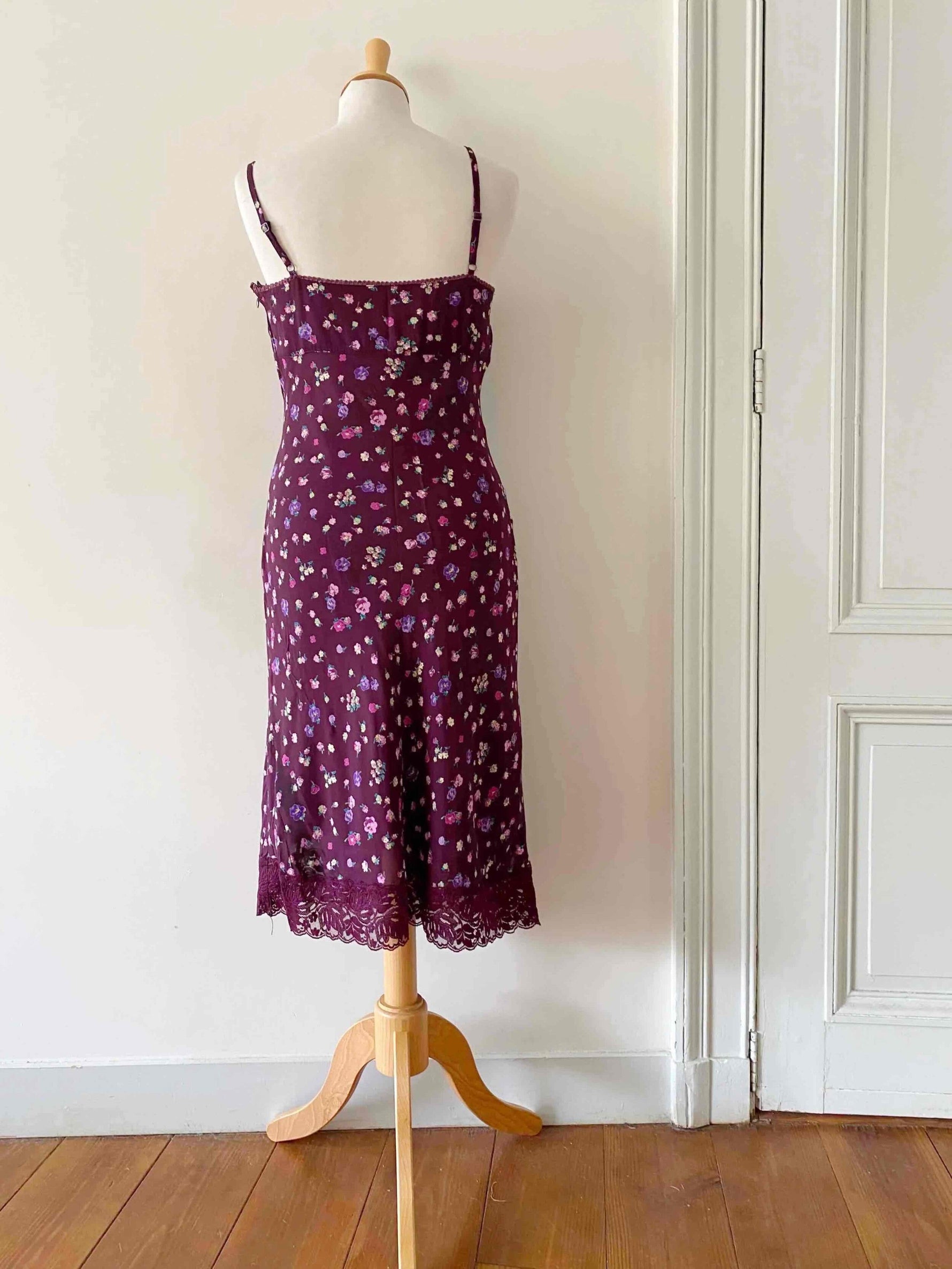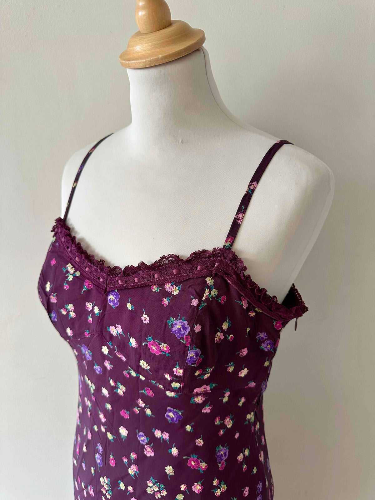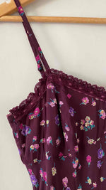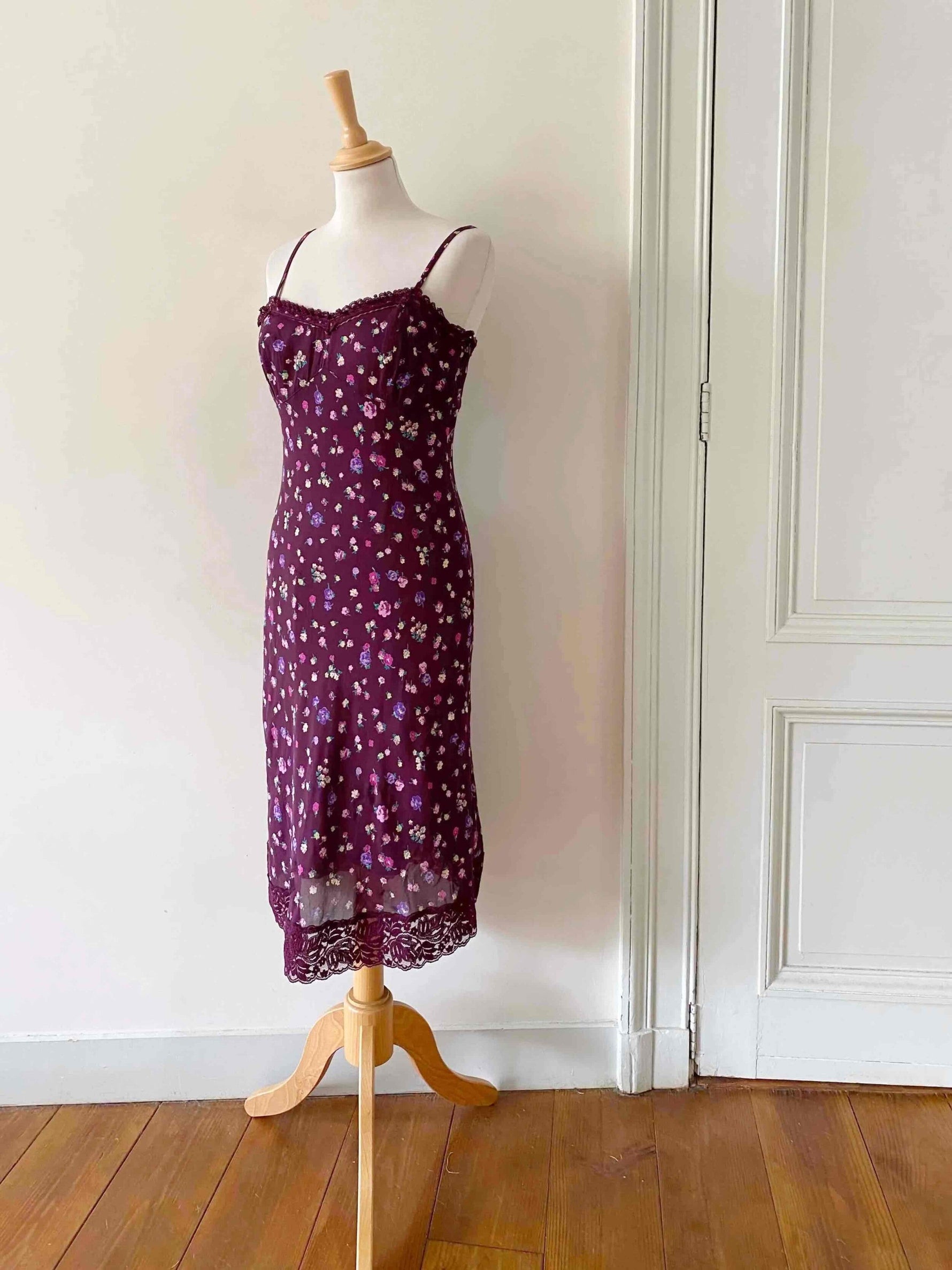 Robe nuisette à fleurs, en voile viscose doublée violet prune et petites fleurs multicolores jaunes, lilas, bretelles spaghettis réglables, poitrine brodée de ruban, bas bordé de dentelle, taillée en biais, taille 38 portée ici sur un mannequin T36, aisselles 43cm.