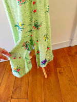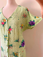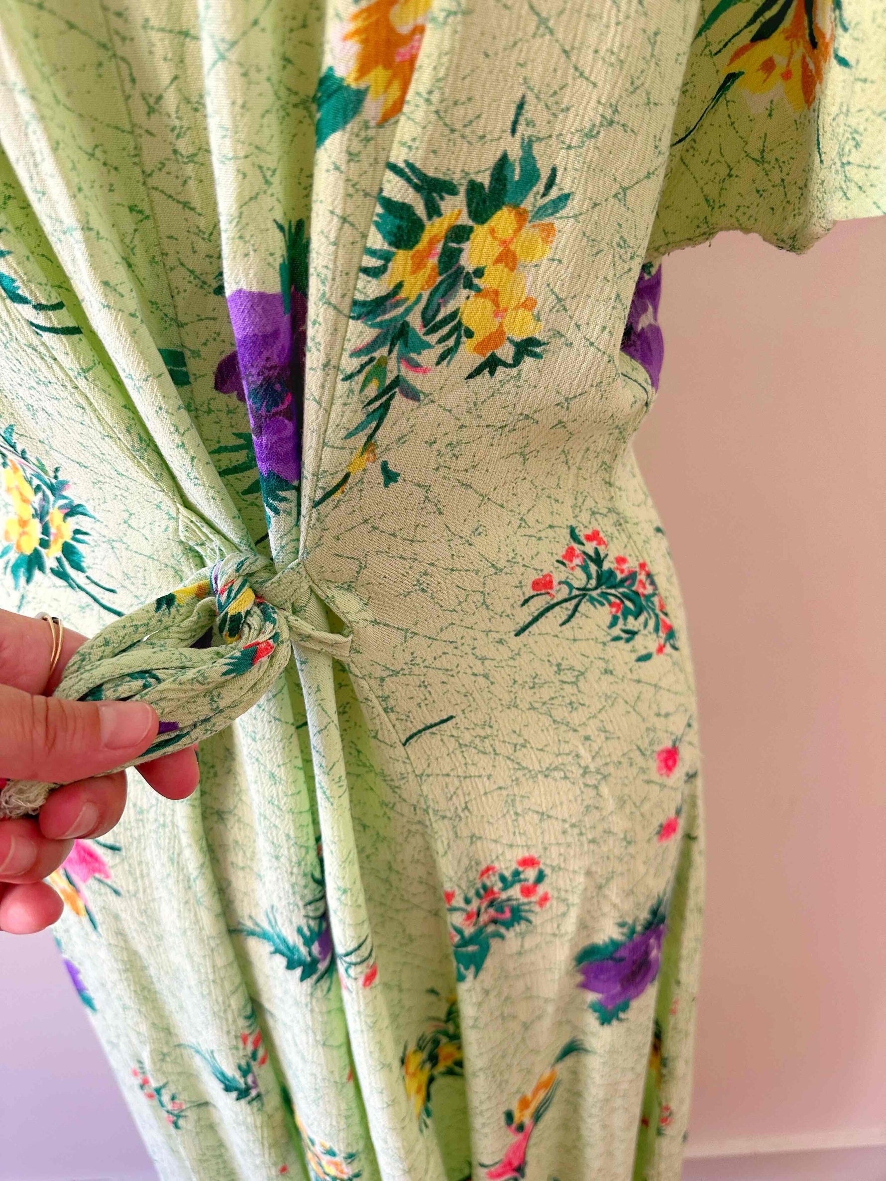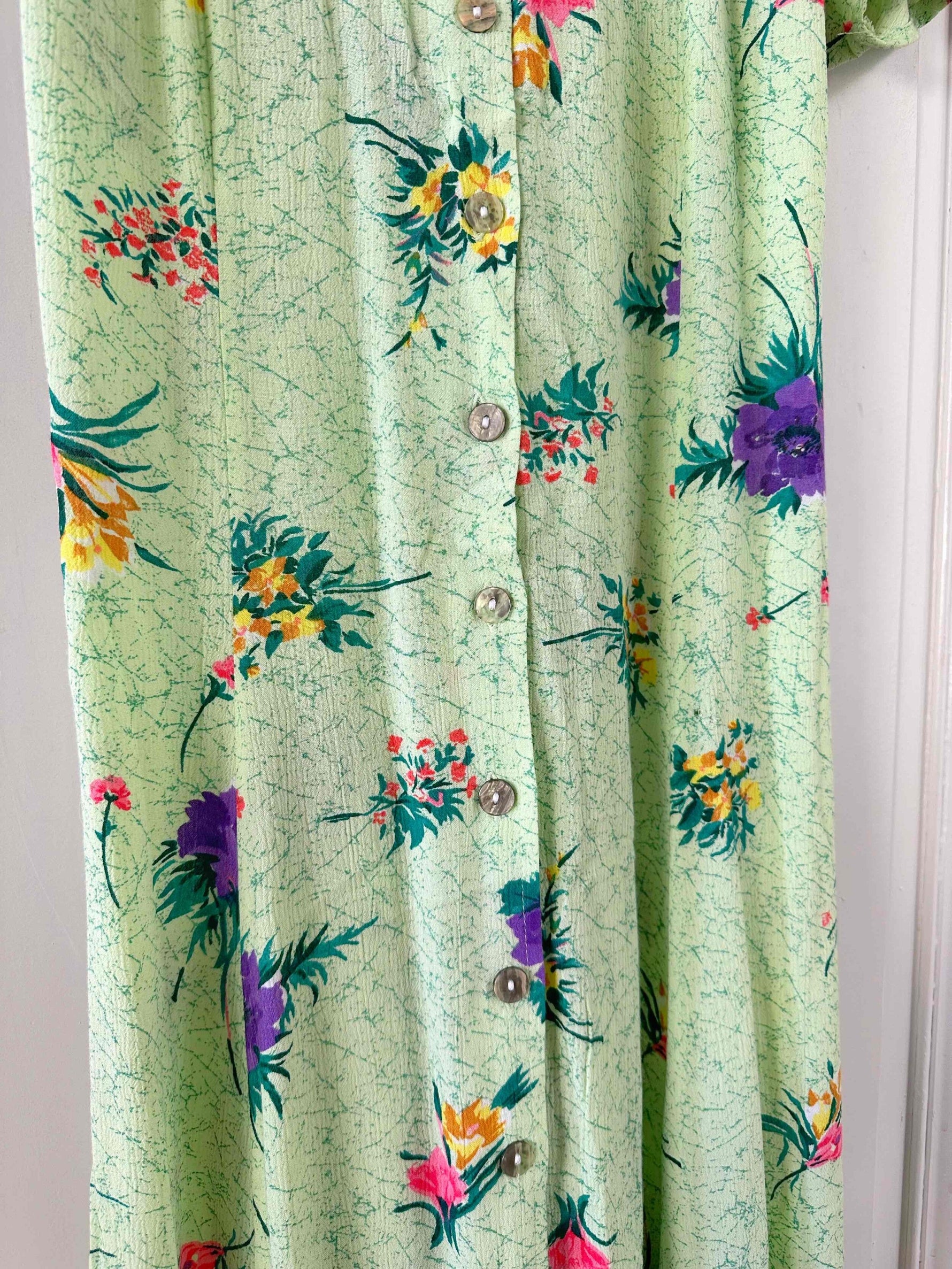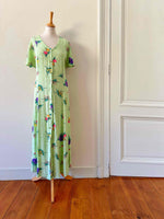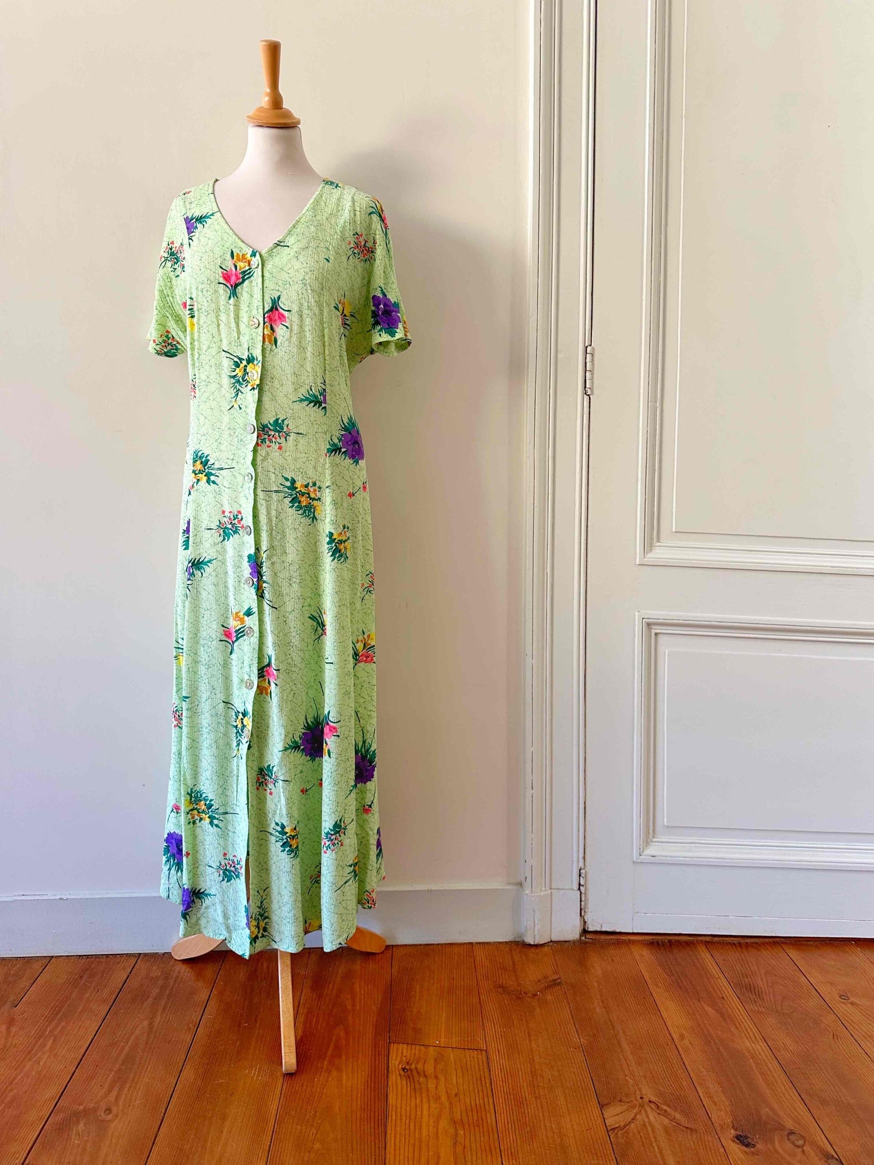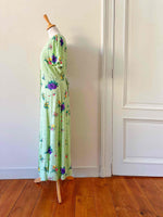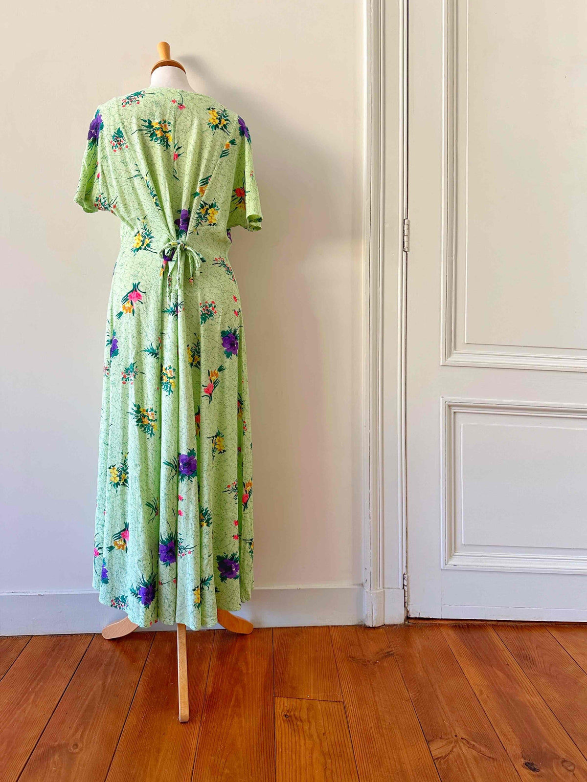 Prix unitaire parRobe longue à fleurs, en viscose crépon vert pistache, imprimée de bouquets de fleurs prairies multicolores violettes, jaunes, roses et vertes, boutons en nacres, longueur maxi, fente côtés et taille dos à nouer, convient aux tailles 38 et 40, portée ici sur un mannequin T36, aisselles 48 cm.