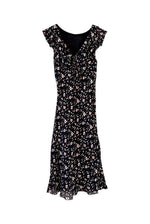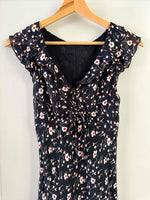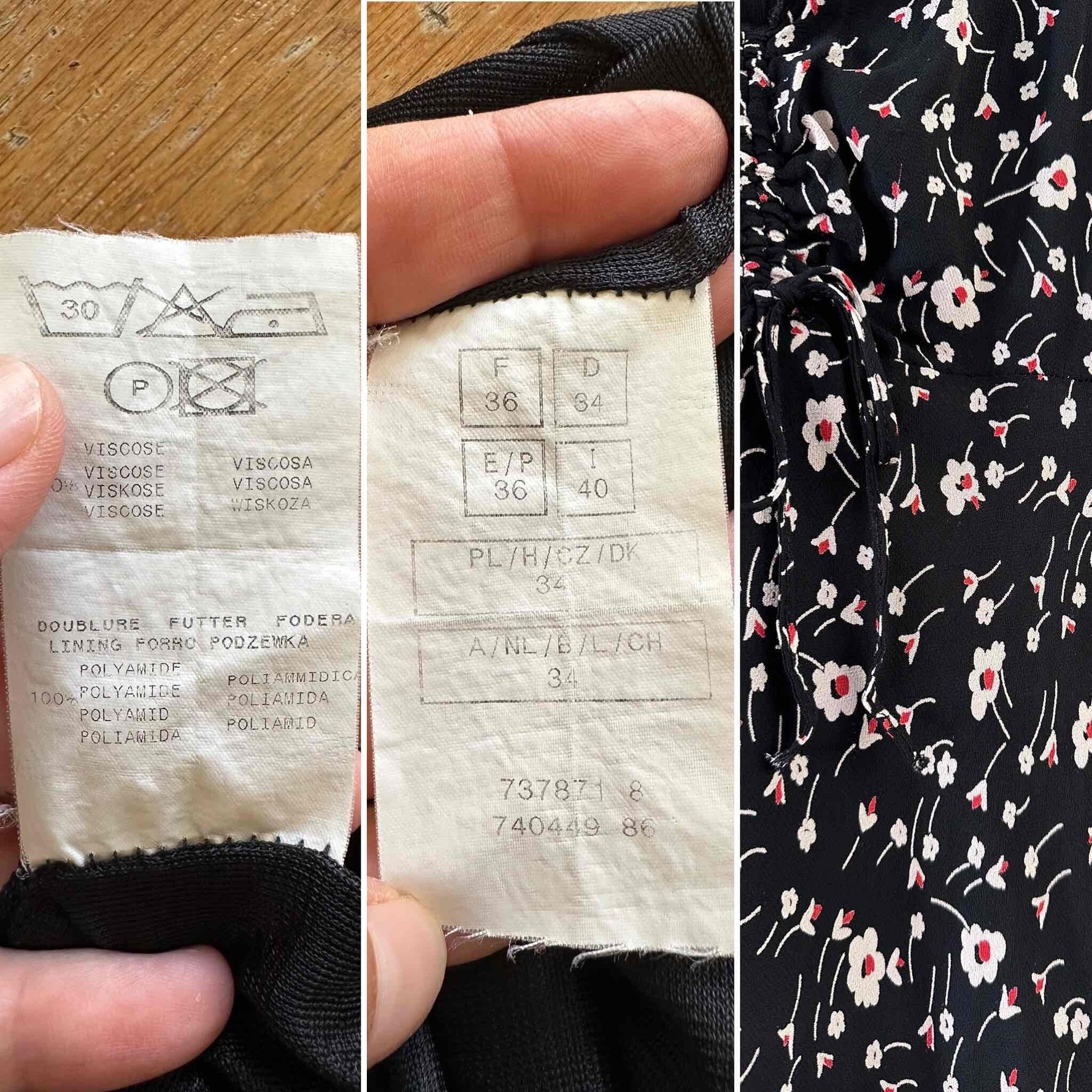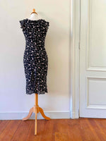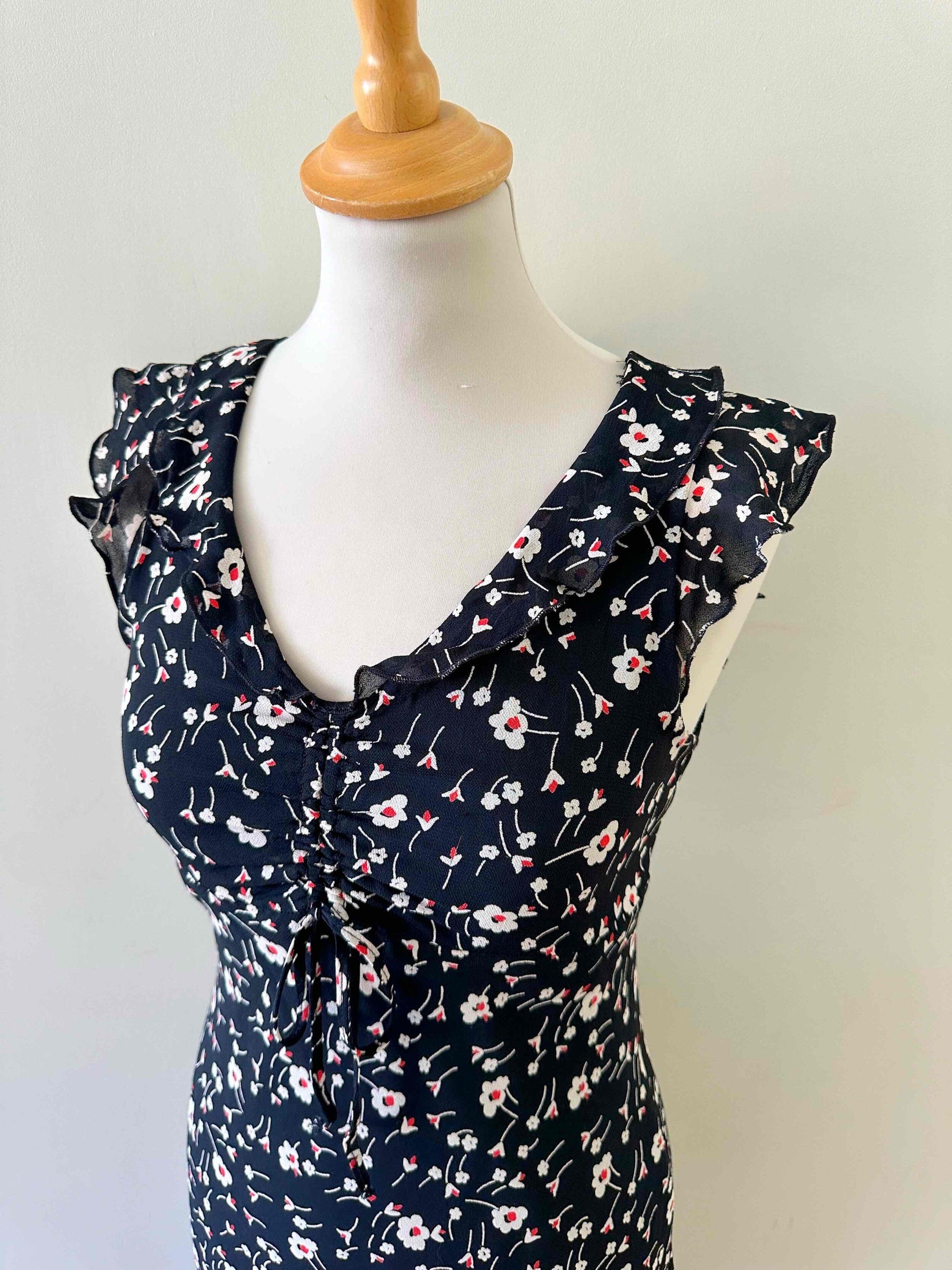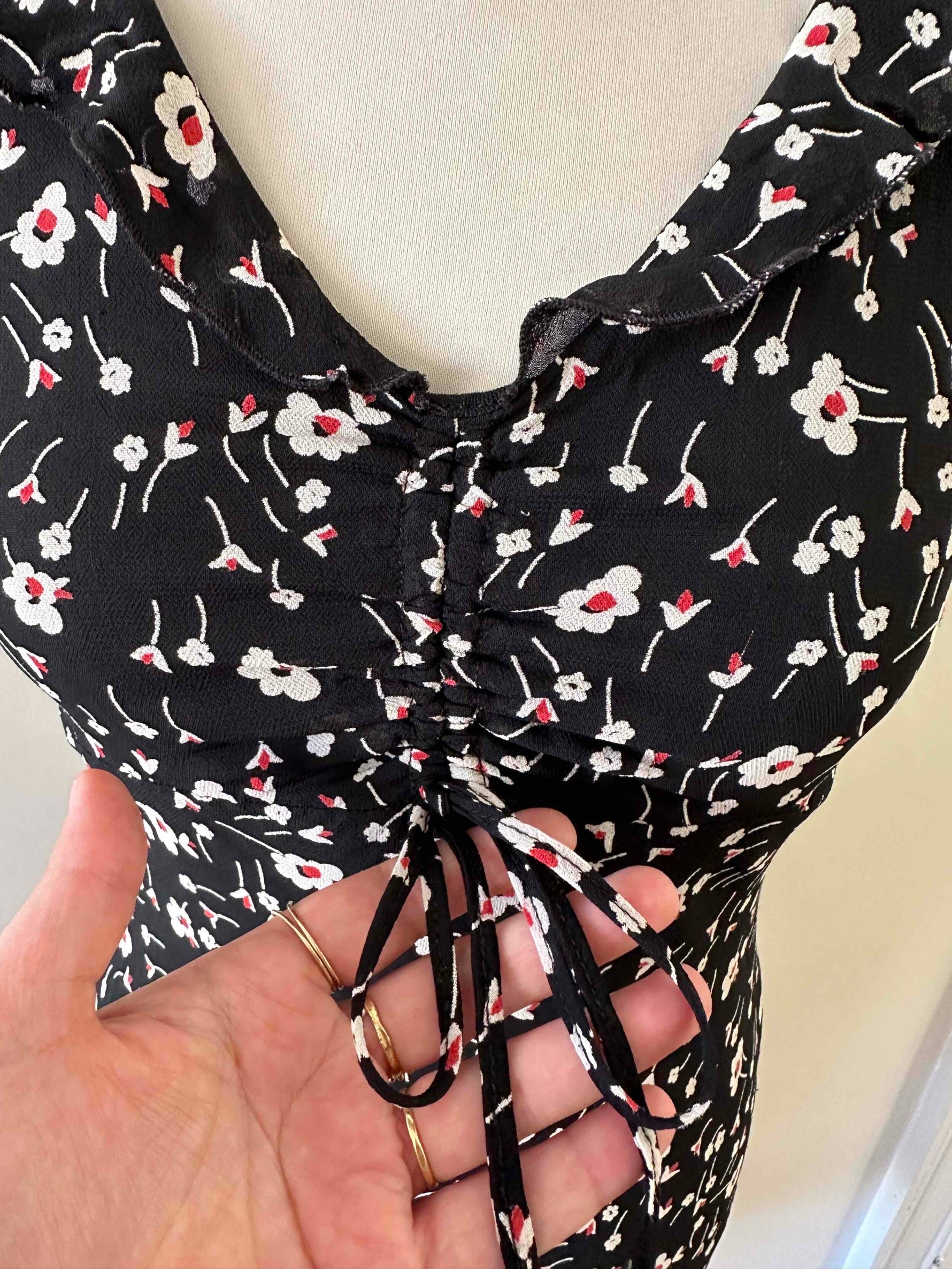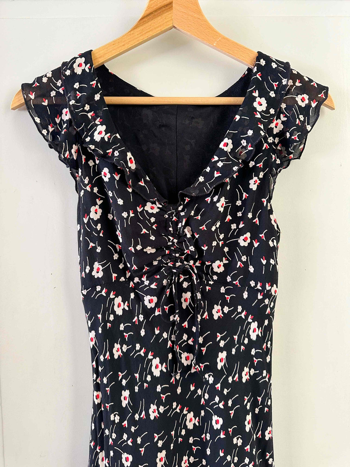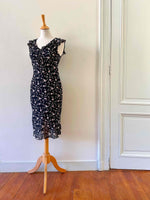 Prix unitaire parRobe a fleurs, en voile viscose doublé noire imprimée fleurs blanches et rouges, encolure et manches volantées, poitrine froncée à nouer, taillée en biais, fabriquée en France, taille 34 portée ici sur un mannequin T36, aisselles 42cm.