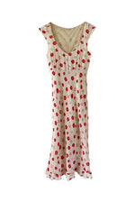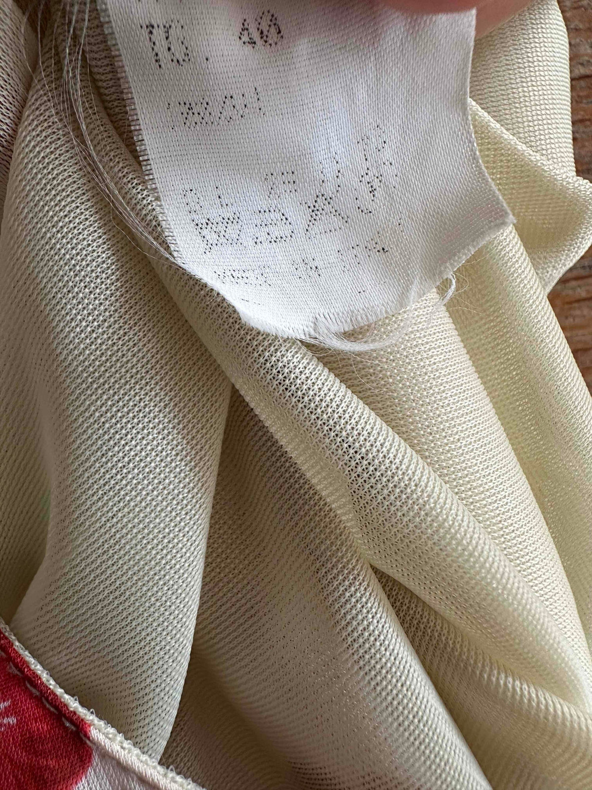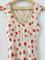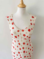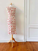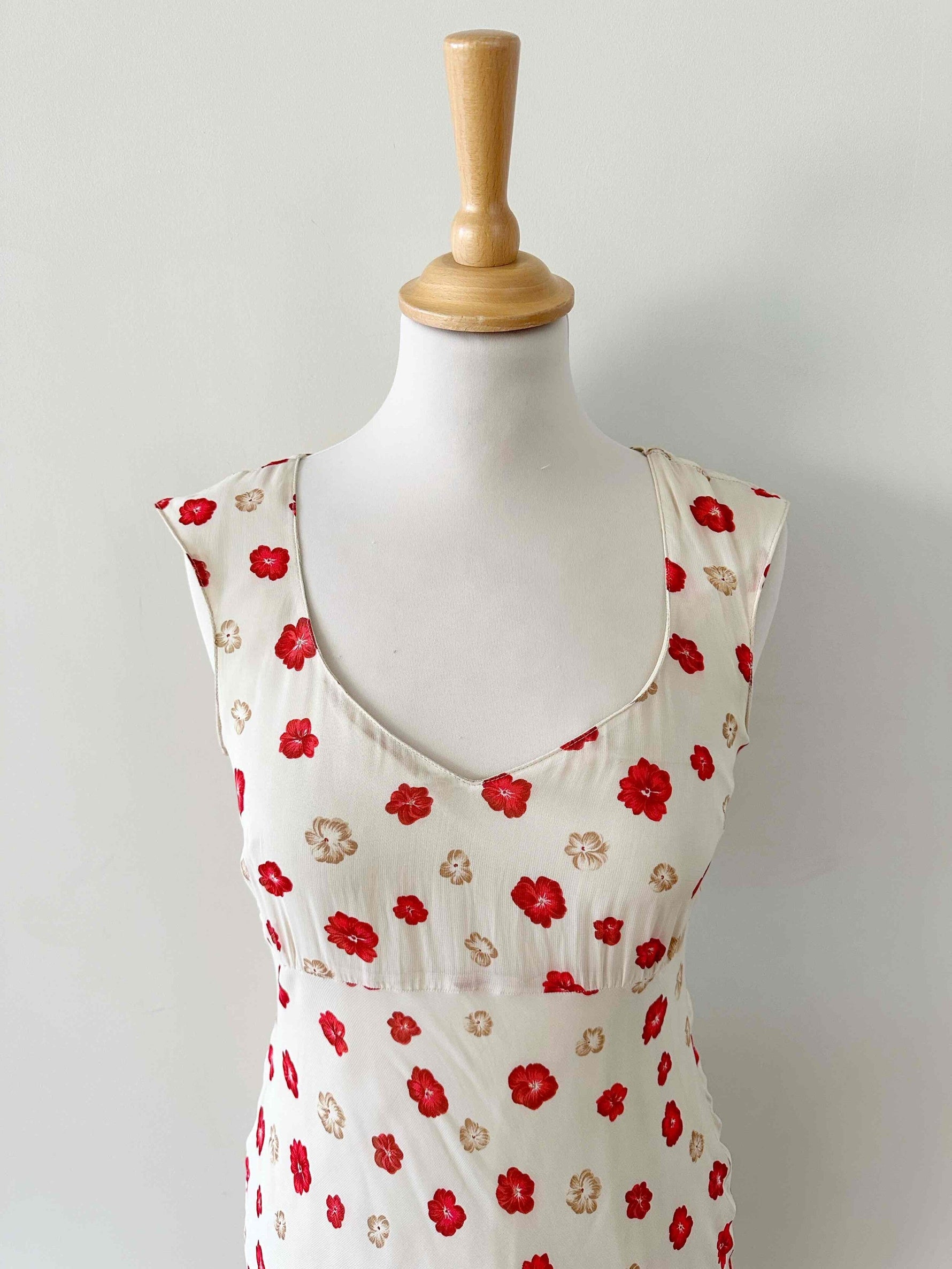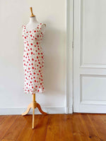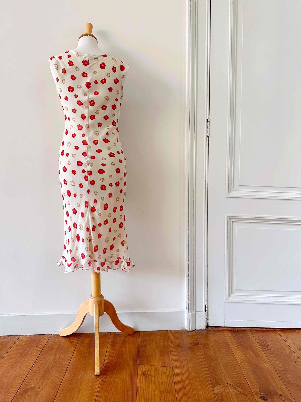 Robe nuisette à fleurs, en voile viscose écrue imprimée fleurs rouges et beiges, découpes sous poitrine froncées, taillée en biais, fabriquée en Italie, taille 36 portée ici sur un mannequin T36, aisselles 43 cm.
