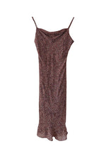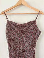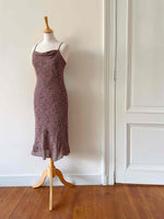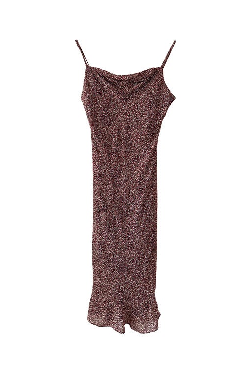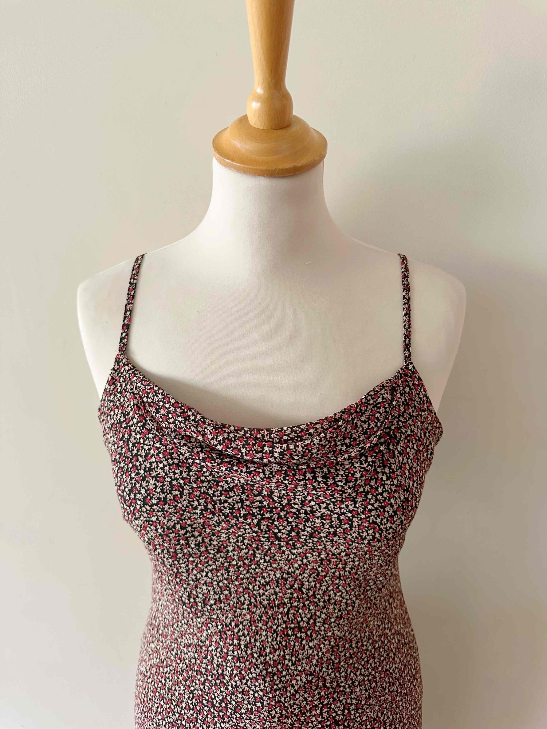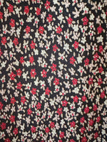 Prix unitaire parRobe nuisette à fleurs, en voile viscose doublé noire, imprimée minis fleurs rouges, roses et blanches, bretelles spaghettis, encolure froncée bénitier, longueur midi, taillée en biais, fabriquée en France, taille 36 portée ici sur un mannequin T36.