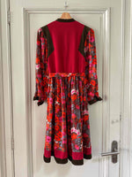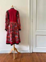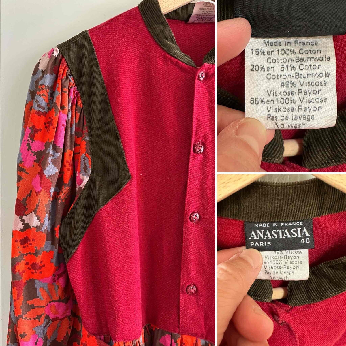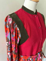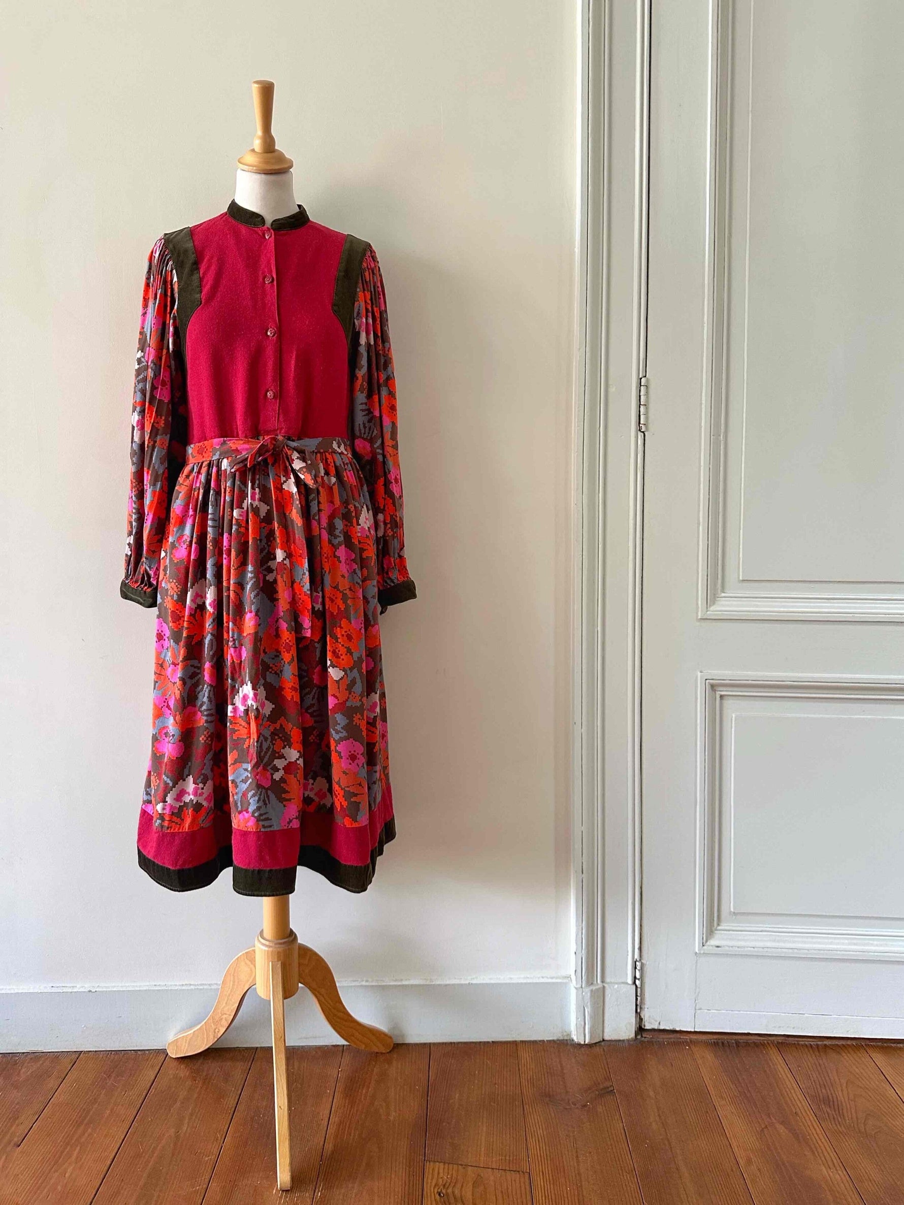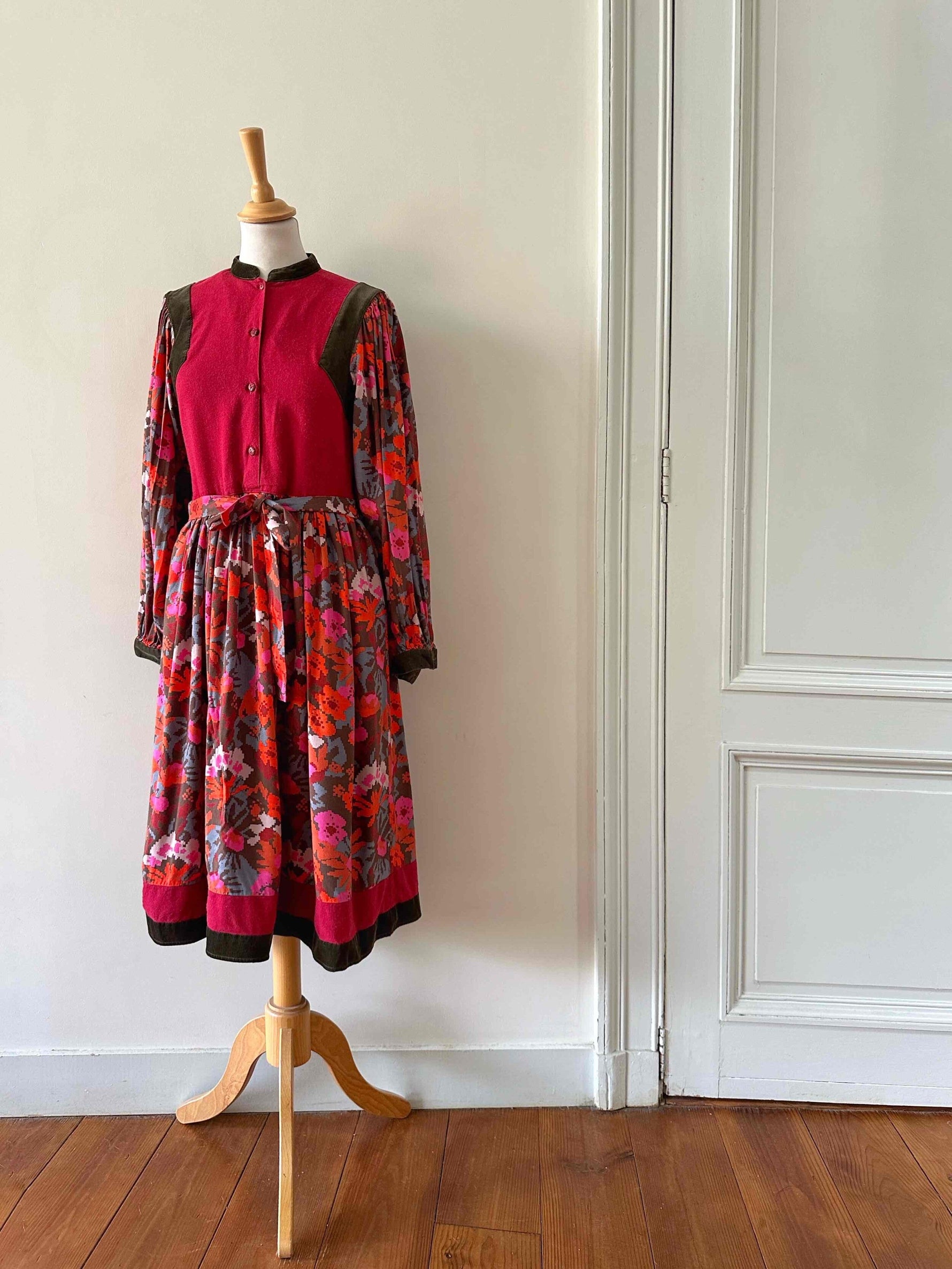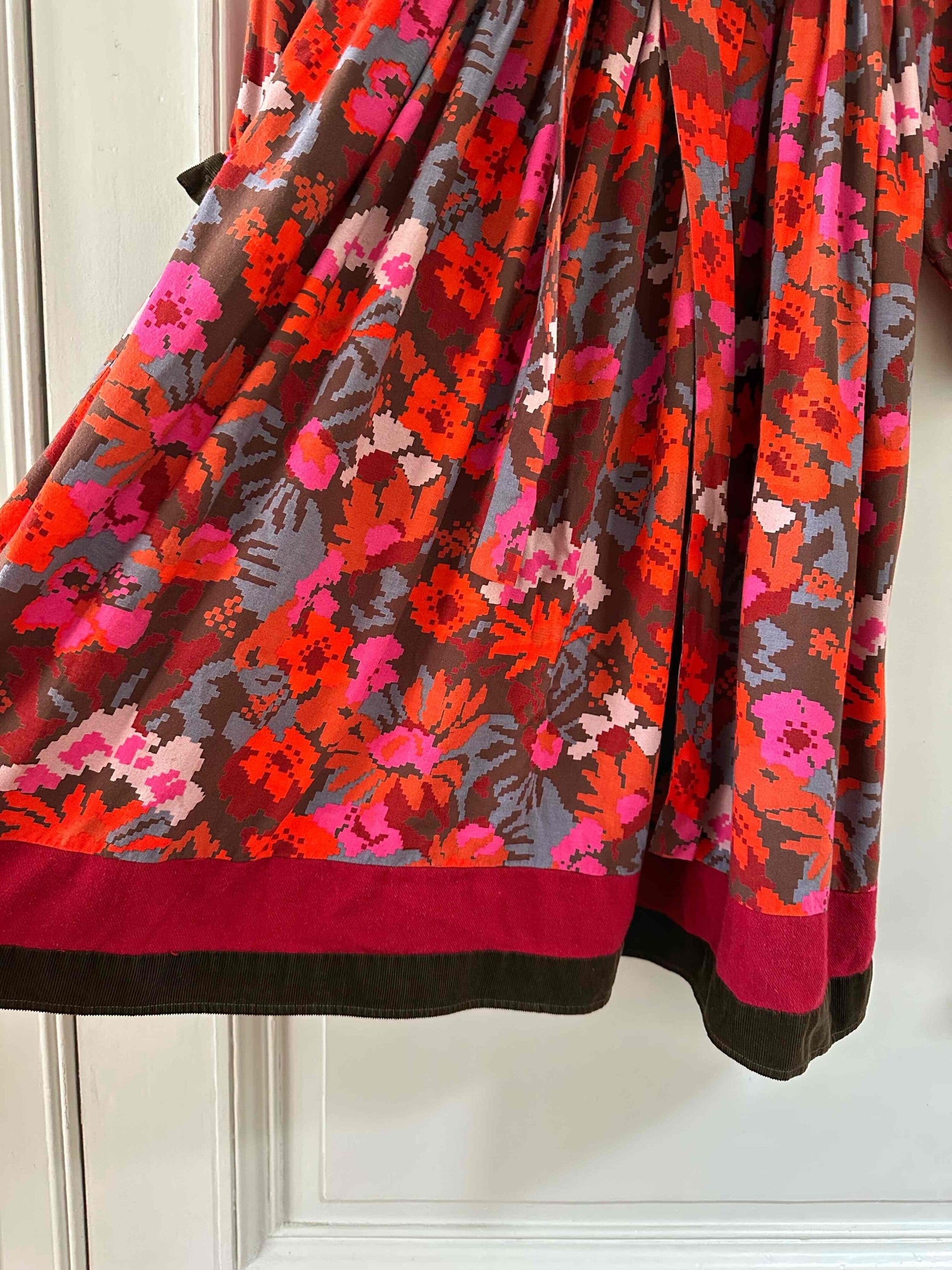 Prix unitaire parRobe à fleurs, en viscose, coton et velours côtelé, rouge foncé, imprimé fleurs en pixel oranges, rose fuchsia, bleu ciel, col, épaules et poignets en velours côtelé brun, boutons en haut et fermeture eclair côté, fabriquée en France, taille 36 portée ici sur un mannequin T36.