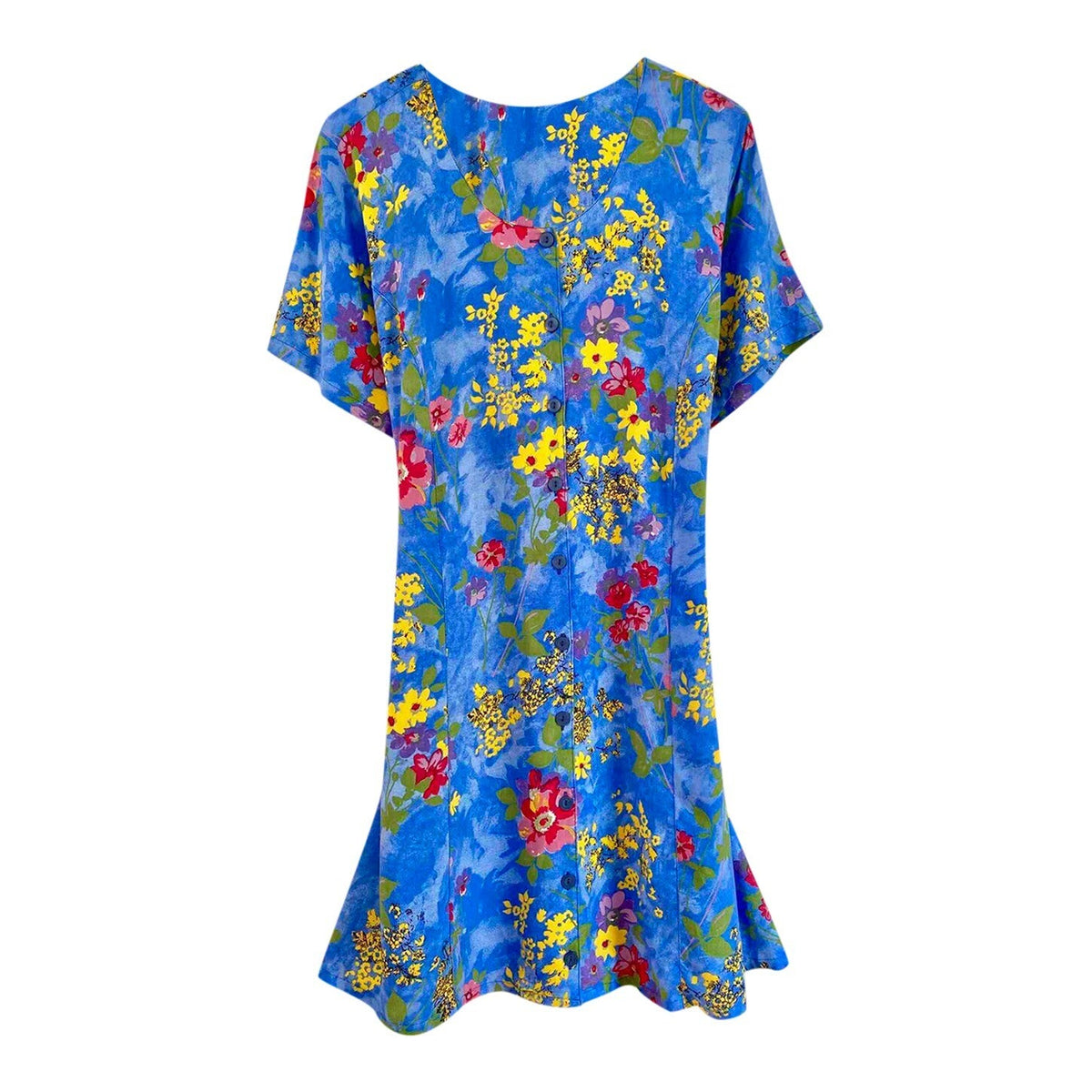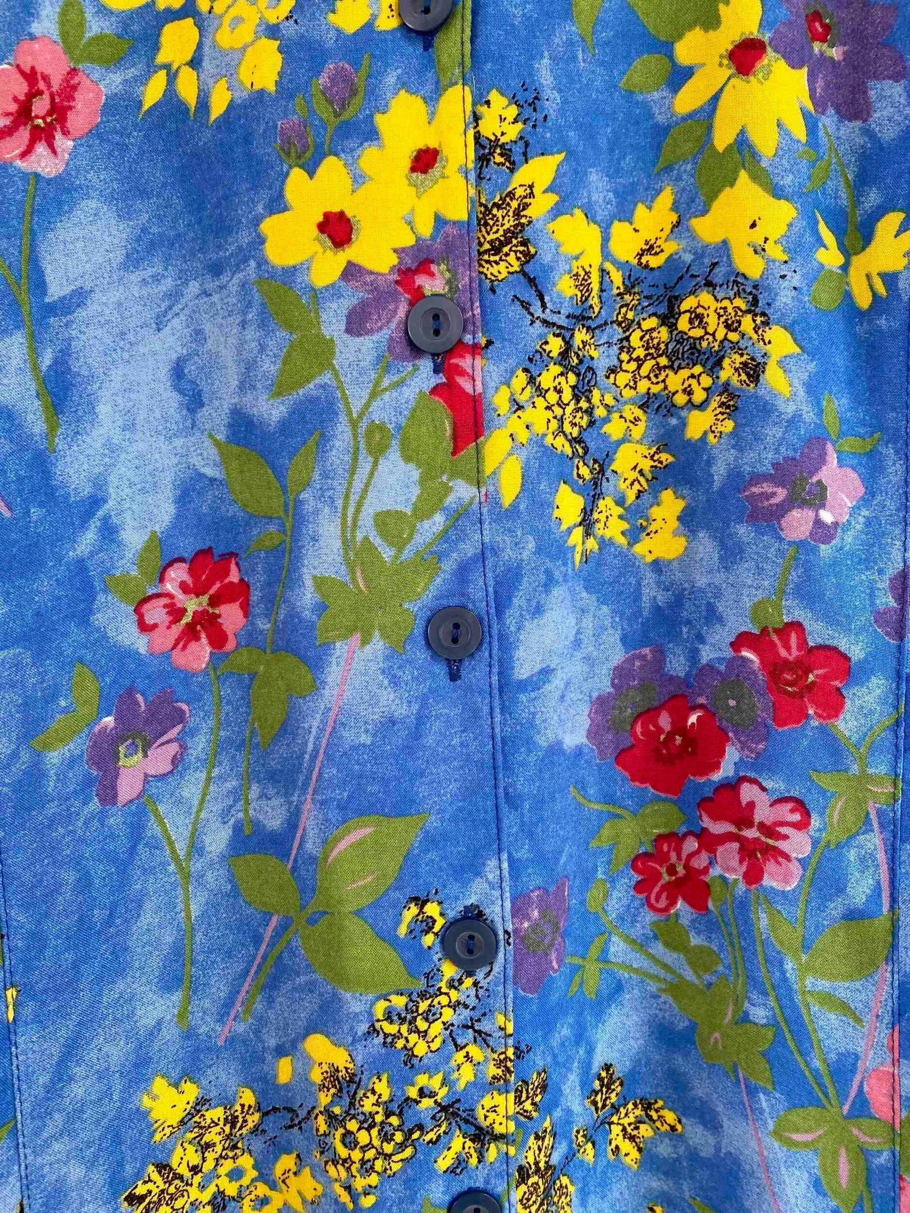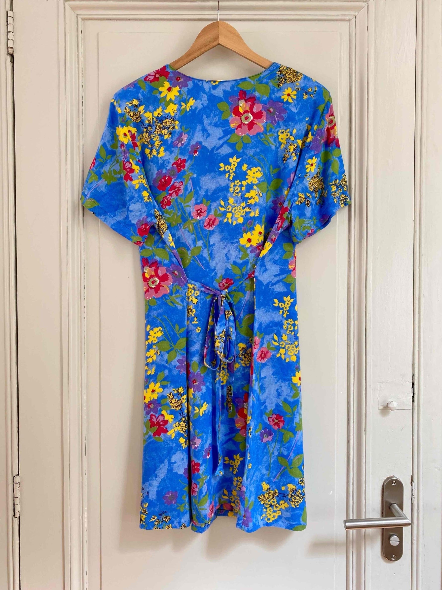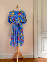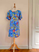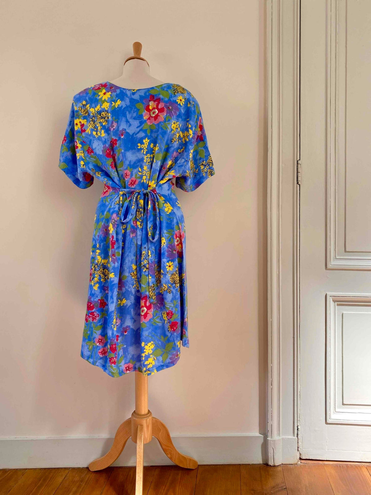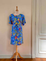 Prix unitaire parRobe boutonnée à fleurs en viscose bleu roi, imprimé fleurs jaunes et roses, taille à nouer dos, devant, ou double tour, épaulettes fines, fabriquée en France.