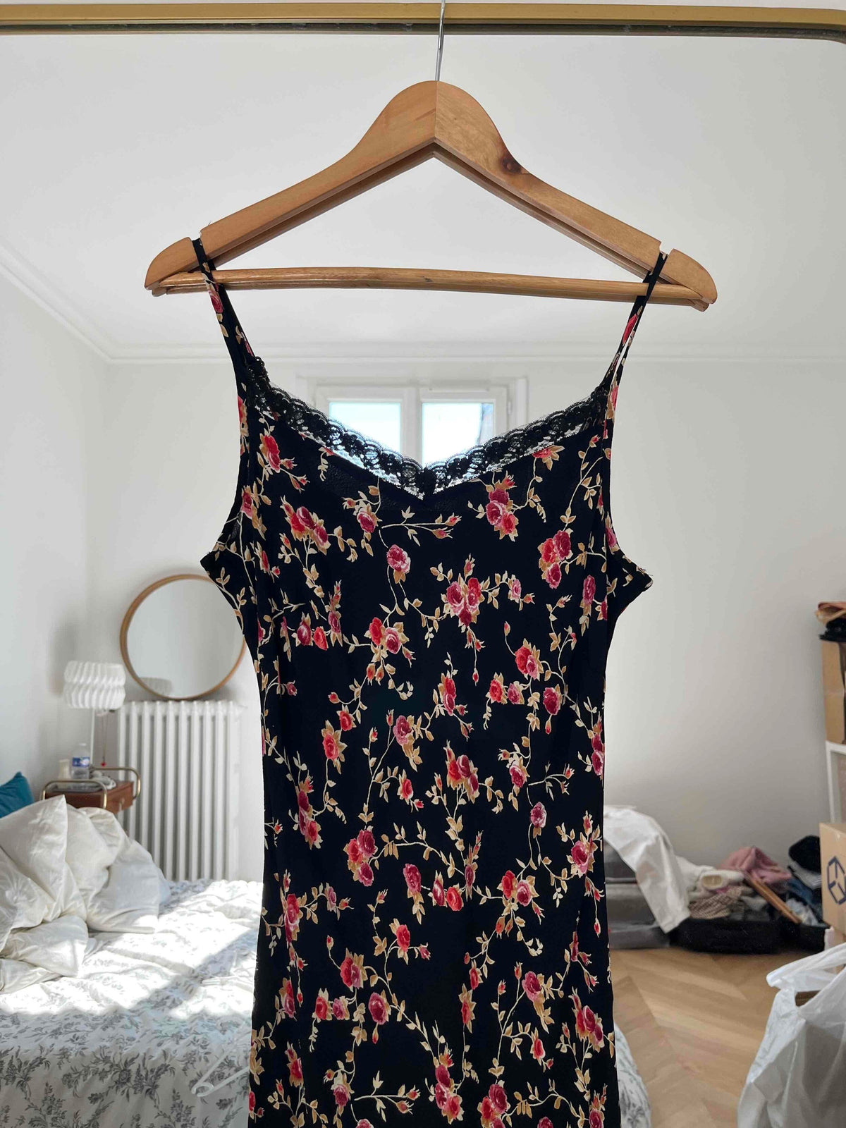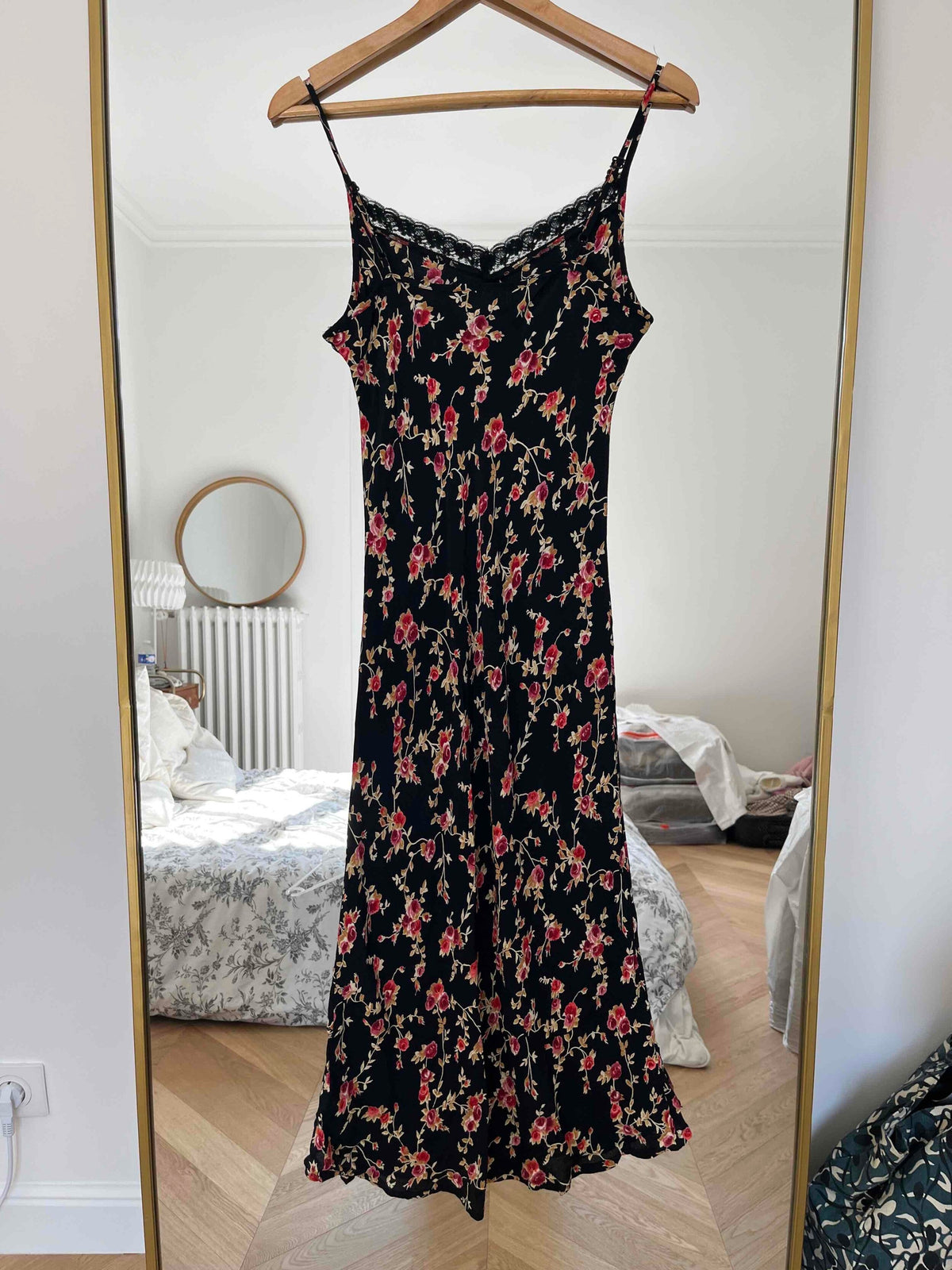 Prix unitaire parRobe à fleurs, décolleté en V orné de dentelle noire, bretelles ajustables, fluide et légère, tissu non doublé
