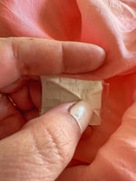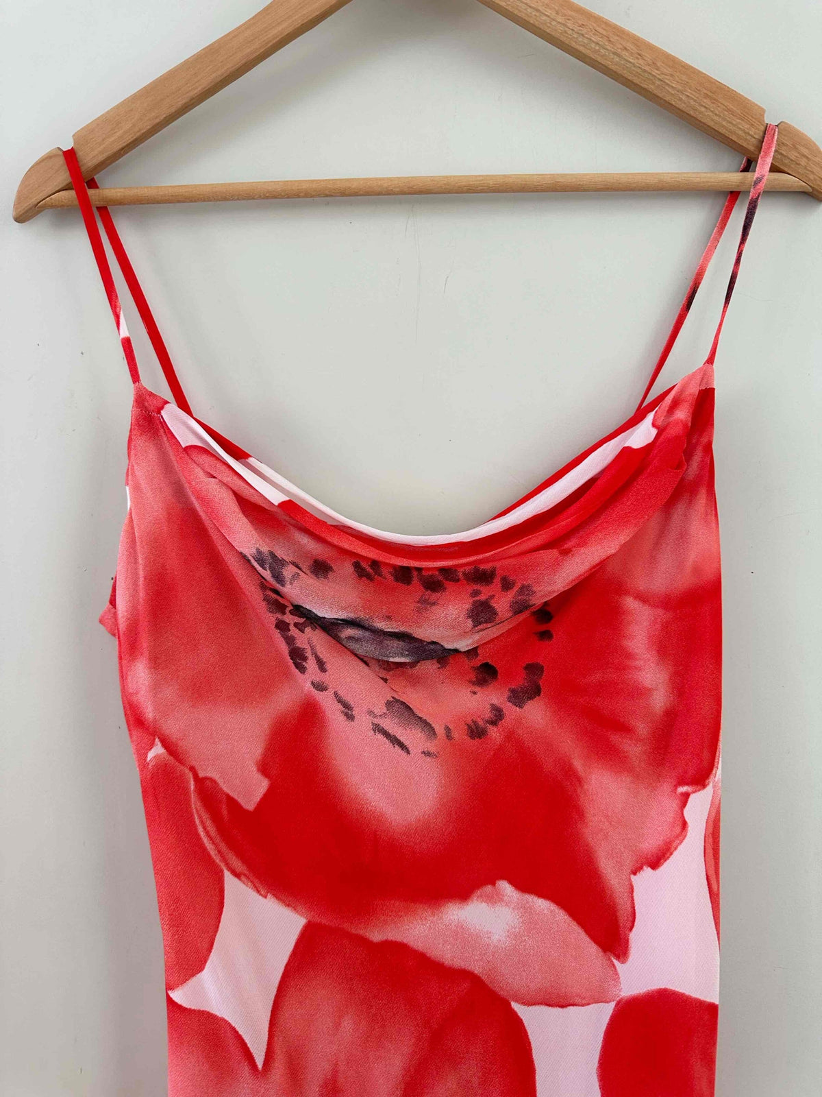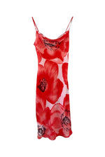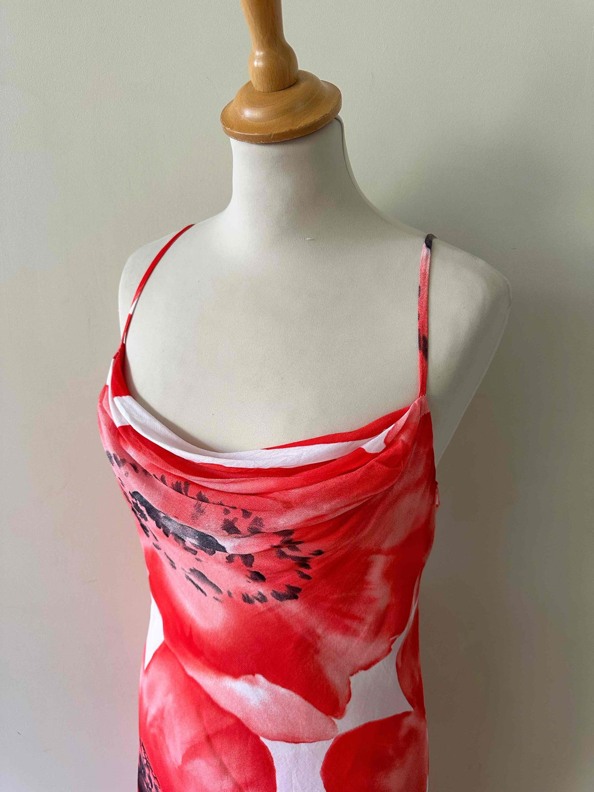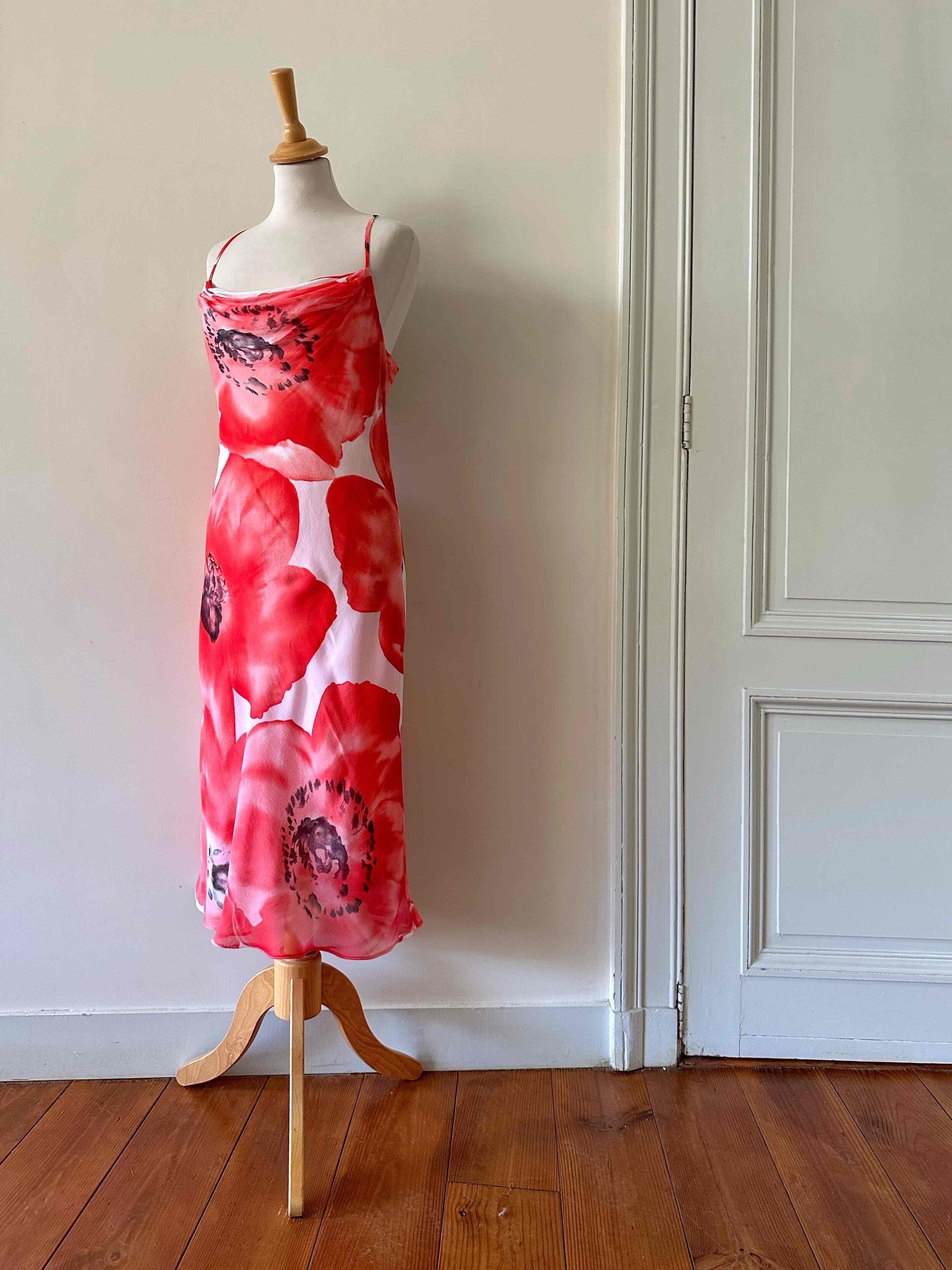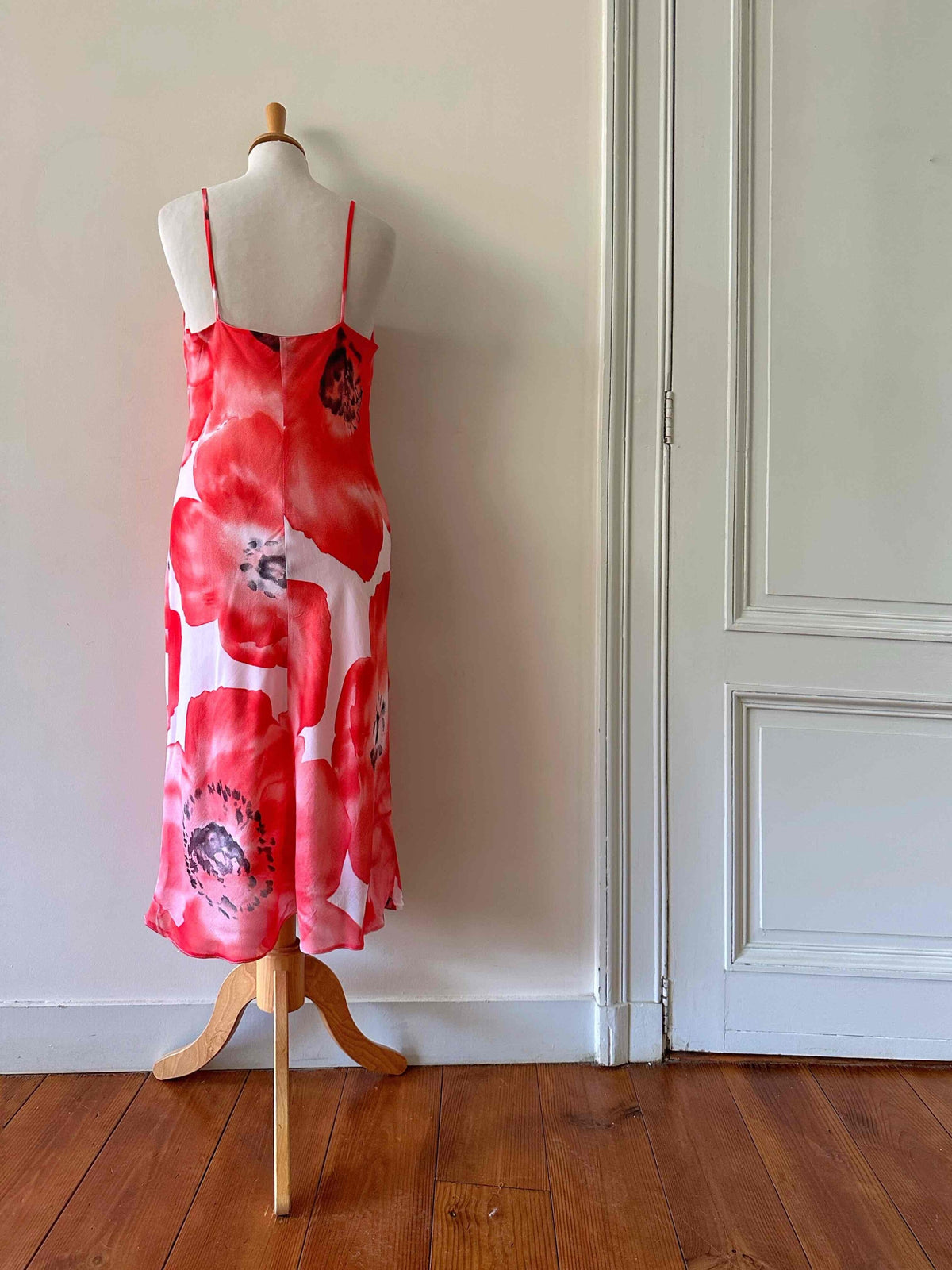 Prix unitaire parRobe nuisette à fleurs, en voile viscose blanche doublée rose, imprimée grandes fleurs de coquelicots rouges et roses, encolure drappée bénitier, bretelles spaghettis, forme en biais, fabriquée en France, taille 38 portée ici sur un mannequin T36. Aisselles 46cm.