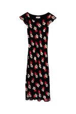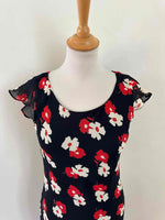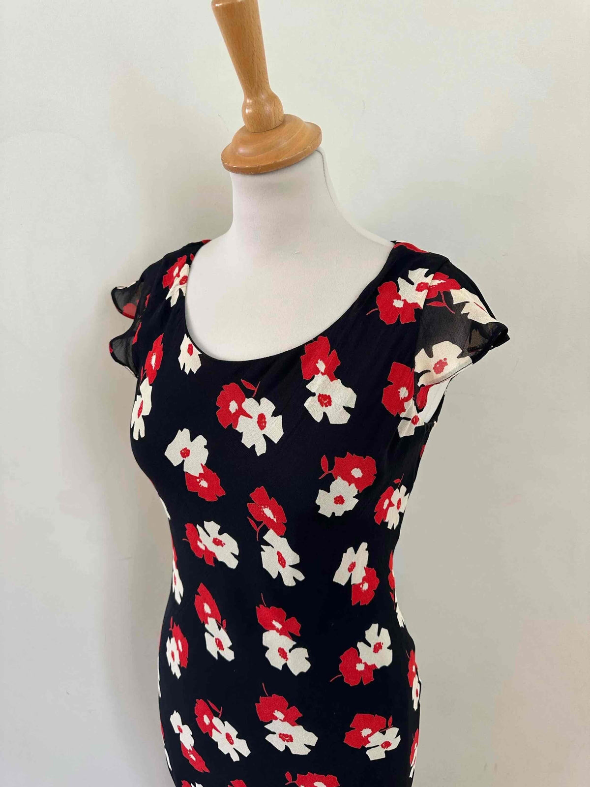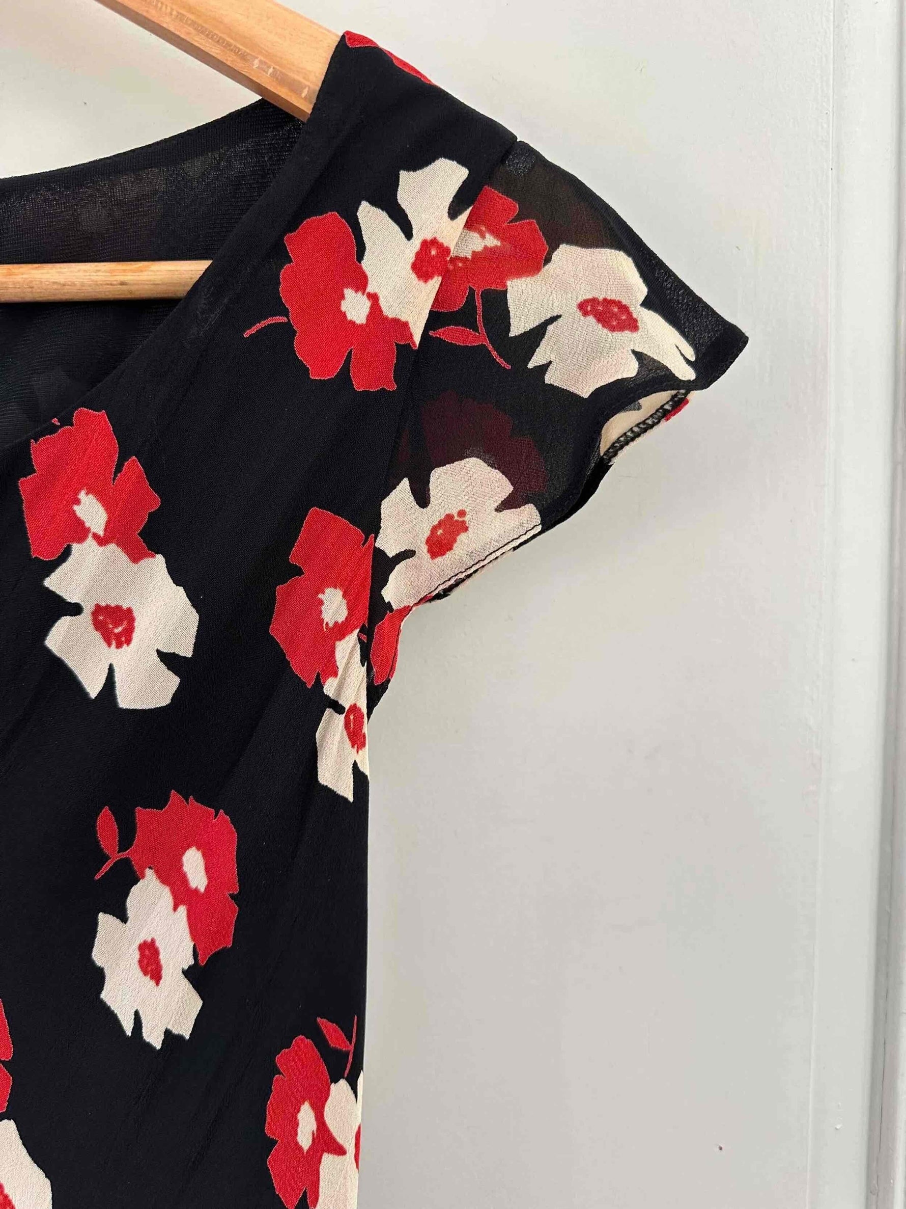 Prix unitaire parRobe à fleurs, en voile viscose doublé, noir imprimé fleurs de coquelicots rouges et blanches, manches papillons voilage, forme en biais, fabriquée en France, taille 36 portée ici sur un mannequin T36, aisselles 44cm.